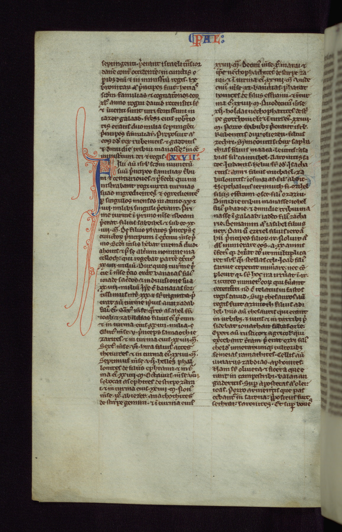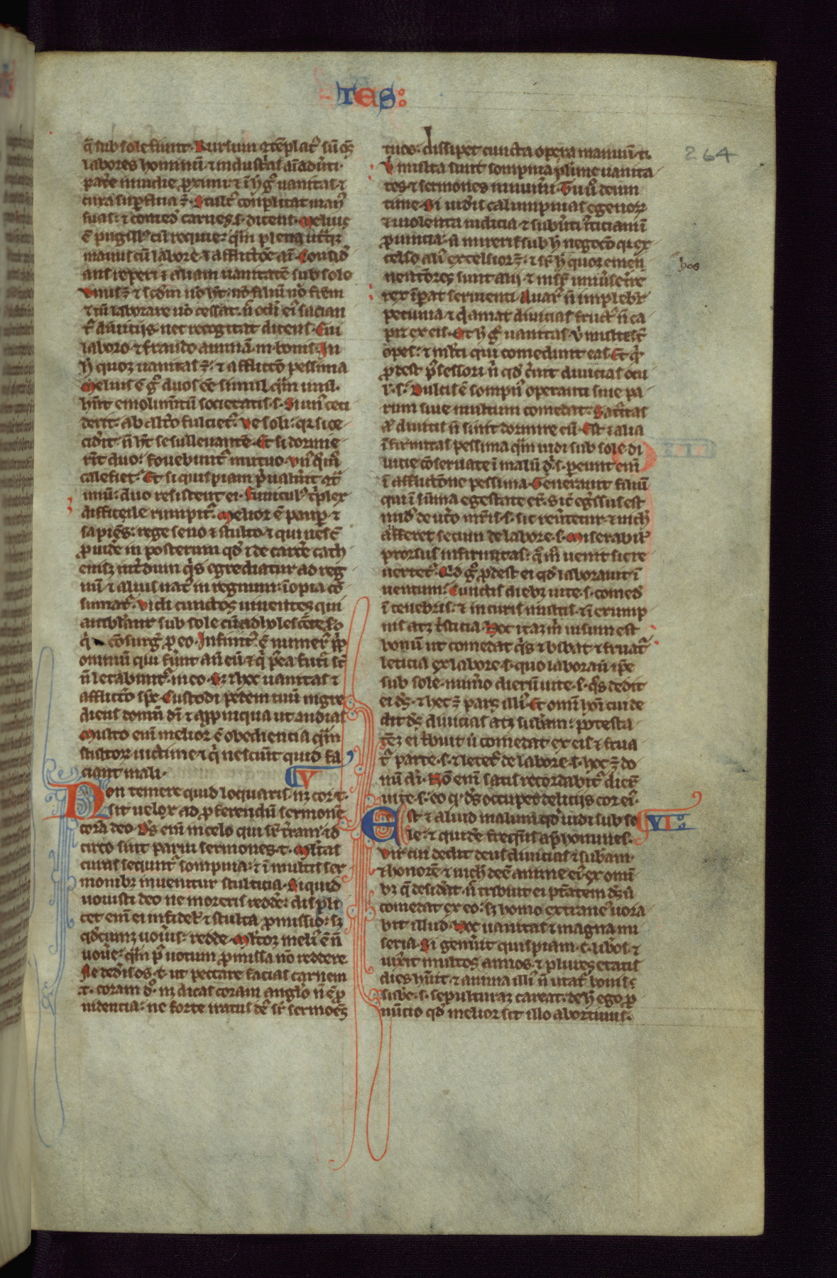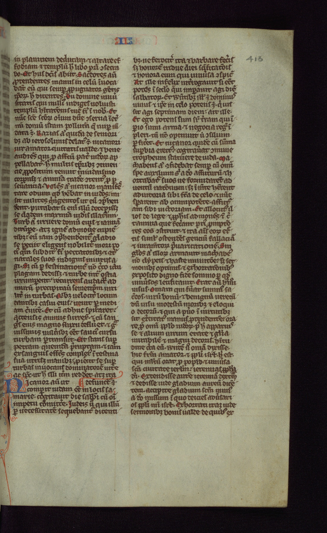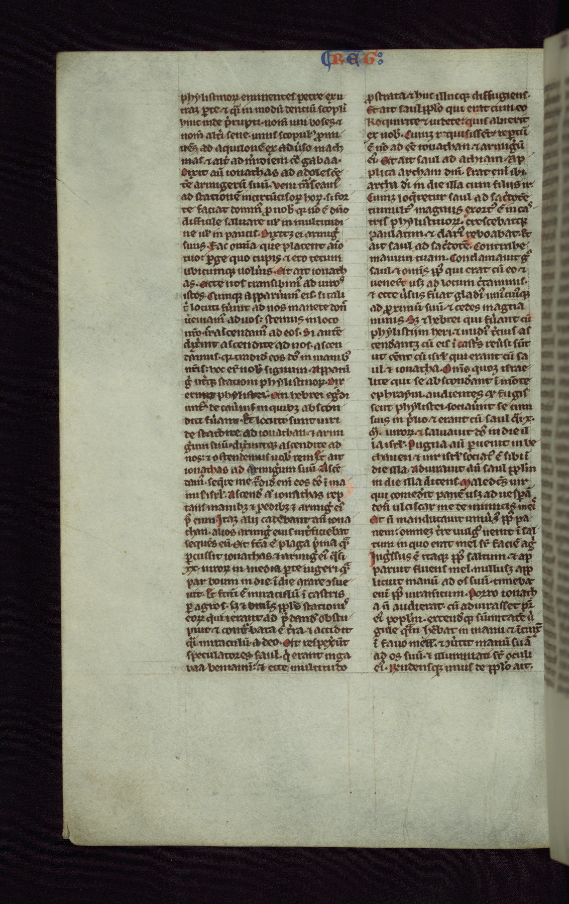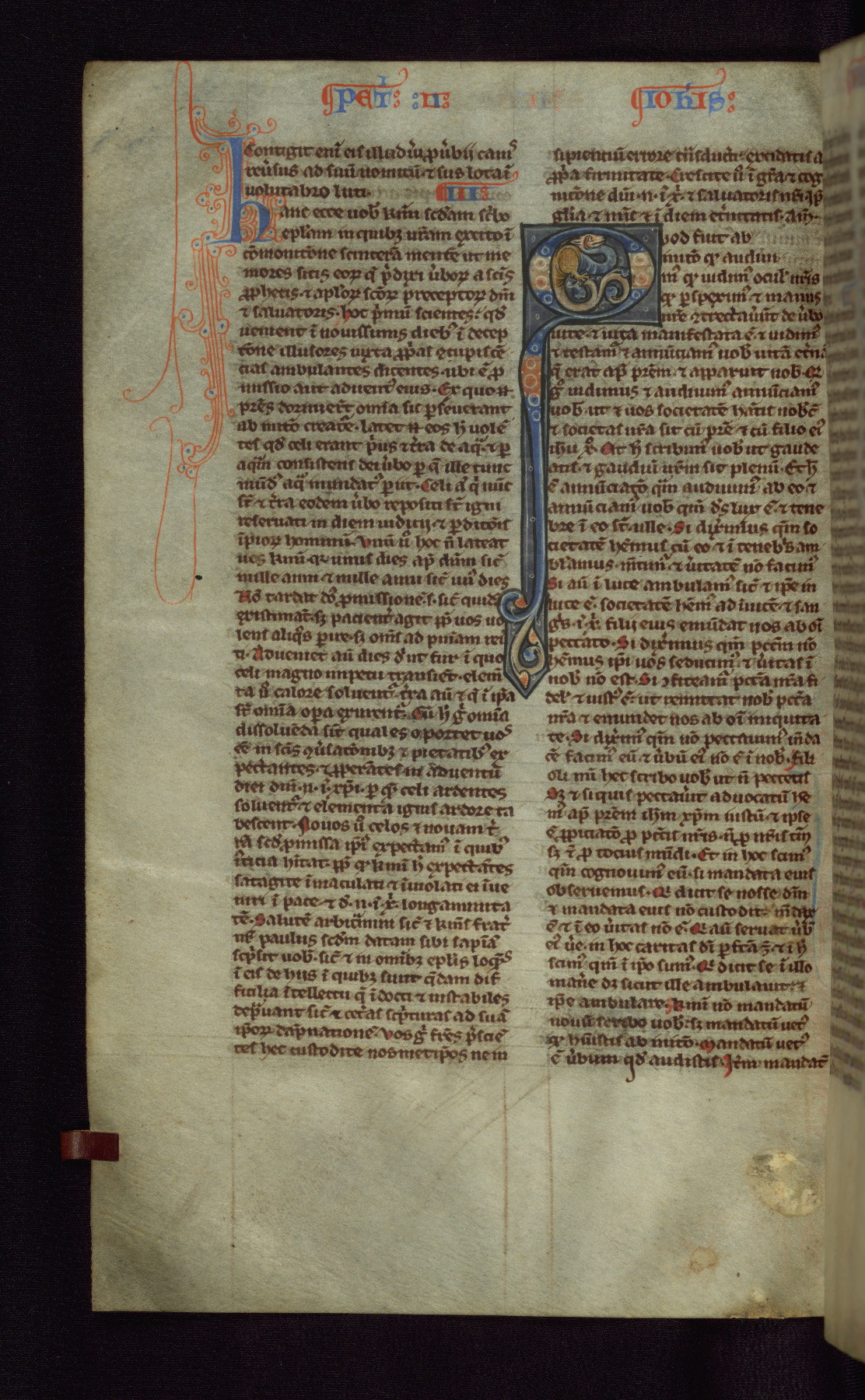 This pocket-size Bible was created around the middle of the thirteenth century in England. It contains the Vulgate text of the Old and New Testaments, arranged in order and divided into chapters. Such Bibles, designed for individual rather than institutional use, began to be created on a large scale during the thirteenth century, especially in Paris. This manuscript is illuminated with a large number of small historiated initials, and also includes a somewhat later image of the Three Living and the Three Dead, a popular scene based on a French poem of the same century.