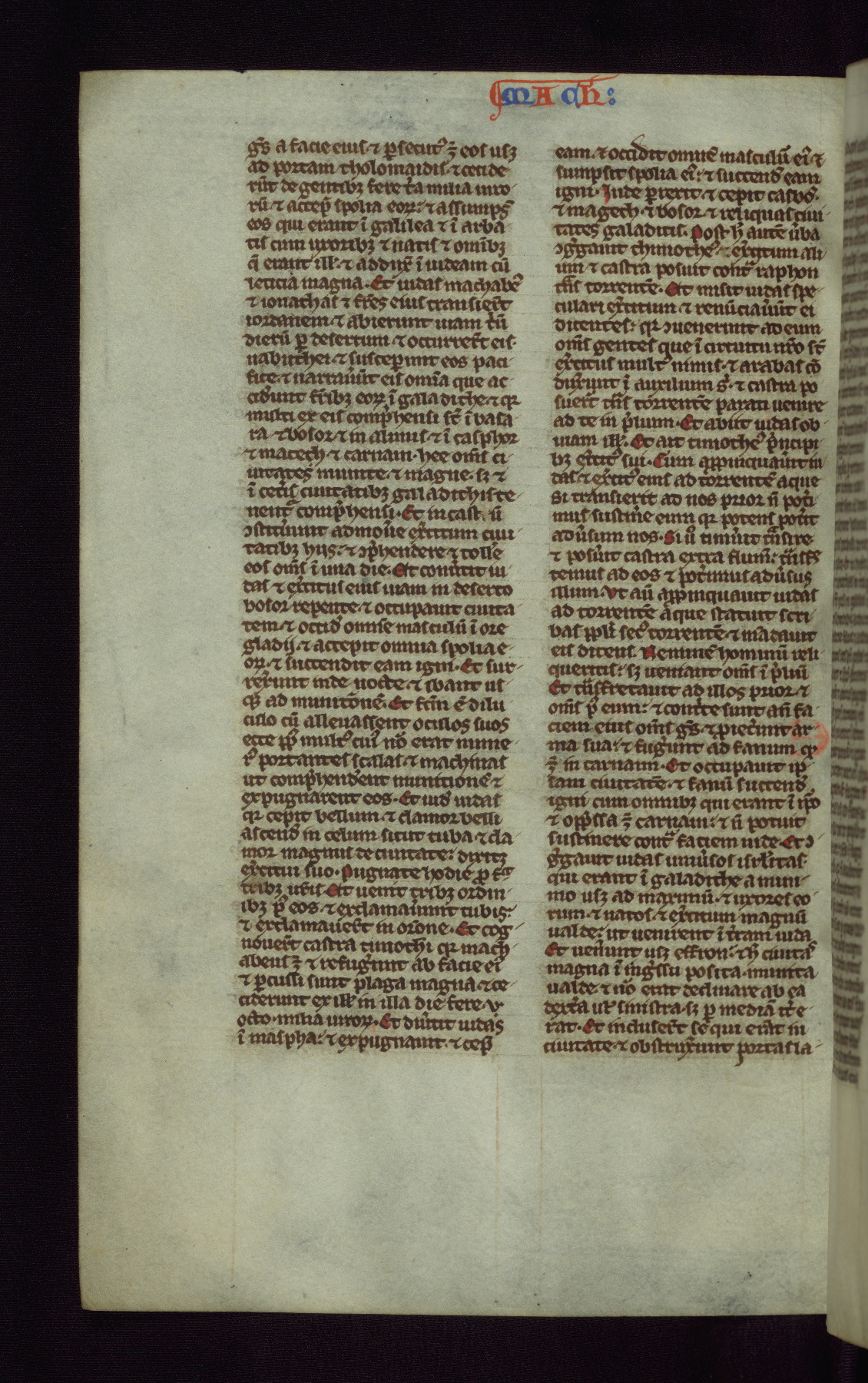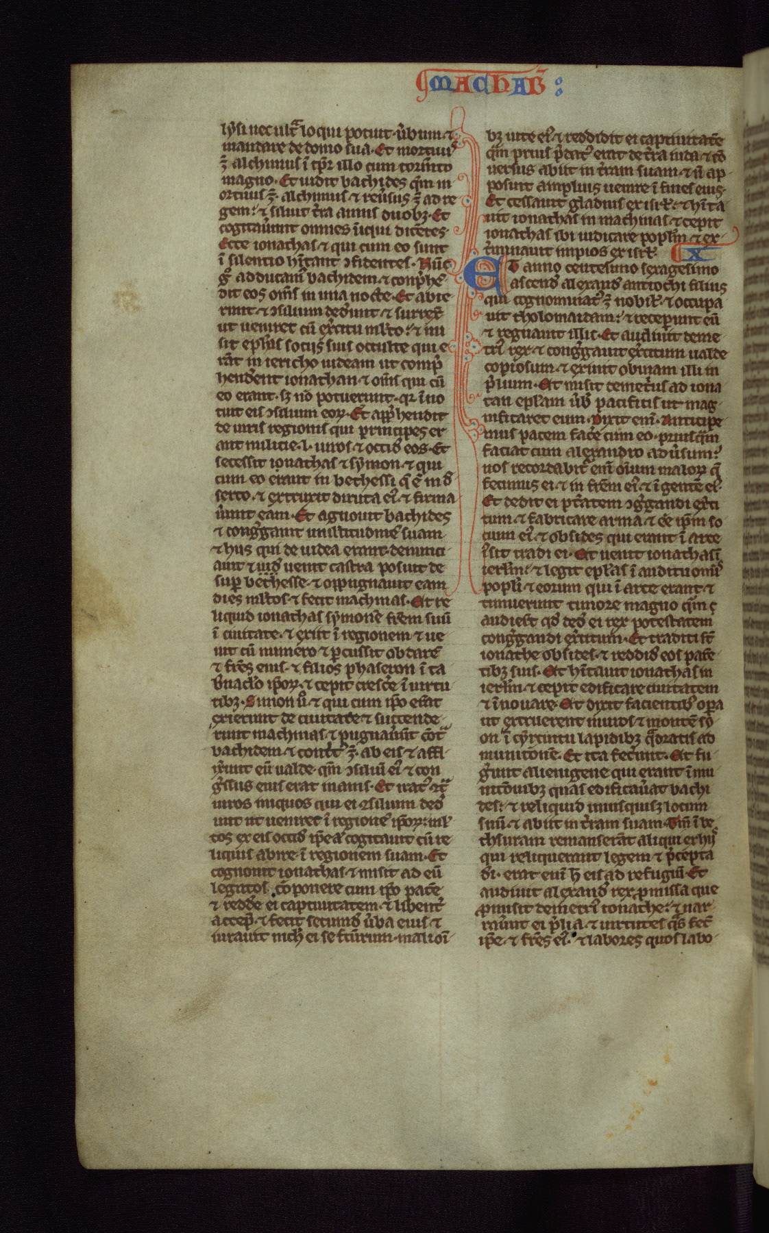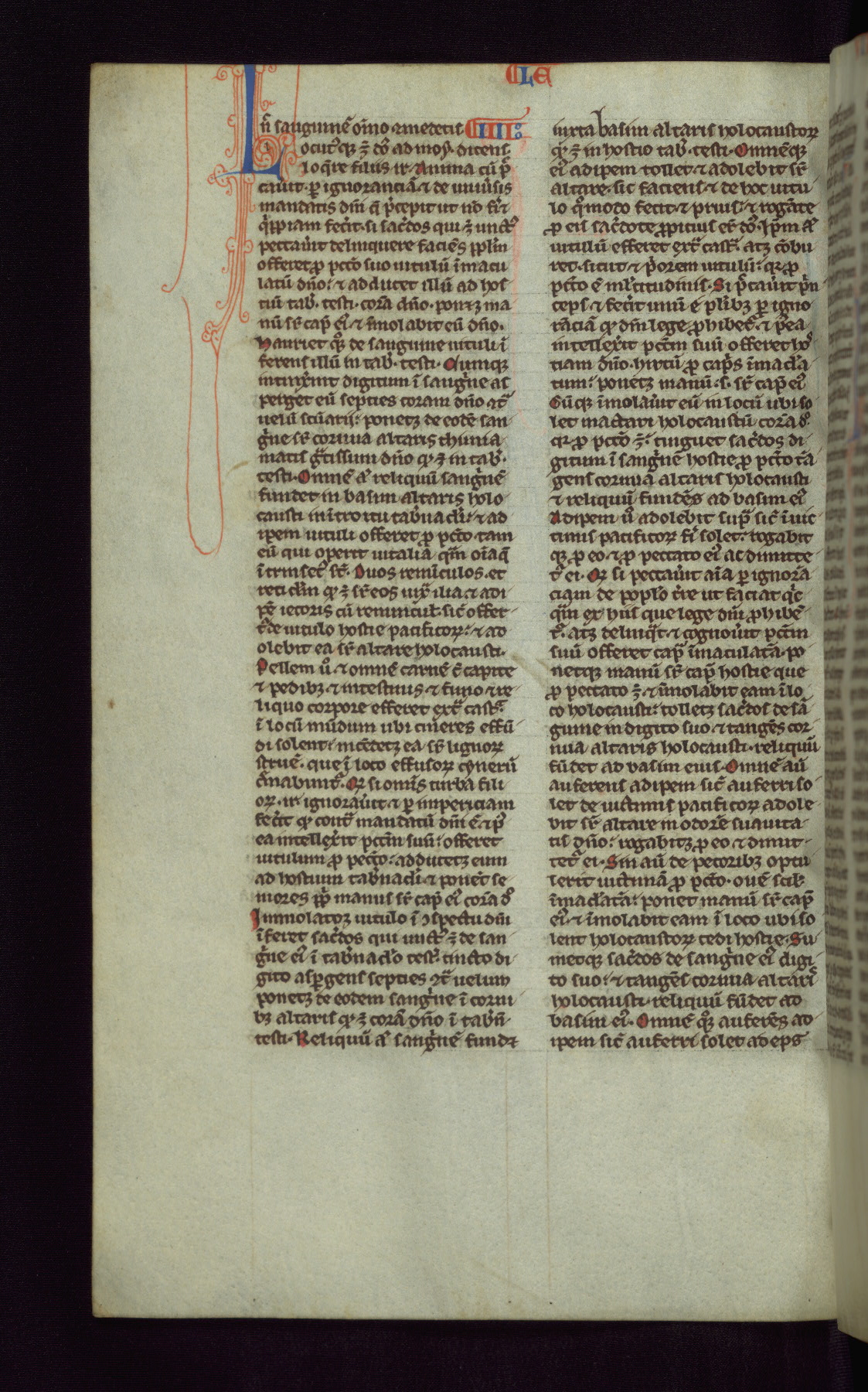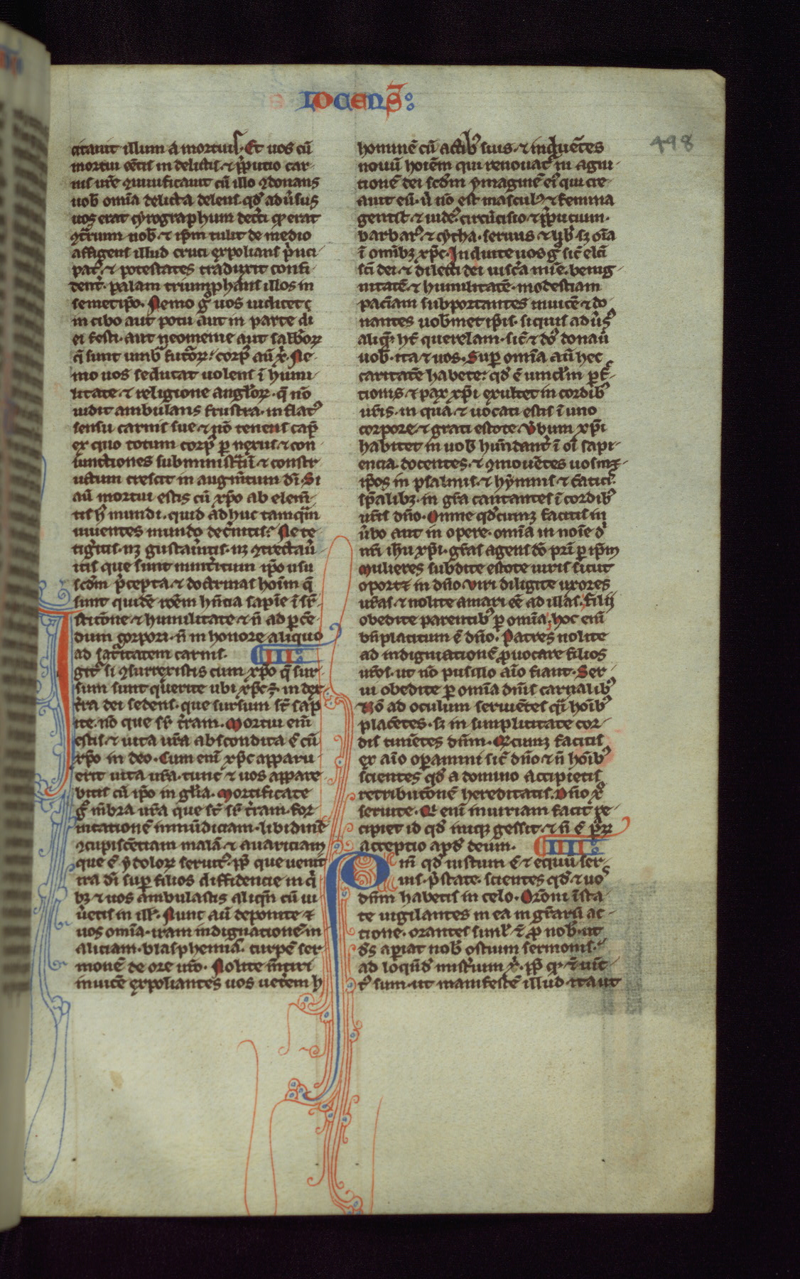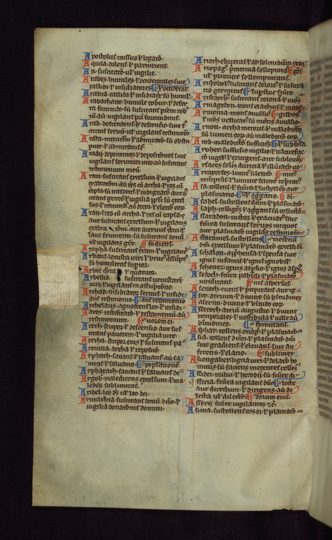 This pocket-size Bible was created around the middle of the thirteenth century in England. It contains the Vulgate text of the Old and New Testaments, arranged in order and divided into chapters. Such Bibles, designed for individual rather than institutional use, began to be created on a large scale during the thirteenth century, especially in Paris. This manuscript is illuminated with a large number of small historiated initials, and also includes a somewhat later image of the Three Living and the Three Dead, a popular scene based on a French poem of the same century.