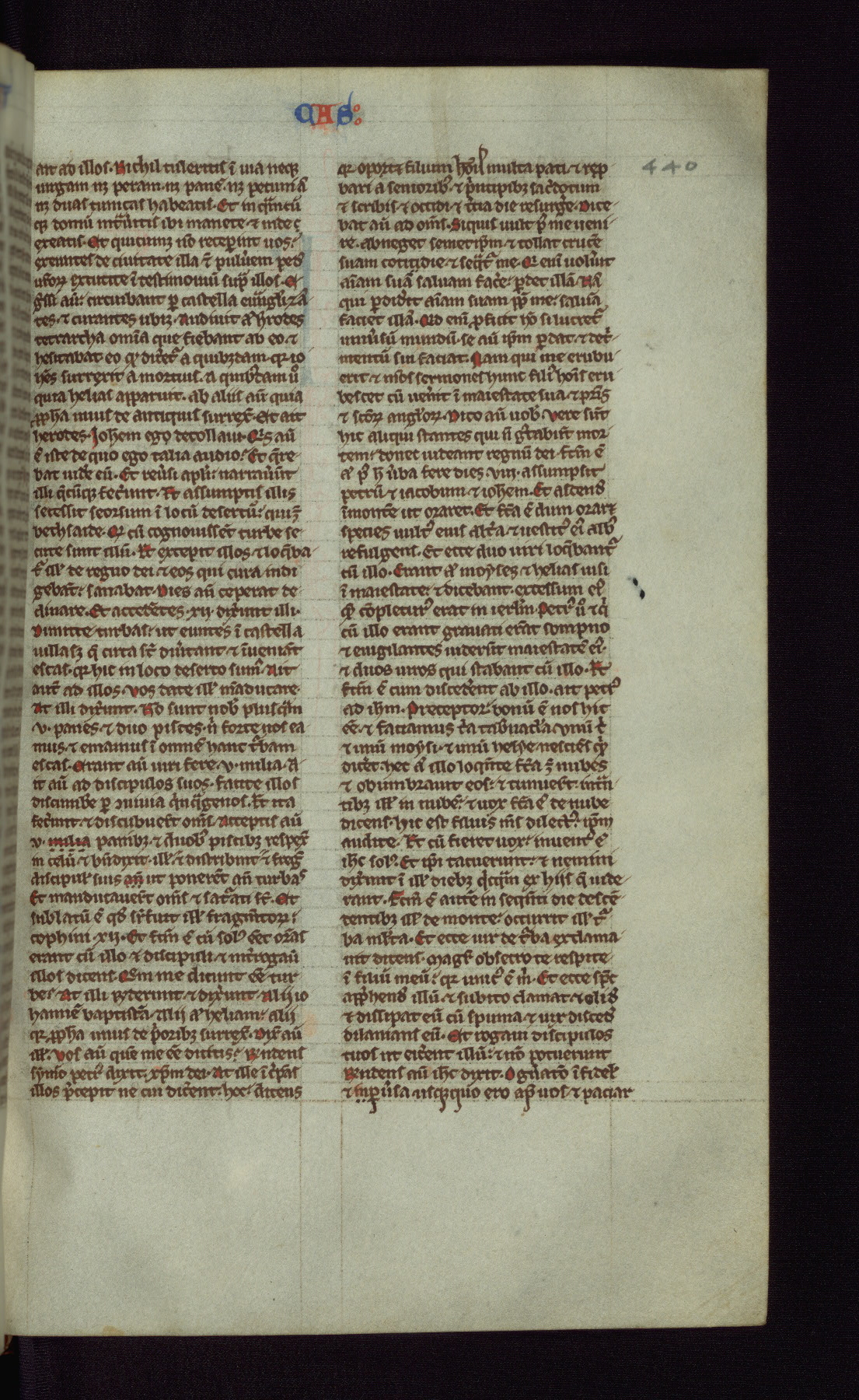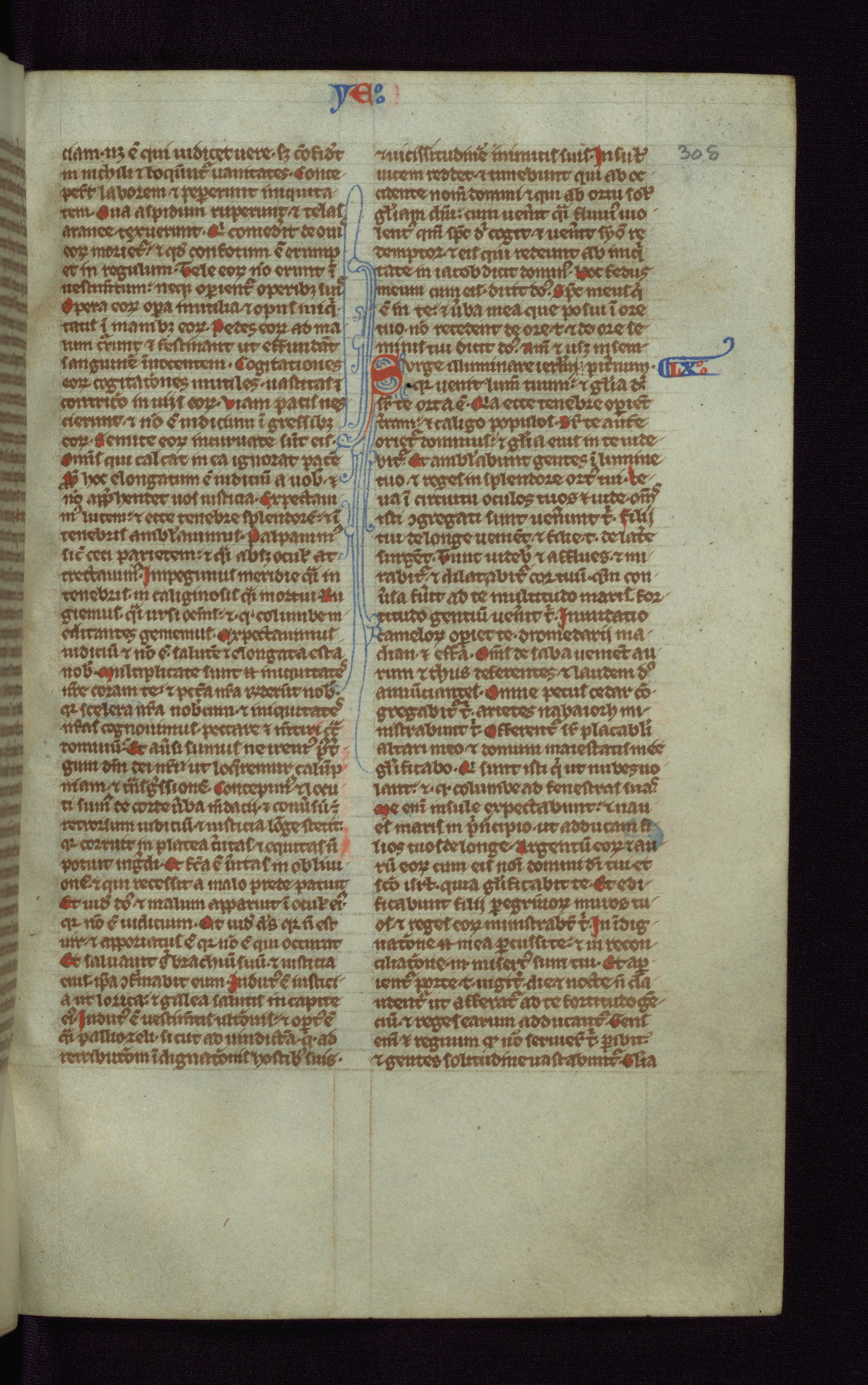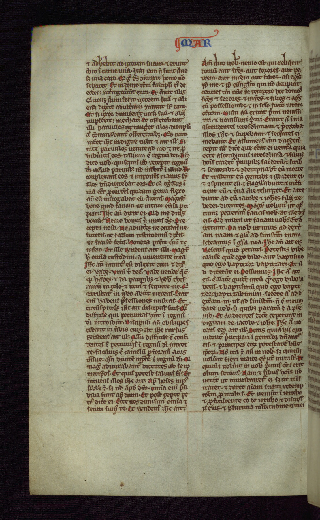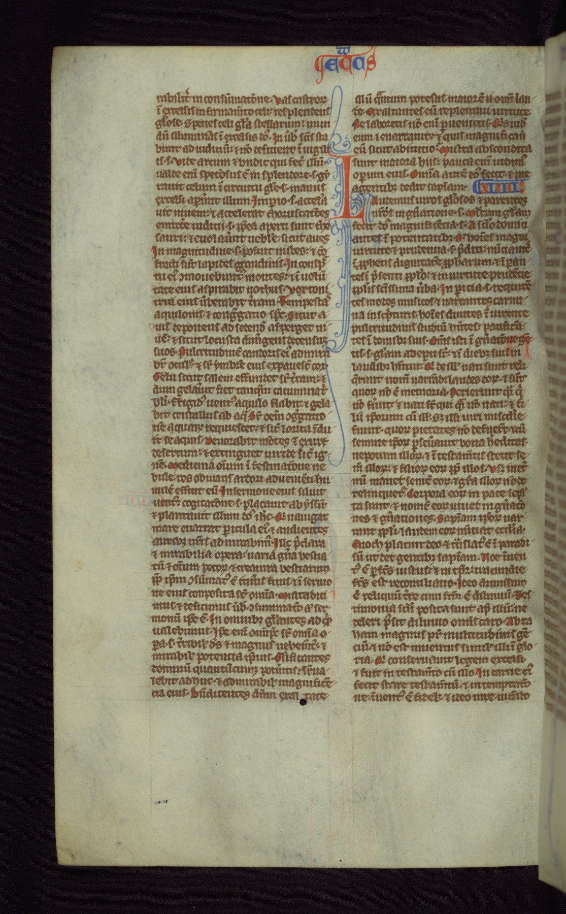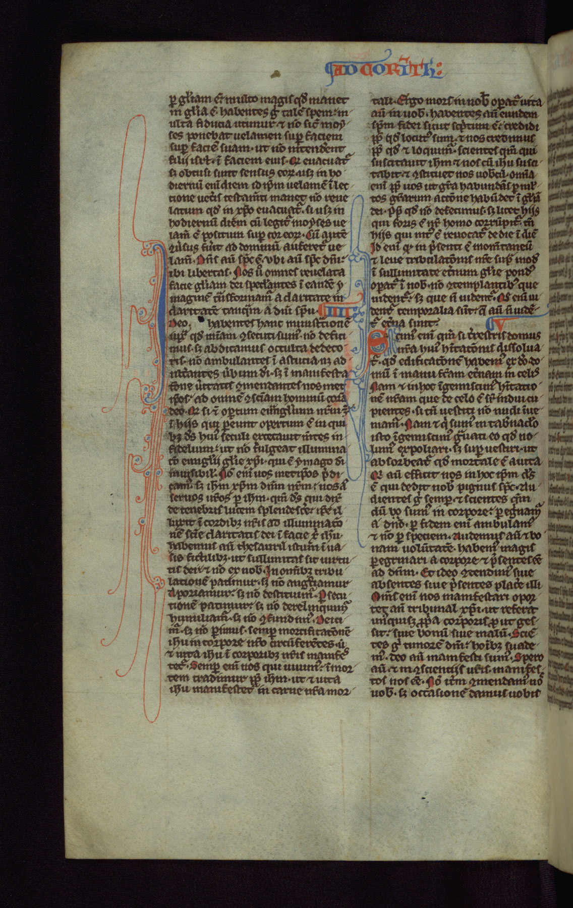 This pocket-size Bible was created around the middle of the thirteenth century in England. It contains the Vulgate text of the Old and New Testaments, arranged in order and divided into chapters. Such Bibles, designed for individual rather than institutional use, began to be created on a large scale during the thirteenth century, especially in Paris. This manuscript is illuminated with a large number of small historiated initials, and also includes a somewhat later image of the Three Living and the Three Dead, a popular scene based on a French poem of the same century.