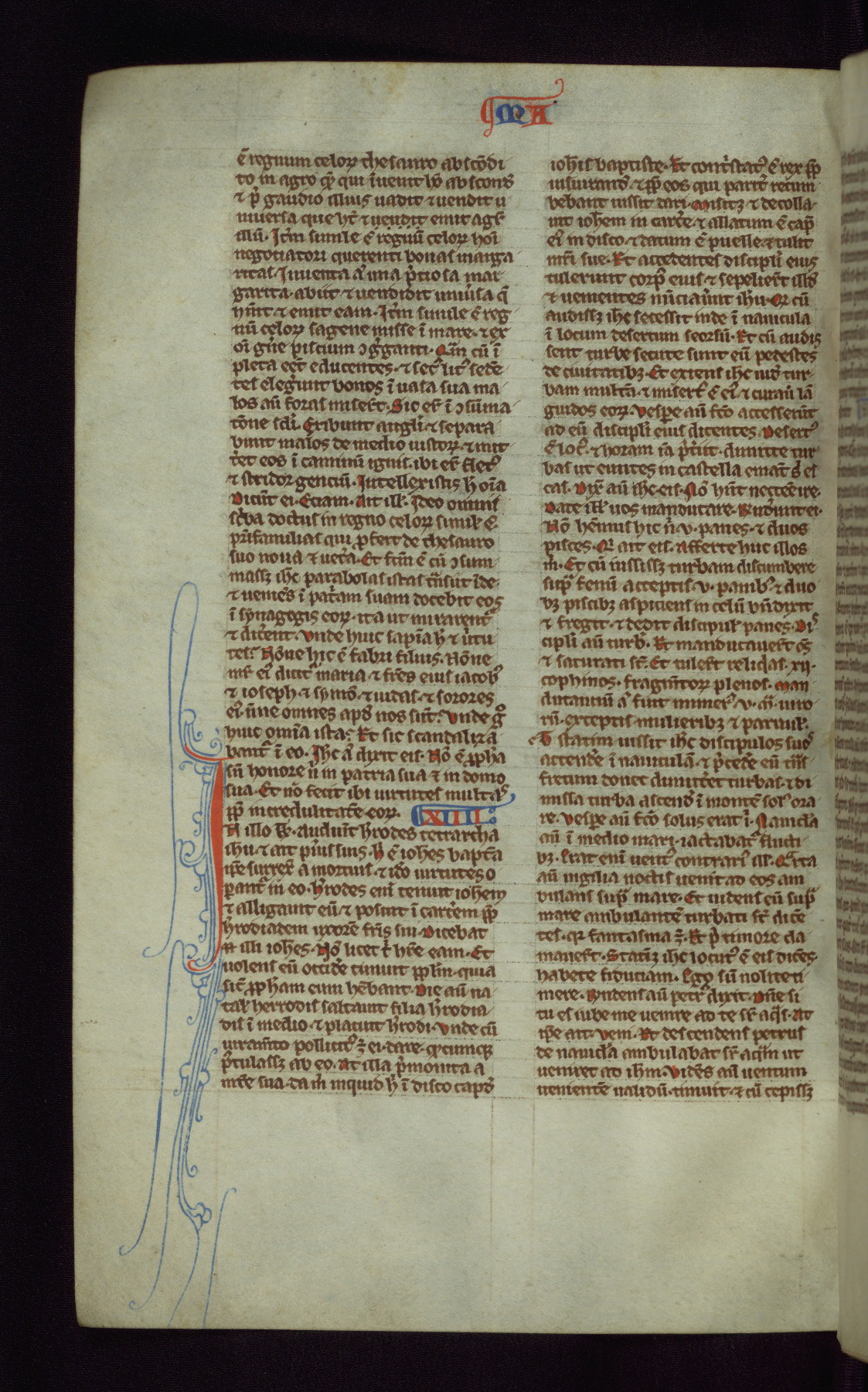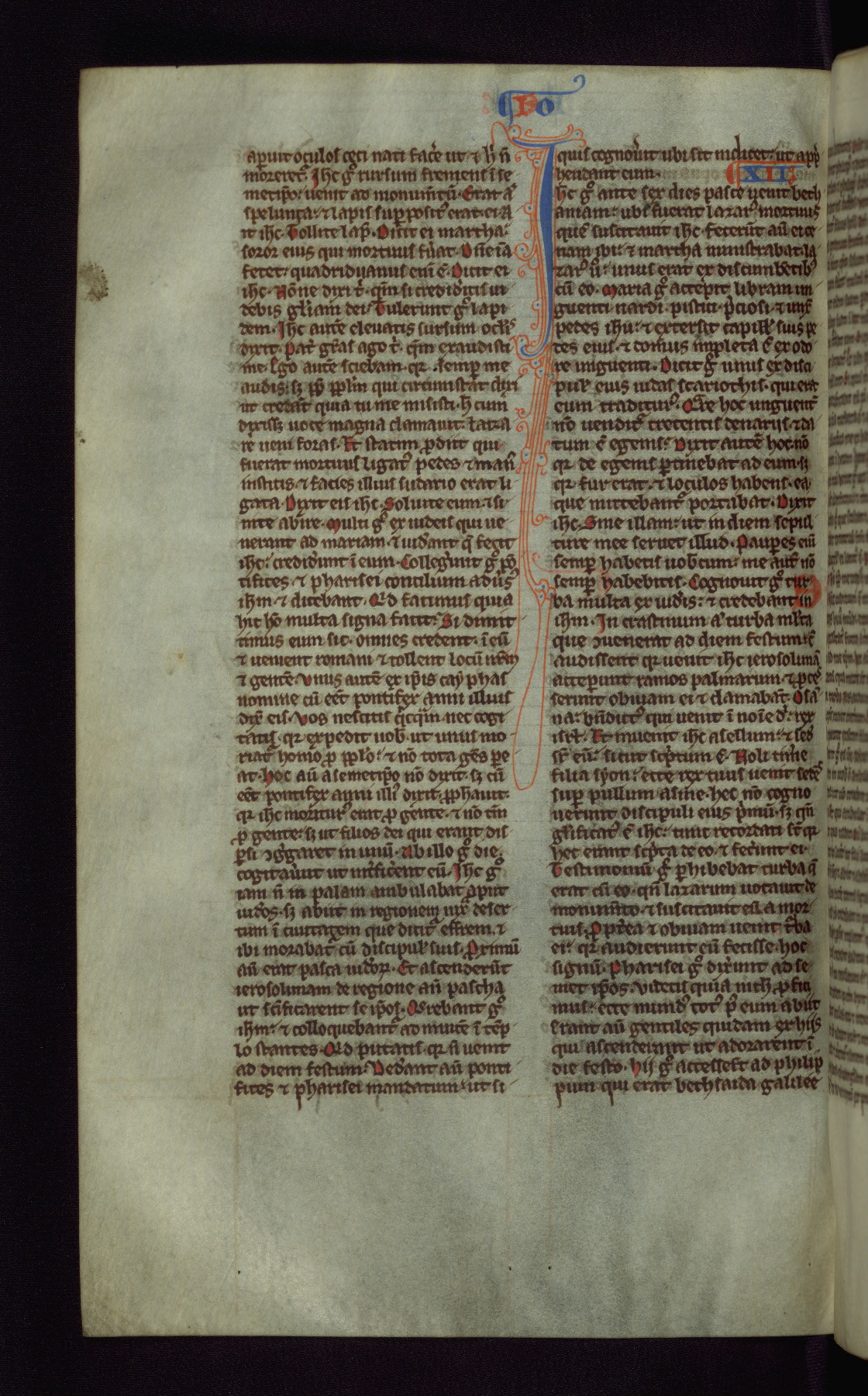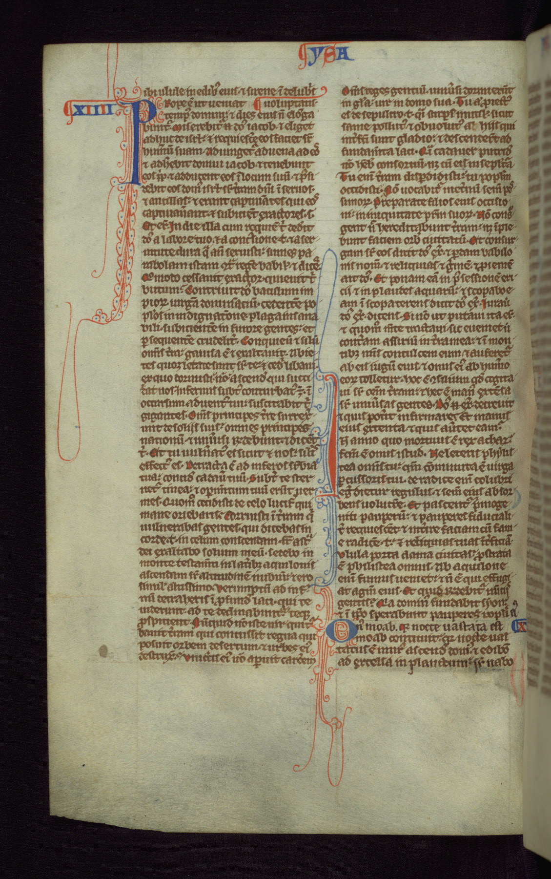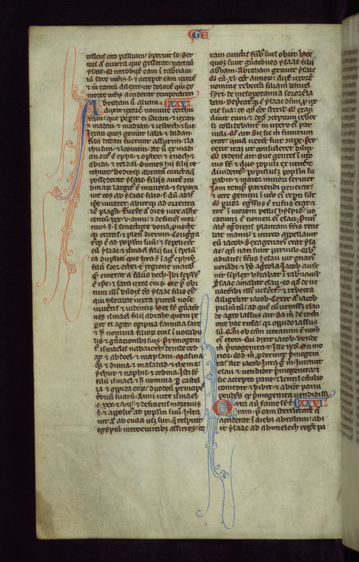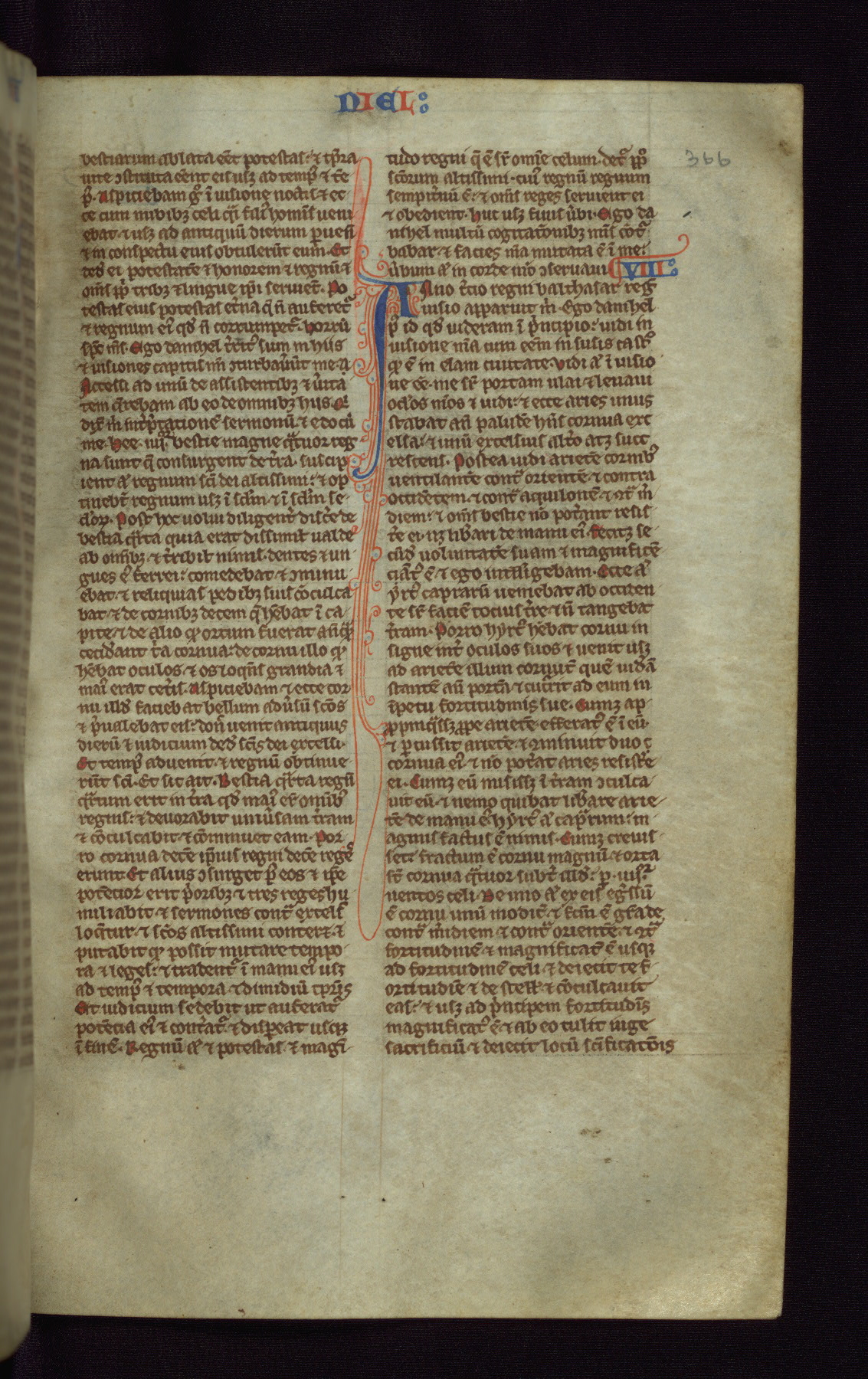 This pocket-size Bible was created around the middle of the thirteenth century in England. It contains the Vulgate text of the Old and New Testaments, arranged in order and divided into chapters. Such Bibles, designed for individual rather than institutional use, began to be created on a large scale during the thirteenth century, especially in Paris. This manuscript is illuminated with a large number of small historiated initials, and also includes a somewhat later image of the Three Living and the Three Dead, a popular scene based on a French poem of the same century.