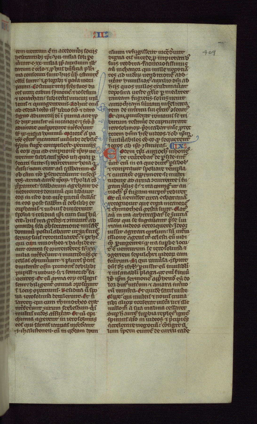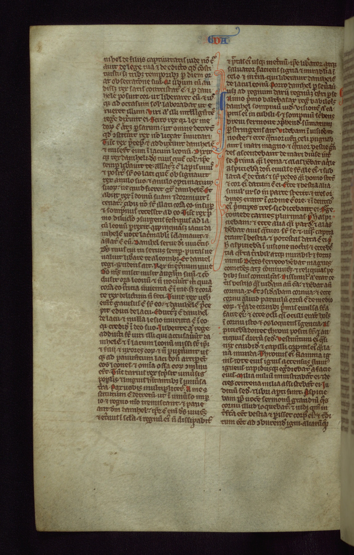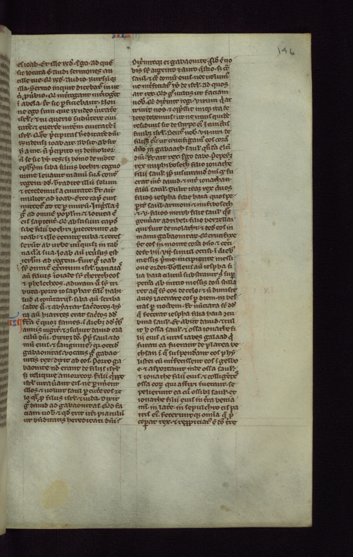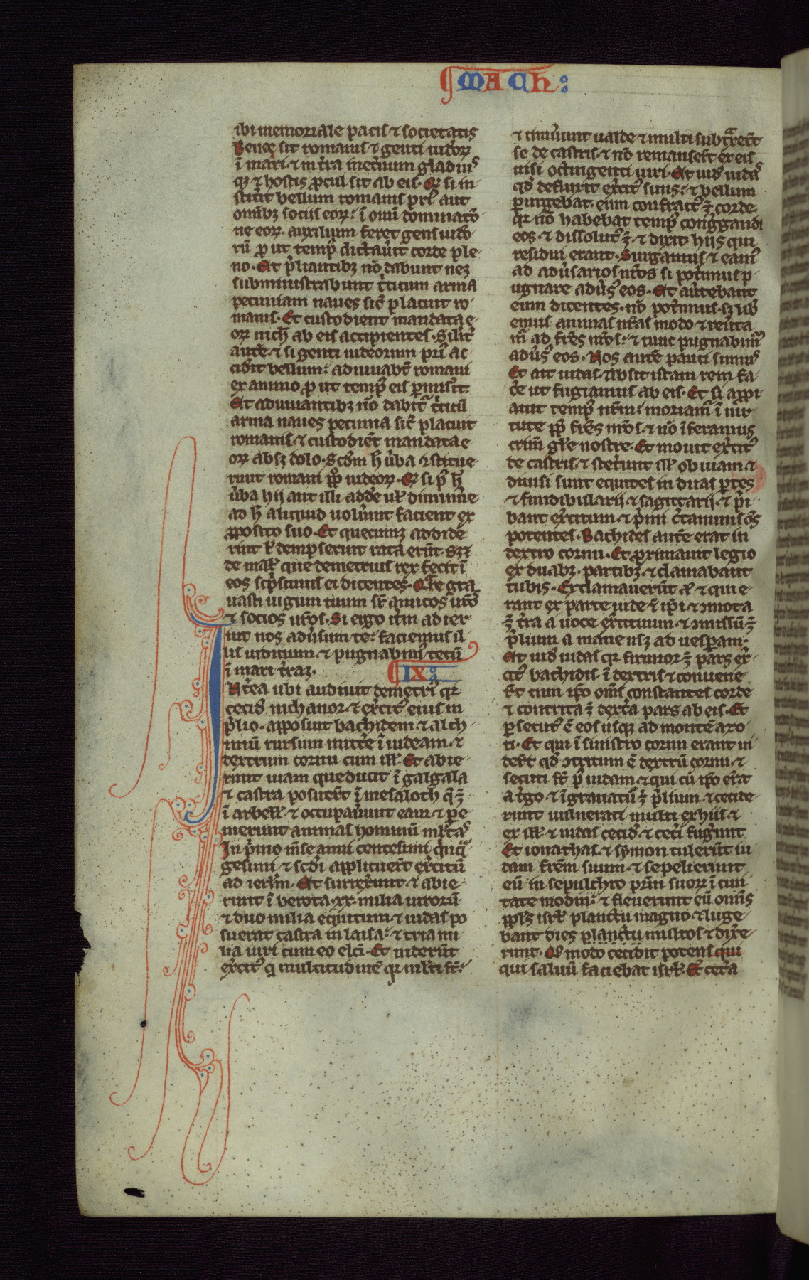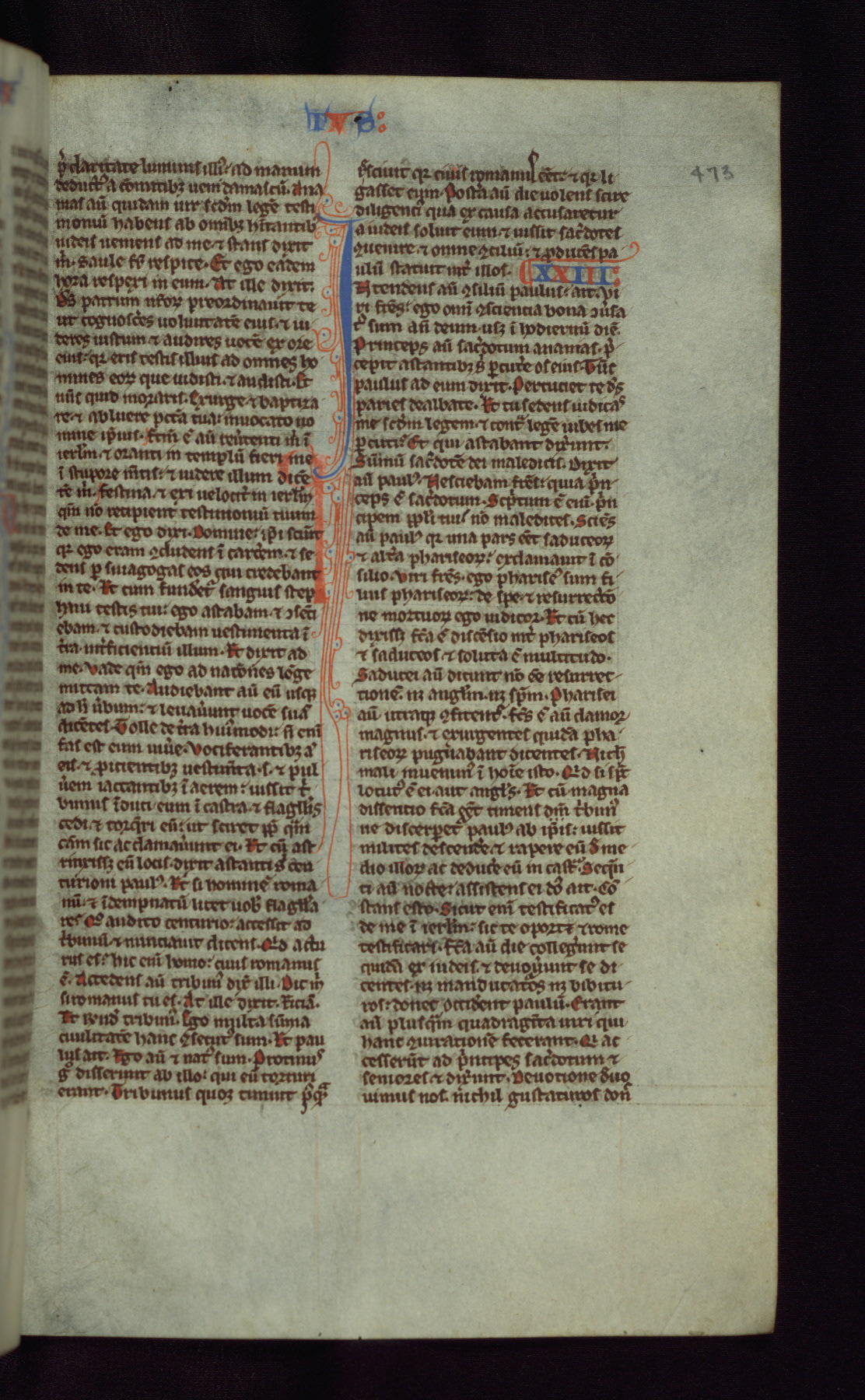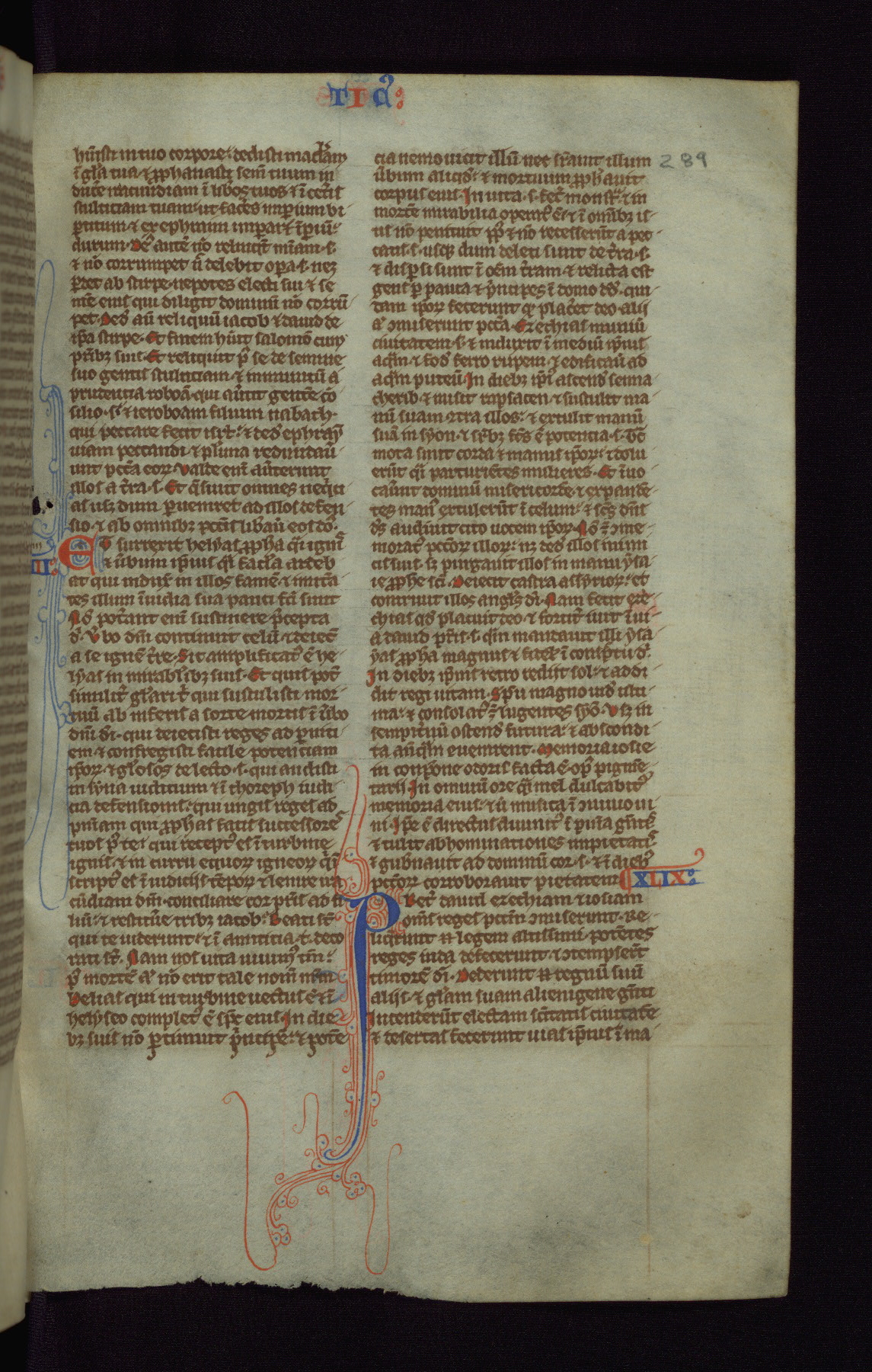 This pocket-size Bible was created around the middle of the thirteenth century in England. It contains the Vulgate text of the Old and New Testaments, arranged in order and divided into chapters. Such Bibles, designed for individual rather than institutional use, began to be created on a large scale during the thirteenth century, especially in Paris. This manuscript is illuminated with a large number of small historiated initials, and also includes a somewhat later image of the Three Living and the Three Dead, a popular scene based on a French poem of the same century.