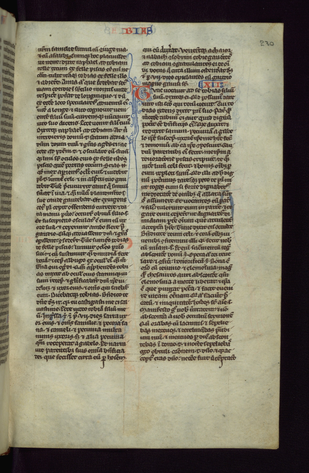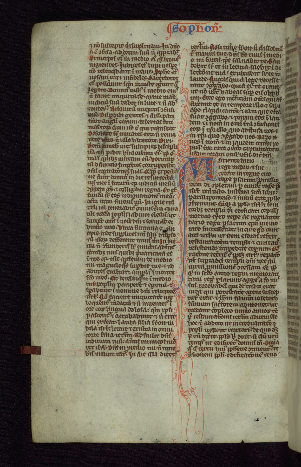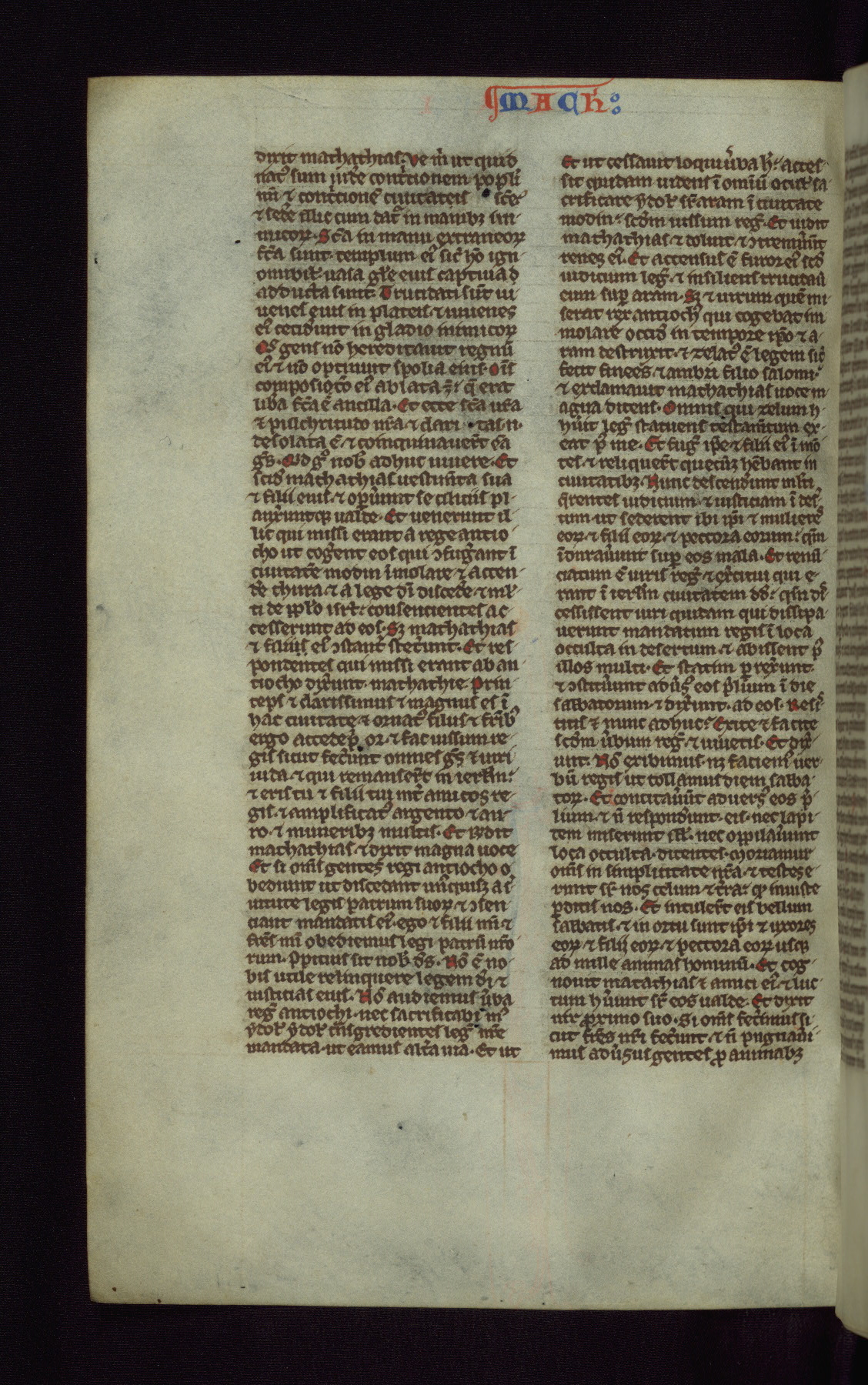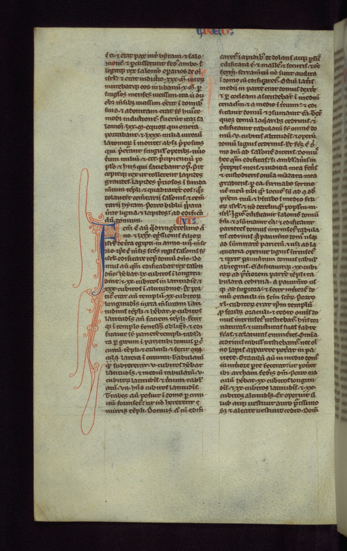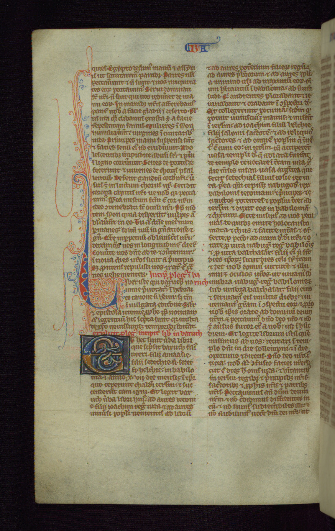 This pocket-size Bible was created around the middle of the thirteenth century in England. It contains the Vulgate text of the Old and New Testaments, arranged in order and divided into chapters. Such Bibles, designed for individual rather than institutional use, began to be created on a large scale during the thirteenth century, especially in Paris. This manuscript is illuminated with a large number of small historiated initials, and also includes a somewhat later image of the Three Living and the Three Dead, a popular scene based on a French poem of the same century.