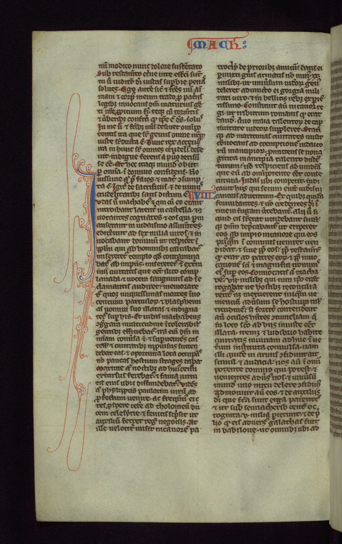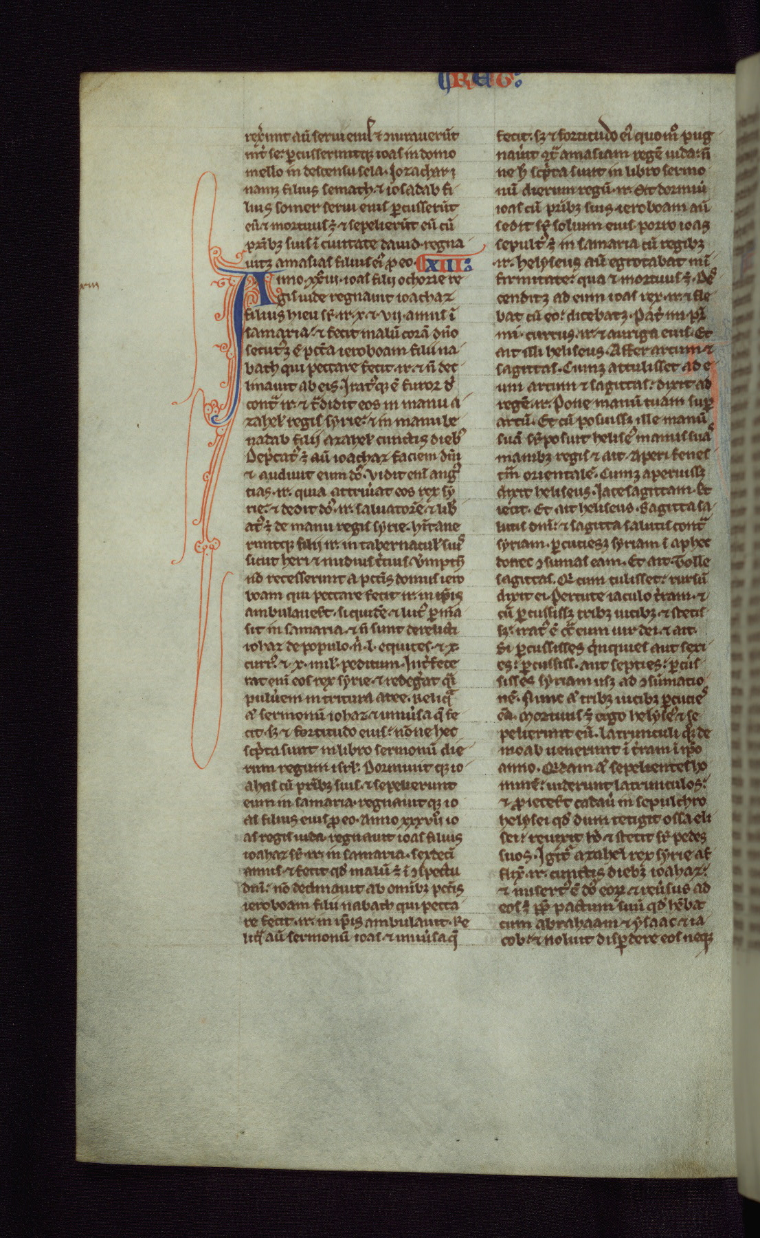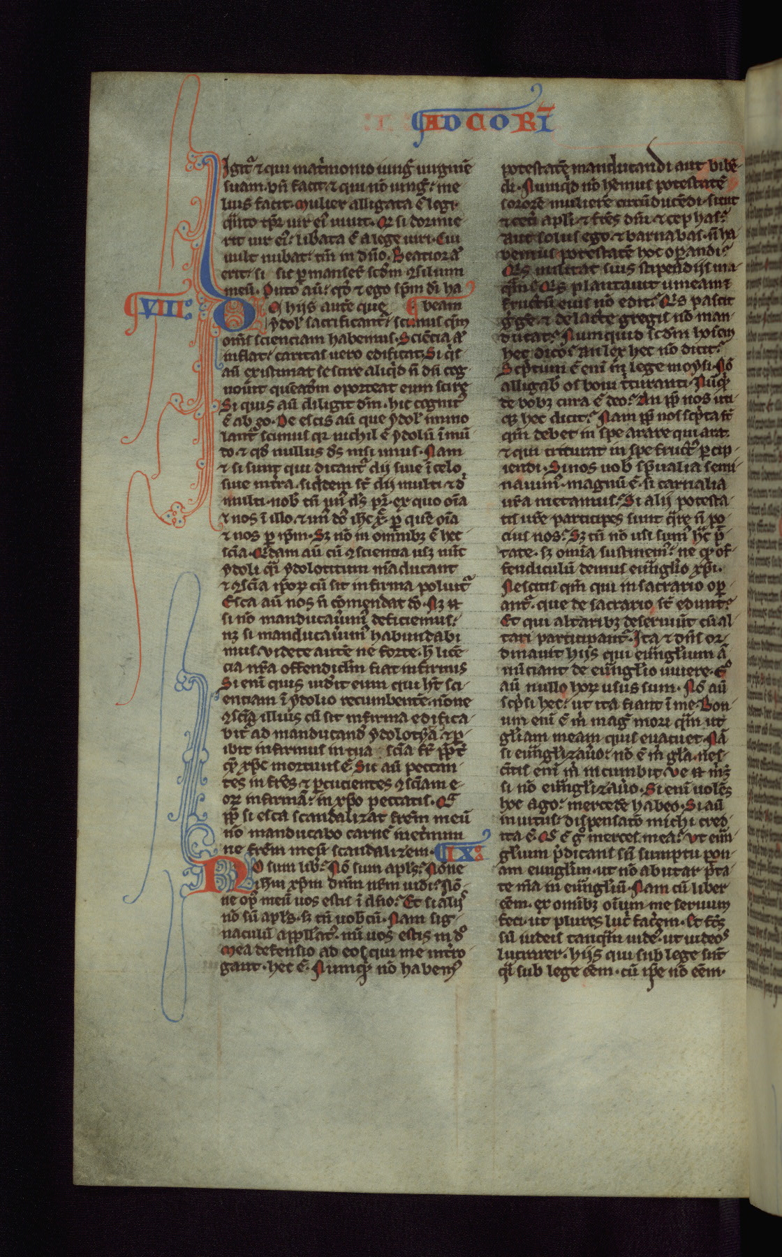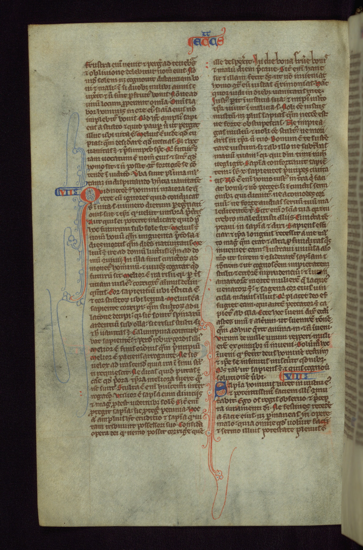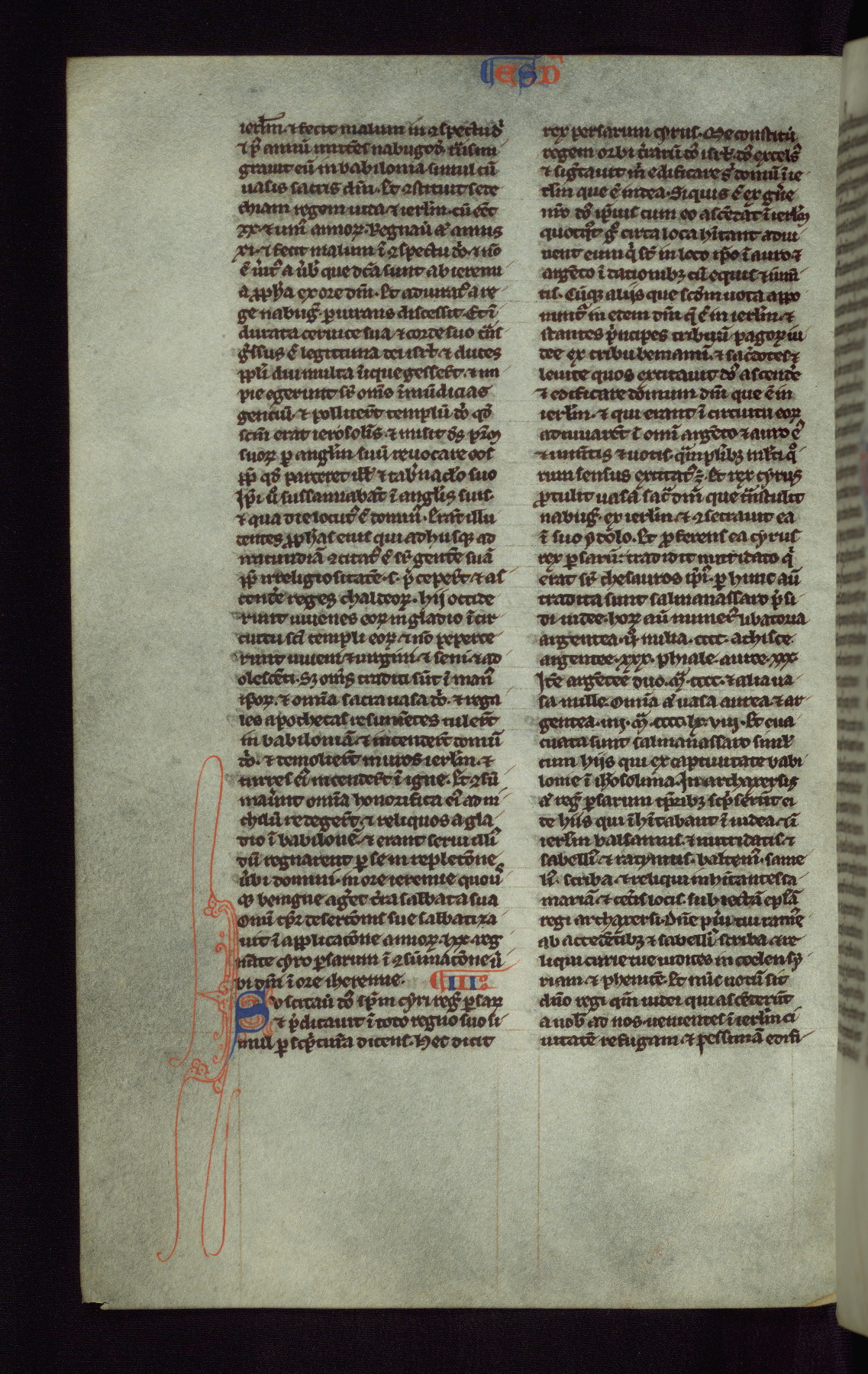 This pocket-size Bible was created around the middle of the thirteenth century in England. It contains the Vulgate text of the Old and New Testaments, arranged in order and divided into chapters. Such Bibles, designed for individual rather than institutional use, began to be created on a large scale during the thirteenth century, especially in Paris. This manuscript is illuminated with a large number of small historiated initials, and also includes a somewhat later image of the Three Living and the Three Dead, a popular scene based on a French poem of the same century.