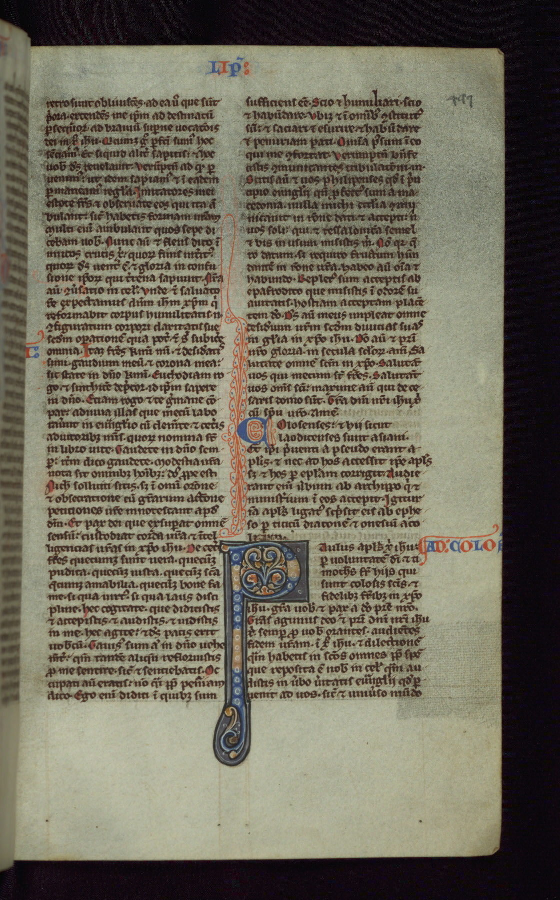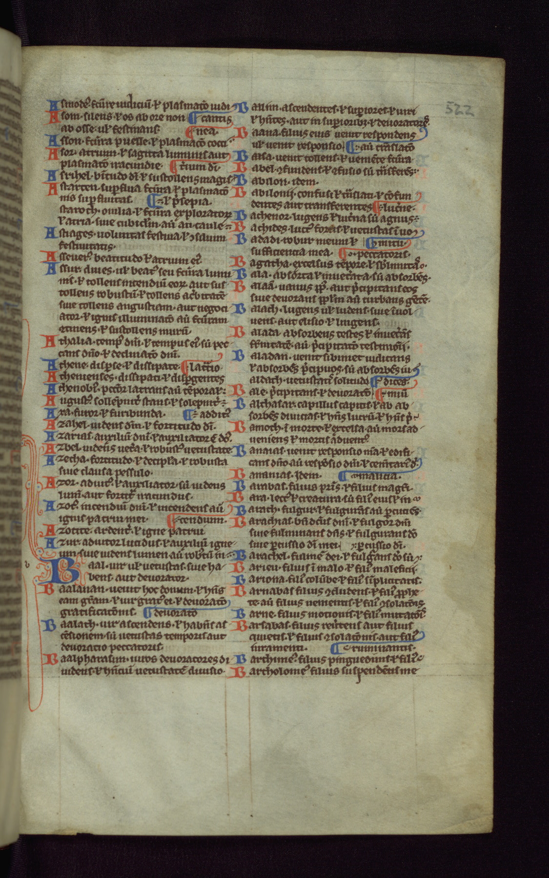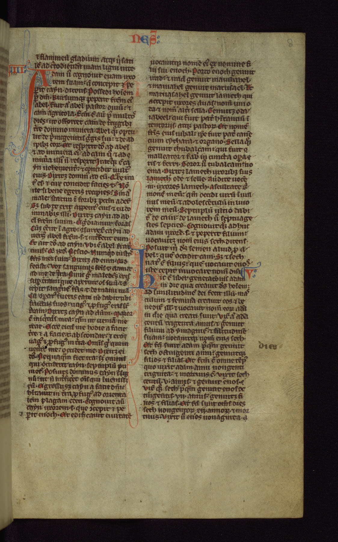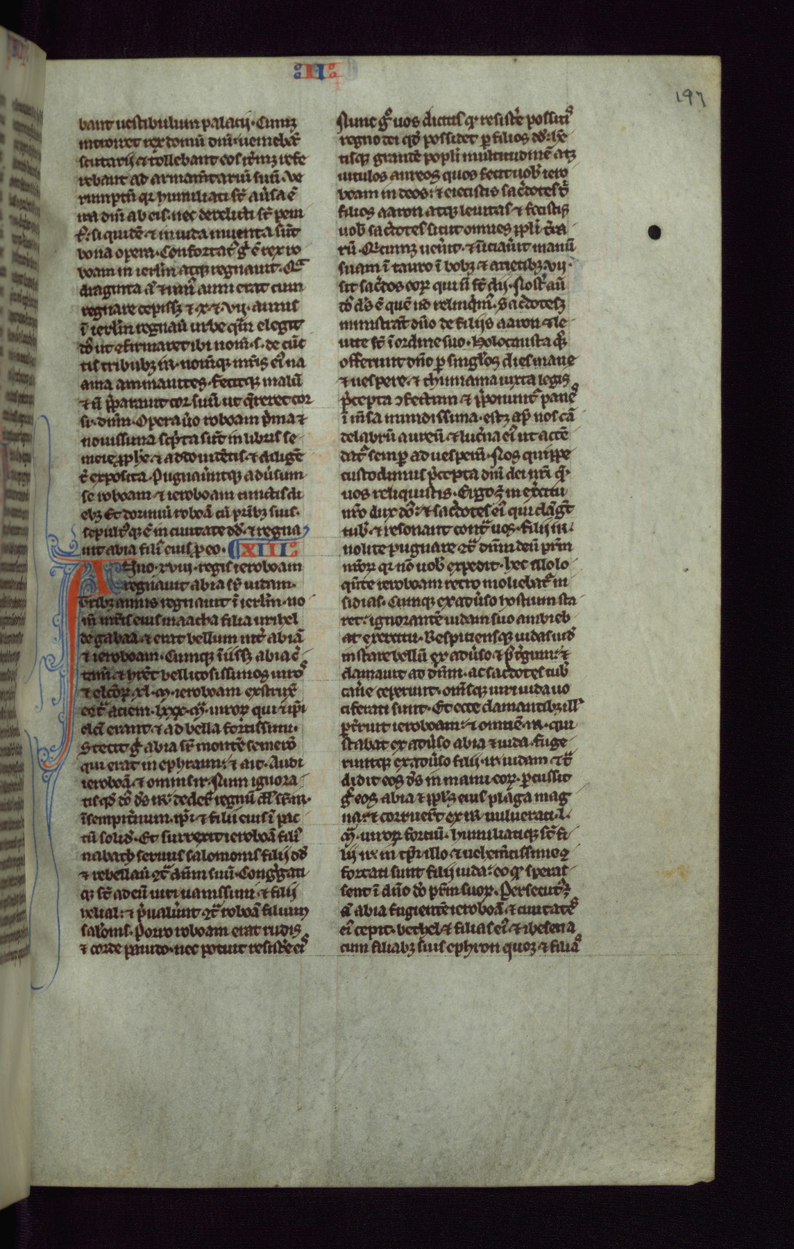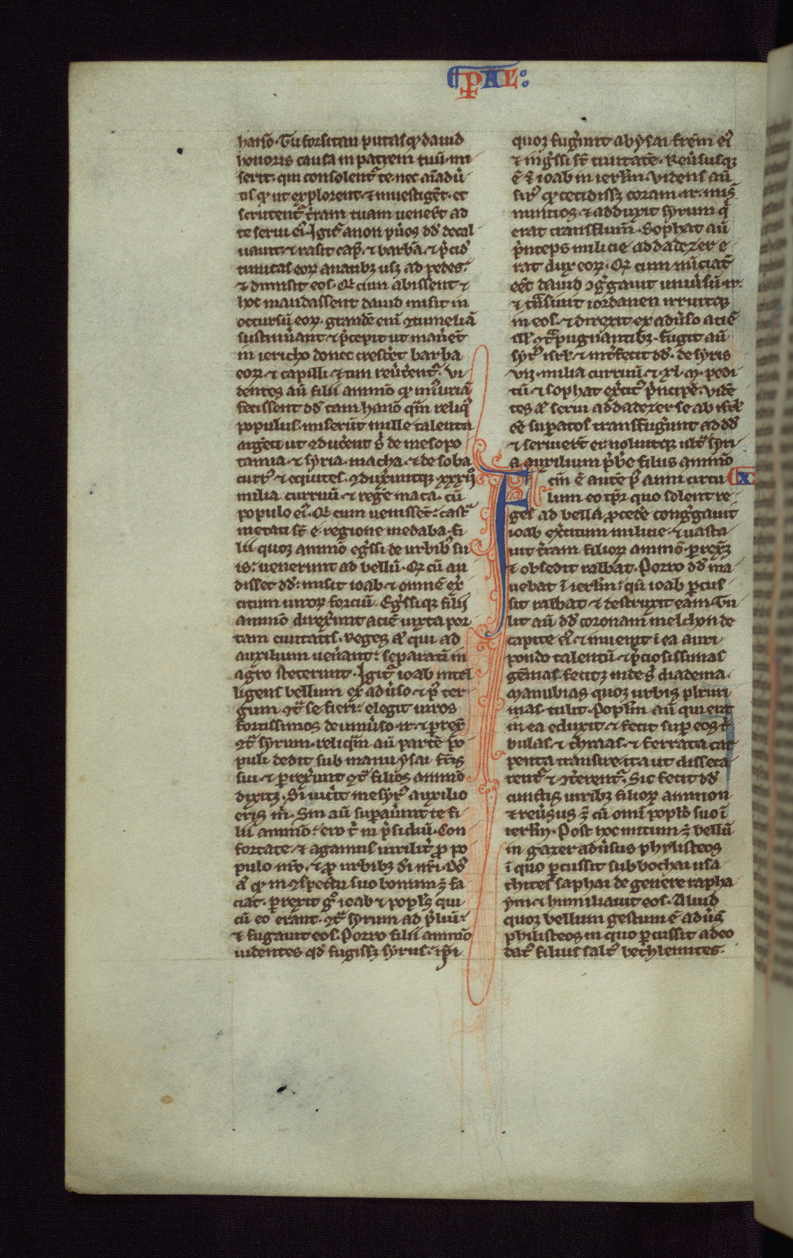 This pocket-size Bible was created around the middle of the thirteenth century in England. It contains the Vulgate text of the Old and New Testaments, arranged in order and divided into chapters. Such Bibles, designed for individual rather than institutional use, began to be created on a large scale during the thirteenth century, especially in Paris. This manuscript is illuminated with a large number of small historiated initials, and also includes a somewhat later image of the Three Living and the Three Dead, a popular scene based on a French poem of the same century.