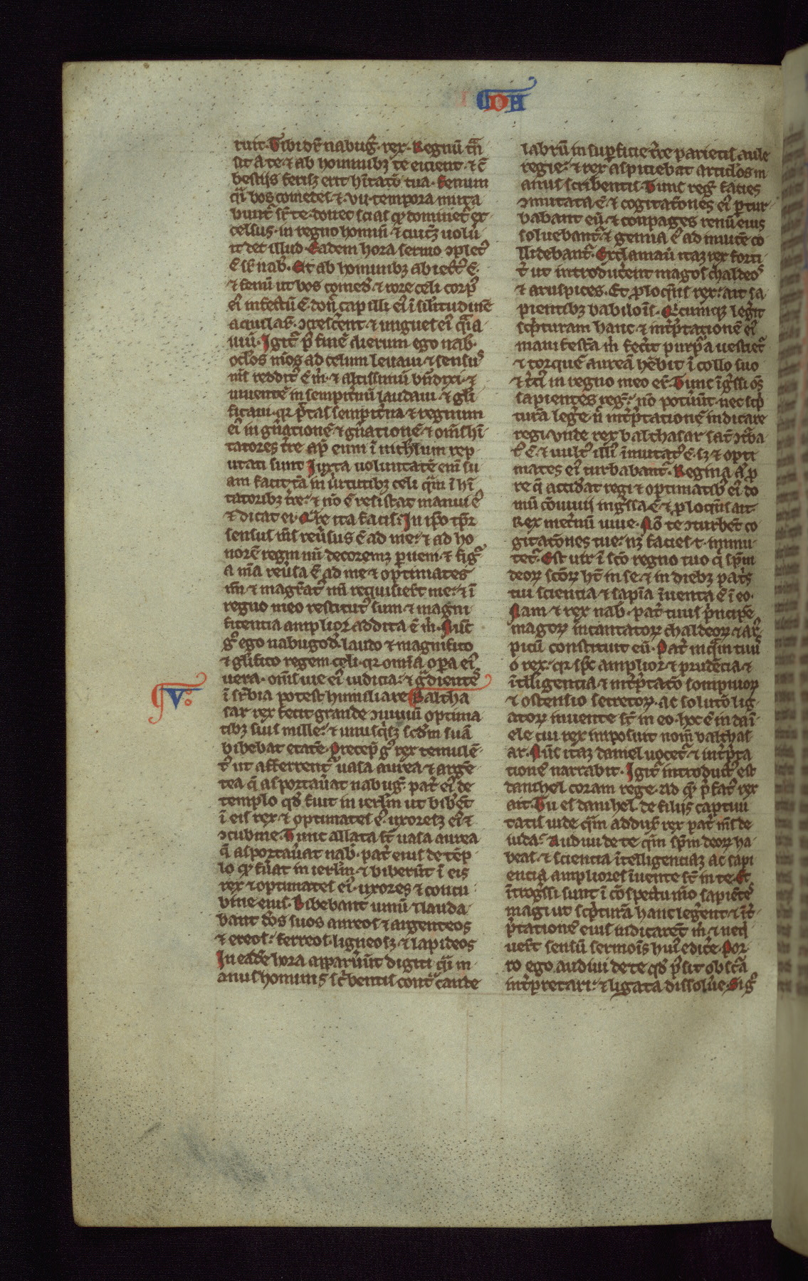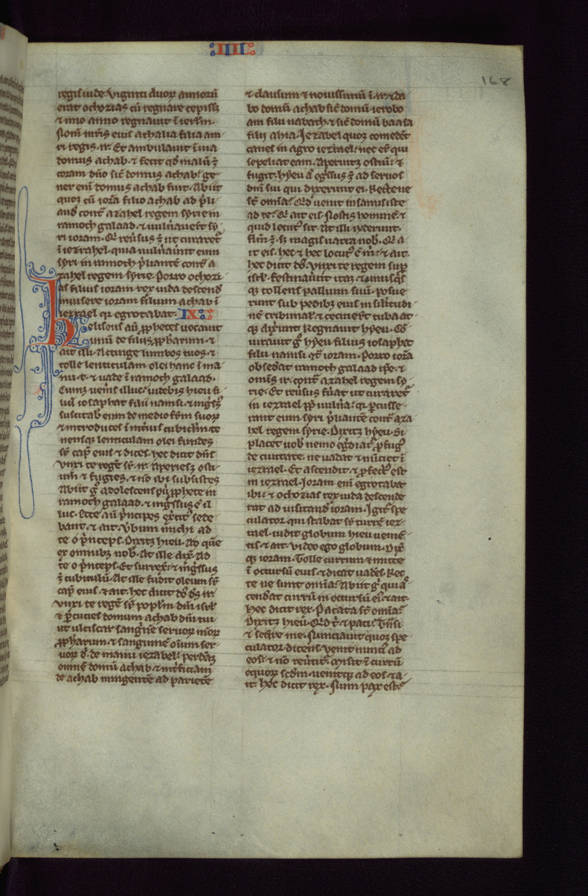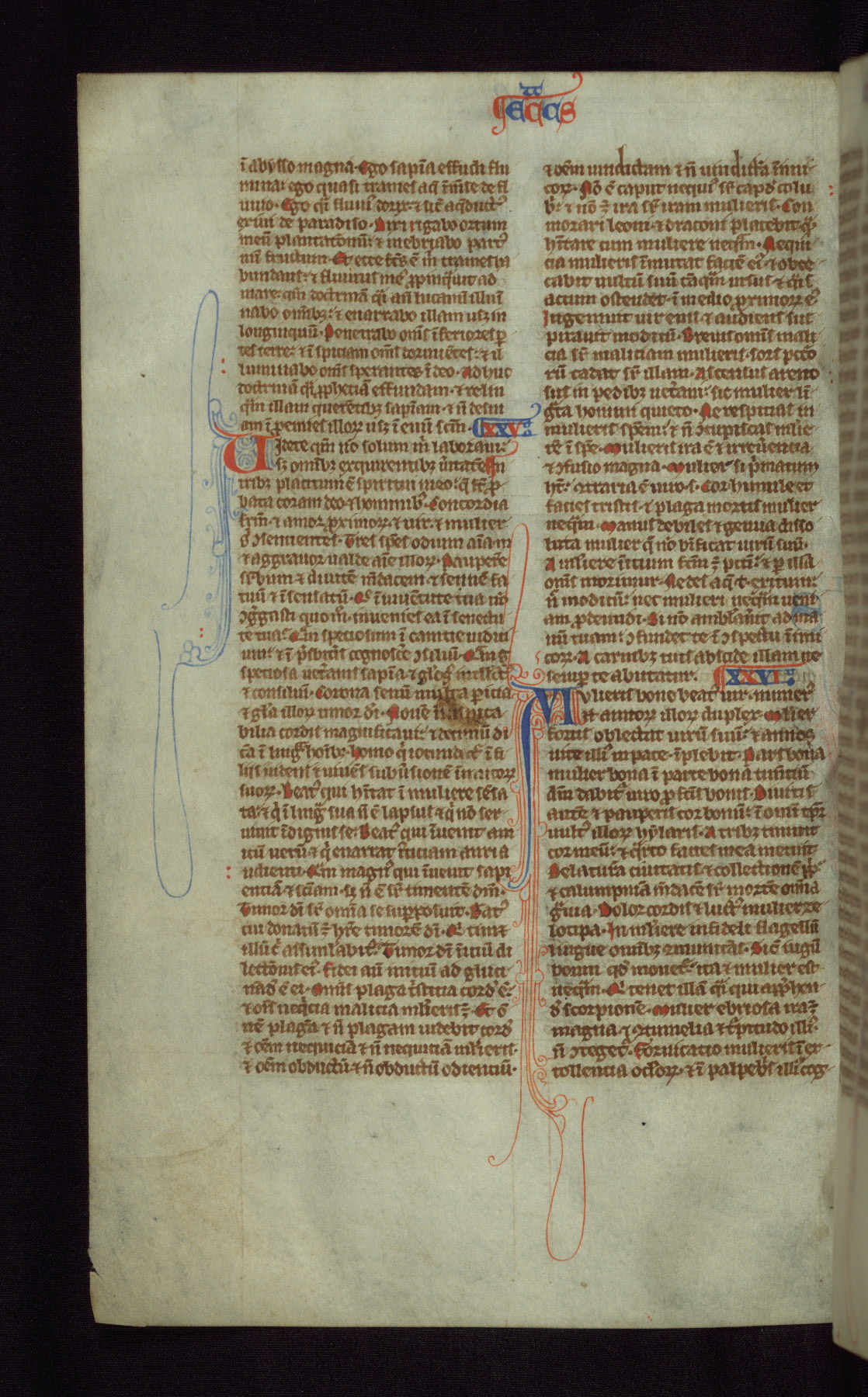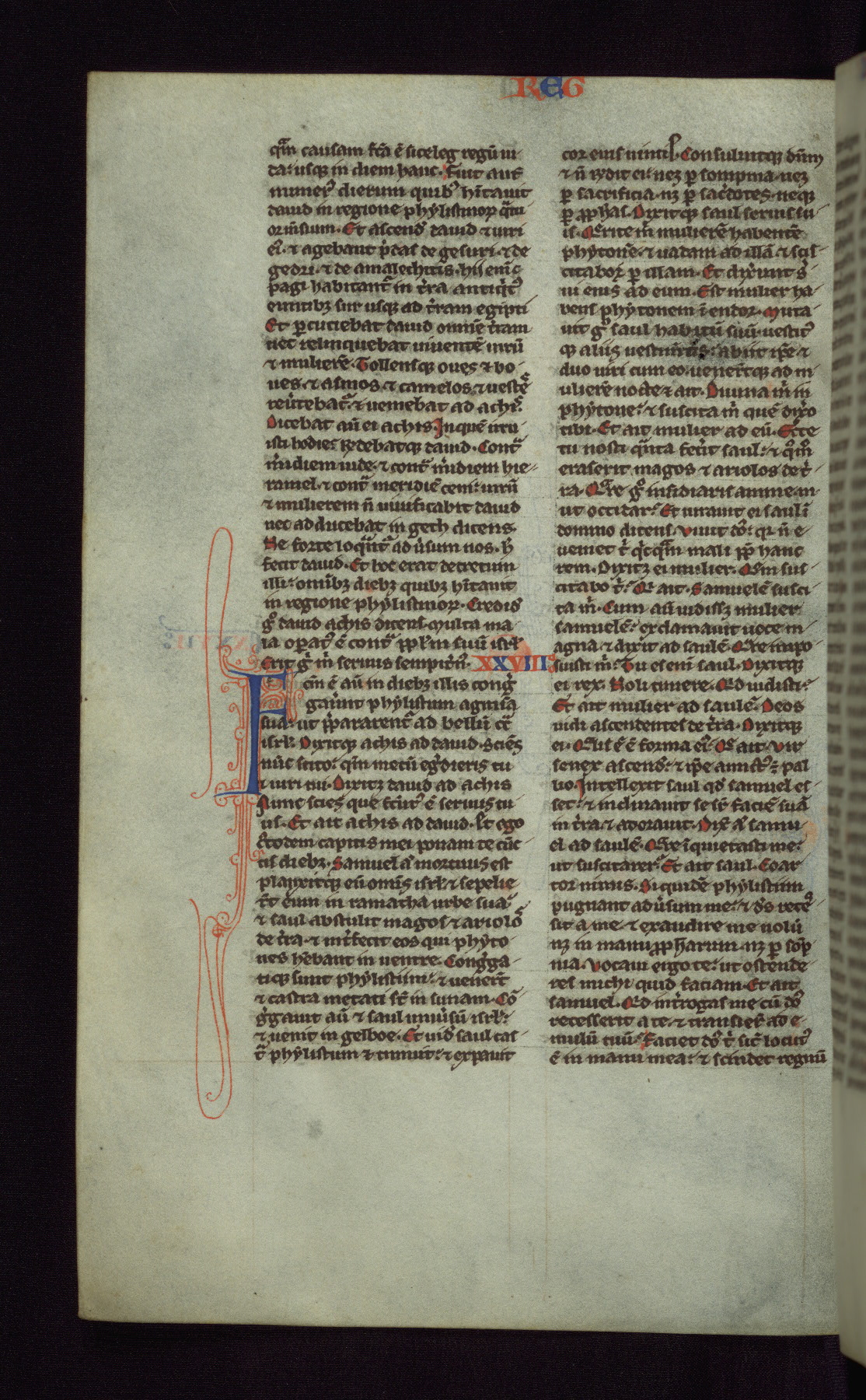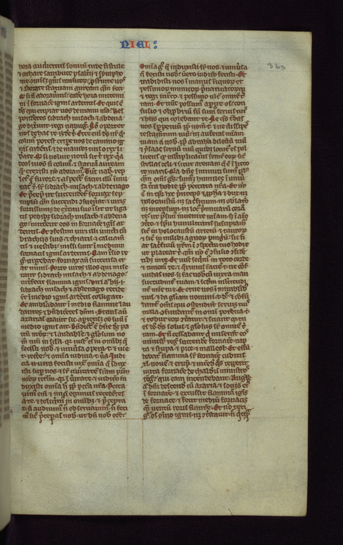 This pocket-size Bible was created around the middle of the thirteenth century in England. It contains the Vulgate text of the Old and New Testaments, arranged in order and divided into chapters. Such Bibles, designed for individual rather than institutional use, began to be created on a large scale during the thirteenth century, especially in Paris. This manuscript is illuminated with a large number of small historiated initials, and also includes a somewhat later image of the Three Living and the Three Dead, a popular scene based on a French poem of the same century.