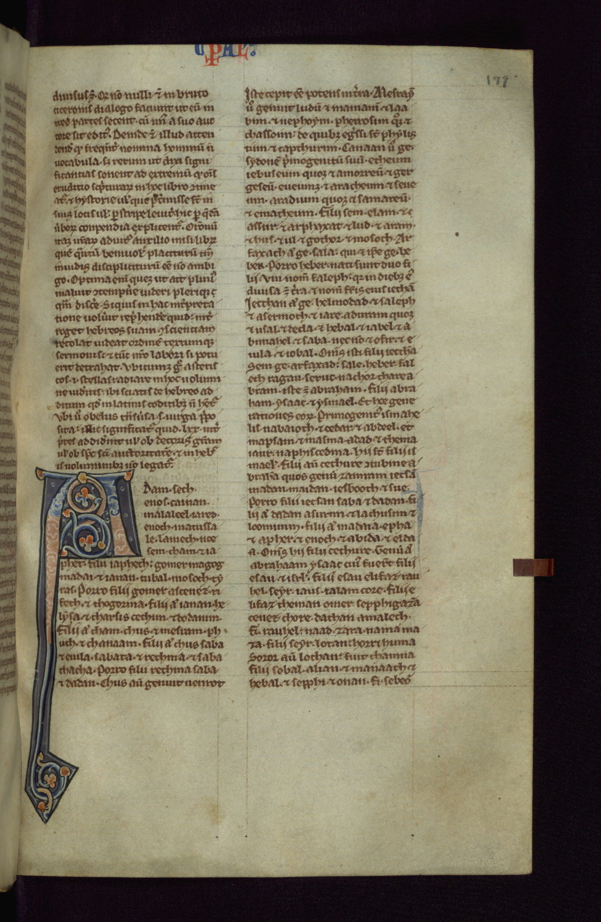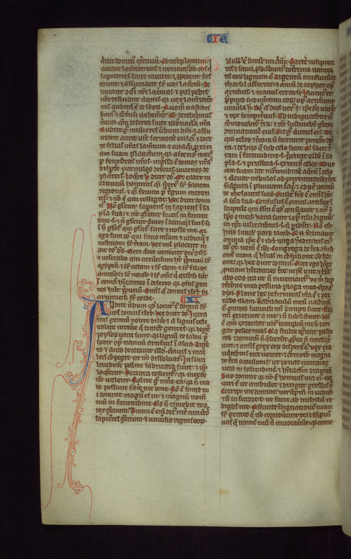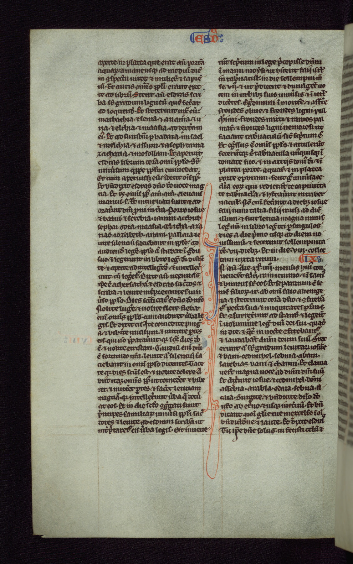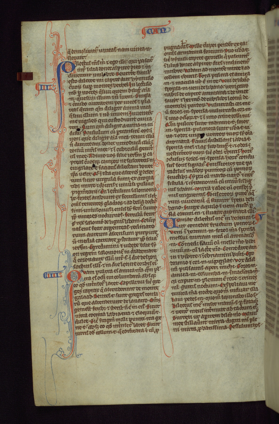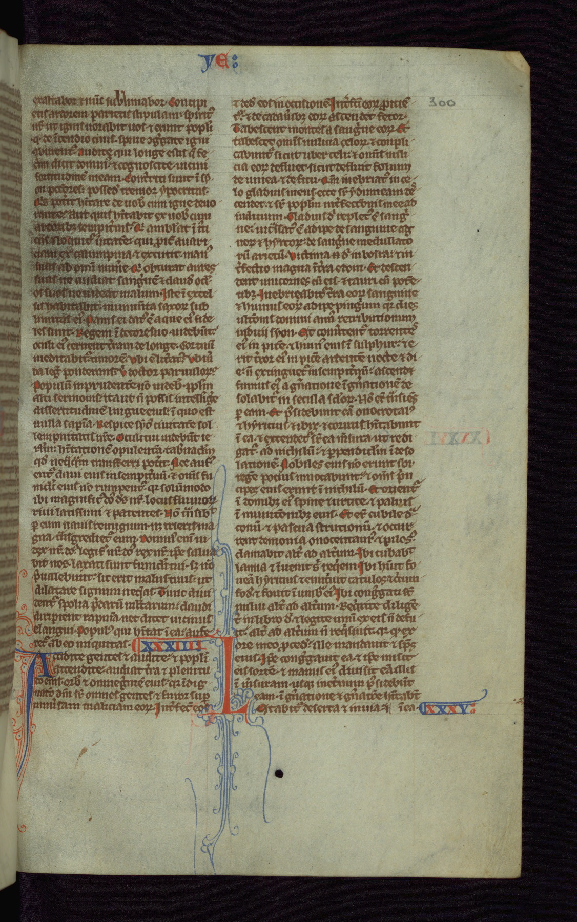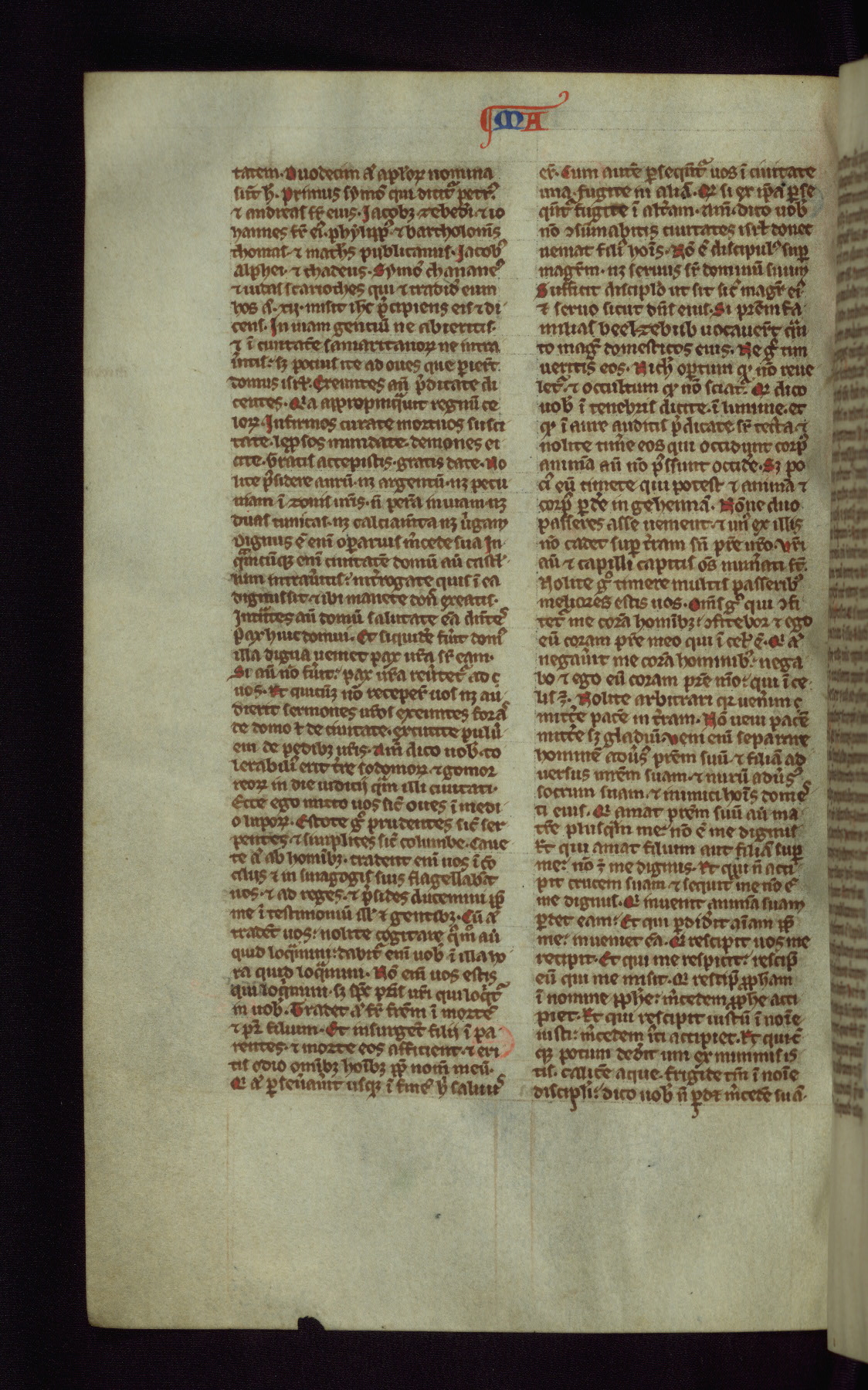 This pocket-size Bible was created around the middle of the thirteenth century in England. It contains the Vulgate text of the Old and New Testaments, arranged in order and divided into chapters. Such Bibles, designed for individual rather than institutional use, began to be created on a large scale during the thirteenth century, especially in Paris. This manuscript is illuminated with a large number of small historiated initials, and also includes a somewhat later image of the Three Living and the Three Dead, a popular scene based on a French poem of the same century.