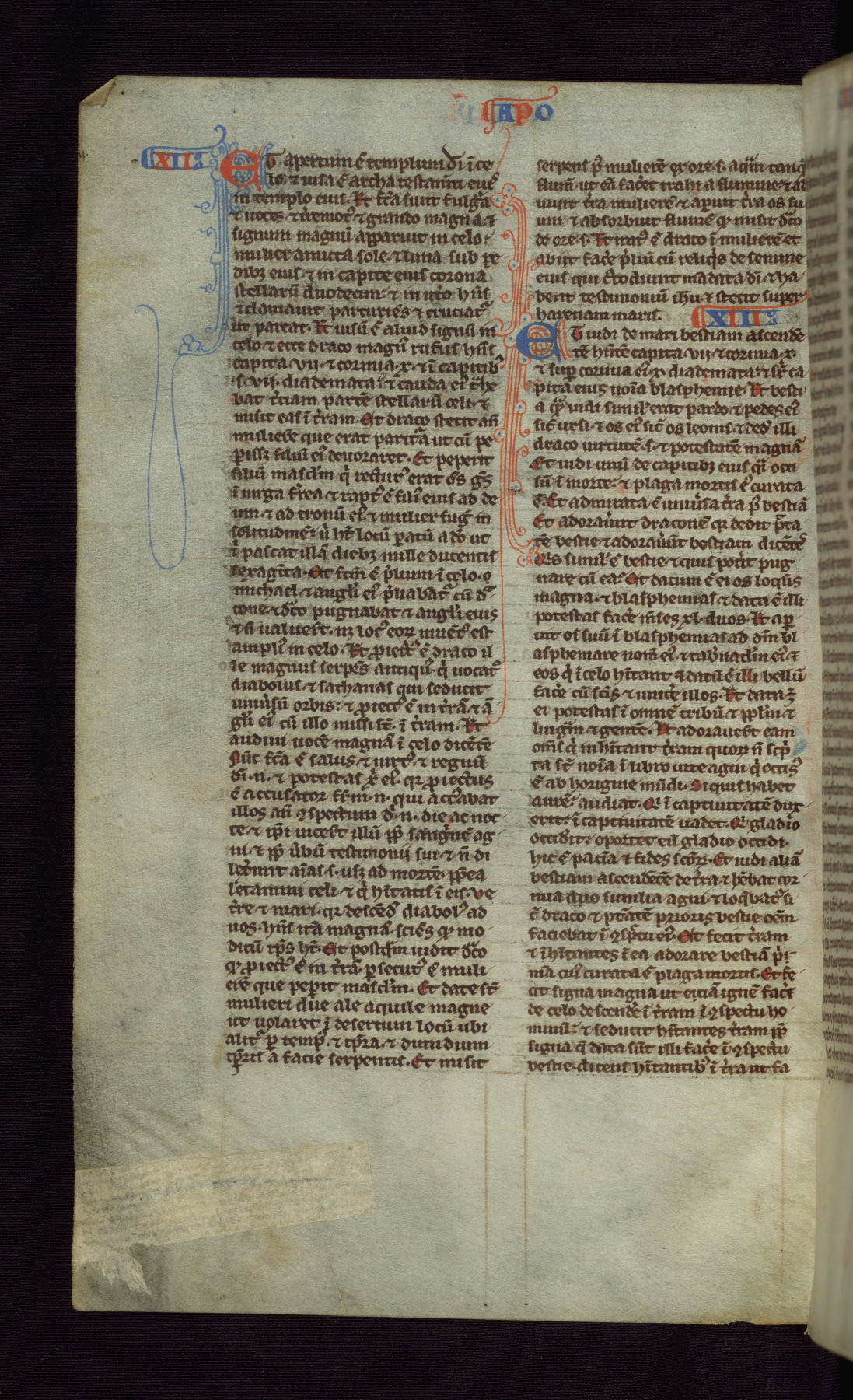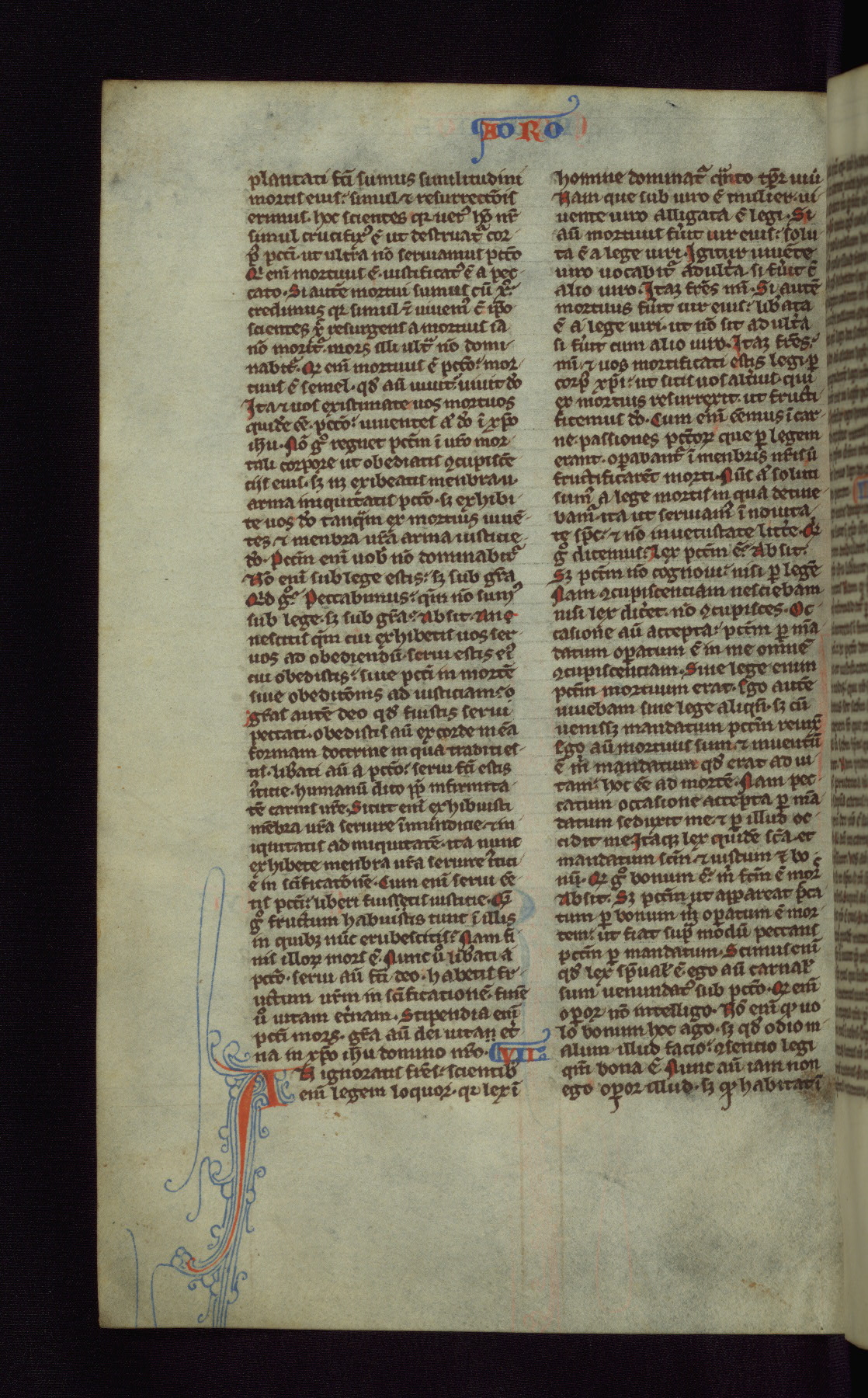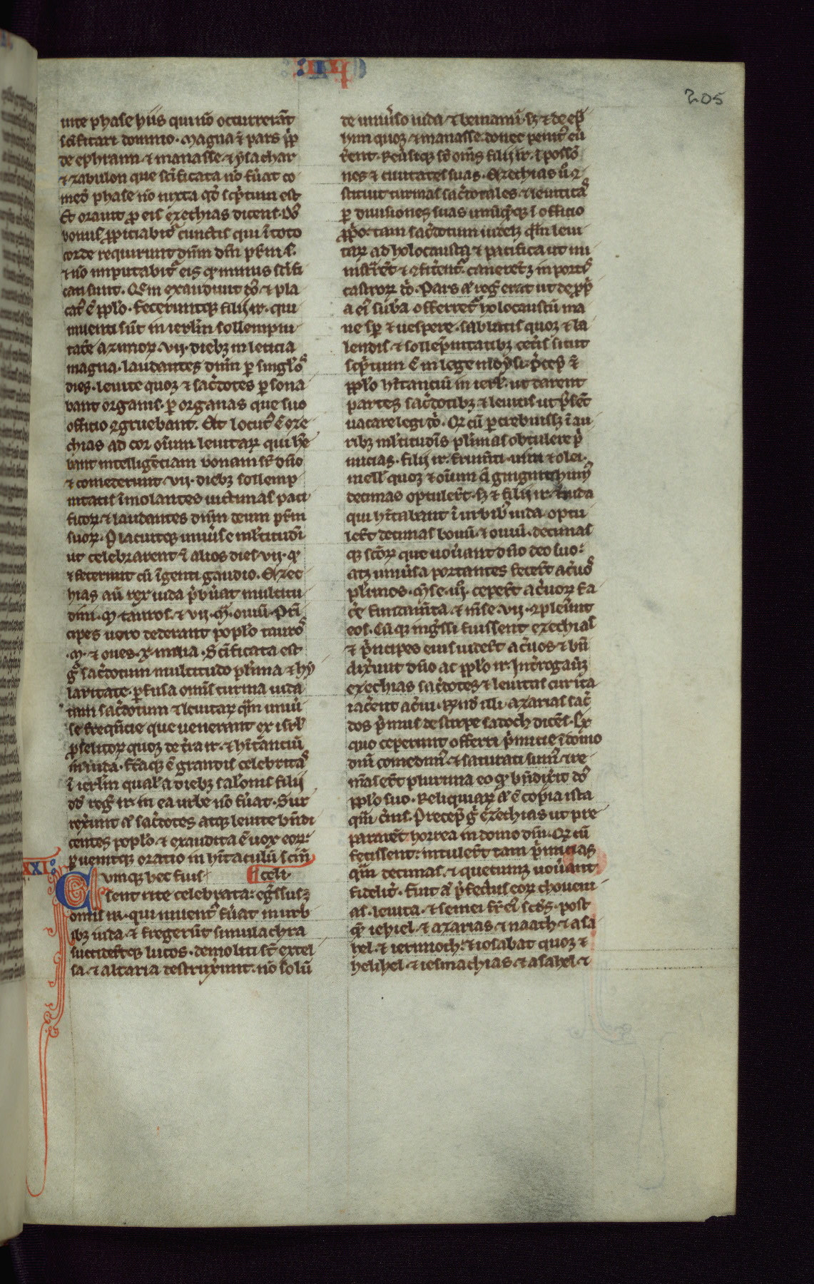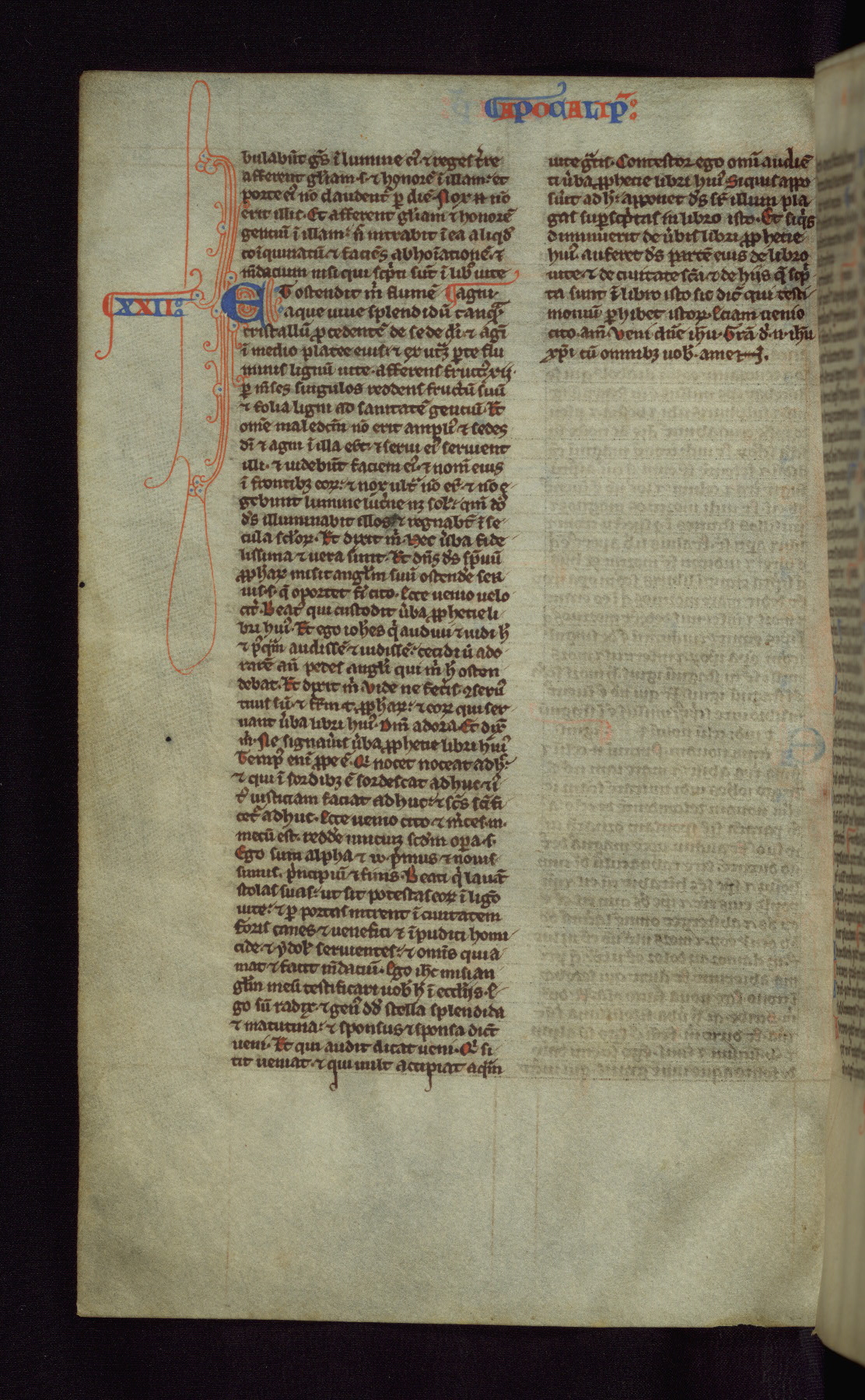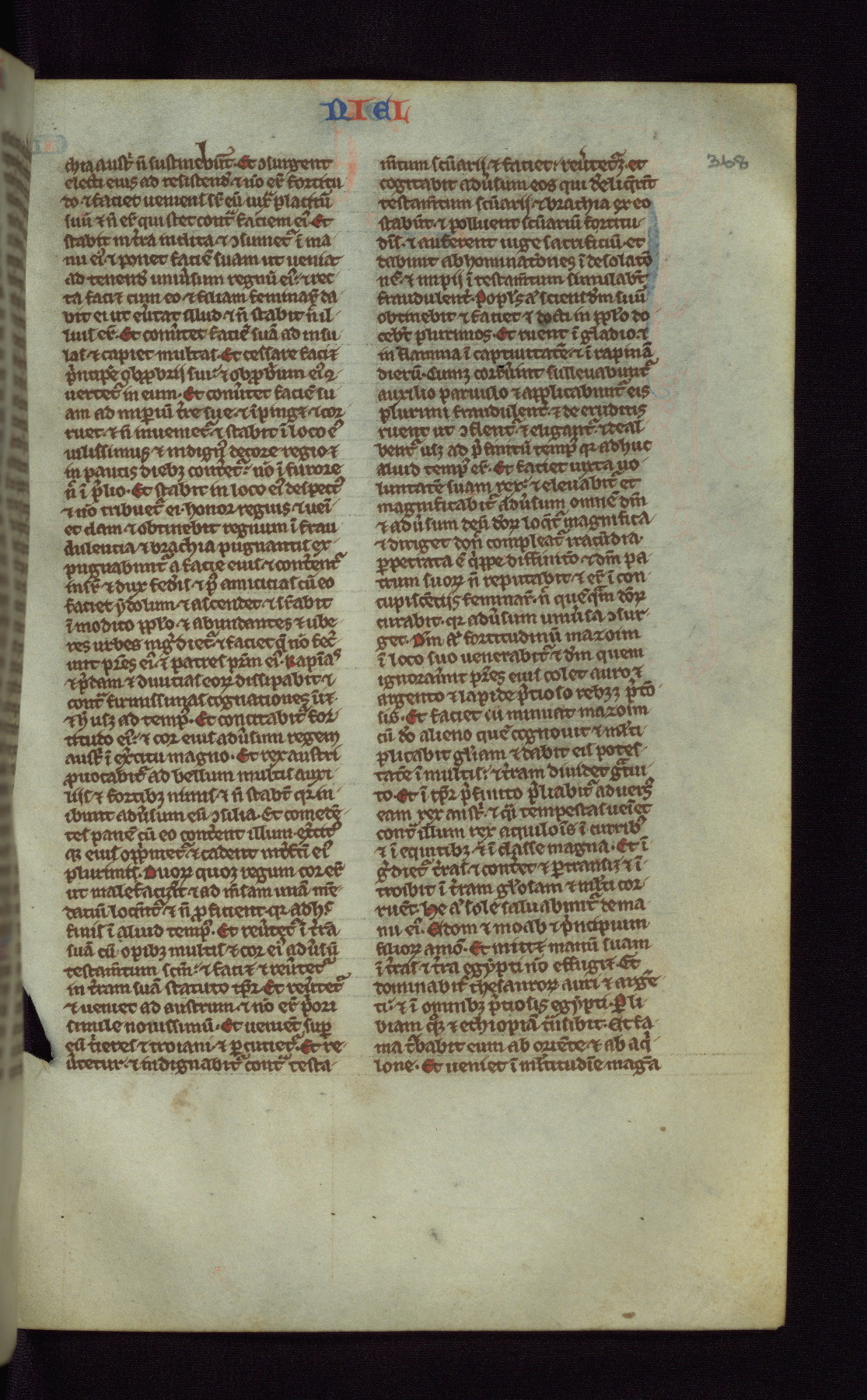 This pocket-size Bible was created around the middle of the thirteenth century in England. It contains the Vulgate text of the Old and New Testaments, arranged in order and divided into chapters. Such Bibles, designed for individual rather than institutional use, began to be created on a large scale during the thirteenth century, especially in Paris. This manuscript is illuminated with a large number of small historiated initials, and also includes a somewhat later image of the Three Living and the Three Dead, a popular scene based on a French poem of the same century.