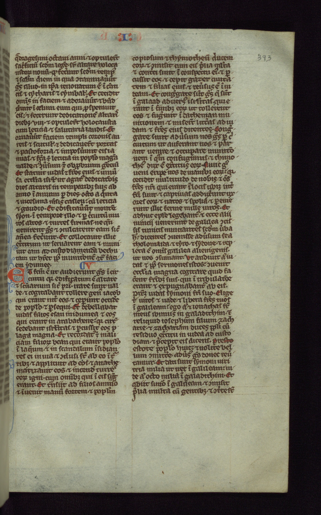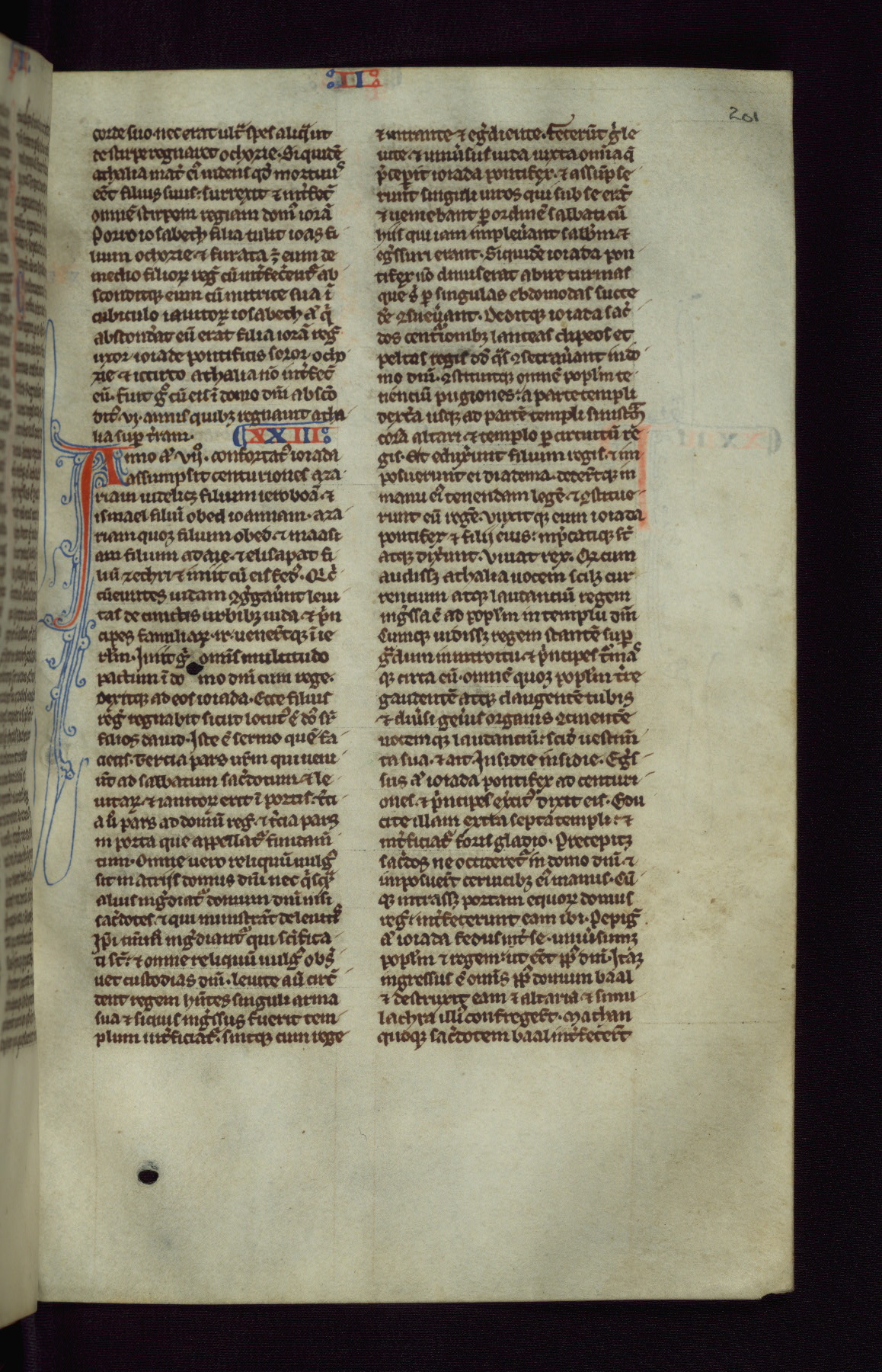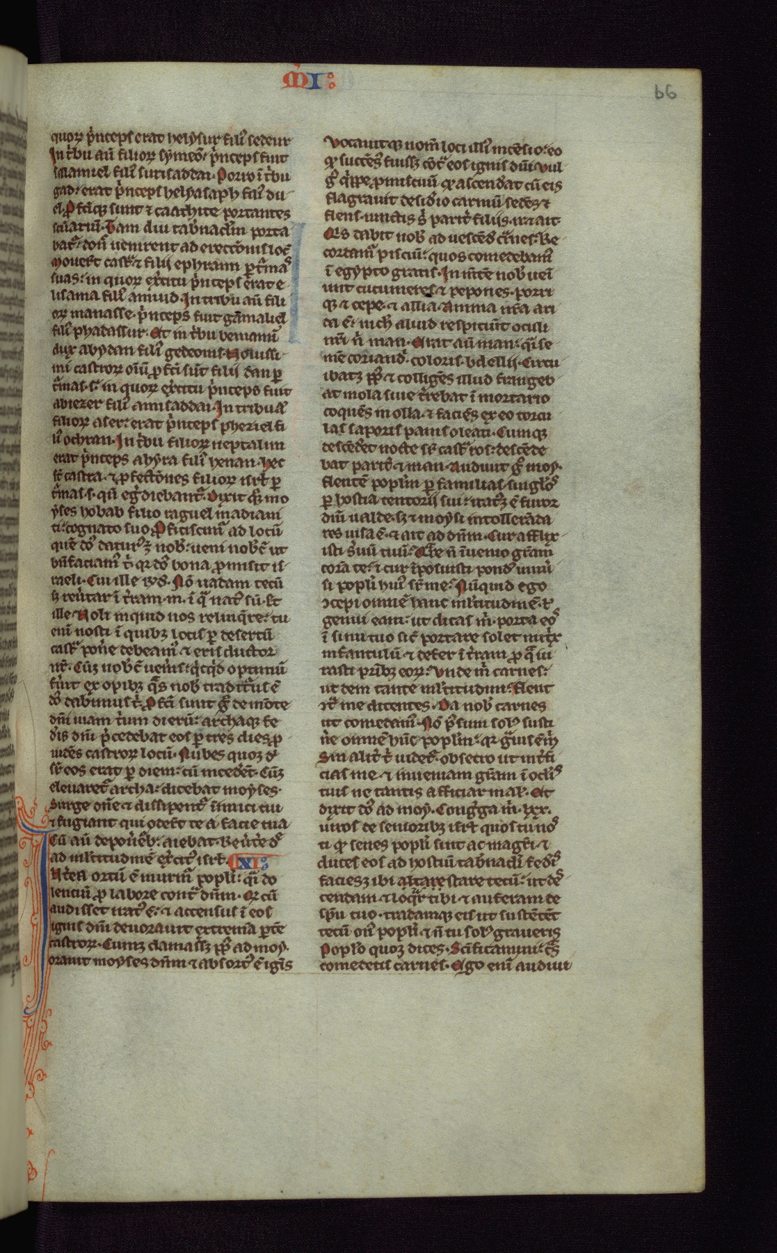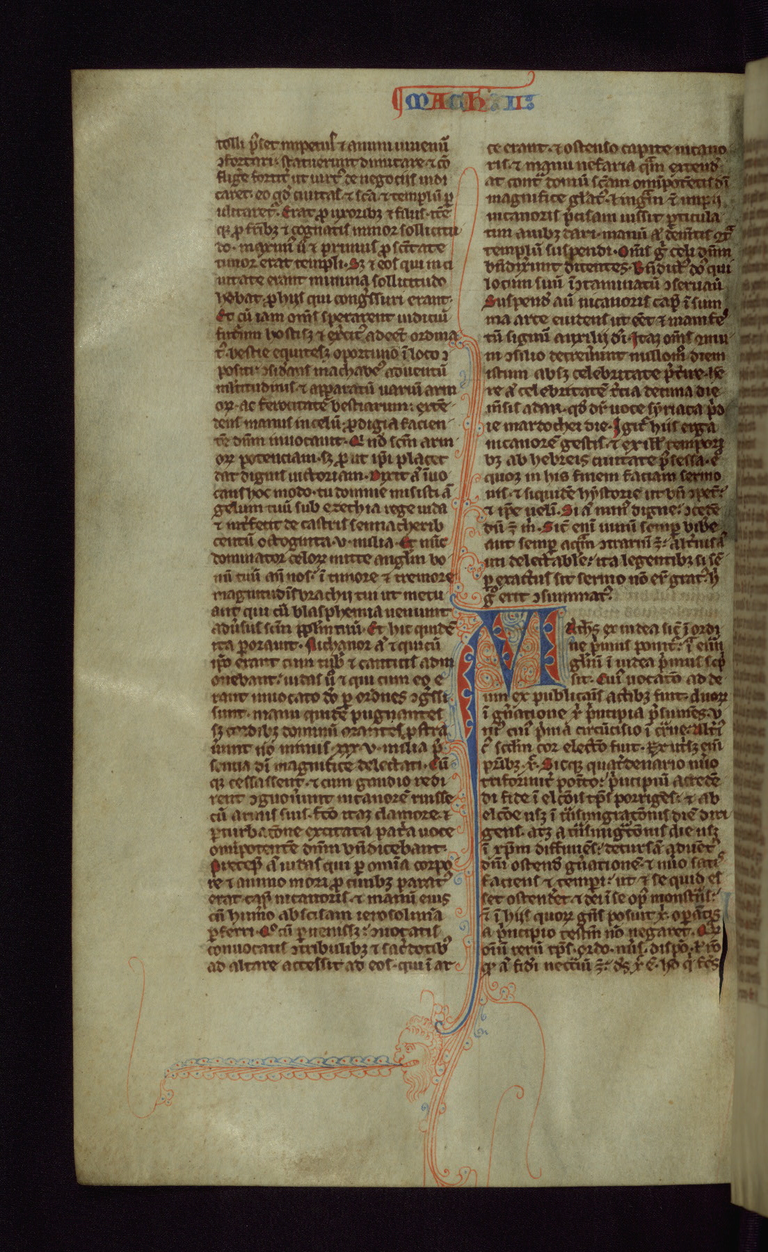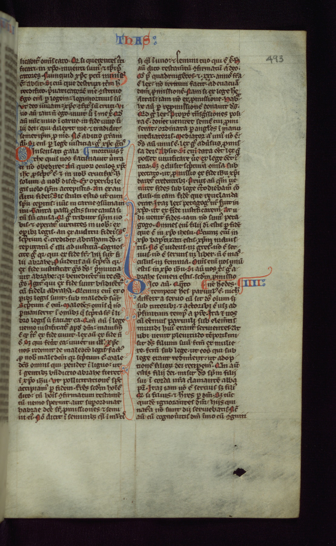 This pocket-size Bible was created around the middle of the thirteenth century in England. It contains the Vulgate text of the Old and New Testaments, arranged in order and divided into chapters. Such Bibles, designed for individual rather than institutional use, began to be created on a large scale during the thirteenth century, especially in Paris. This manuscript is illuminated with a large number of small historiated initials, and also includes a somewhat later image of the Three Living and the Three Dead, a popular scene based on a French poem of the same century.