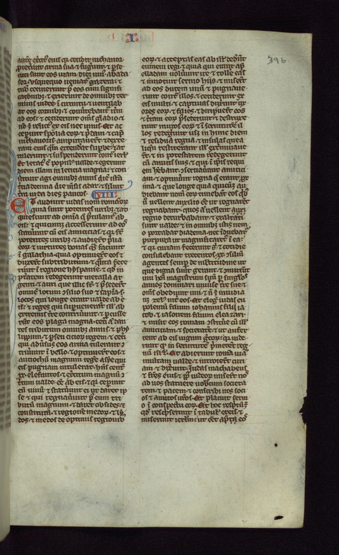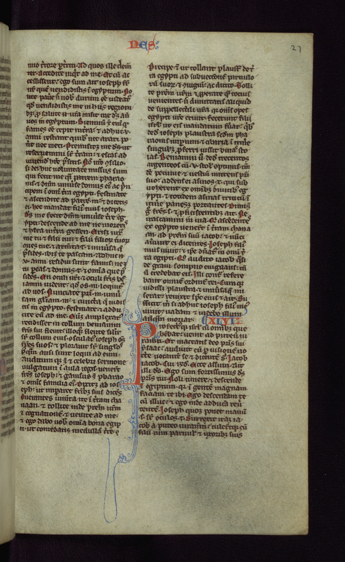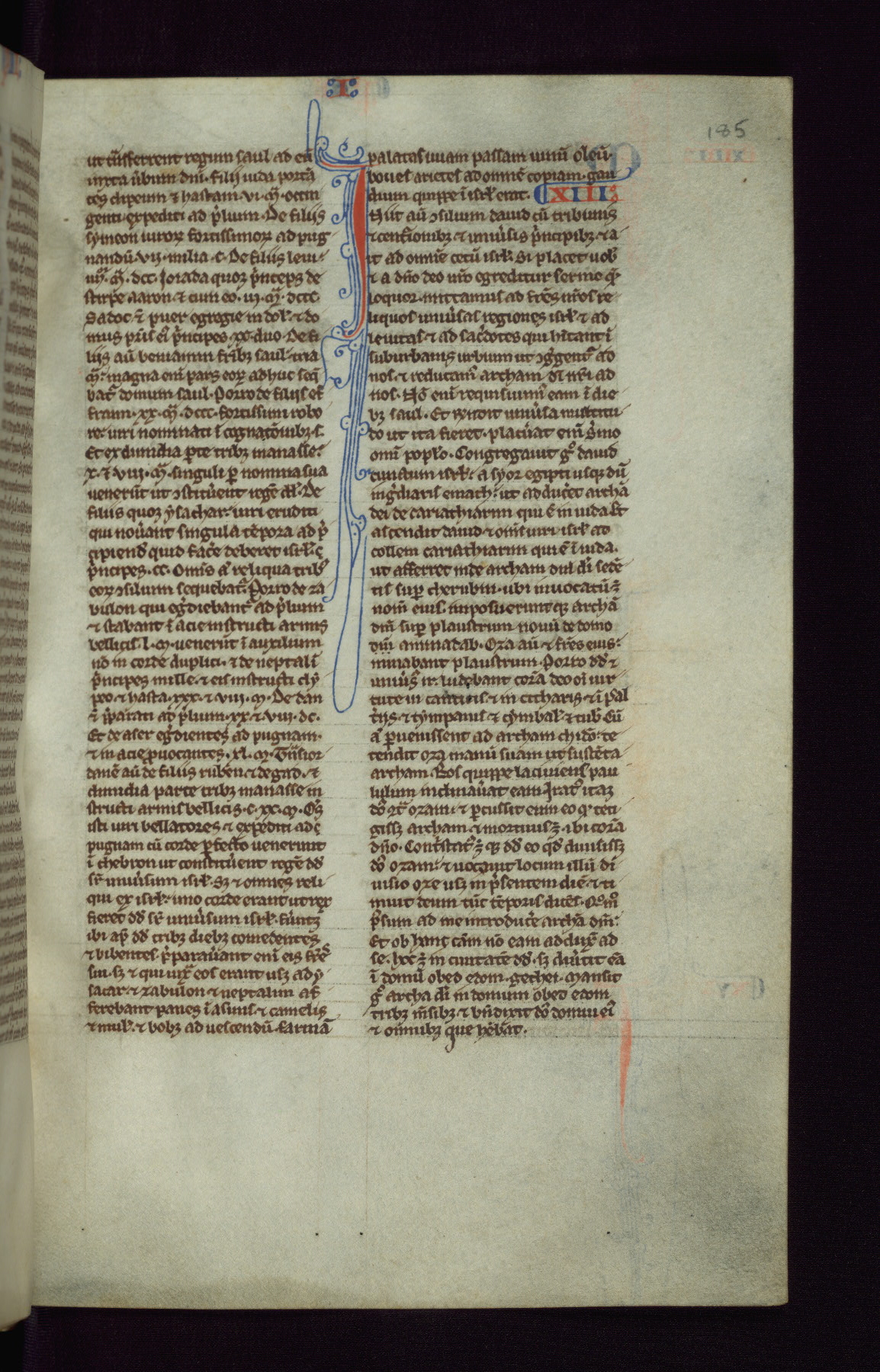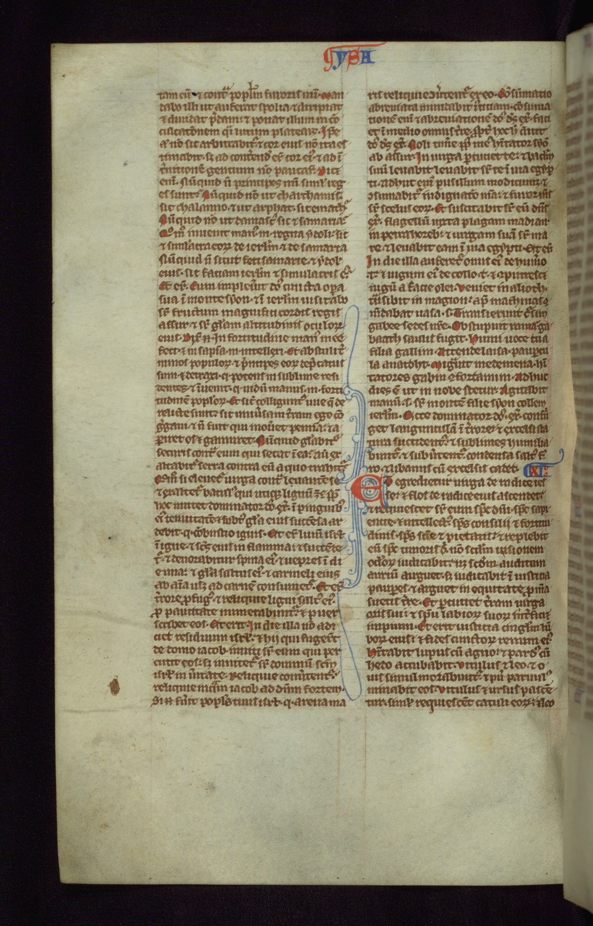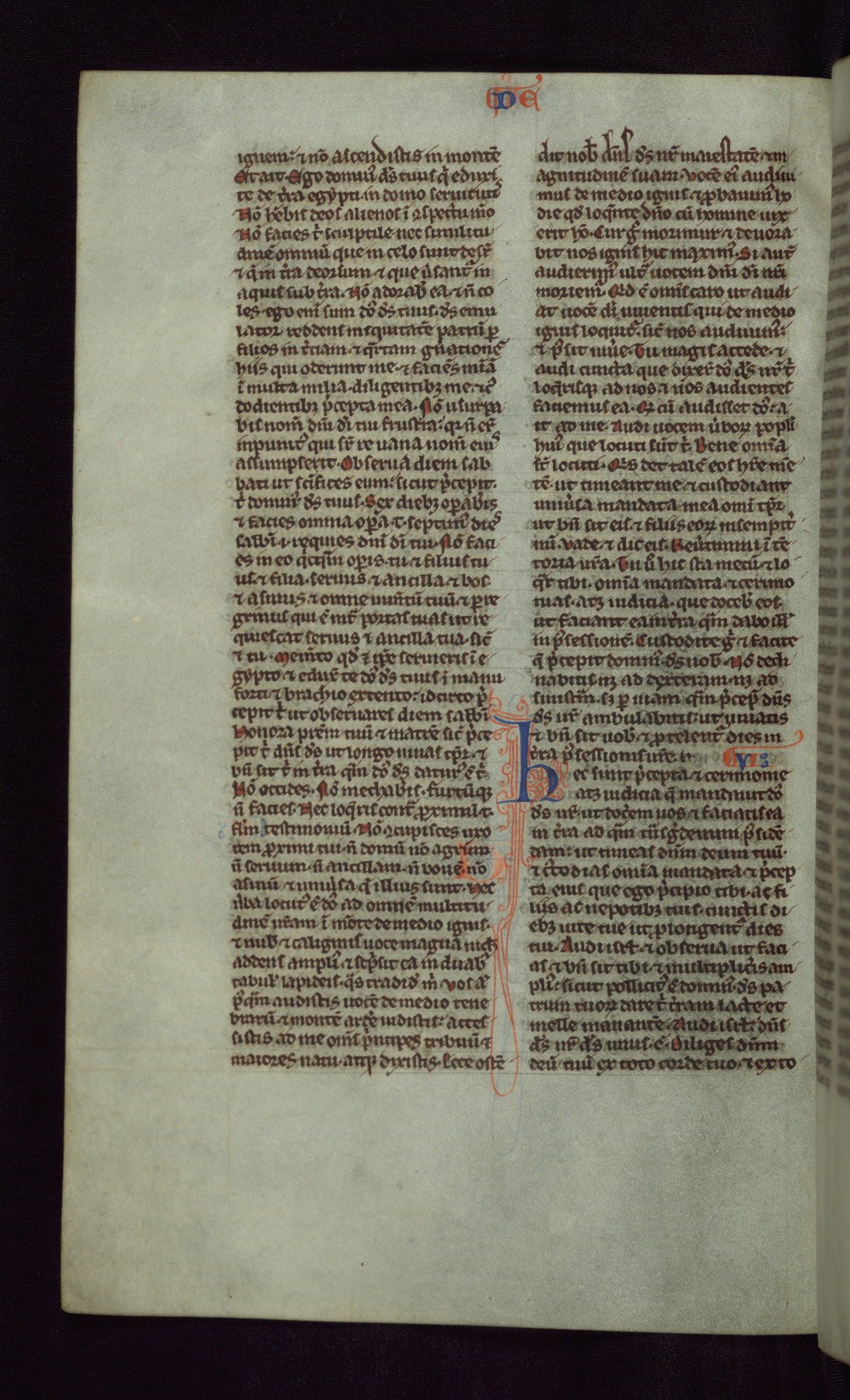 This pocket-size Bible was created around the middle of the thirteenth century in England. It contains the Vulgate text of the Old and New Testaments, arranged in order and divided into chapters. Such Bibles, designed for individual rather than institutional use, began to be created on a large scale during the thirteenth century, especially in Paris. This manuscript is illuminated with a large number of small historiated initials, and also includes a somewhat later image of the Three Living and the Three Dead, a popular scene based on a French poem of the same century.