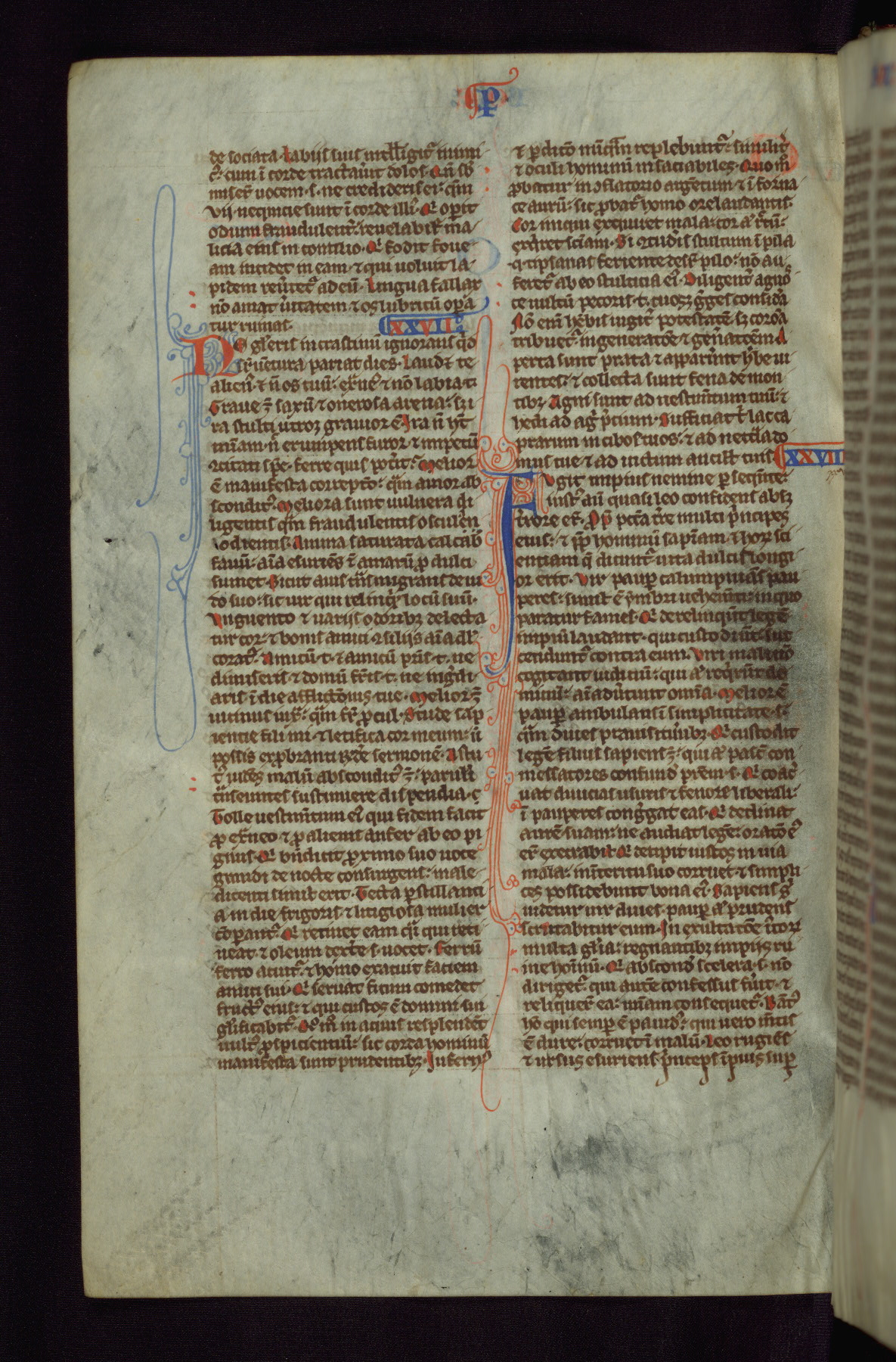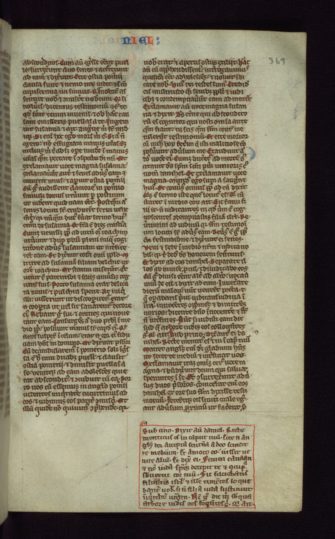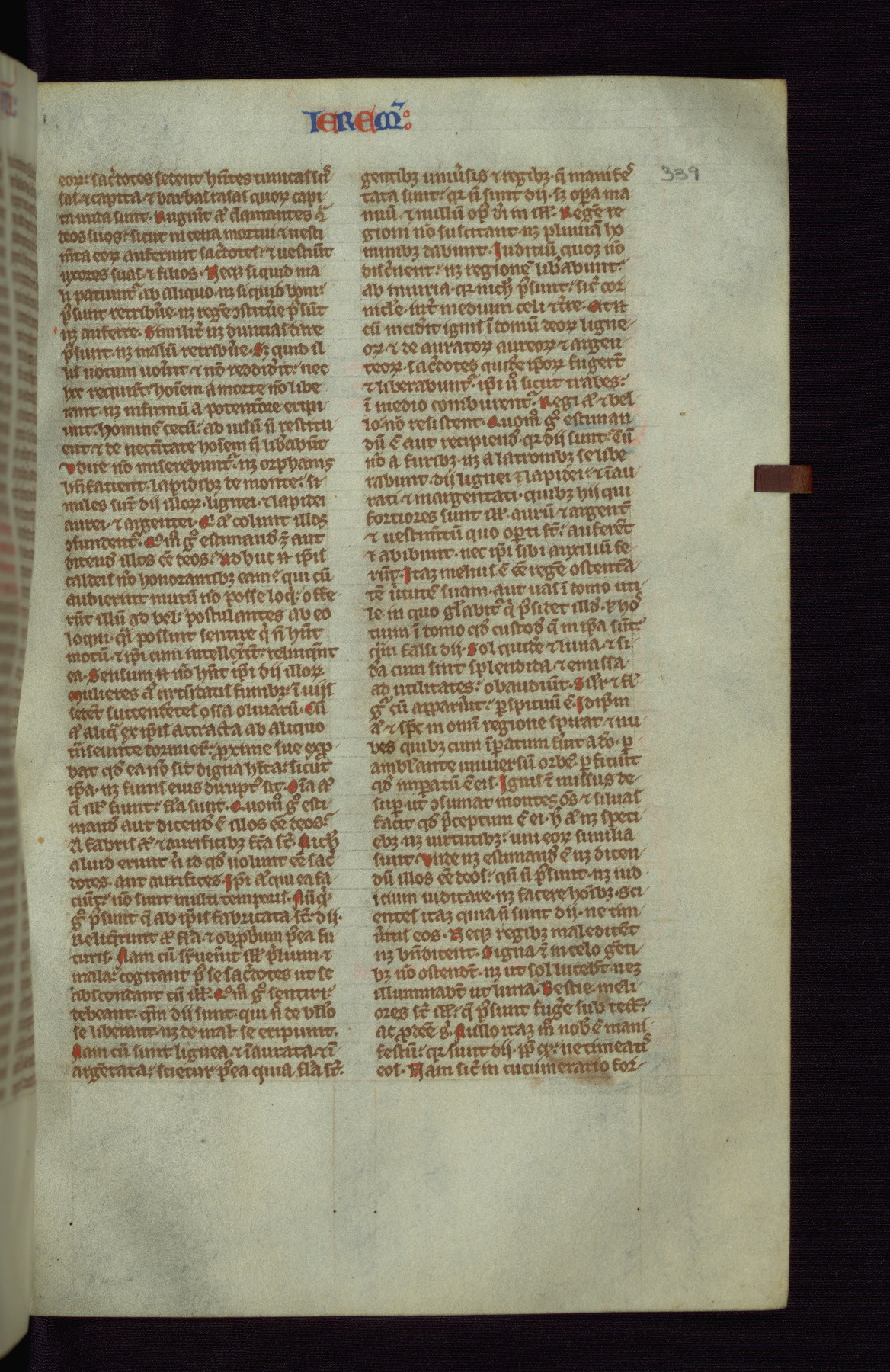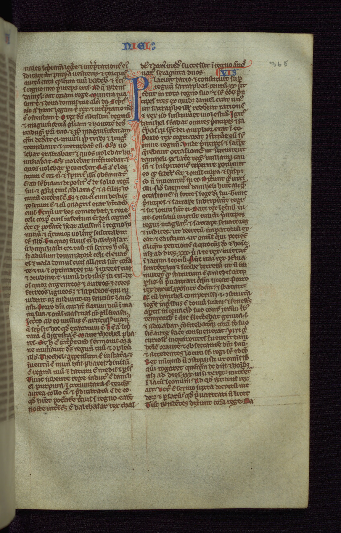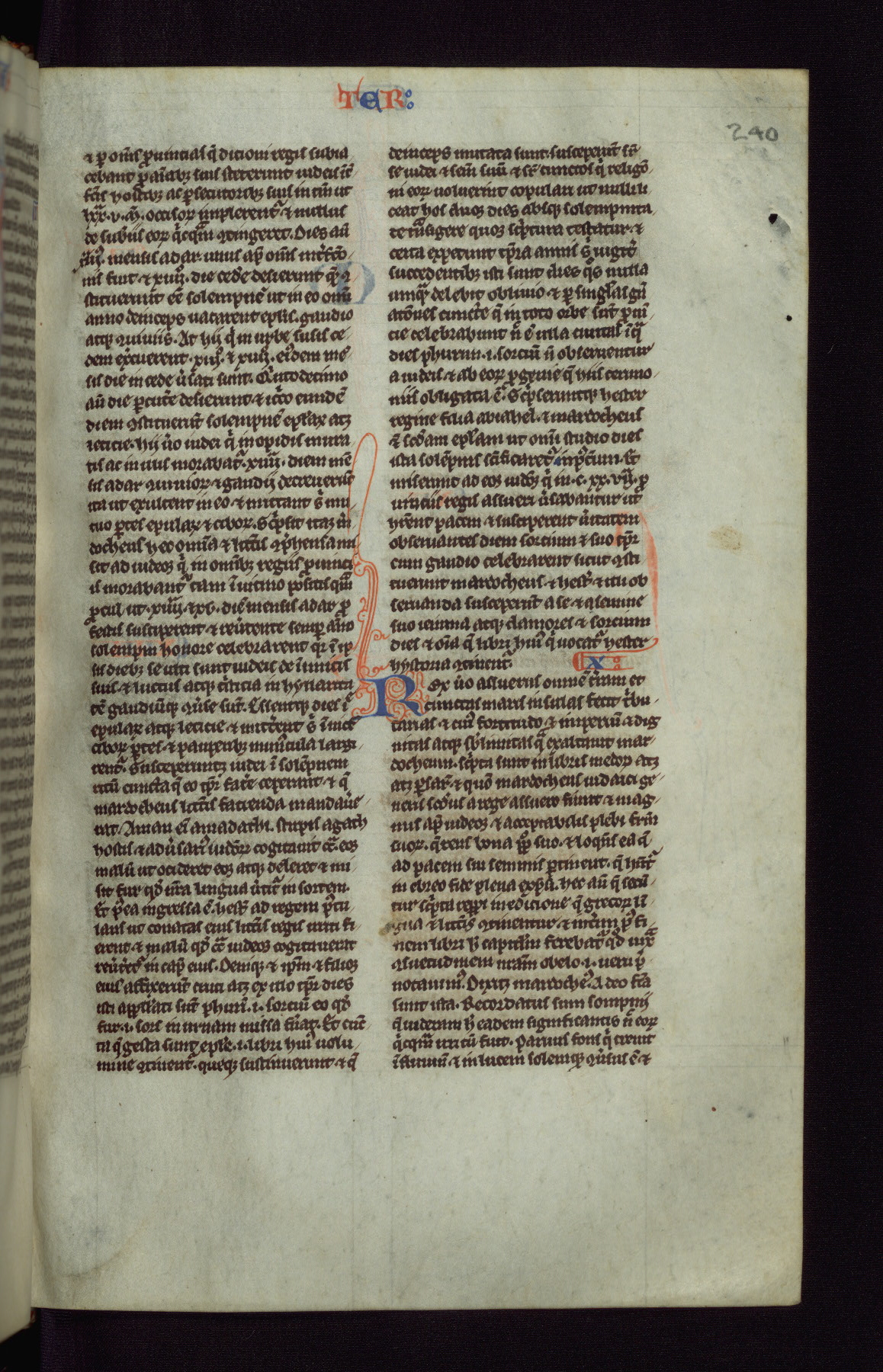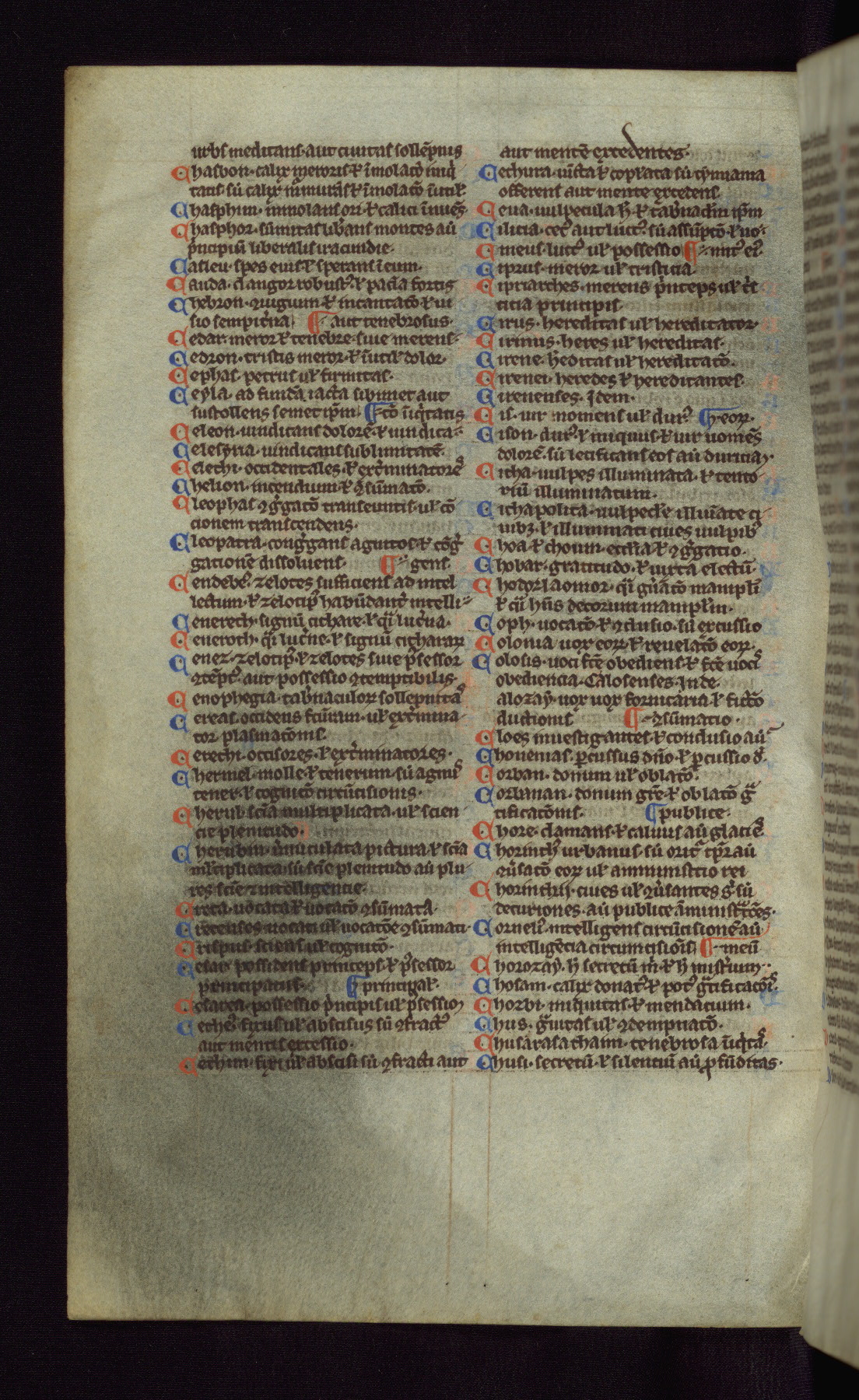 This pocket-size Bible was created around the middle of the thirteenth century in England. It contains the Vulgate text of the Old and New Testaments, arranged in order and divided into chapters. Such Bibles, designed for individual rather than institutional use, began to be created on a large scale during the thirteenth century, especially in Paris. This manuscript is illuminated with a large number of small historiated initials, and also includes a somewhat later image of the Three Living and the Three Dead, a popular scene based on a French poem of the same century.