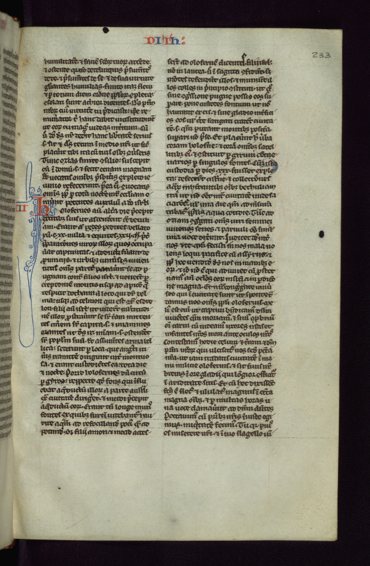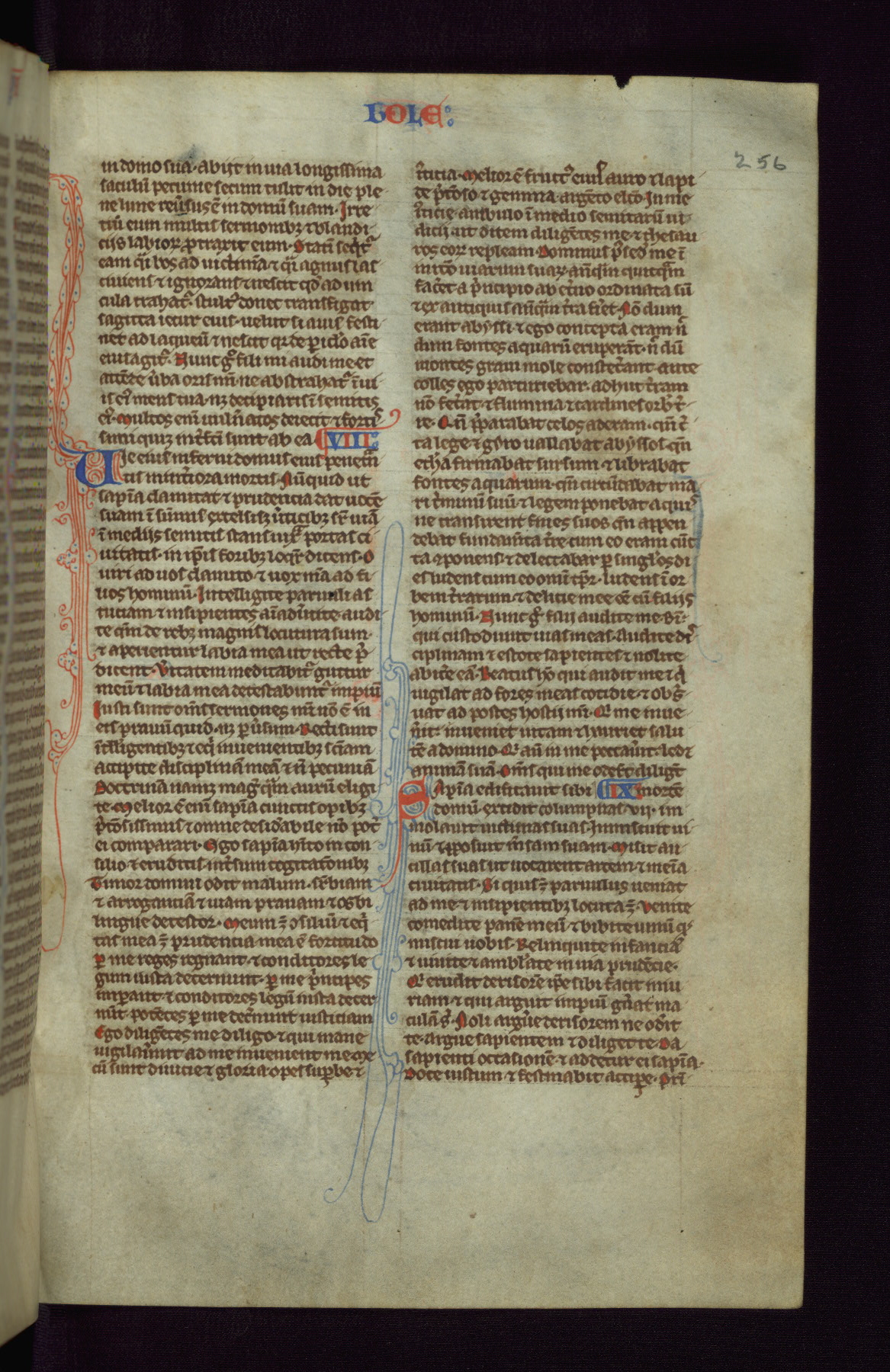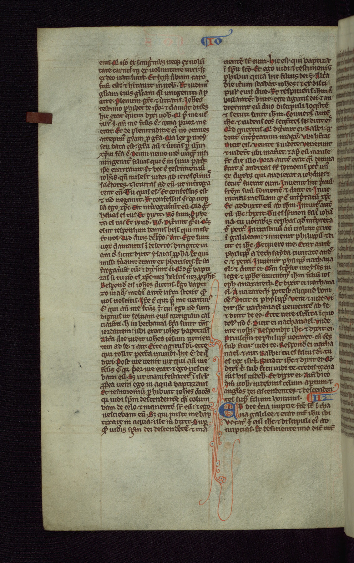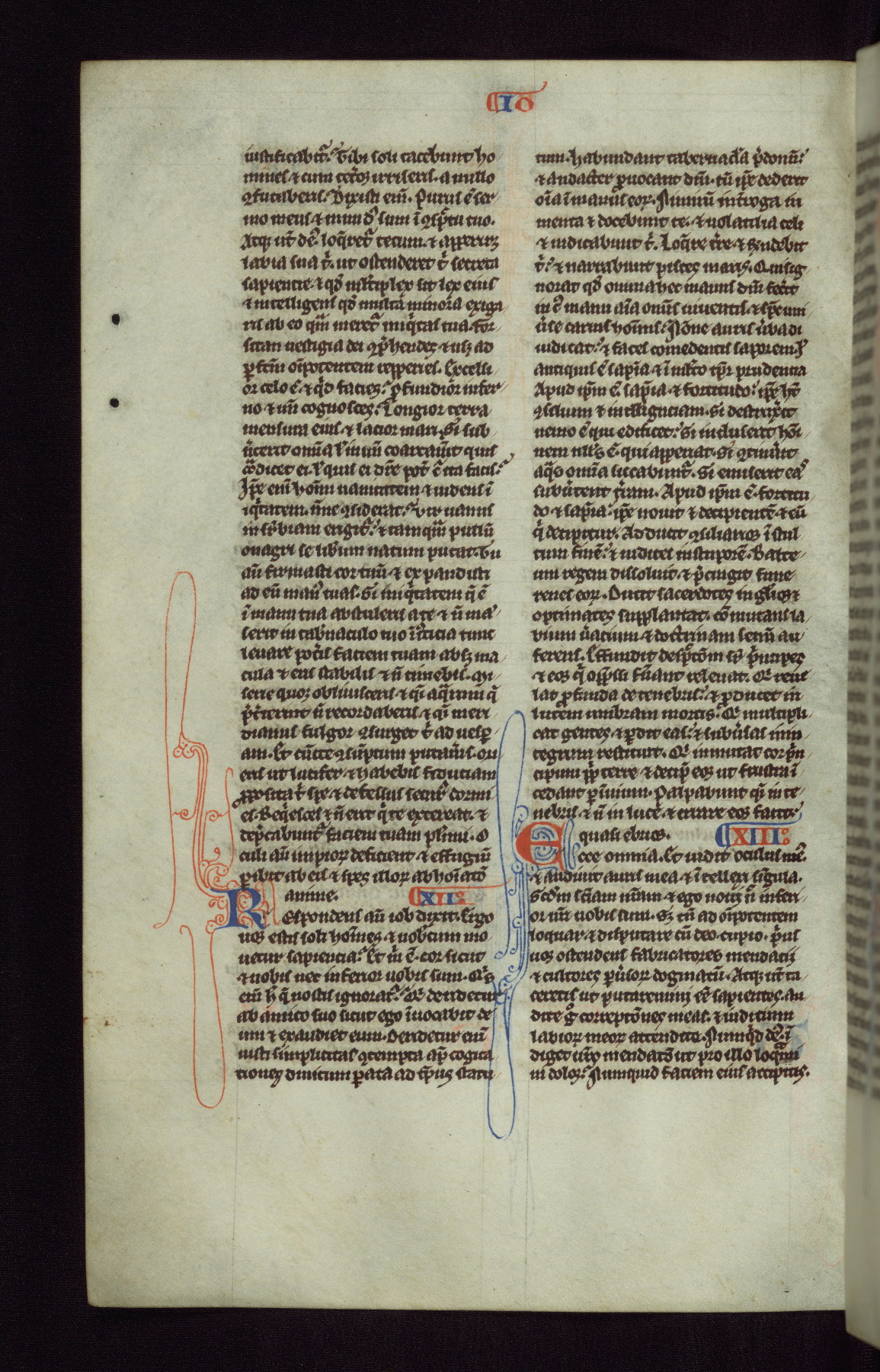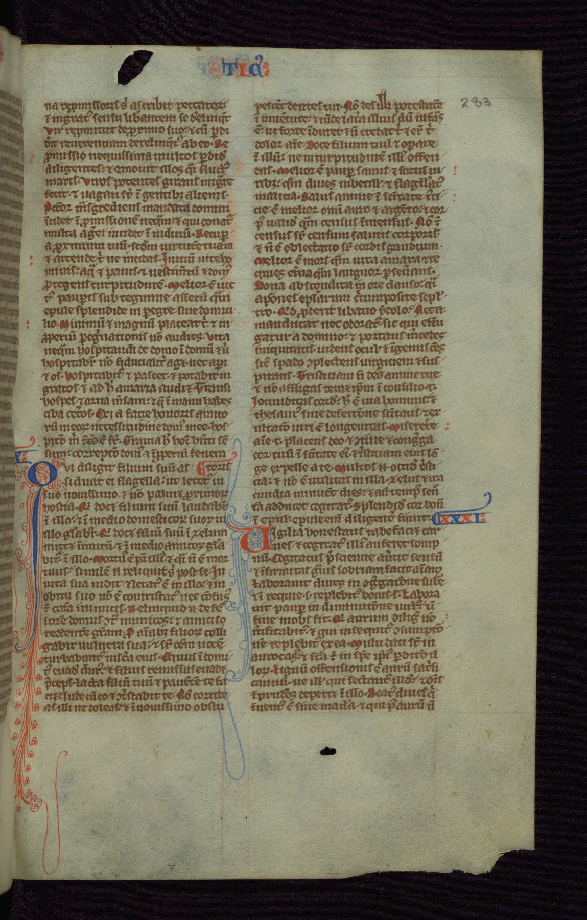 This pocket-size Bible was created around the middle of the thirteenth century in England. It contains the Vulgate text of the Old and New Testaments, arranged in order and divided into chapters. Such Bibles, designed for individual rather than institutional use, began to be created on a large scale during the thirteenth century, especially in Paris. This manuscript is illuminated with a large number of small historiated initials, and also includes a somewhat later image of the Three Living and the Three Dead, a popular scene based on a French poem of the same century.