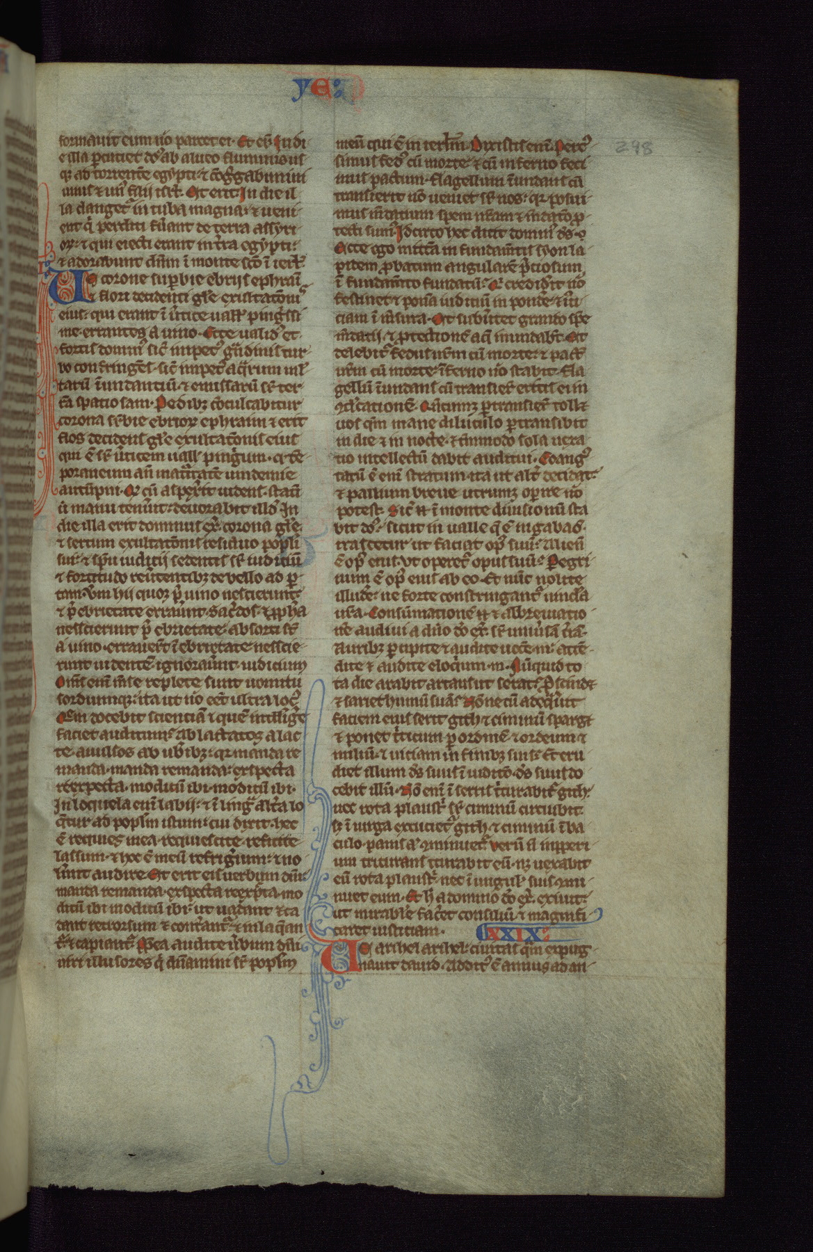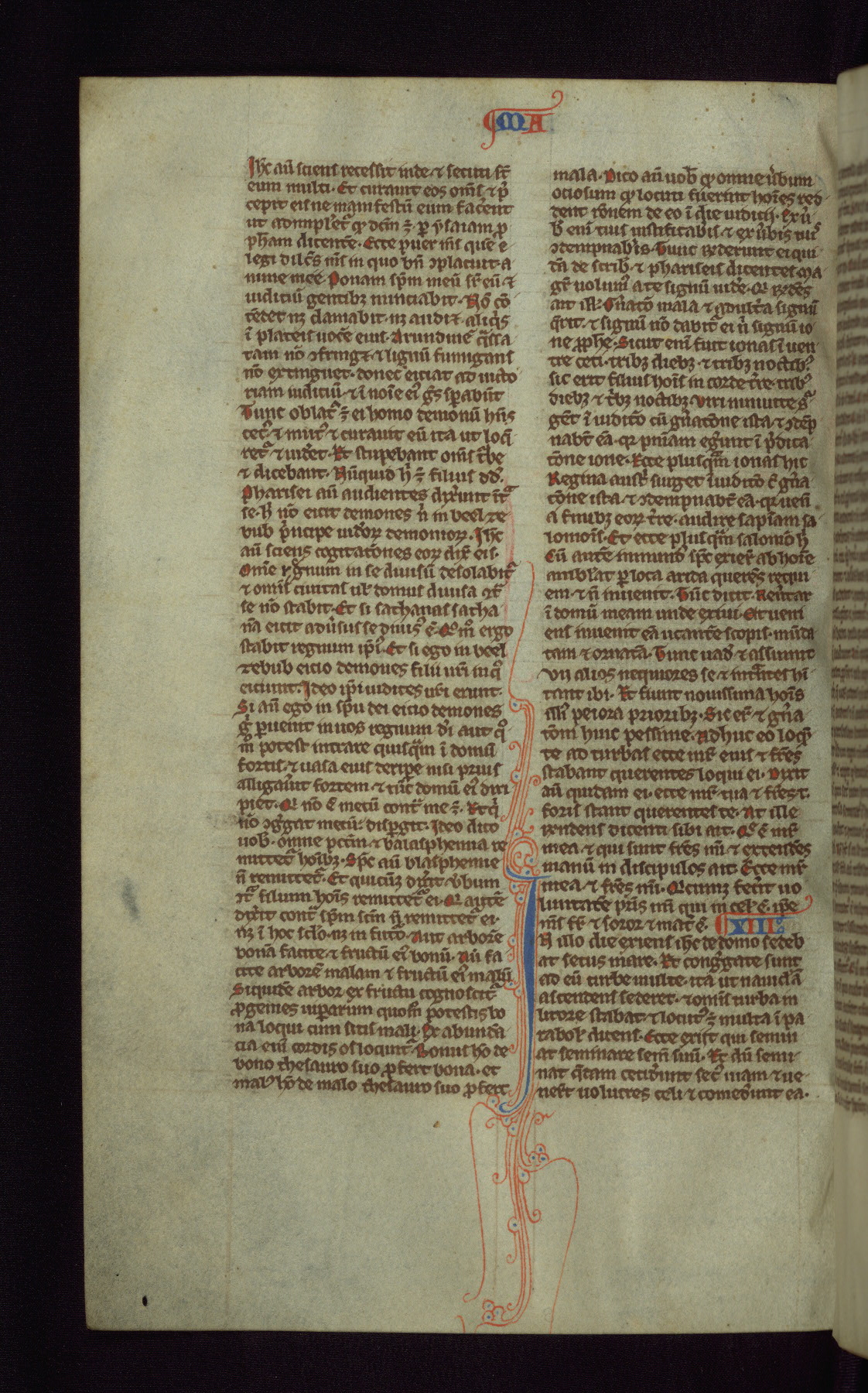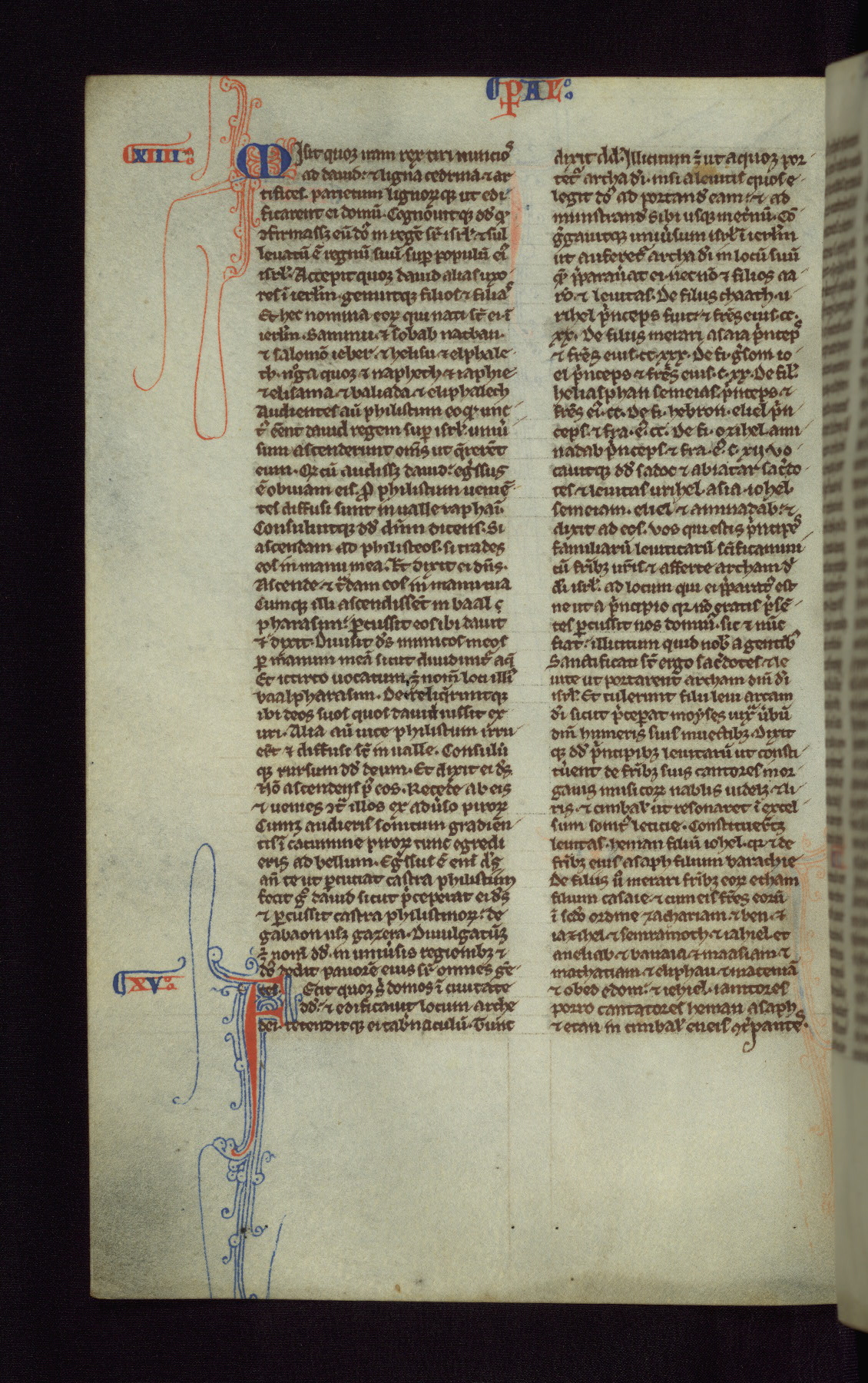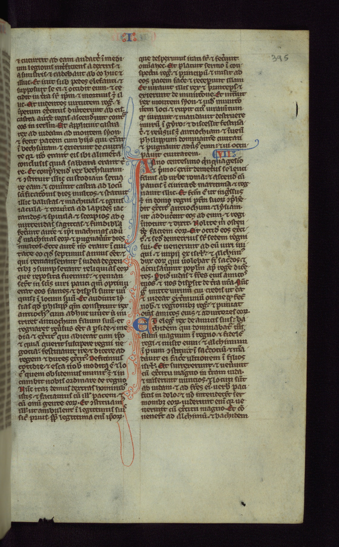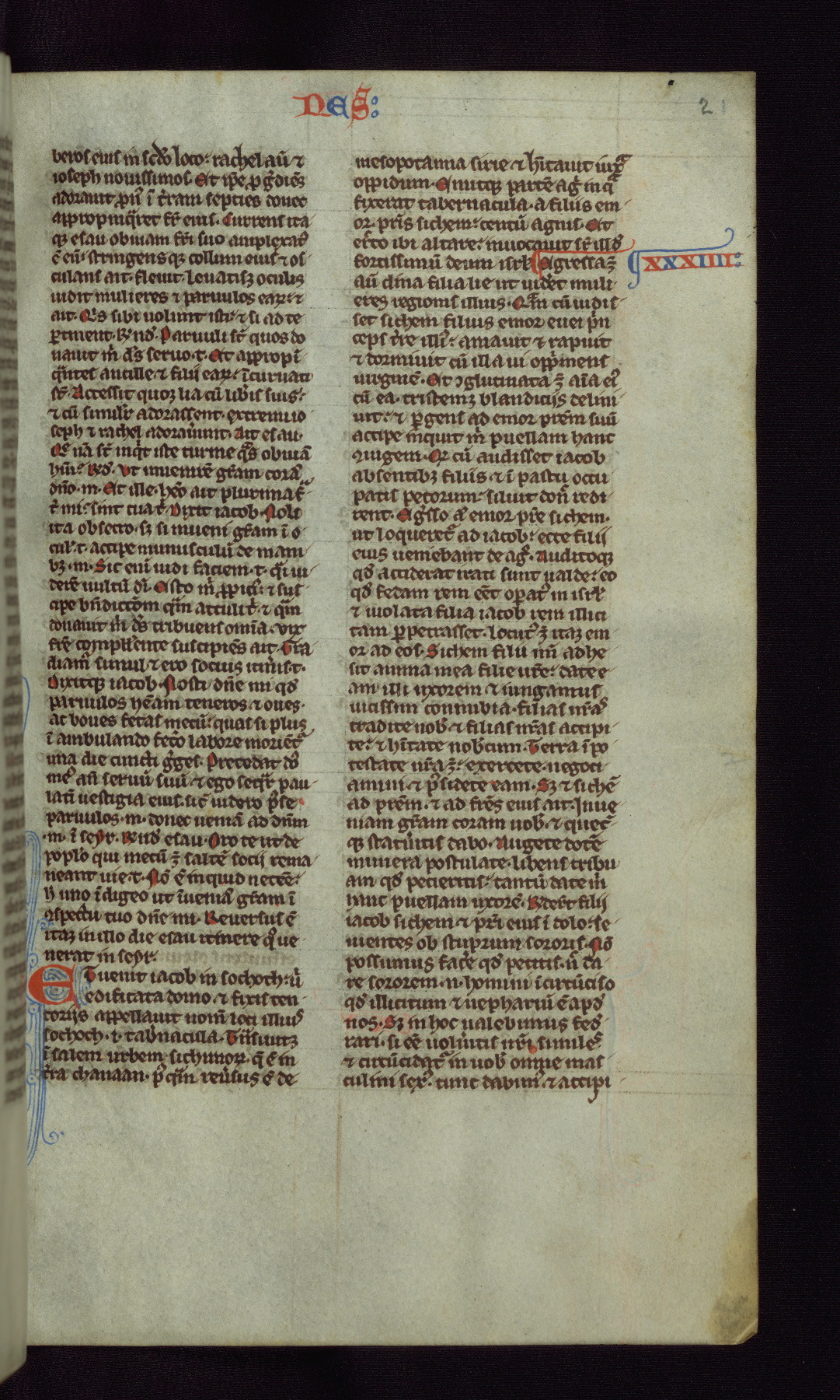 This pocket-size Bible was created around the middle of the thirteenth century in England. It contains the Vulgate text of the Old and New Testaments, arranged in order and divided into chapters. Such Bibles, designed for individual rather than institutional use, began to be created on a large scale during the thirteenth century, especially in Paris. This manuscript is illuminated with a large number of small historiated initials, and also includes a somewhat later image of the Three Living and the Three Dead, a popular scene based on a French poem of the same century.