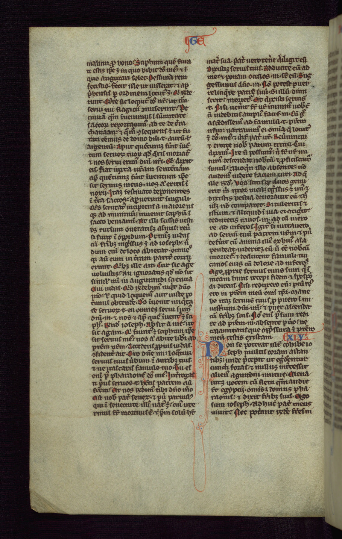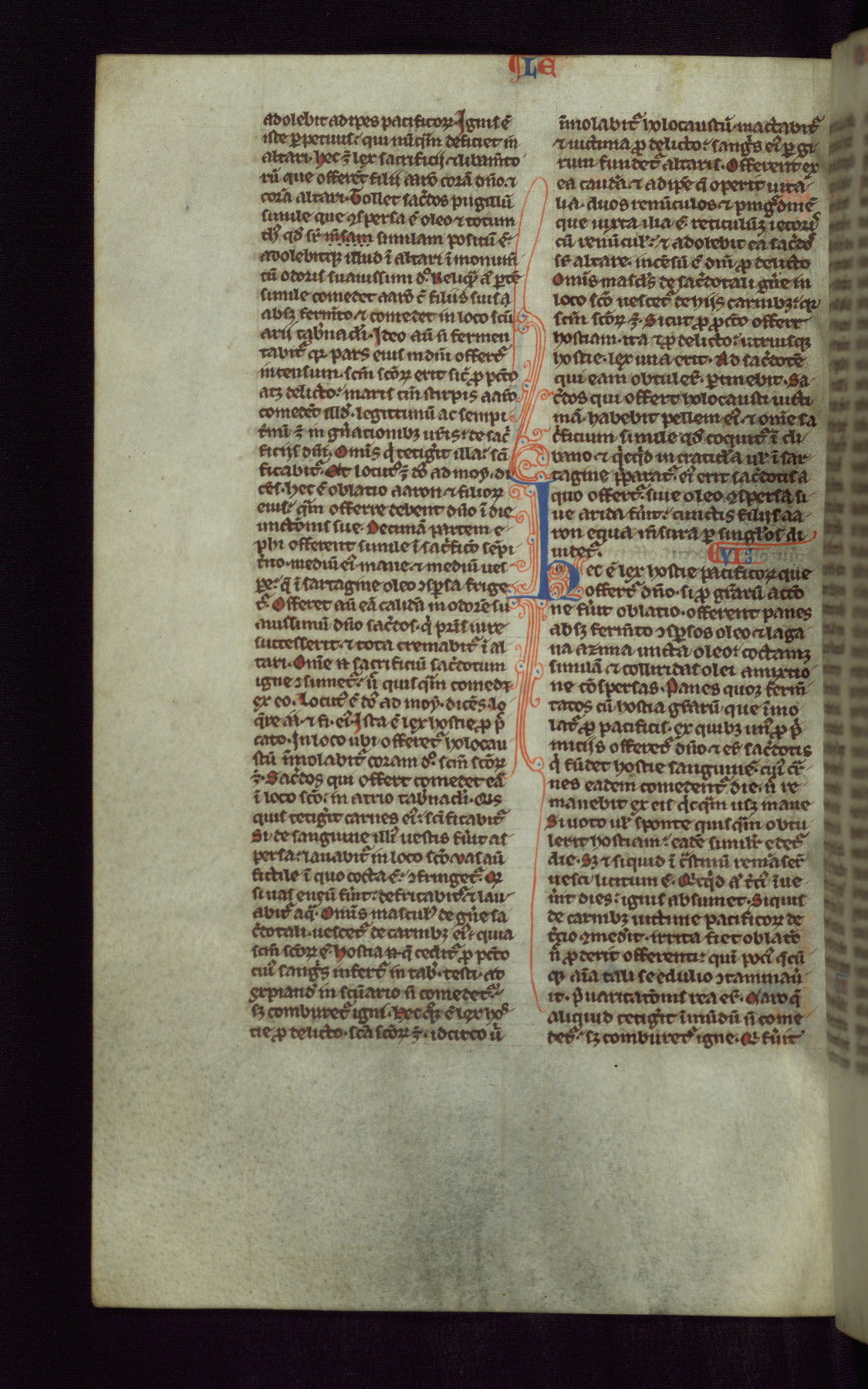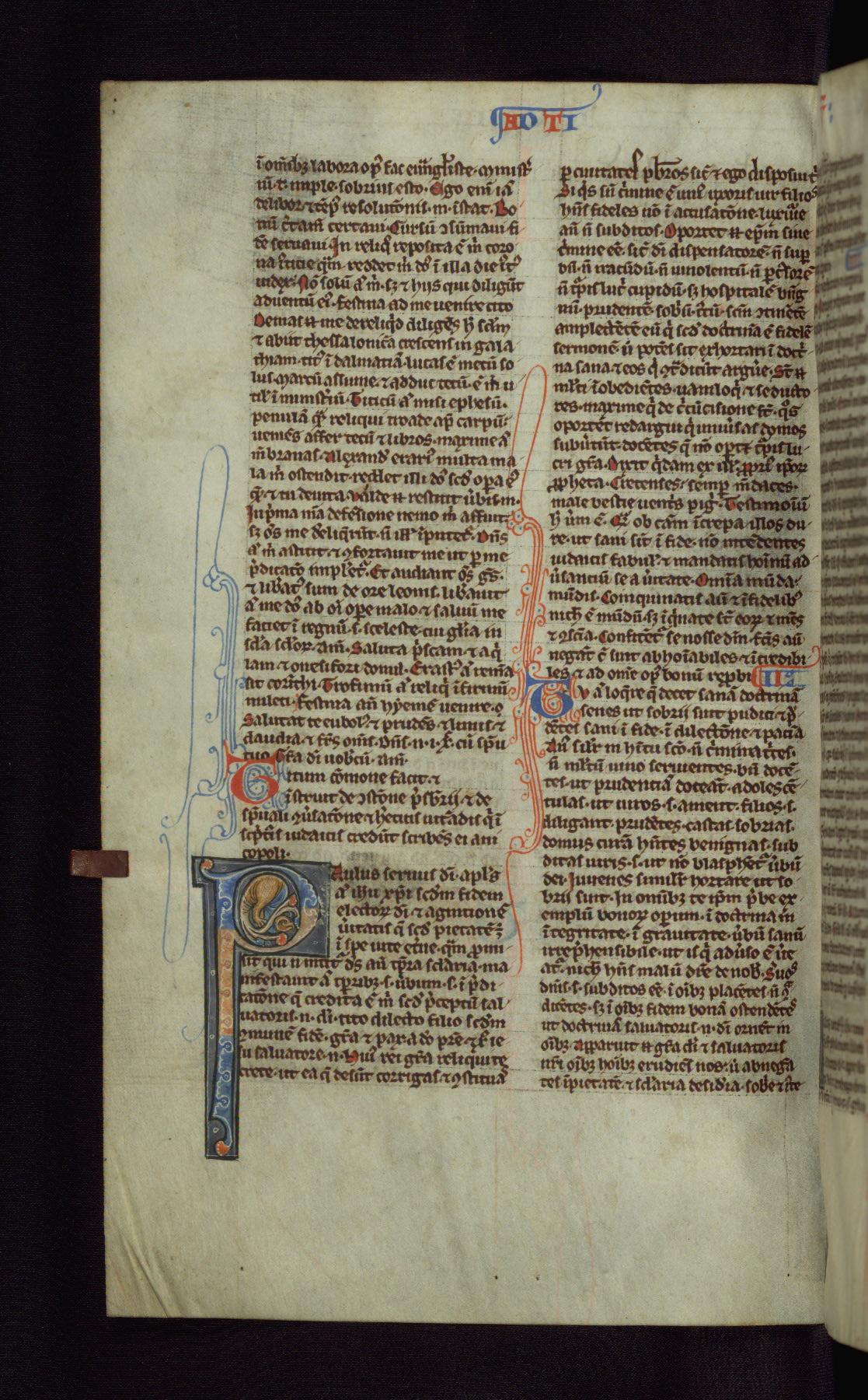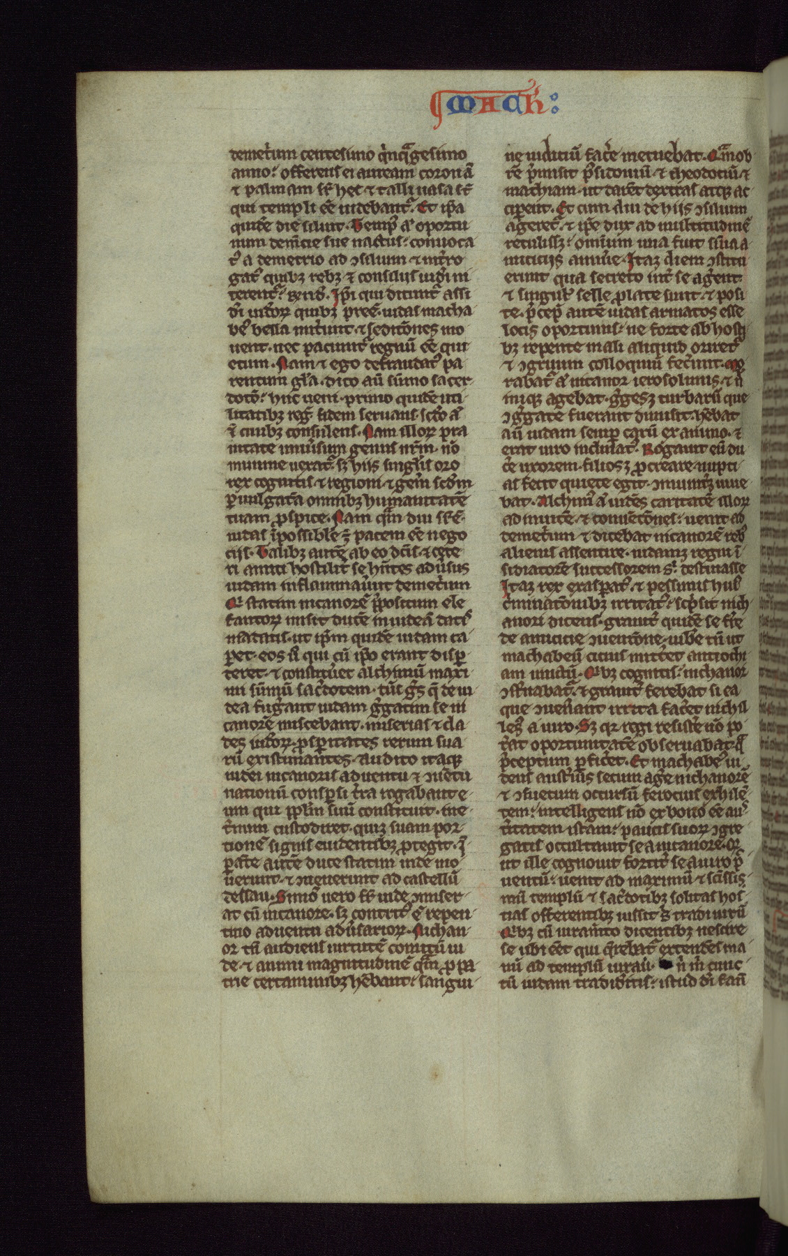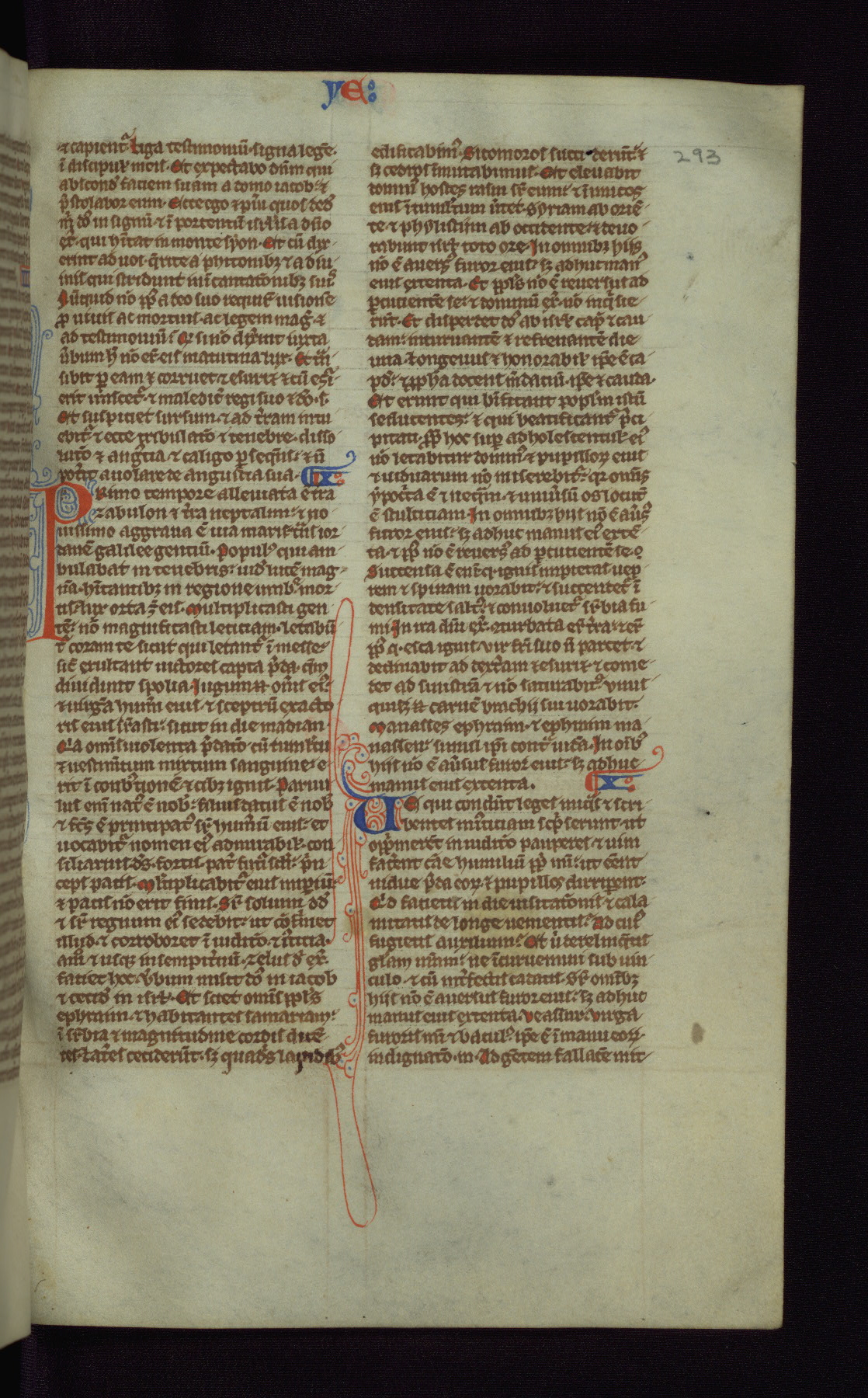This pocket-size Bible was created around the middle of the thirteenth century in England. It contains the Vulgate text of the Old and New Testaments, arranged in order and divided into chapters. Such Bibles, designed for individual rather than institutional use, began to be created on a large scale during the thirteenth century, especially in Paris. This manuscript is illuminated with a large number of small historiated initials, and also includes a somewhat later image of the Three Living and the Three Dead, a popular scene based on a French poem of the same century.