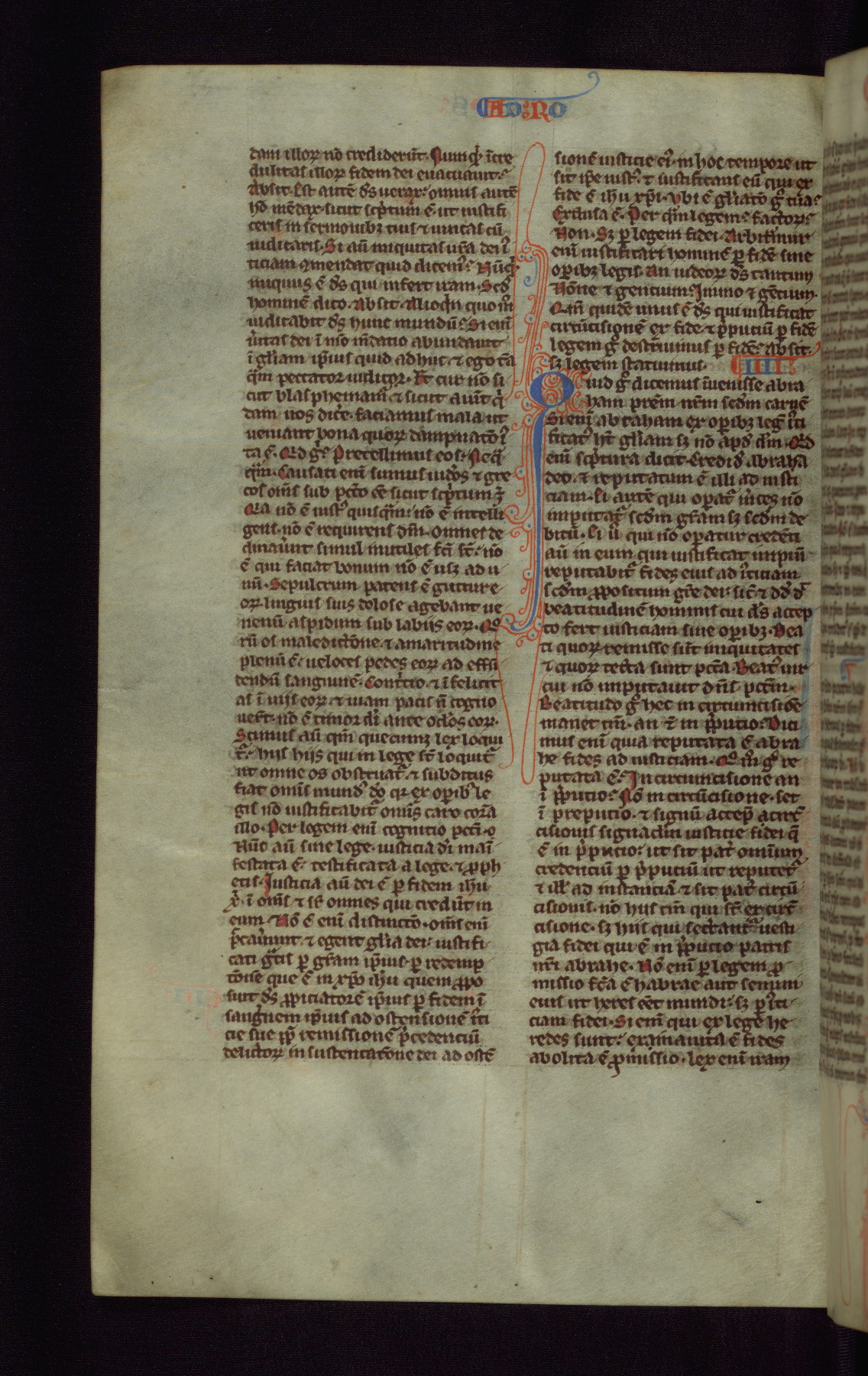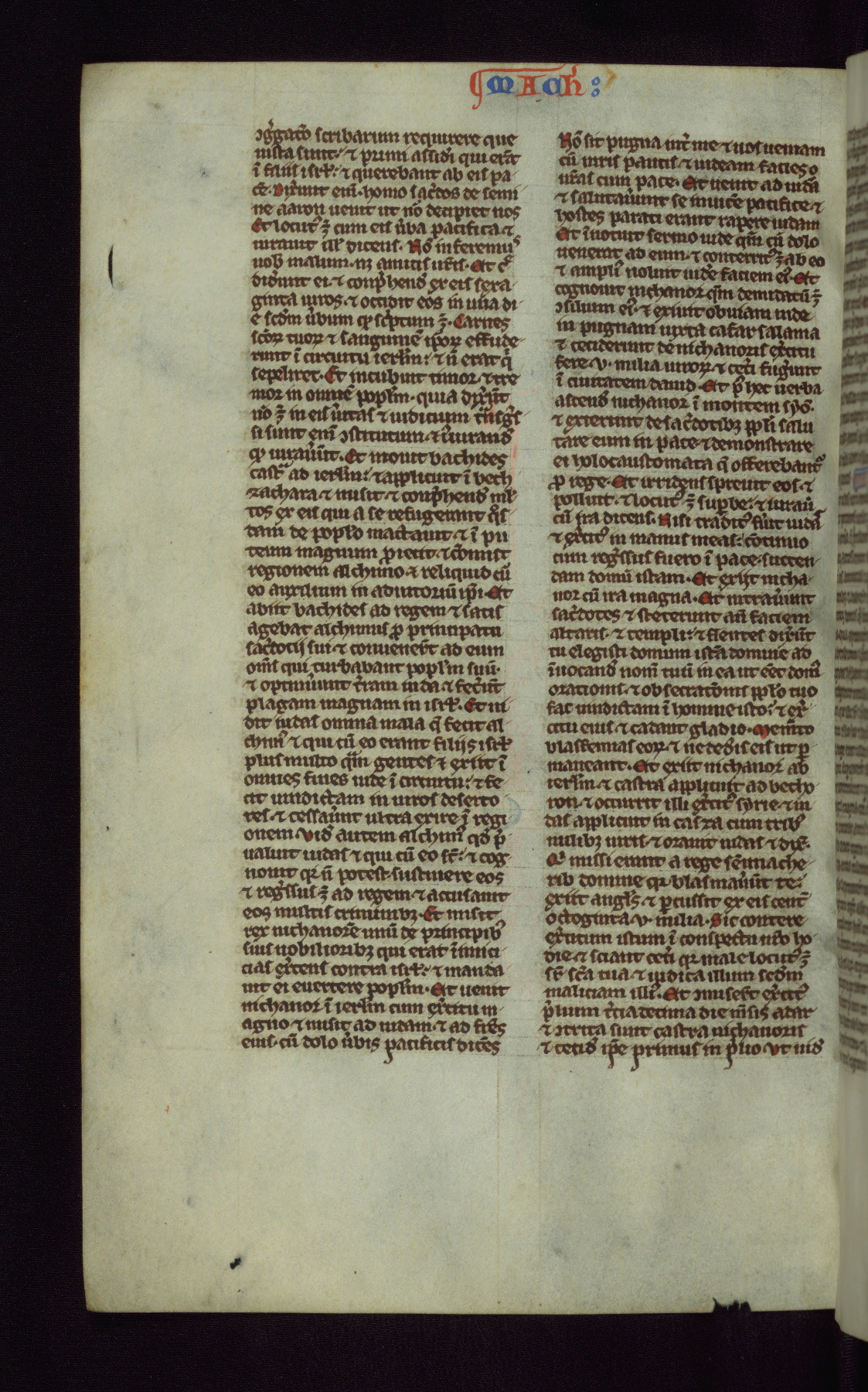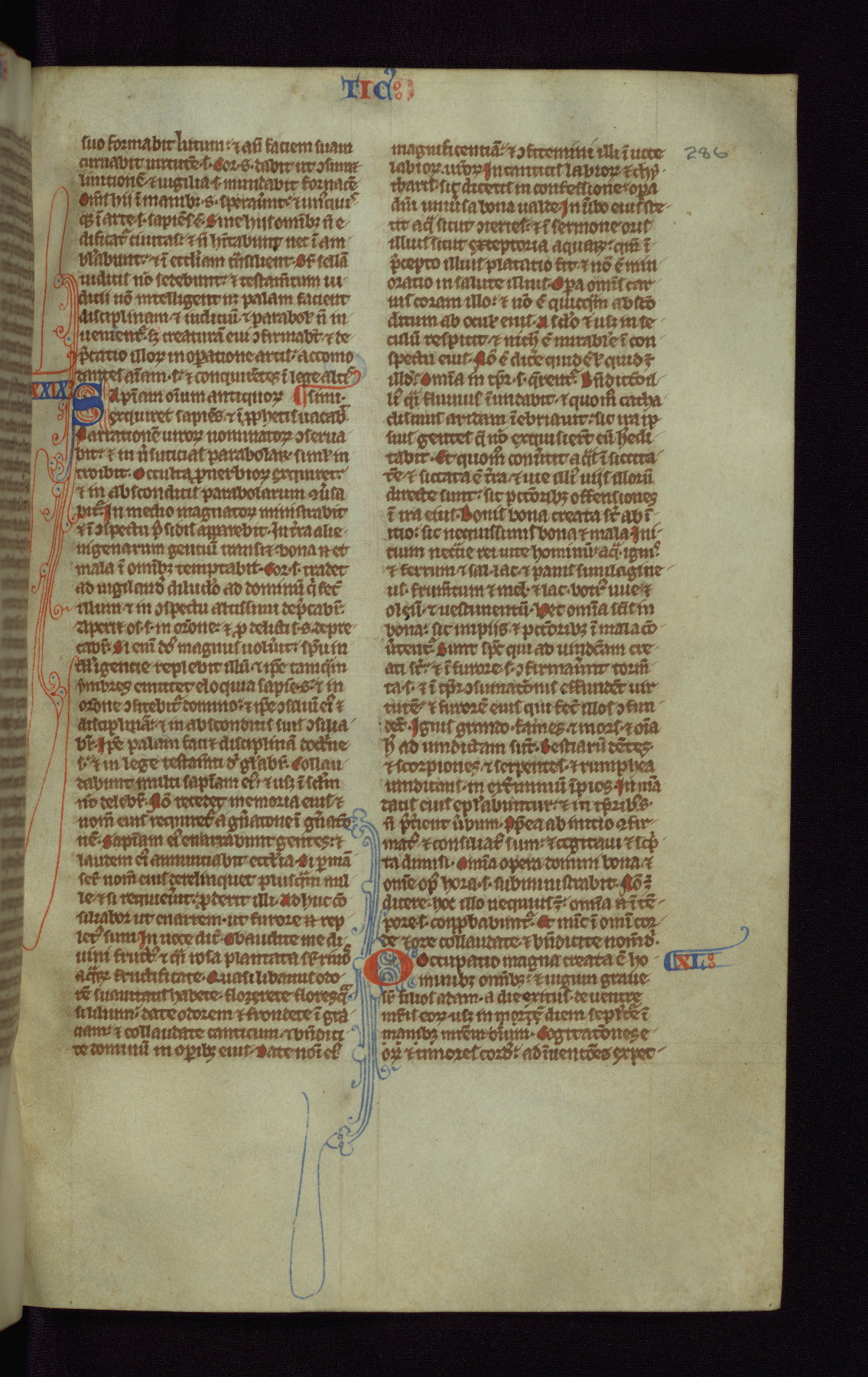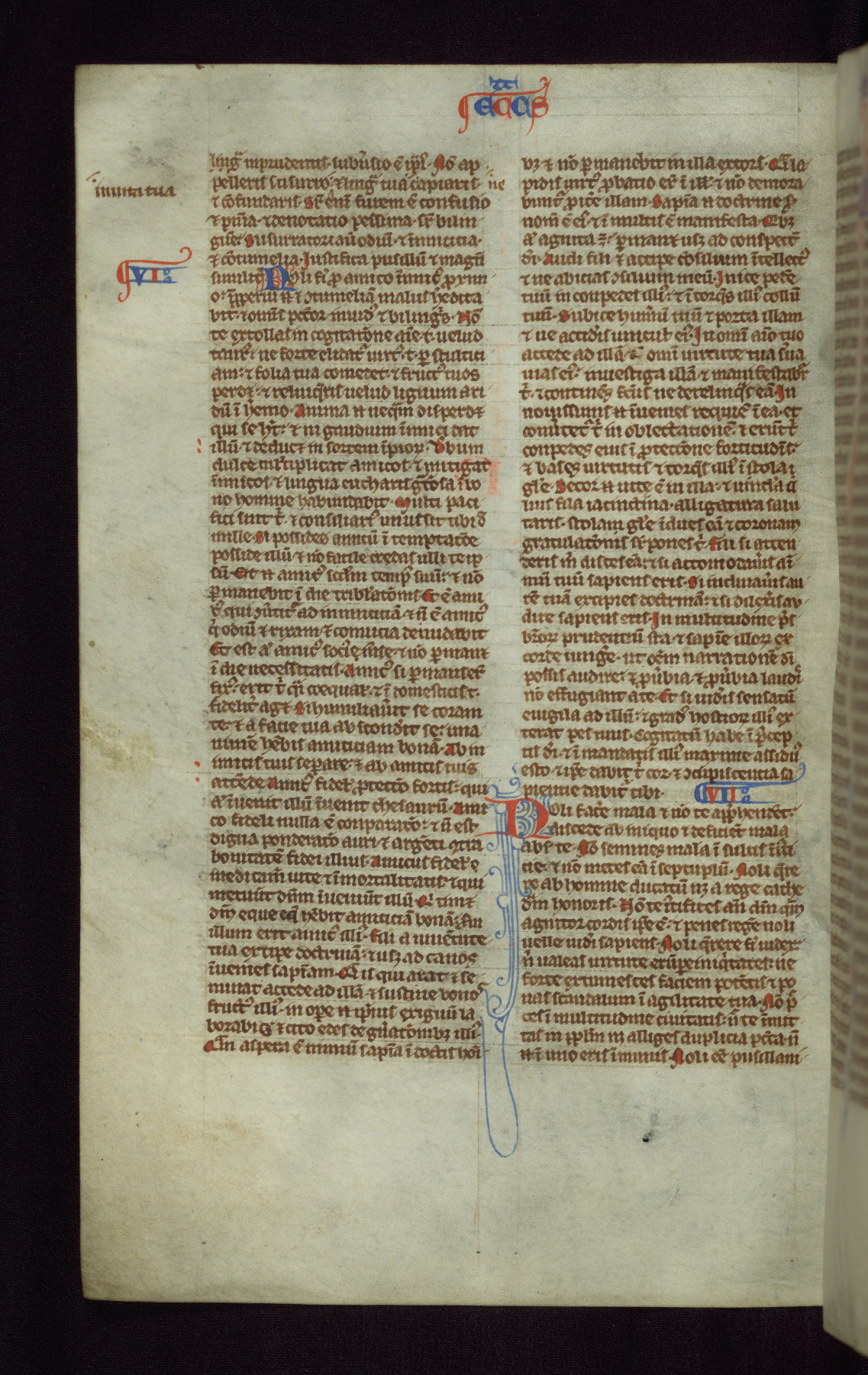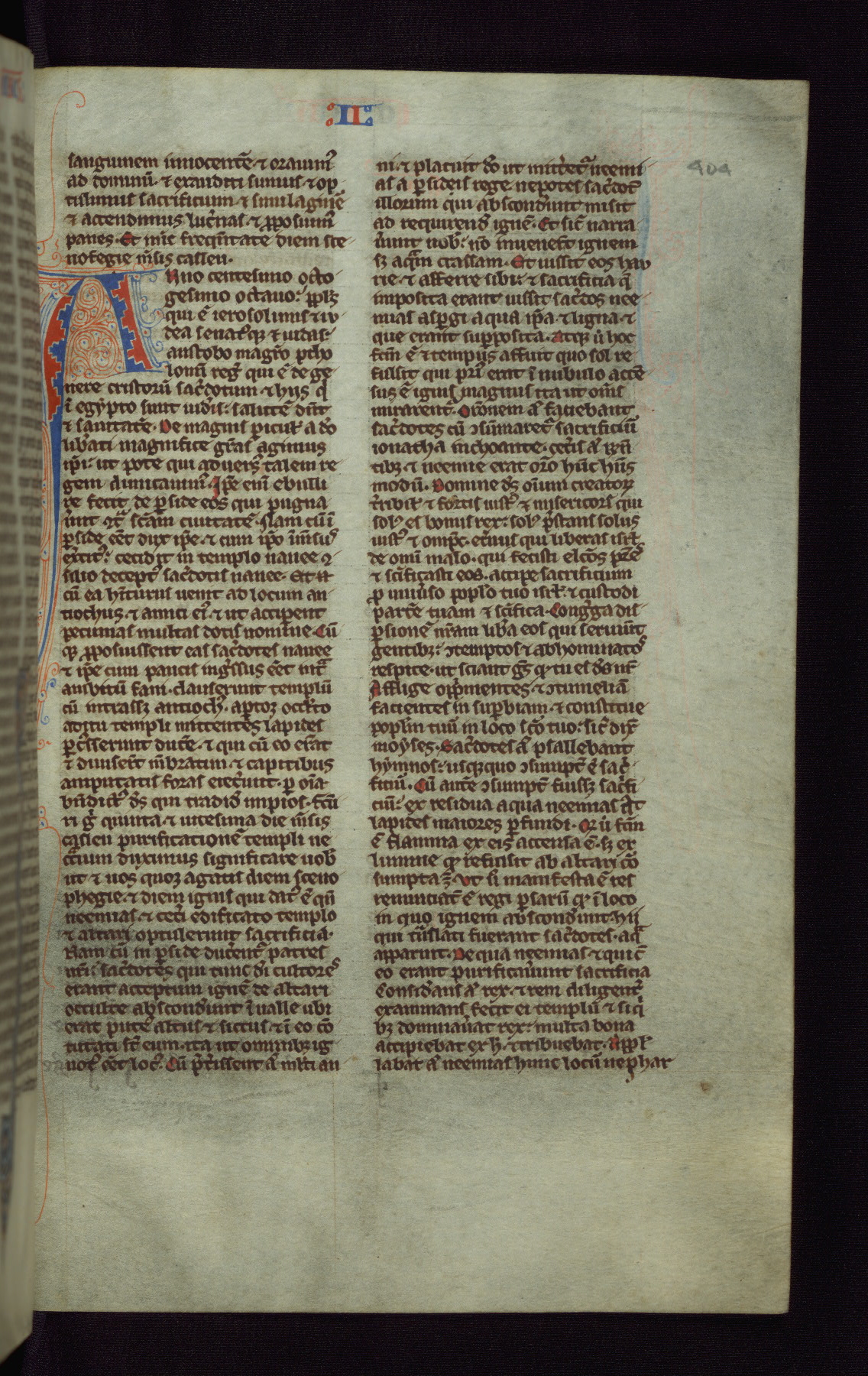 This pocket-size Bible was created around the middle of the thirteenth century in England. It contains the Vulgate text of the Old and New Testaments, arranged in order and divided into chapters. Such Bibles, designed for individual rather than institutional use, began to be created on a large scale during the thirteenth century, especially in Paris. This manuscript is illuminated with a large number of small historiated initials, and also includes a somewhat later image of the Three Living and the Three Dead, a popular scene based on a French poem of the same century.