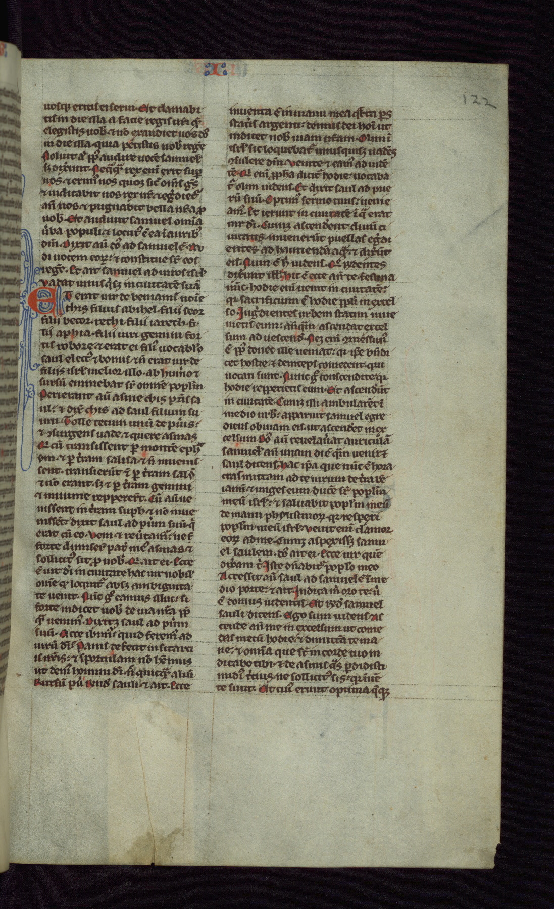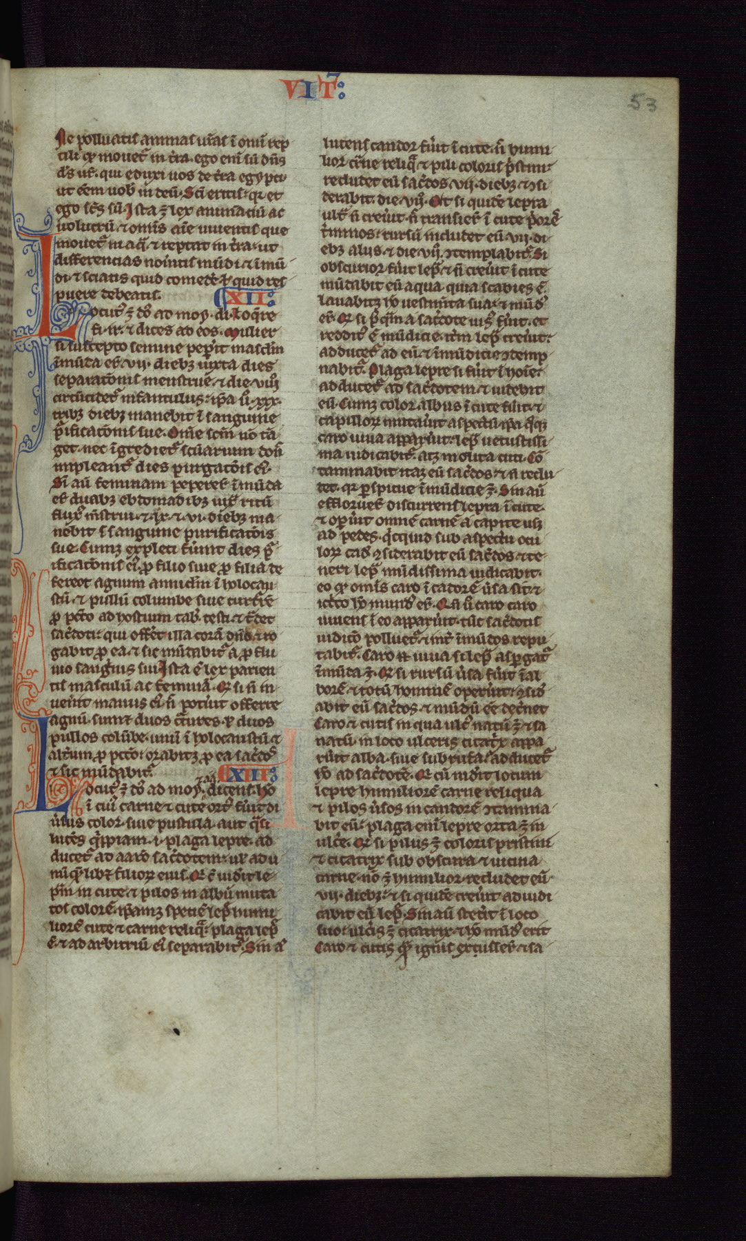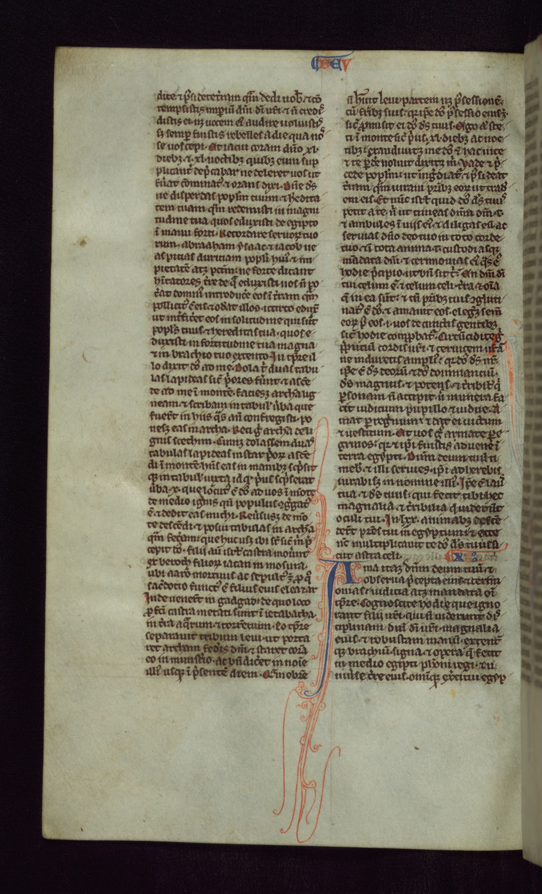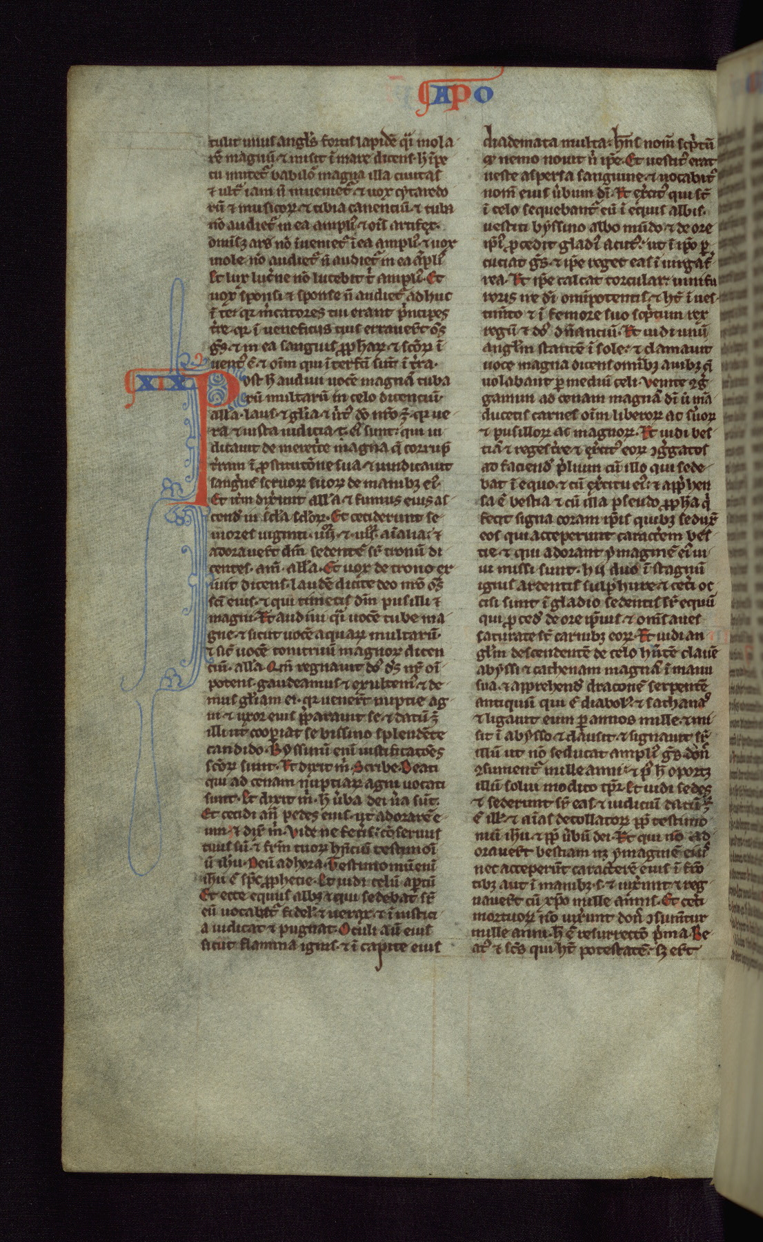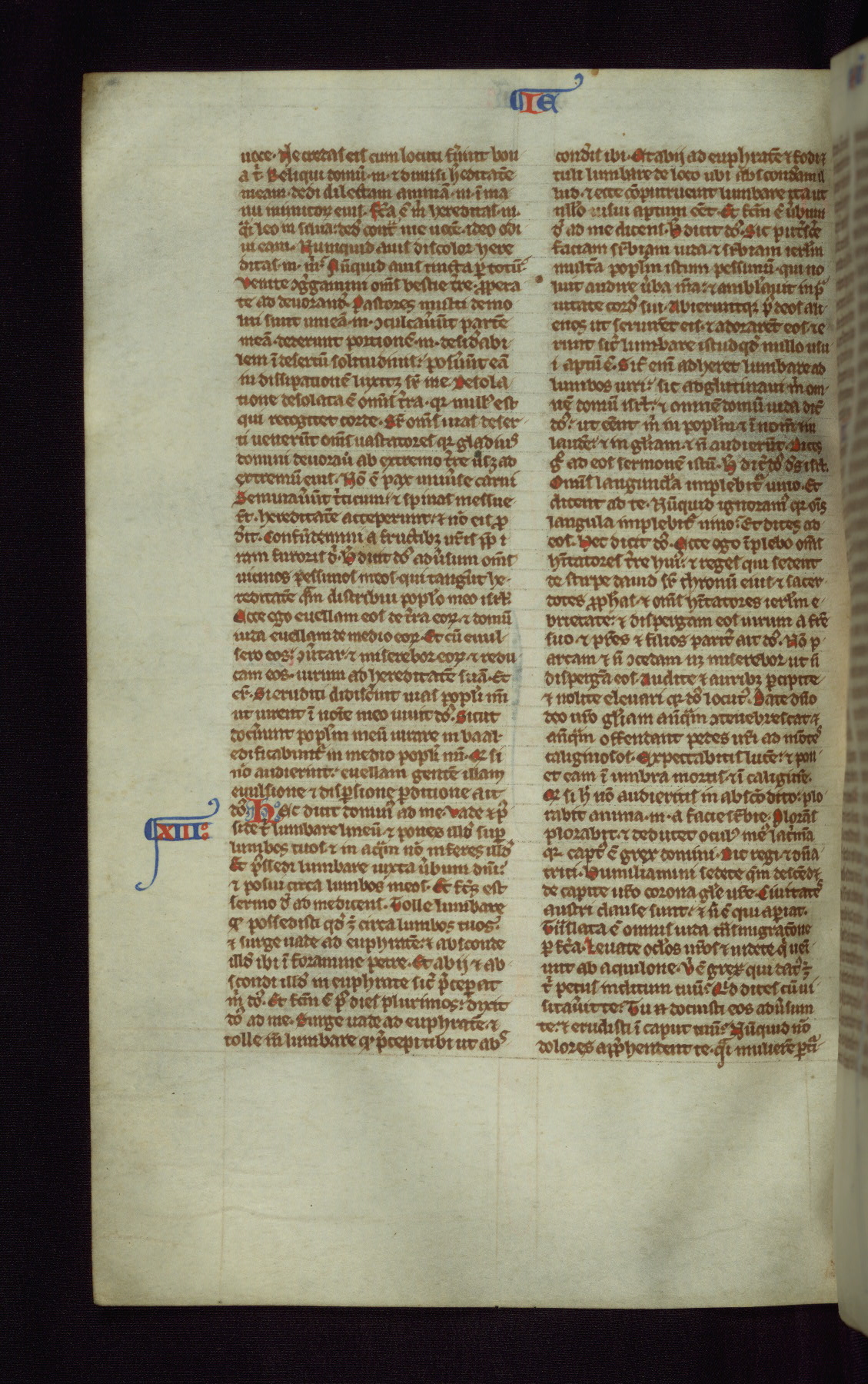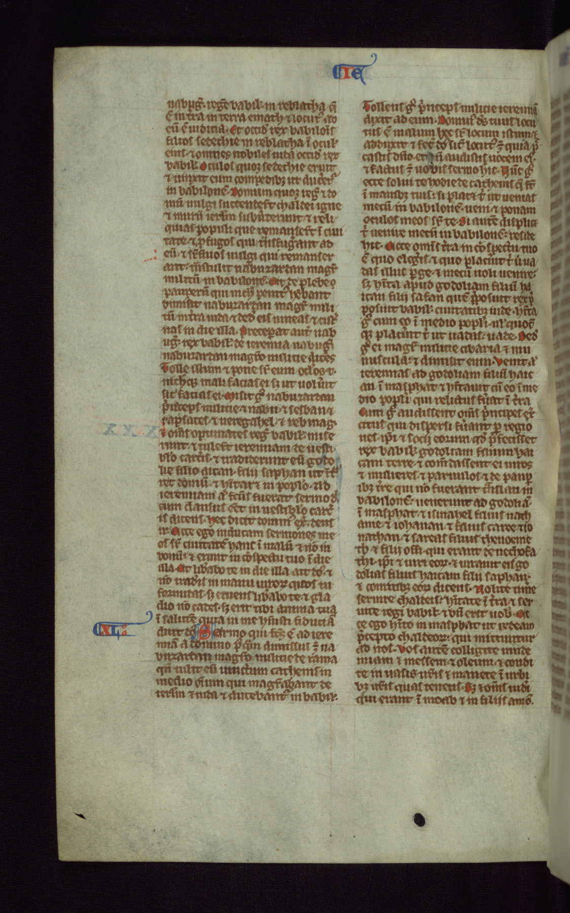 This pocket-size Bible was created around the middle of the thirteenth century in England. It contains the Vulgate text of the Old and New Testaments, arranged in order and divided into chapters. Such Bibles, designed for individual rather than institutional use, began to be created on a large scale during the thirteenth century, especially in Paris. This manuscript is illuminated with a large number of small historiated initials, and also includes a somewhat later image of the Three Living and the Three Dead, a popular scene based on a French poem of the same century.