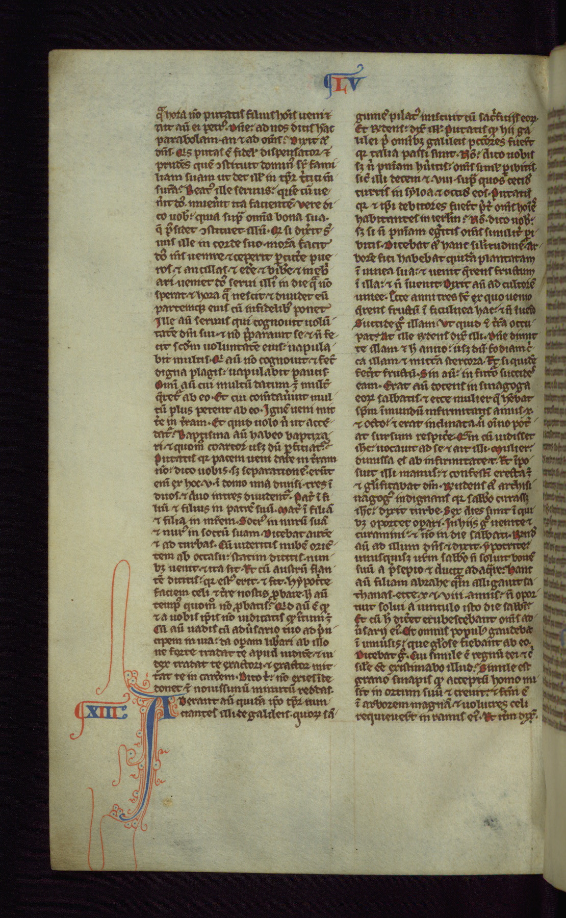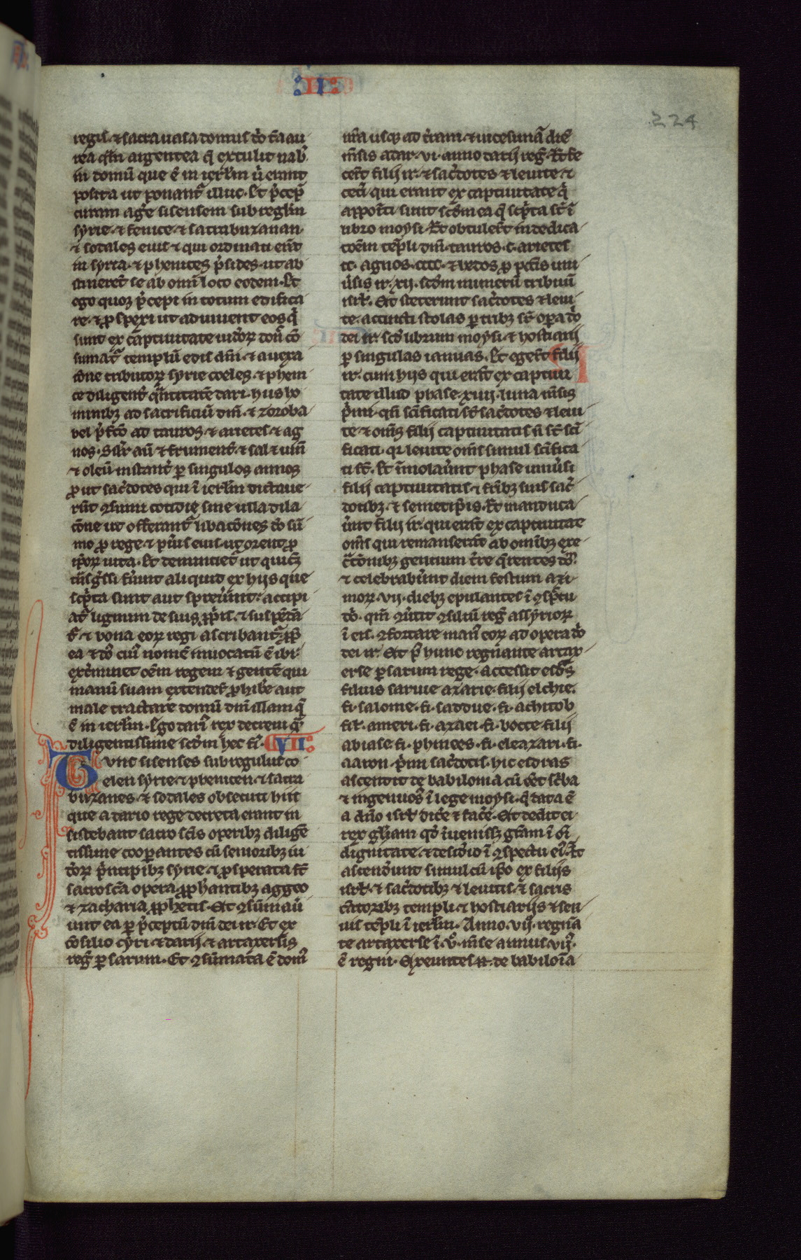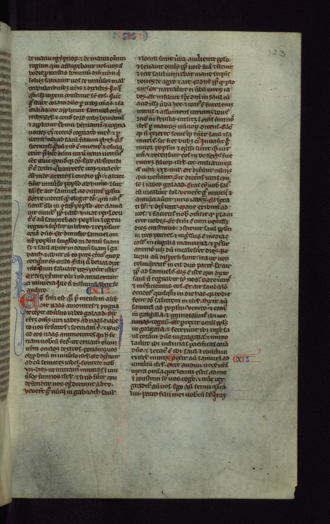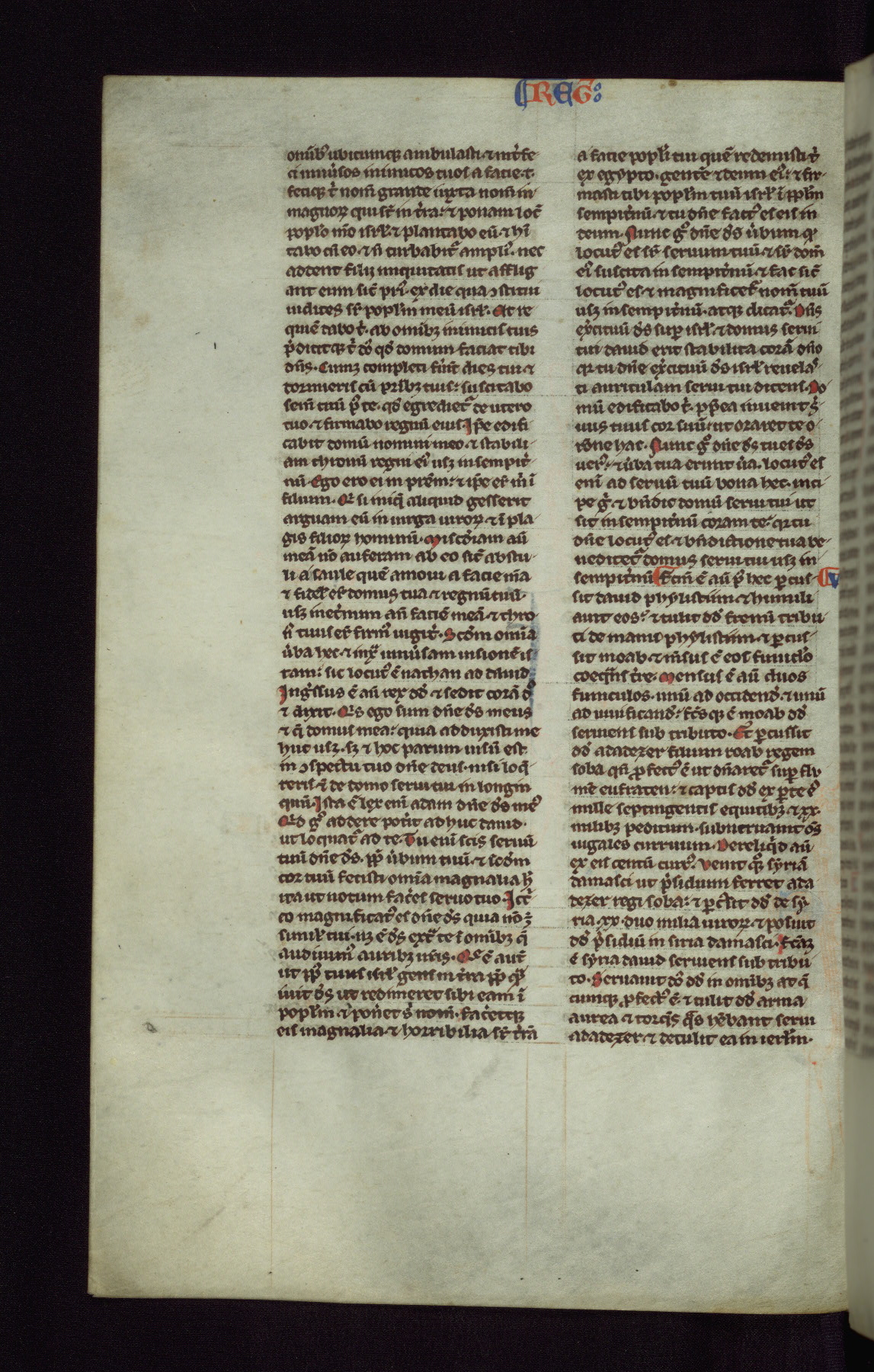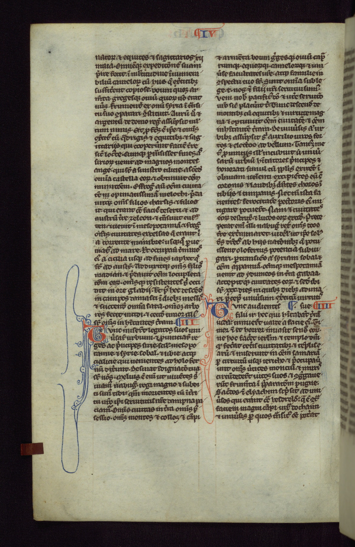 This pocket-size Bible was created around the middle of the thirteenth century in England. It contains the Vulgate text of the Old and New Testaments, arranged in order and divided into chapters. Such Bibles, designed for individual rather than institutional use, began to be created on a large scale during the thirteenth century, especially in Paris. This manuscript is illuminated with a large number of small historiated initials, and also includes a somewhat later image of the Three Living and the Three Dead, a popular scene based on a French poem of the same century.