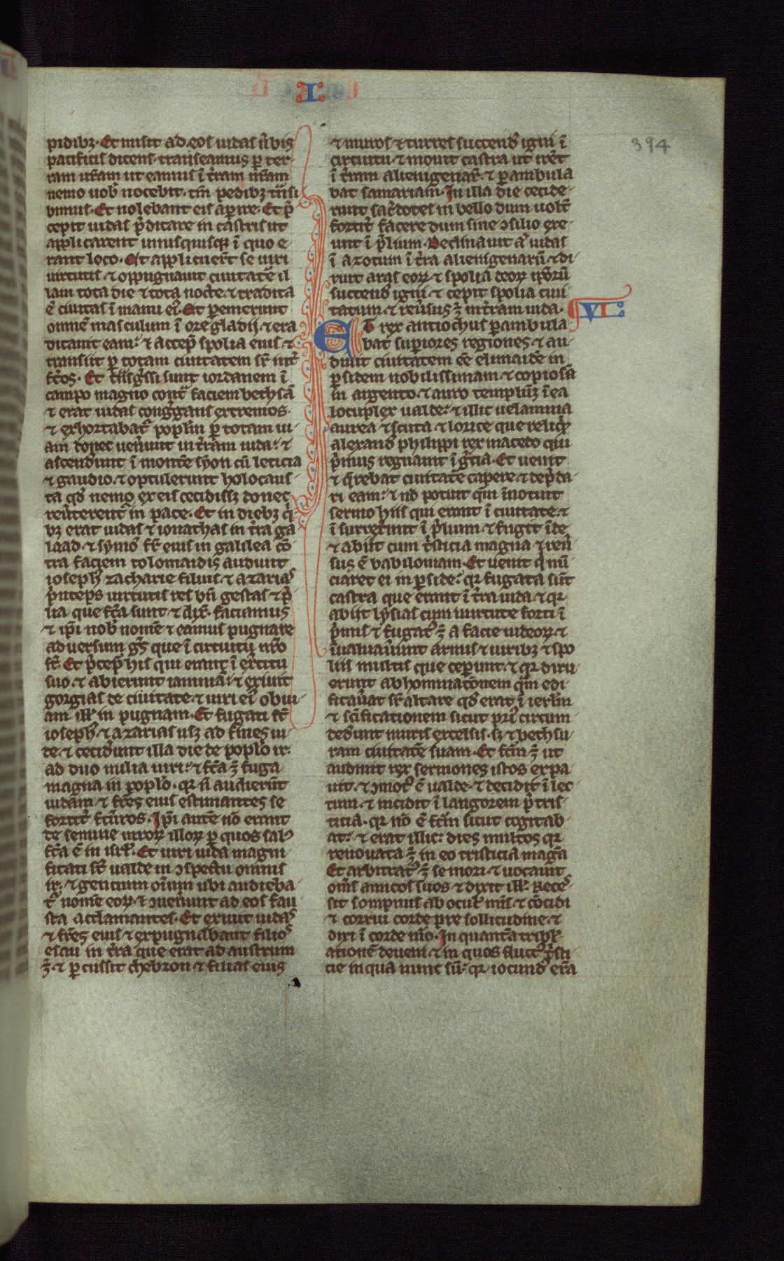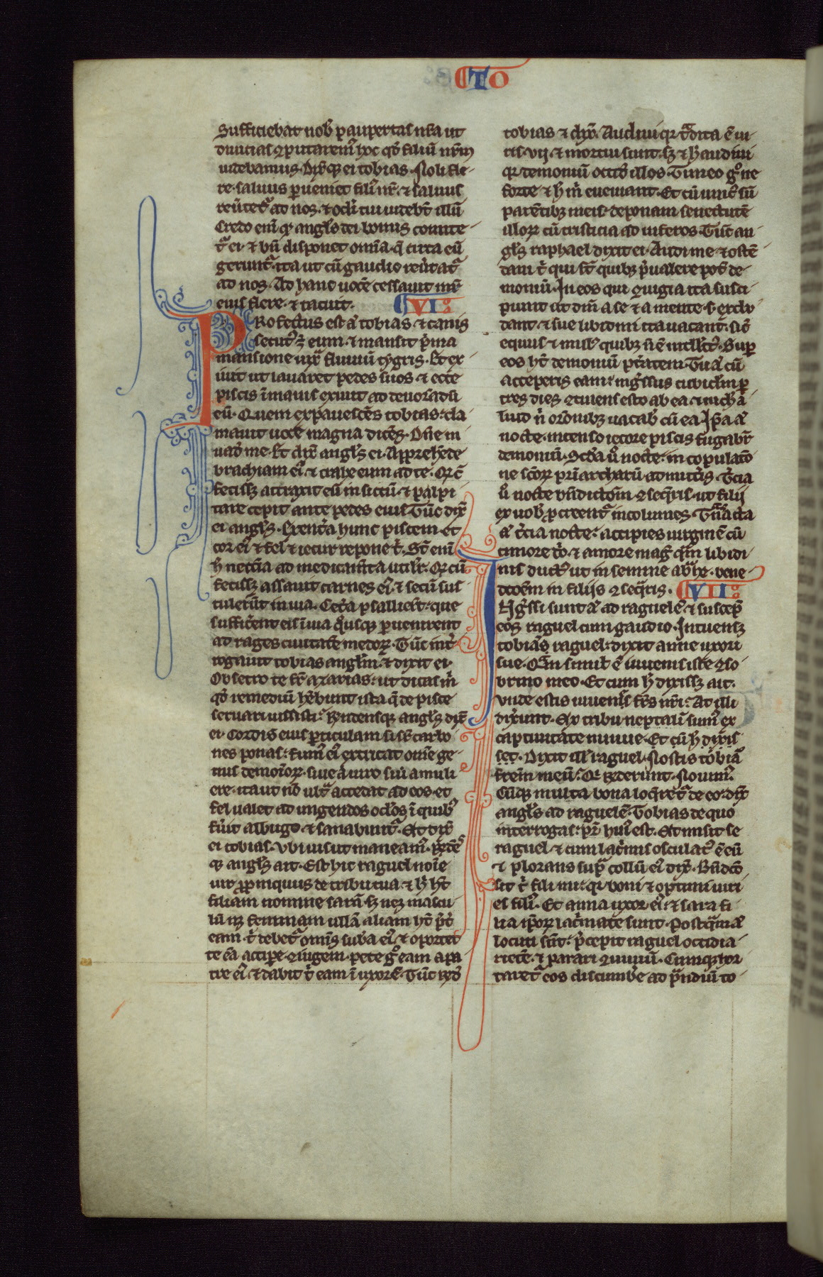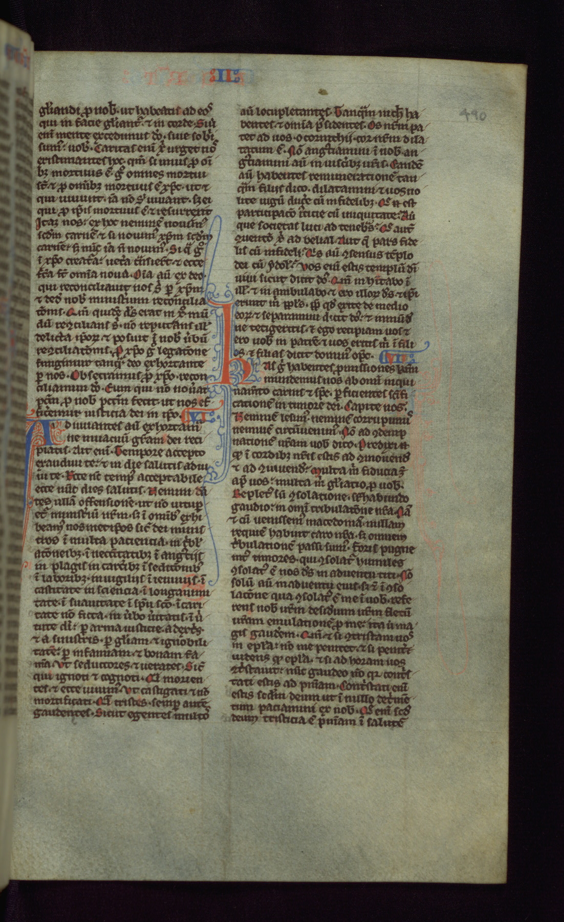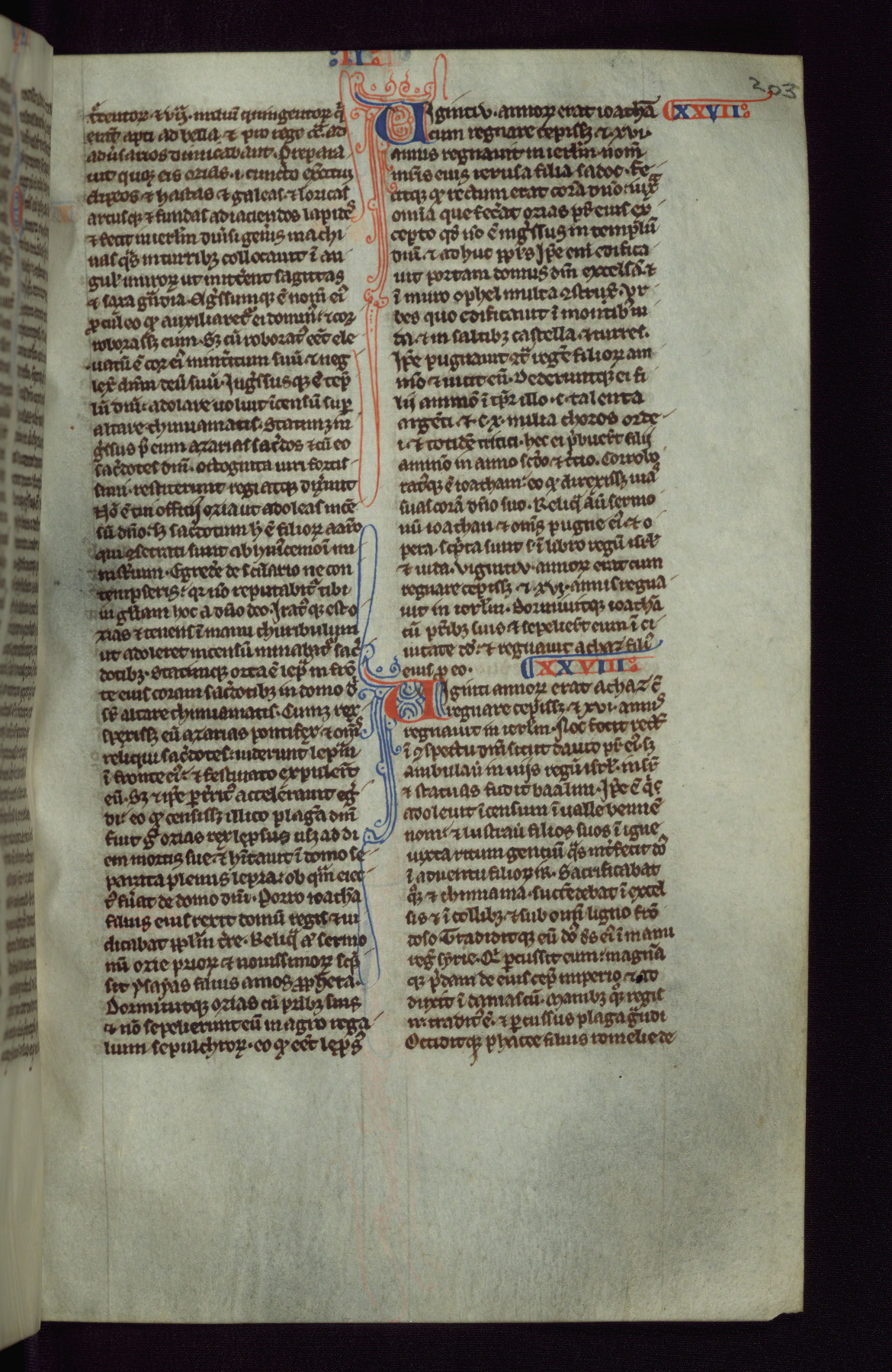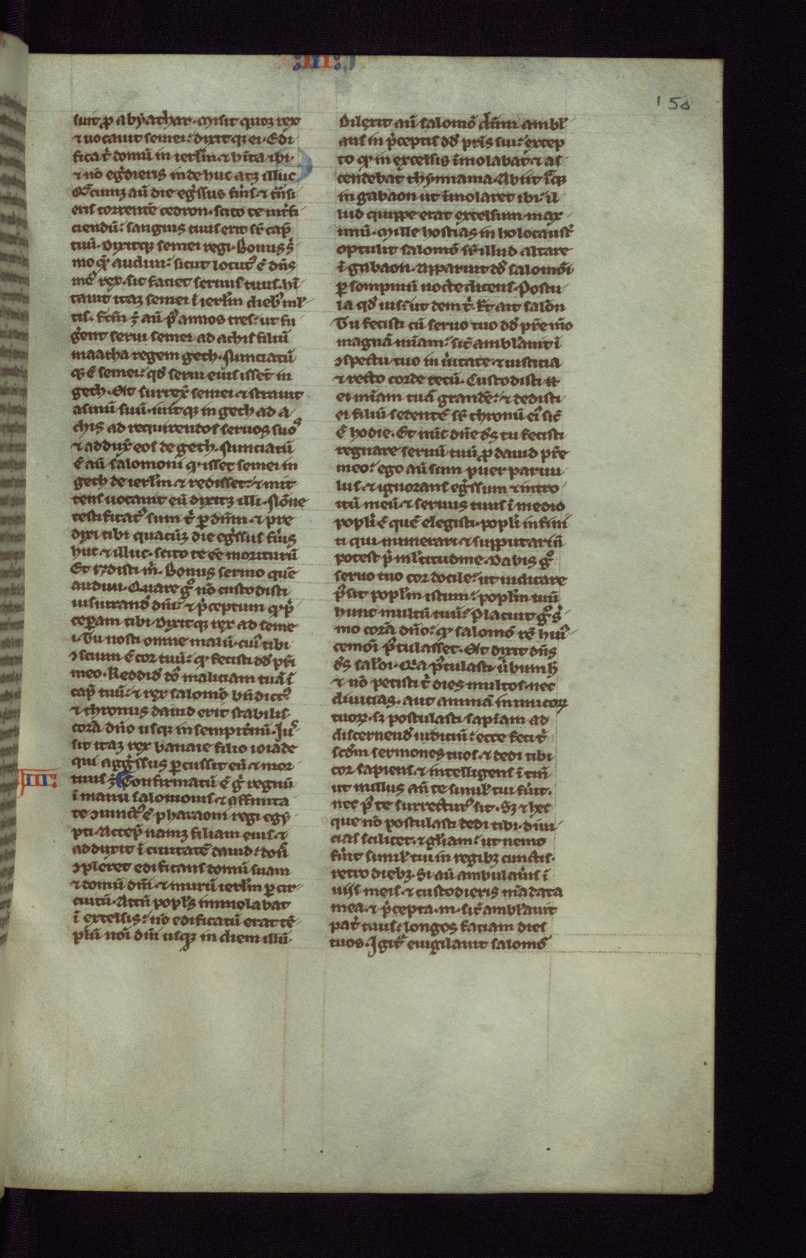 This pocket-size Bible was created around the middle of the thirteenth century in England. It contains the Vulgate text of the Old and New Testaments, arranged in order and divided into chapters. Such Bibles, designed for individual rather than institutional use, began to be created on a large scale during the thirteenth century, especially in Paris. This manuscript is illuminated with a large number of small historiated initials, and also includes a somewhat later image of the Three Living and the Three Dead, a popular scene based on a French poem of the same century.