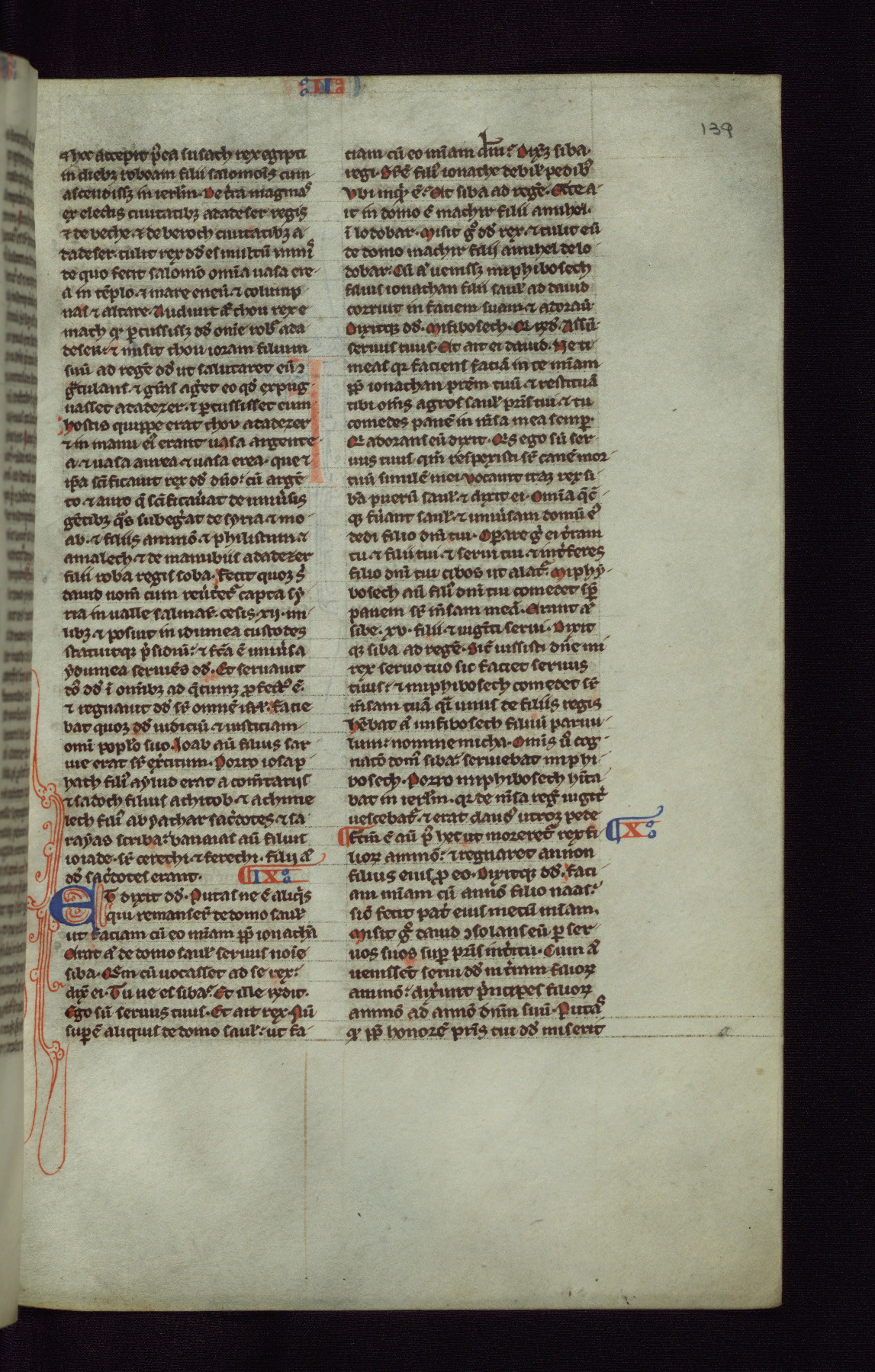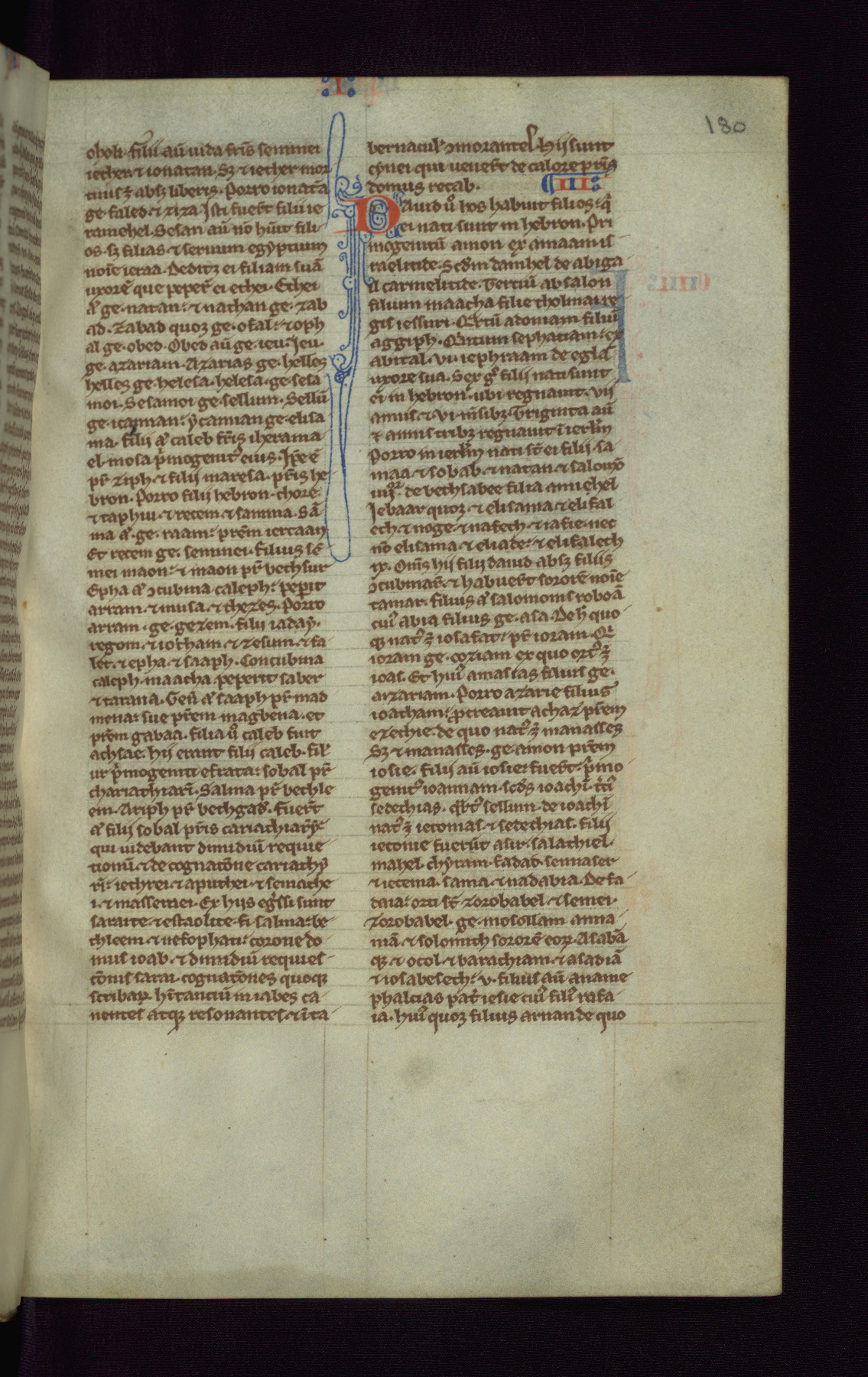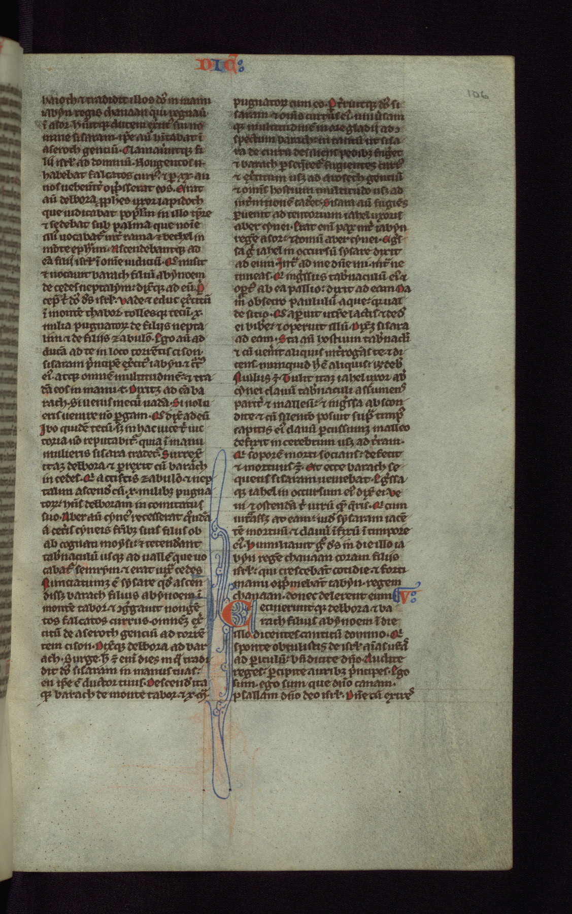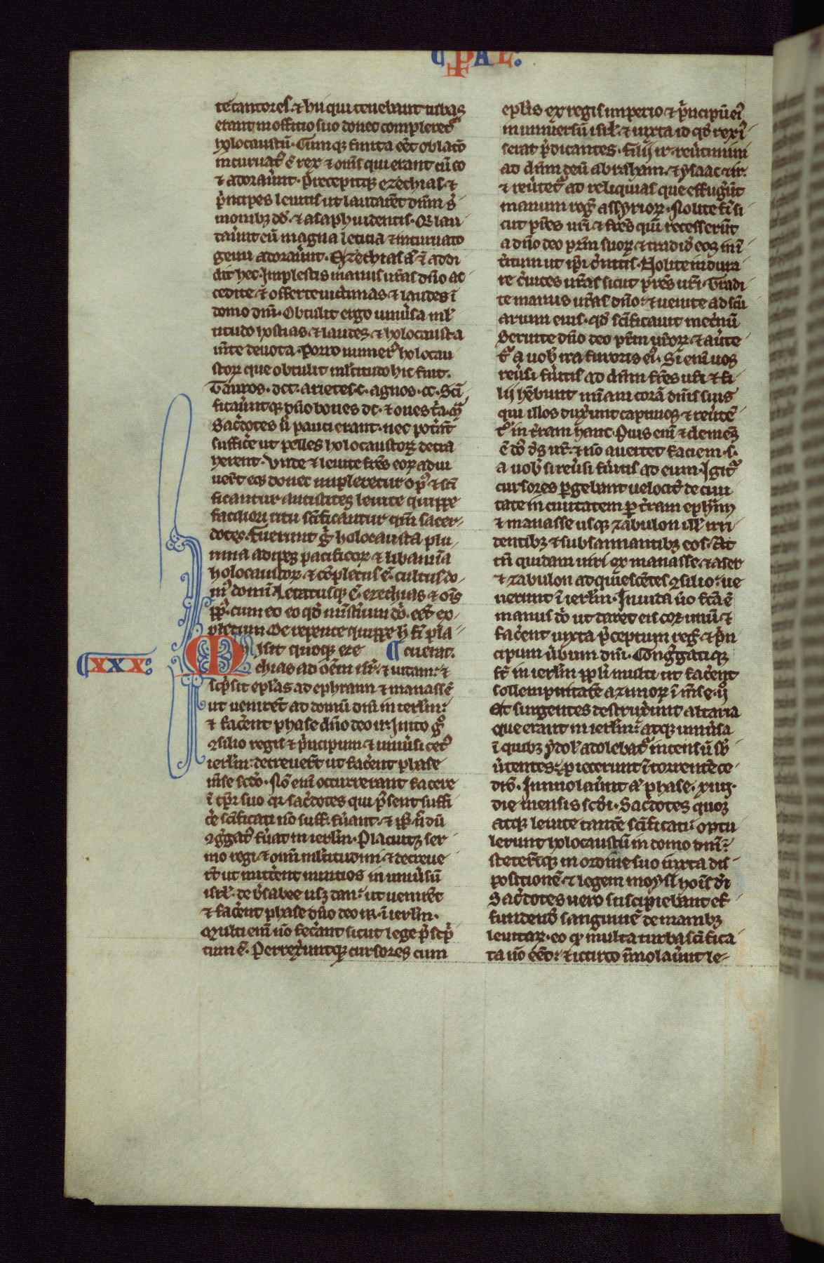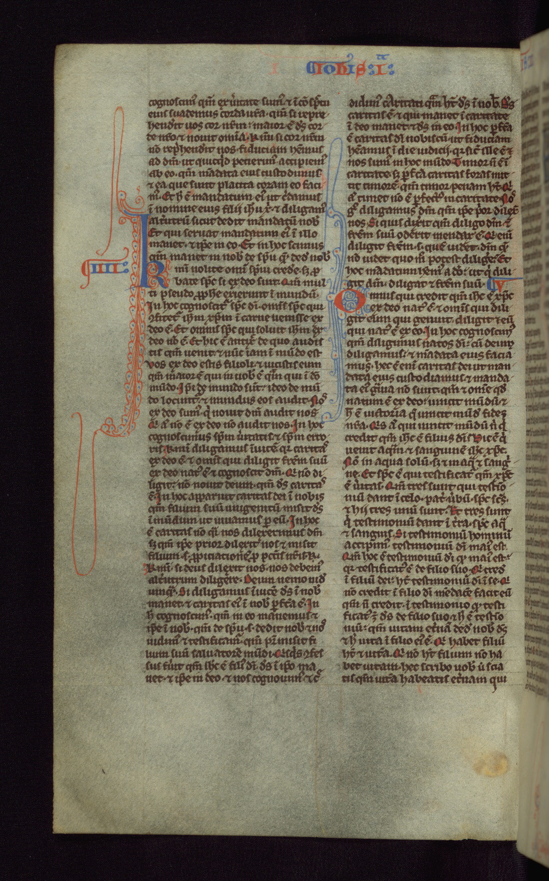 This pocket-size Bible was created around the middle of the thirteenth century in England. It contains the Vulgate text of the Old and New Testaments, arranged in order and divided into chapters. Such Bibles, designed for individual rather than institutional use, began to be created on a large scale during the thirteenth century, especially in Paris. This manuscript is illuminated with a large number of small historiated initials, and also includes a somewhat later image of the Three Living and the Three Dead, a popular scene based on a French poem of the same century.