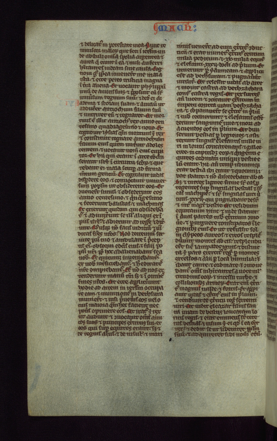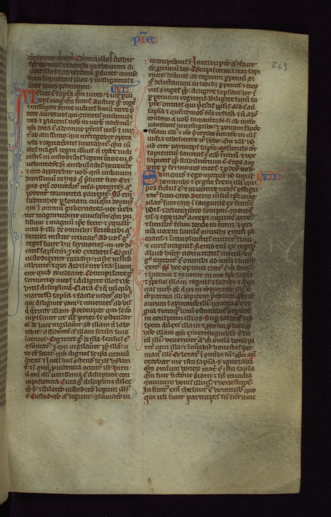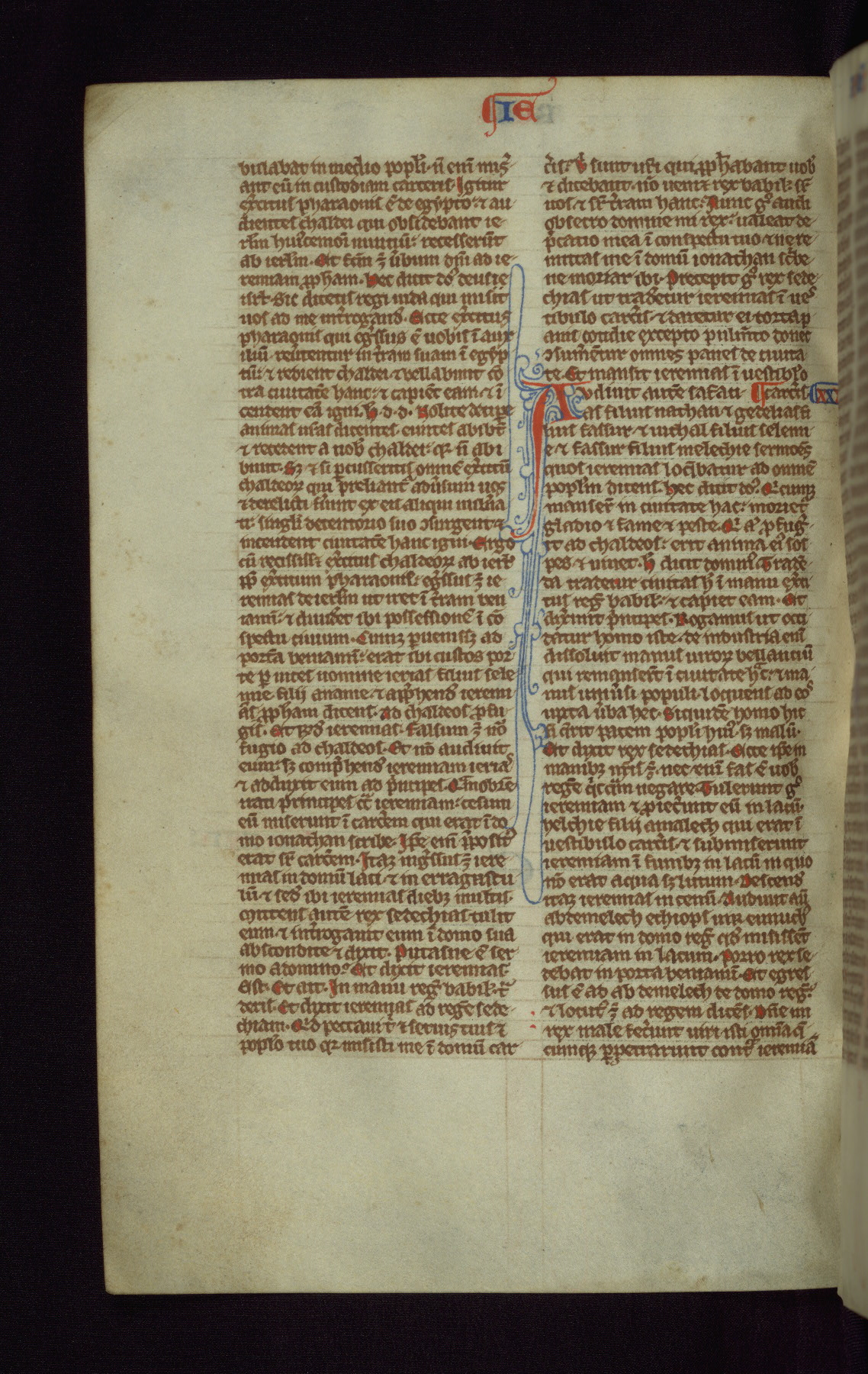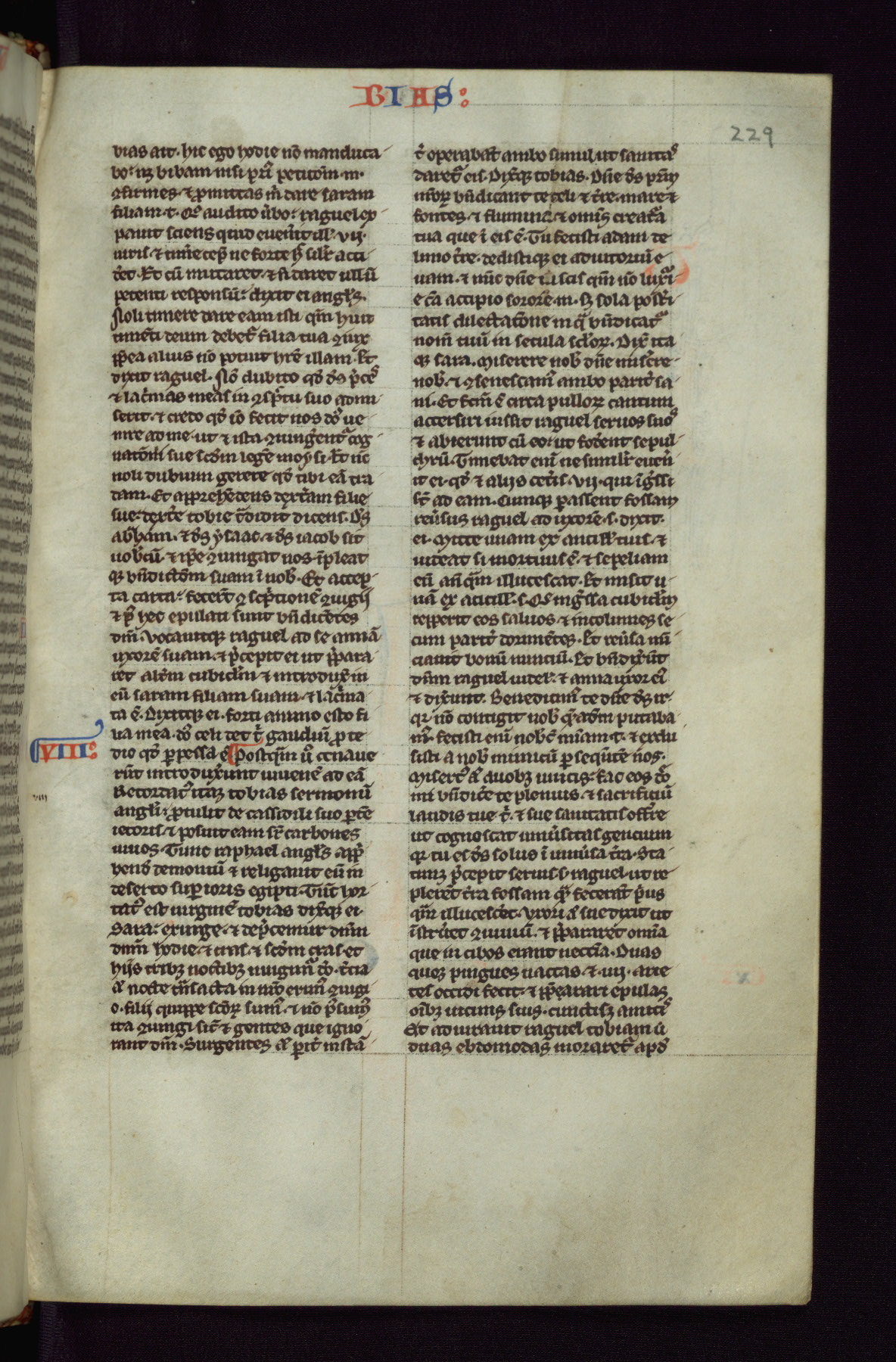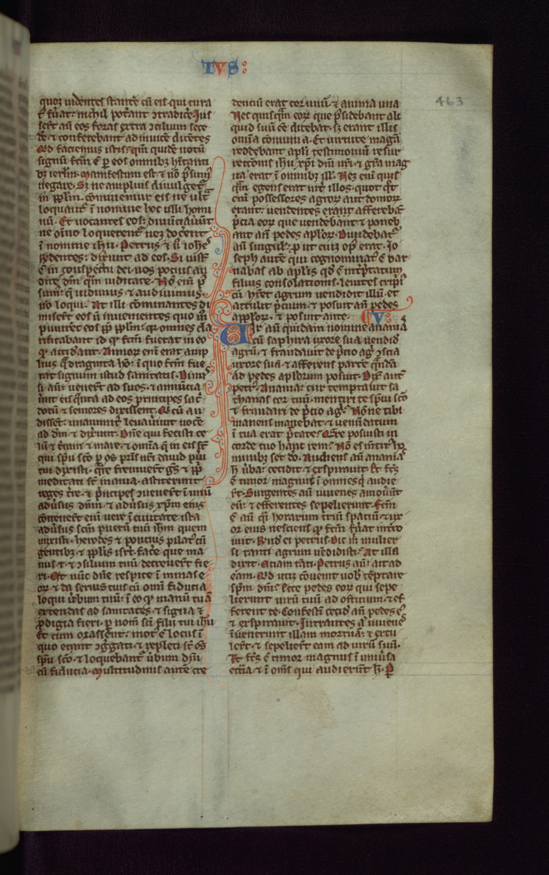 This pocket-size Bible was created around the middle of the thirteenth century in England. It contains the Vulgate text of the Old and New Testaments, arranged in order and divided into chapters. Such Bibles, designed for individual rather than institutional use, began to be created on a large scale during the thirteenth century, especially in Paris. This manuscript is illuminated with a large number of small historiated initials, and also includes a somewhat later image of the Three Living and the Three Dead, a popular scene based on a French poem of the same century.