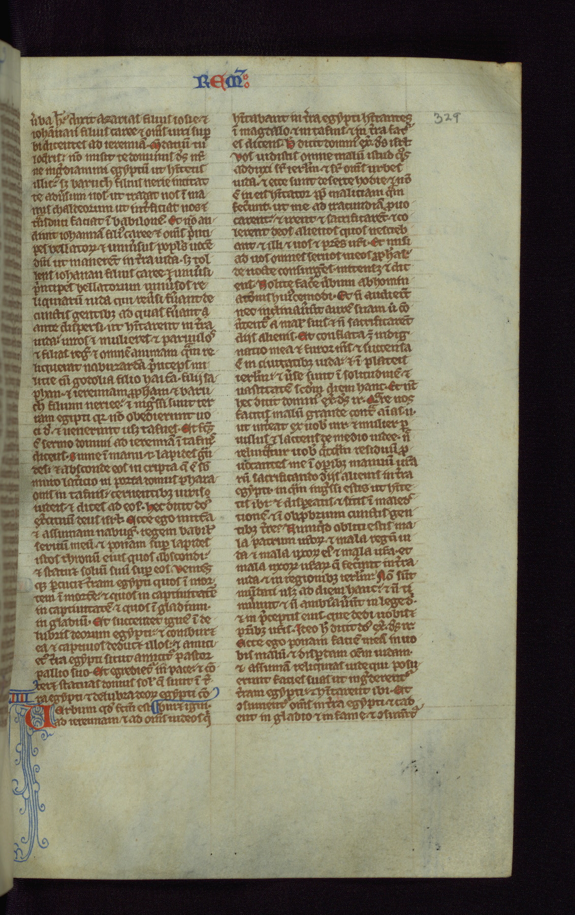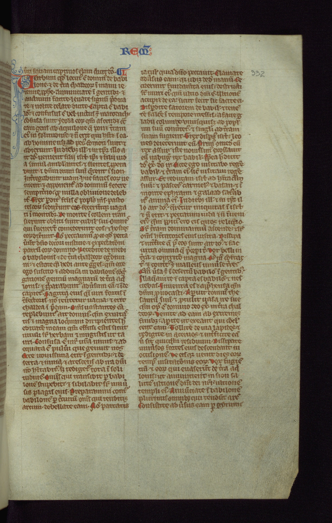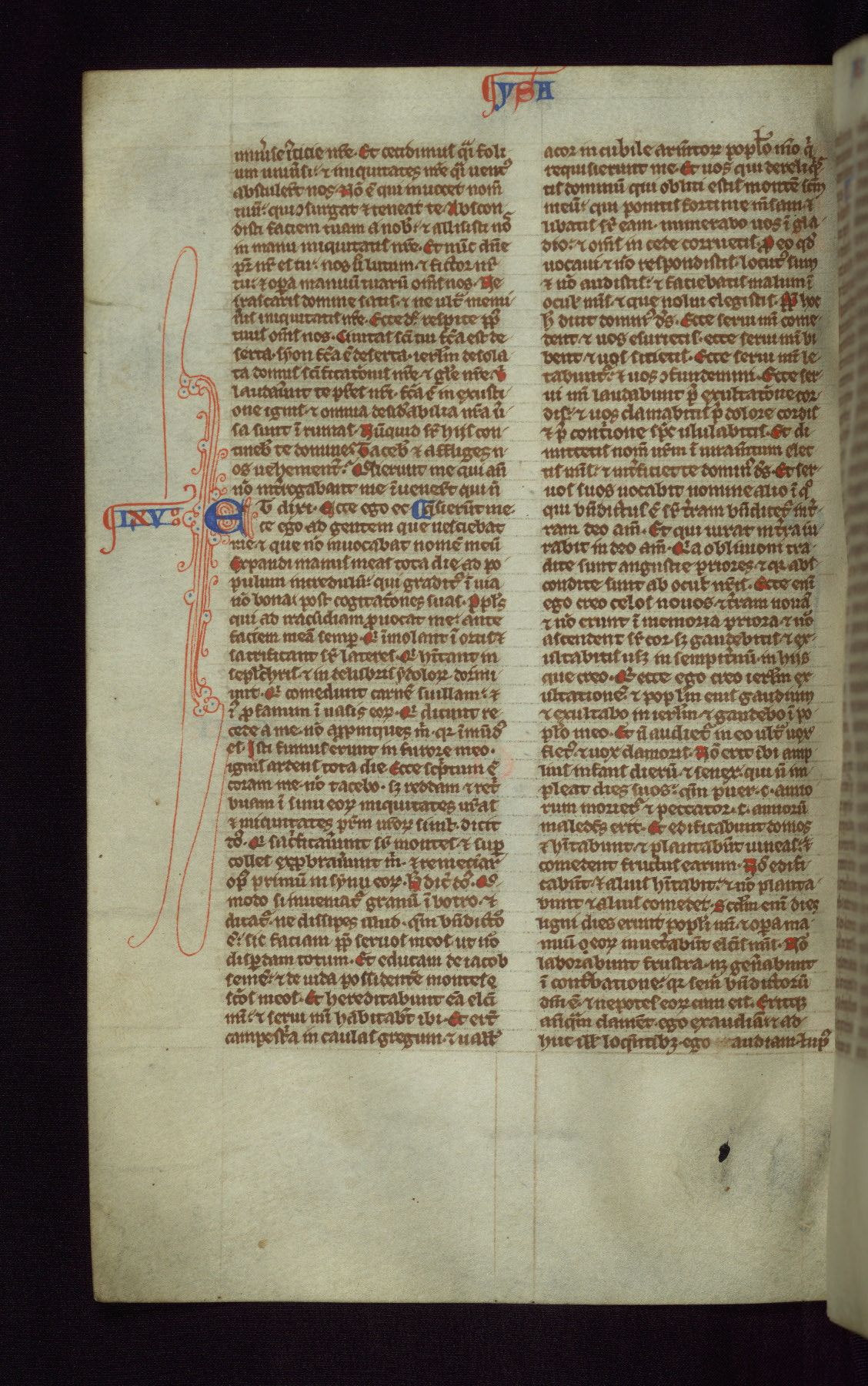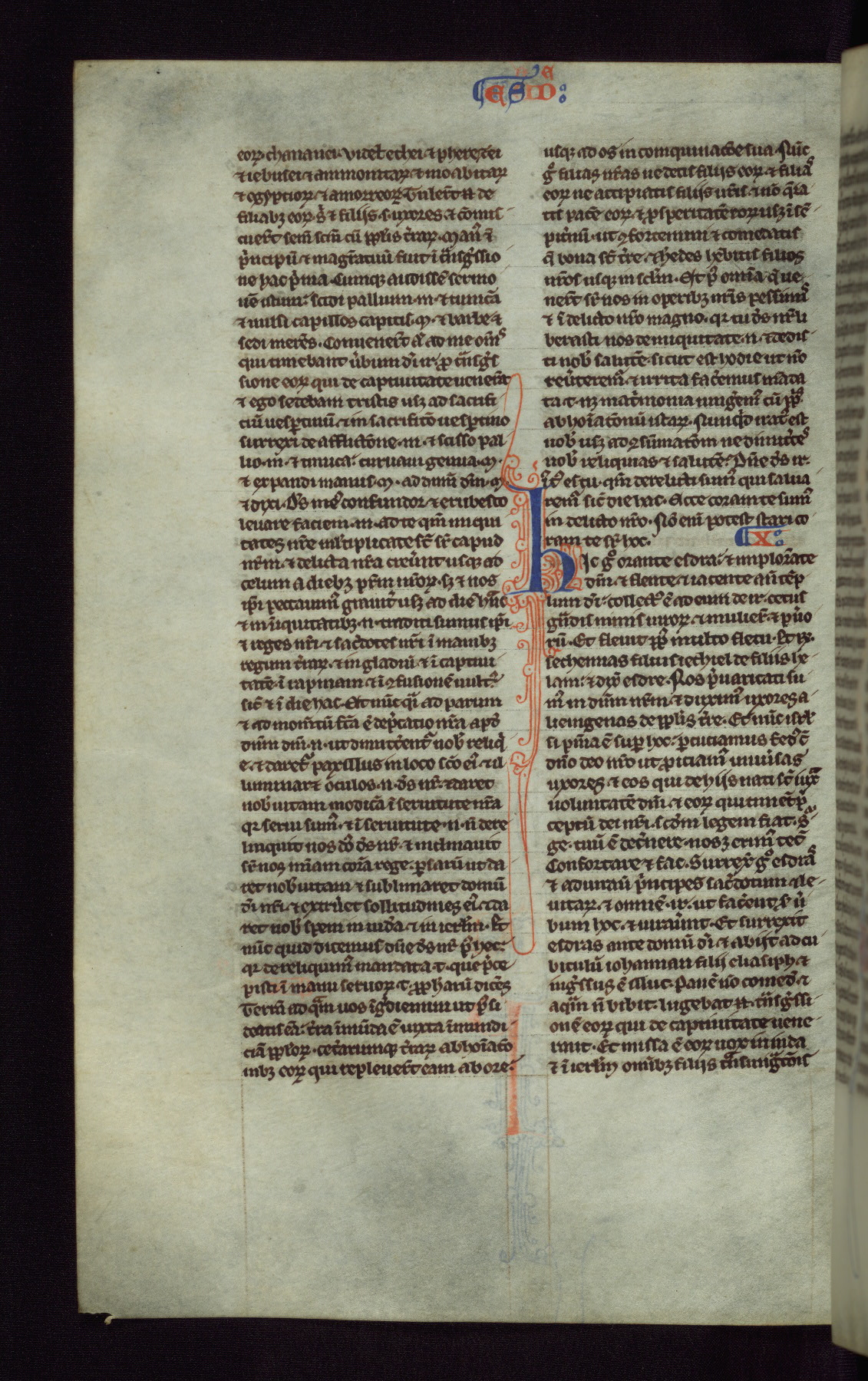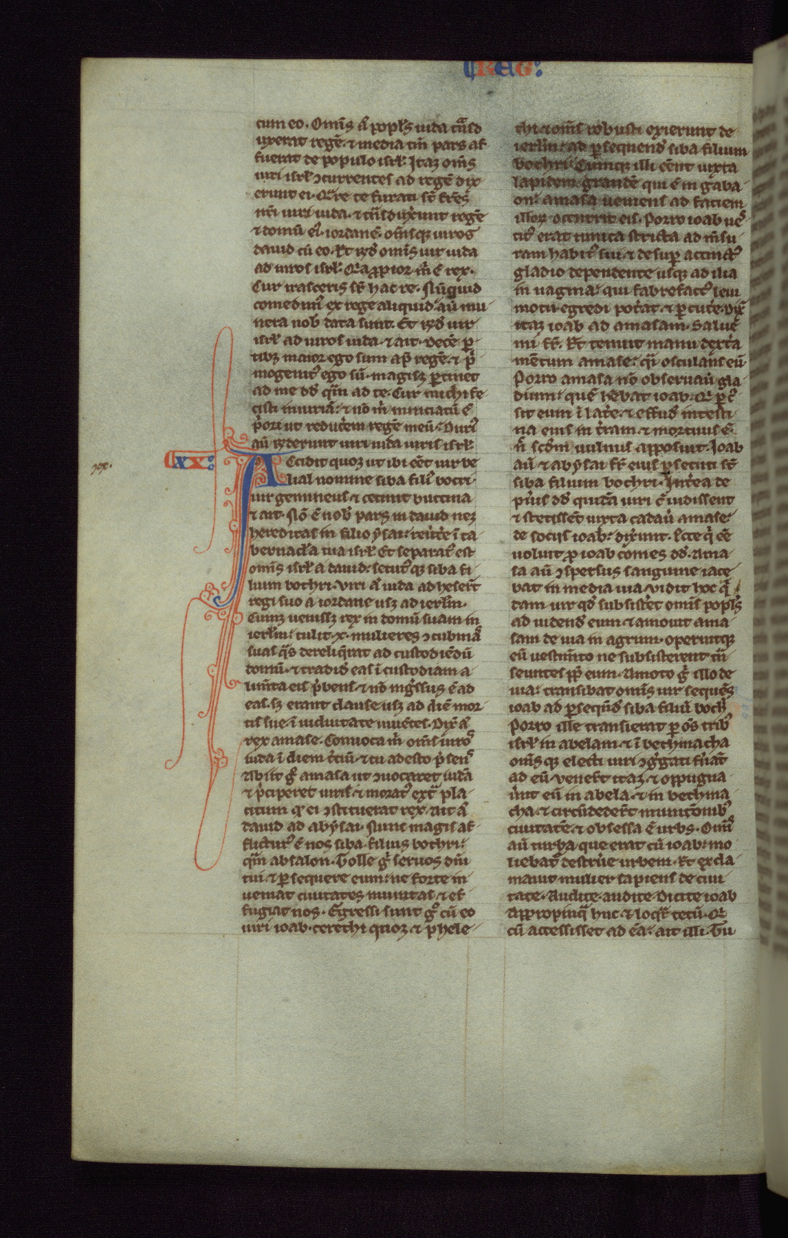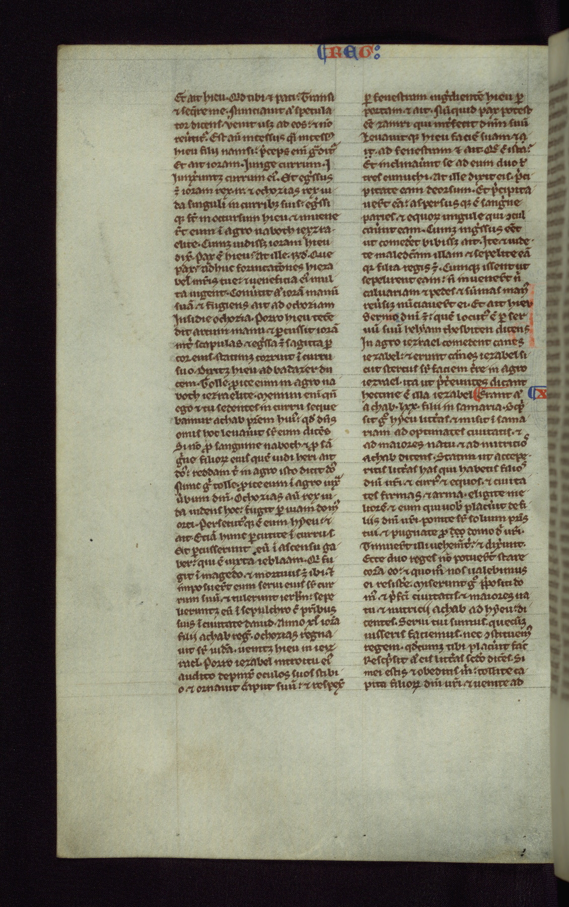 This pocket-size Bible was created around the middle of the thirteenth century in England. It contains the Vulgate text of the Old and New Testaments, arranged in order and divided into chapters. Such Bibles, designed for individual rather than institutional use, began to be created on a large scale during the thirteenth century, especially in Paris. This manuscript is illuminated with a large number of small historiated initials, and also includes a somewhat later image of the Three Living and the Three Dead, a popular scene based on a French poem of the same century.