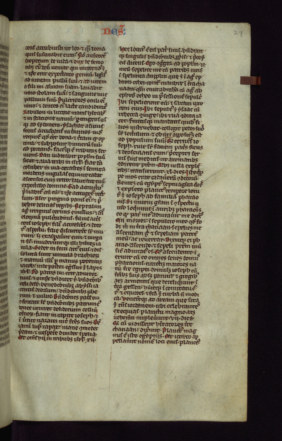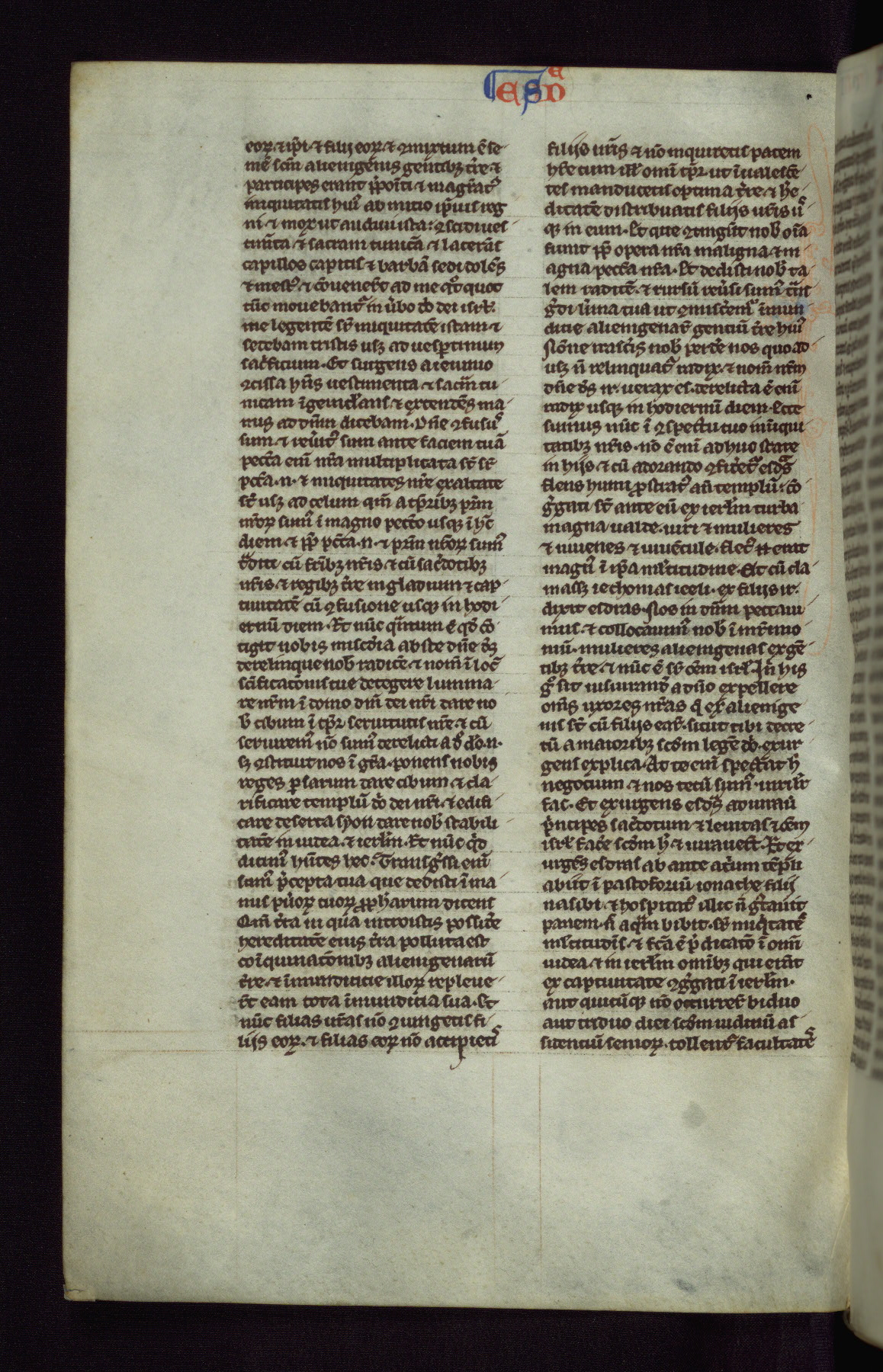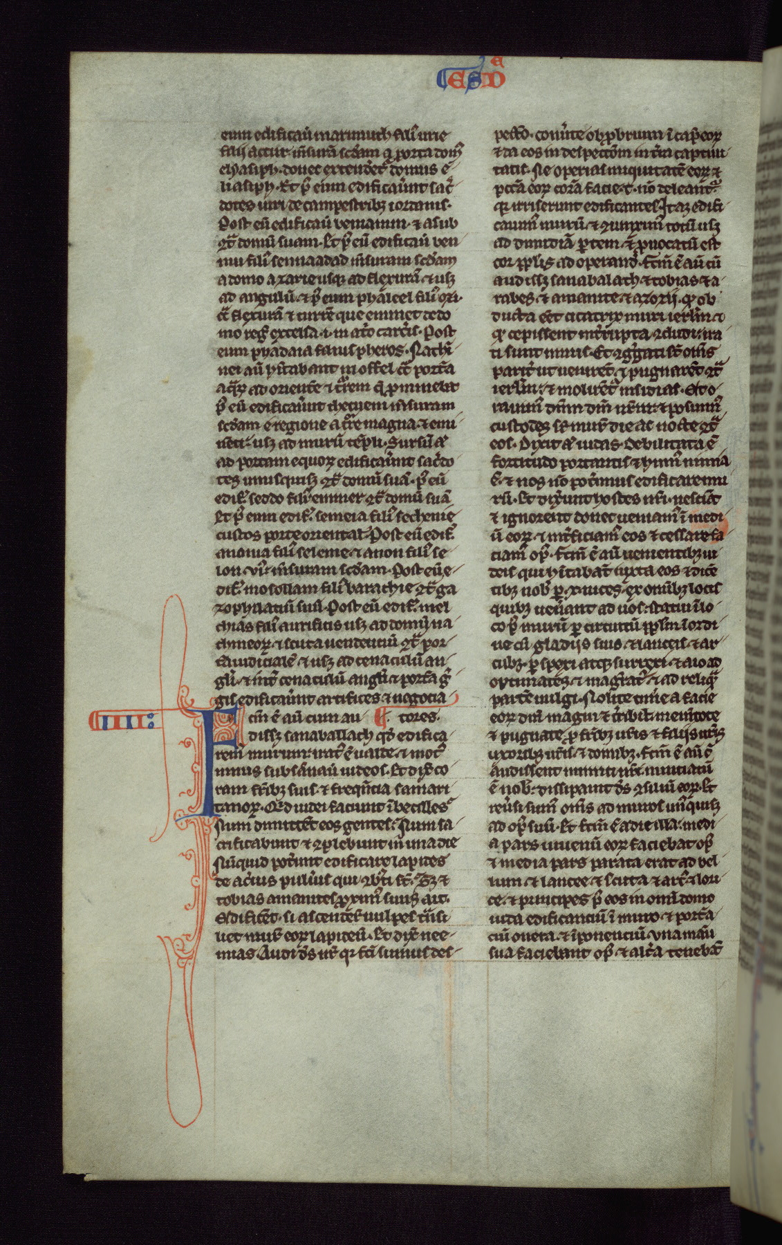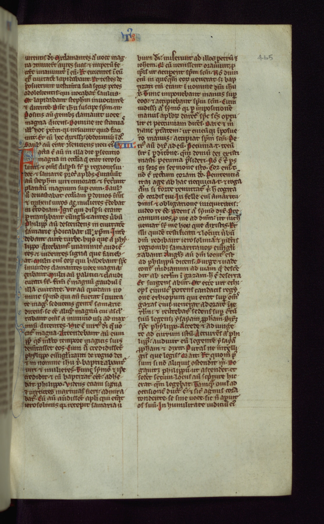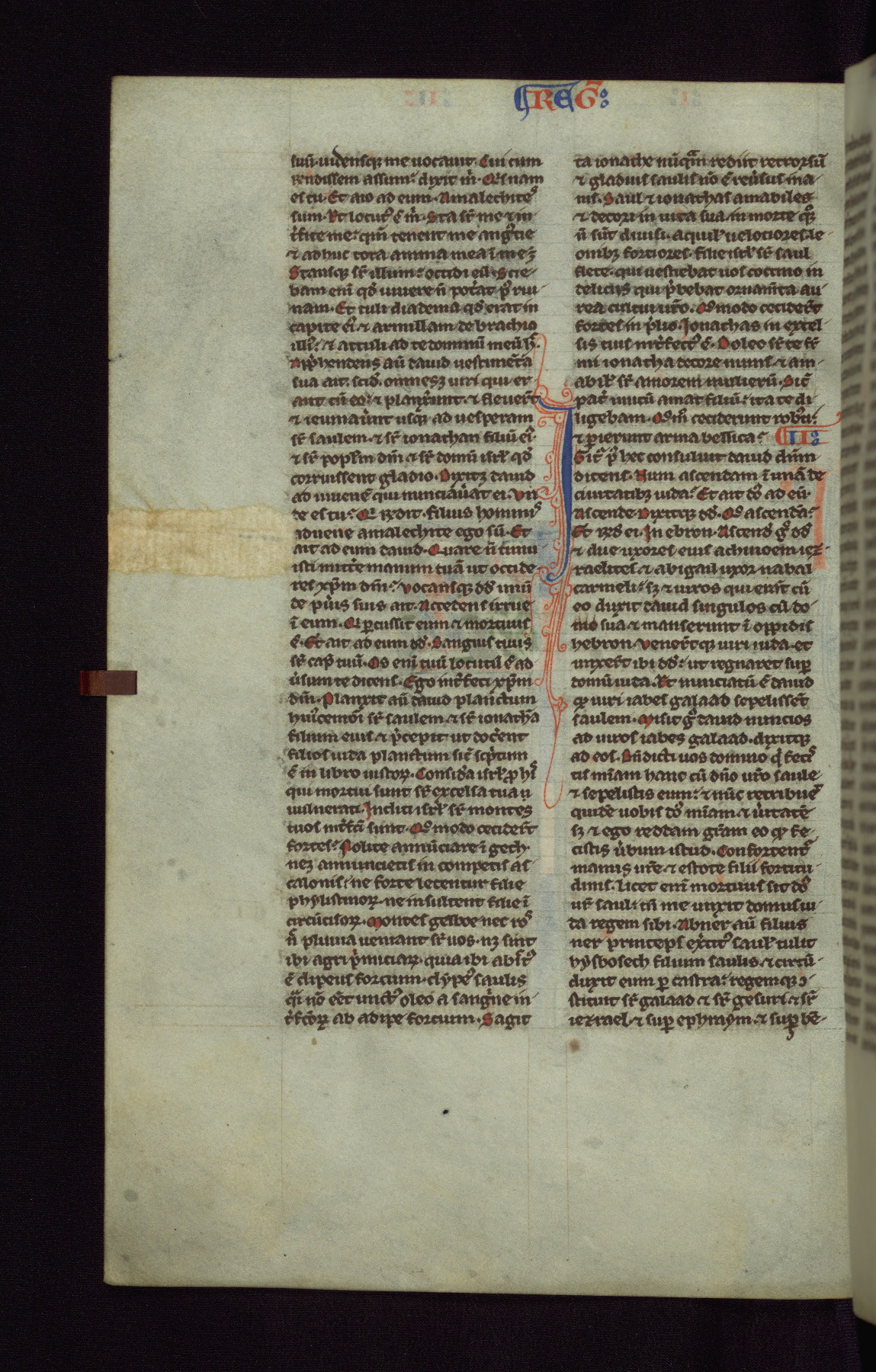 This pocket-size Bible was created around the middle of the thirteenth century in England. It contains the Vulgate text of the Old and New Testaments, arranged in order and divided into chapters. Such Bibles, designed for individual rather than institutional use, began to be created on a large scale during the thirteenth century, especially in Paris. This manuscript is illuminated with a large number of small historiated initials, and also includes a somewhat later image of the Three Living and the Three Dead, a popular scene based on a French poem of the same century.