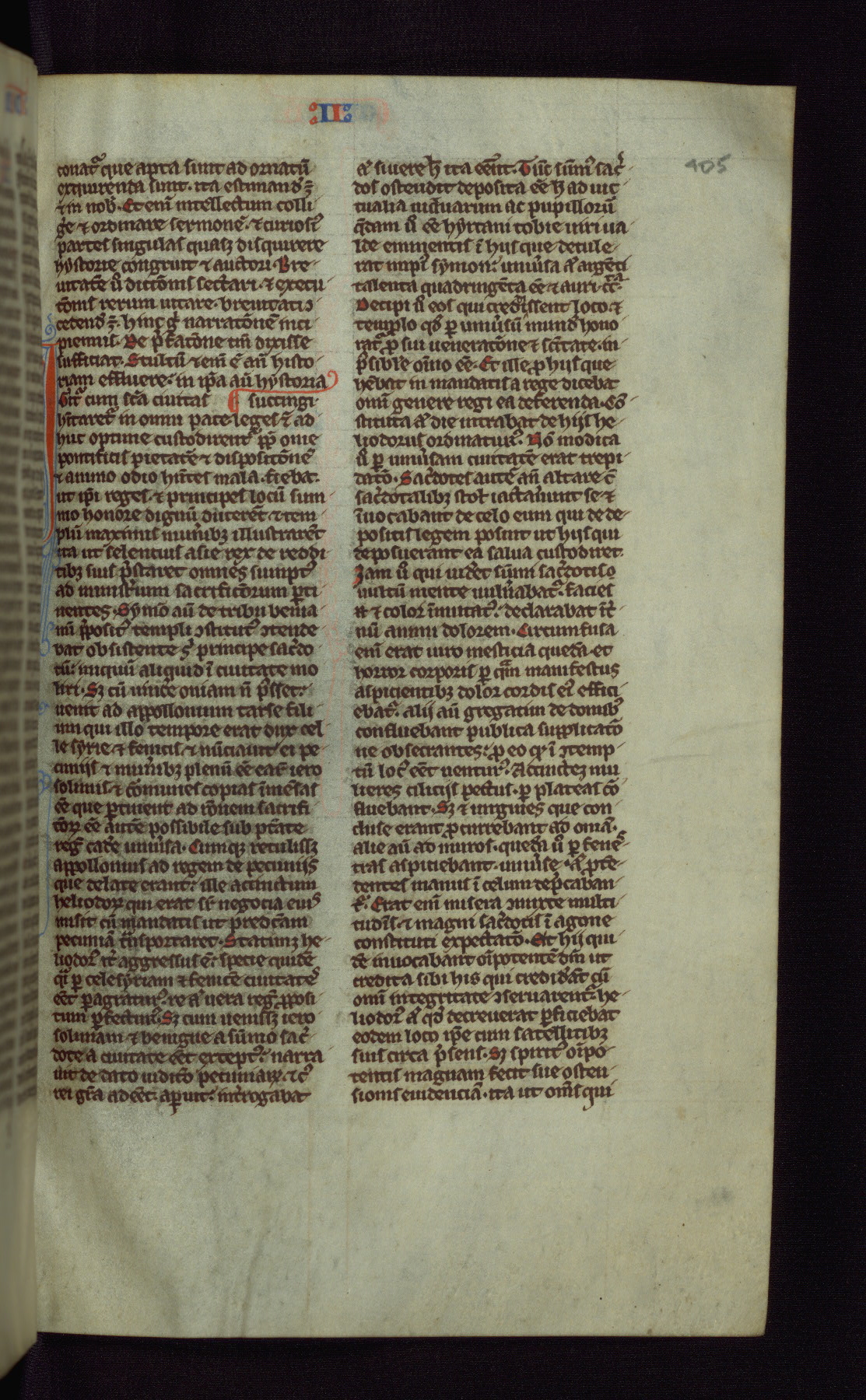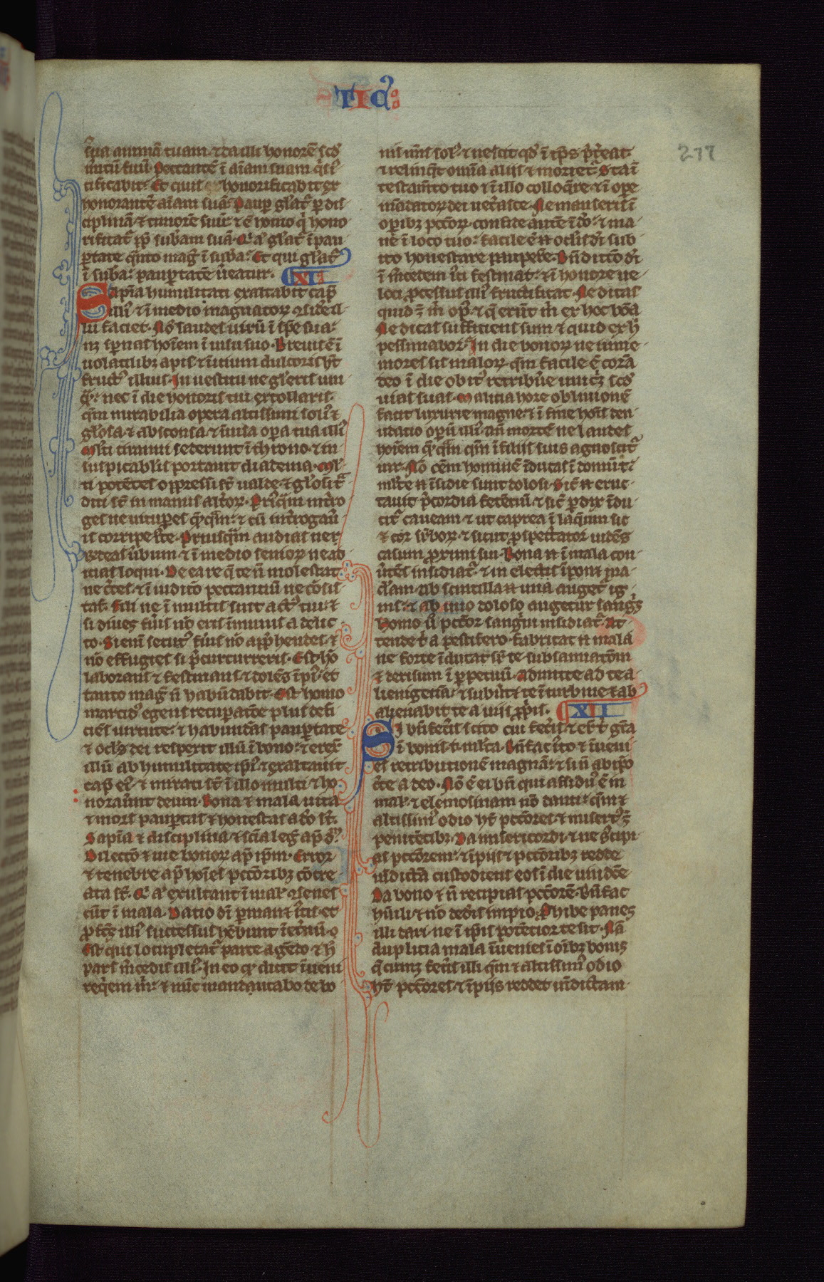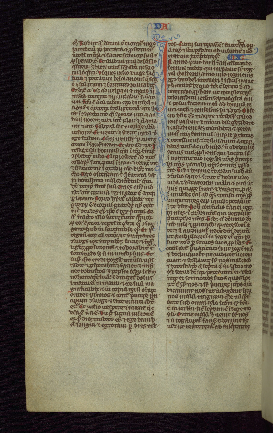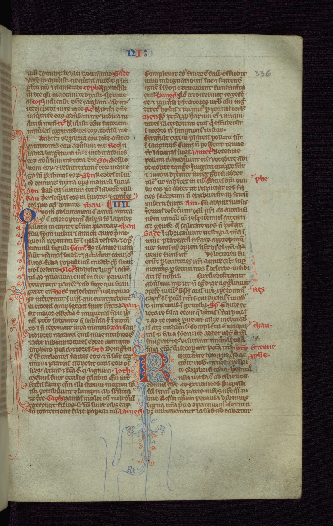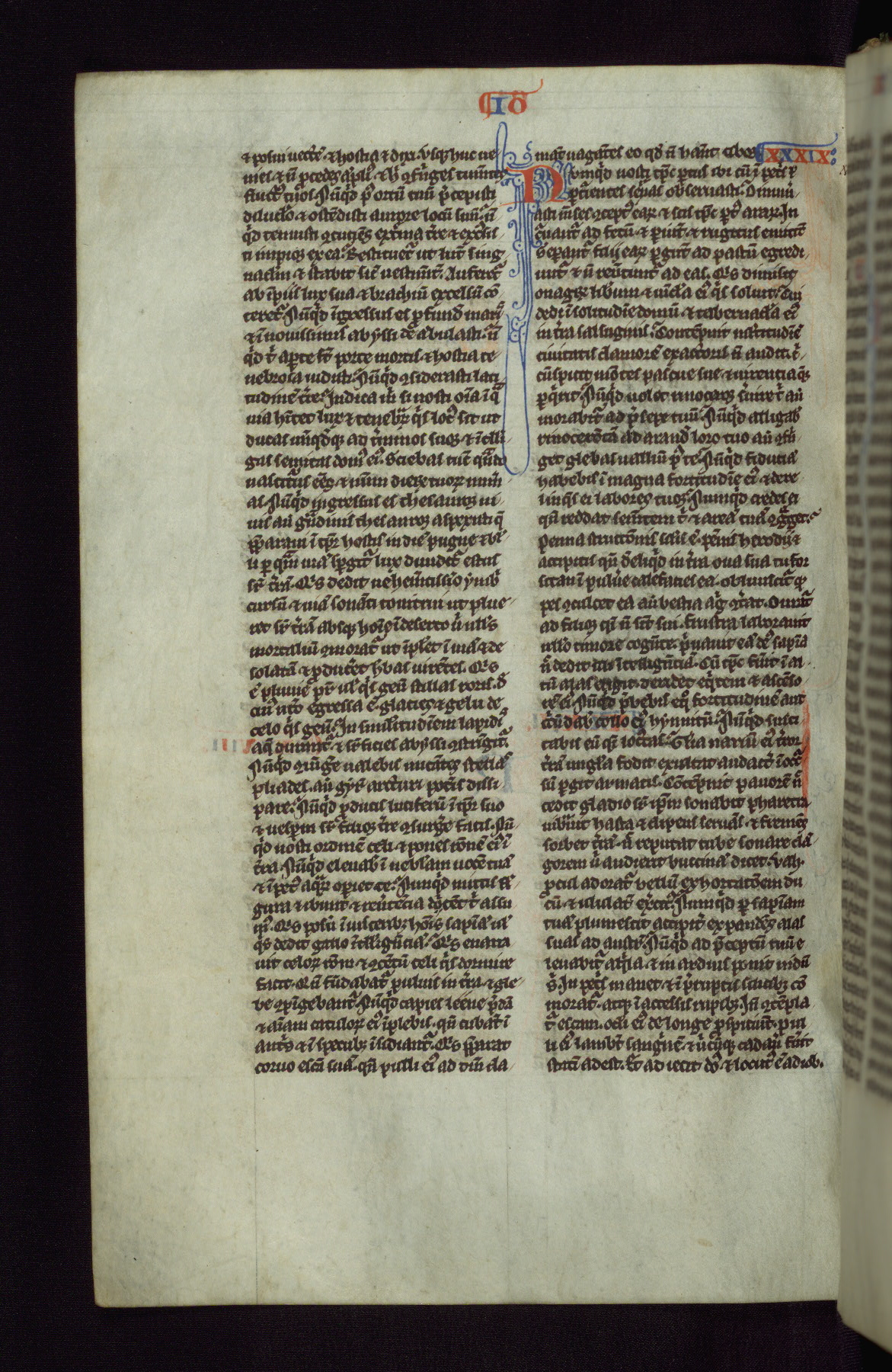 This pocket-size Bible was created around the middle of the thirteenth century in England. It contains the Vulgate text of the Old and New Testaments, arranged in order and divided into chapters. Such Bibles, designed for individual rather than institutional use, began to be created on a large scale during the thirteenth century, especially in Paris. This manuscript is illuminated with a large number of small historiated initials, and also includes a somewhat later image of the Three Living and the Three Dead, a popular scene based on a French poem of the same century.