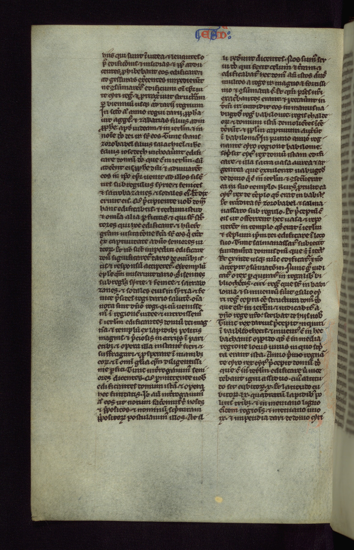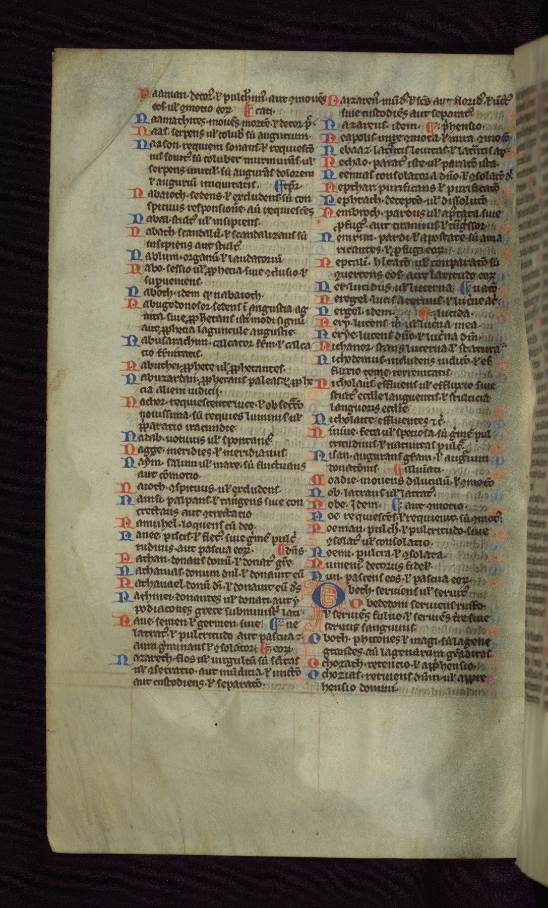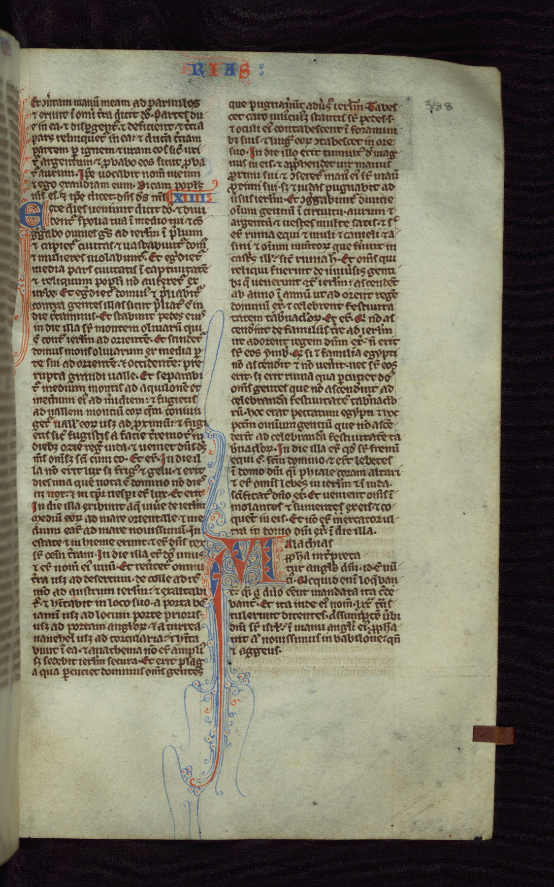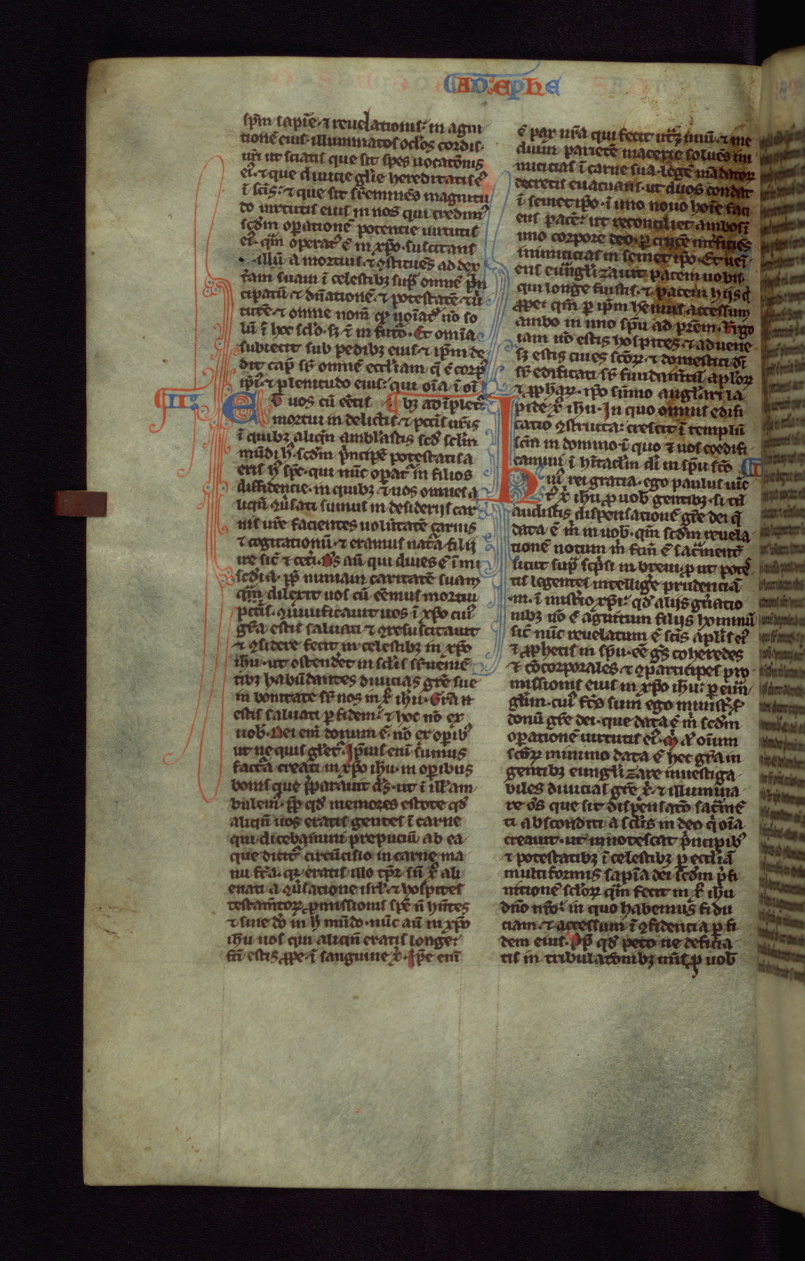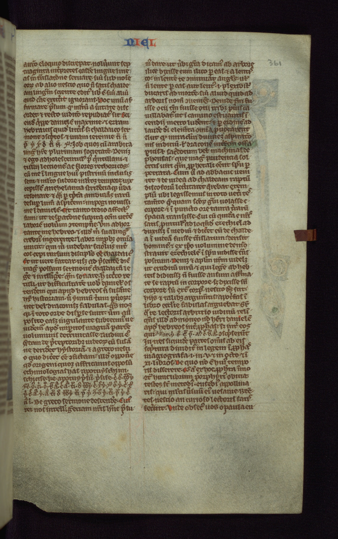 This pocket-size Bible was created around the middle of the thirteenth century in England. It contains the Vulgate text of the Old and New Testaments, arranged in order and divided into chapters. Such Bibles, designed for individual rather than institutional use, began to be created on a large scale during the thirteenth century, especially in Paris. This manuscript is illuminated with a large number of small historiated initials, and also includes a somewhat later image of the Three Living and the Three Dead, a popular scene based on a French poem of the same century.