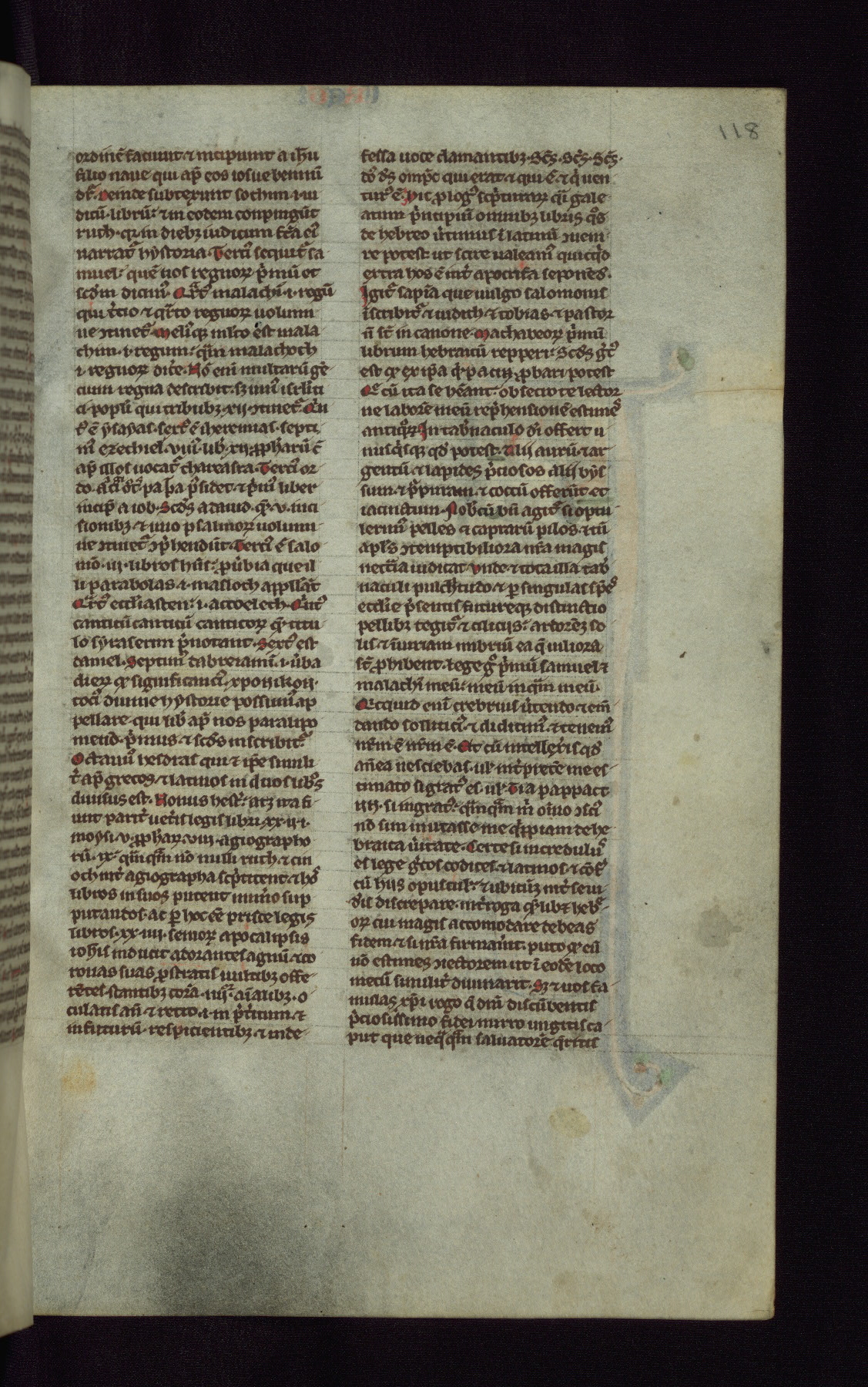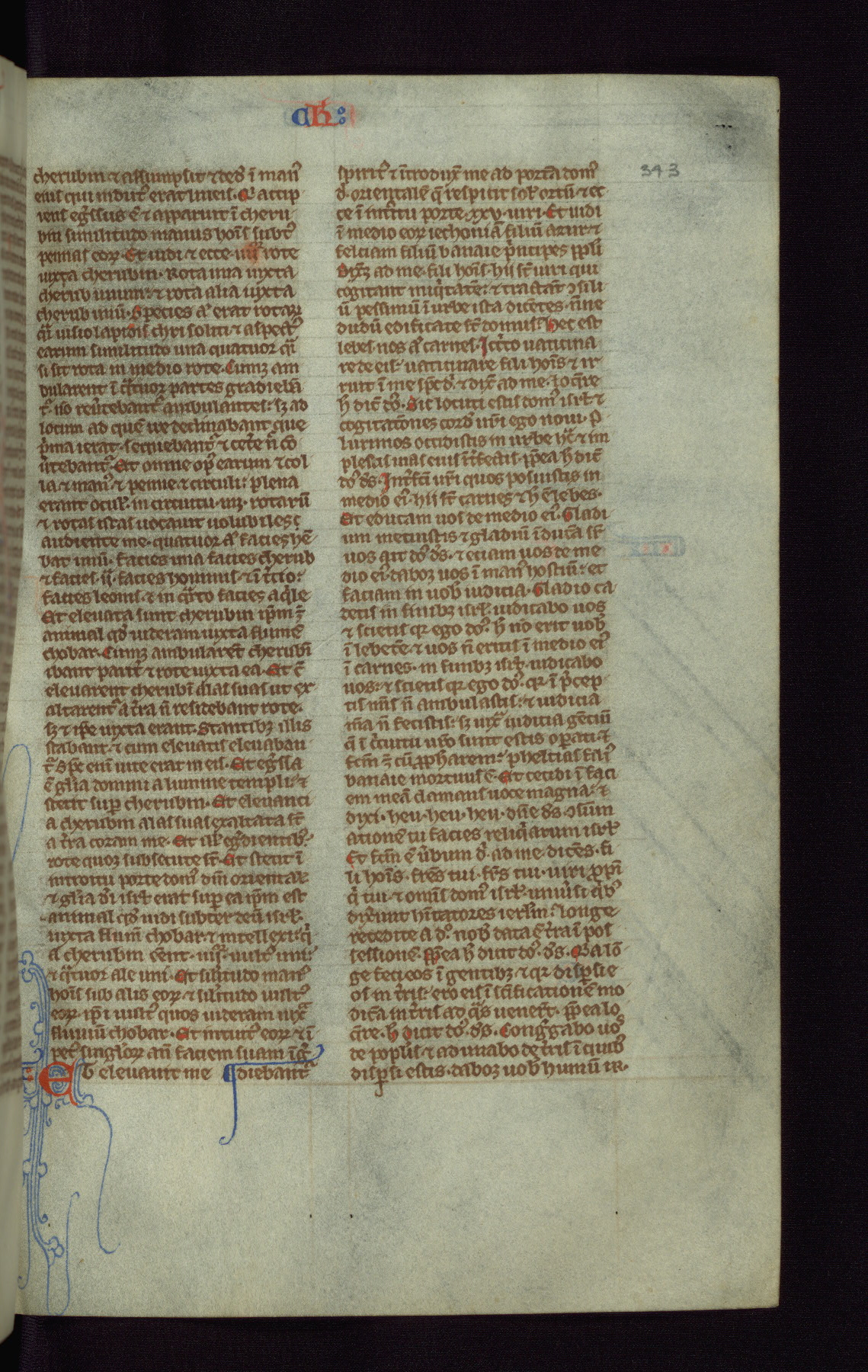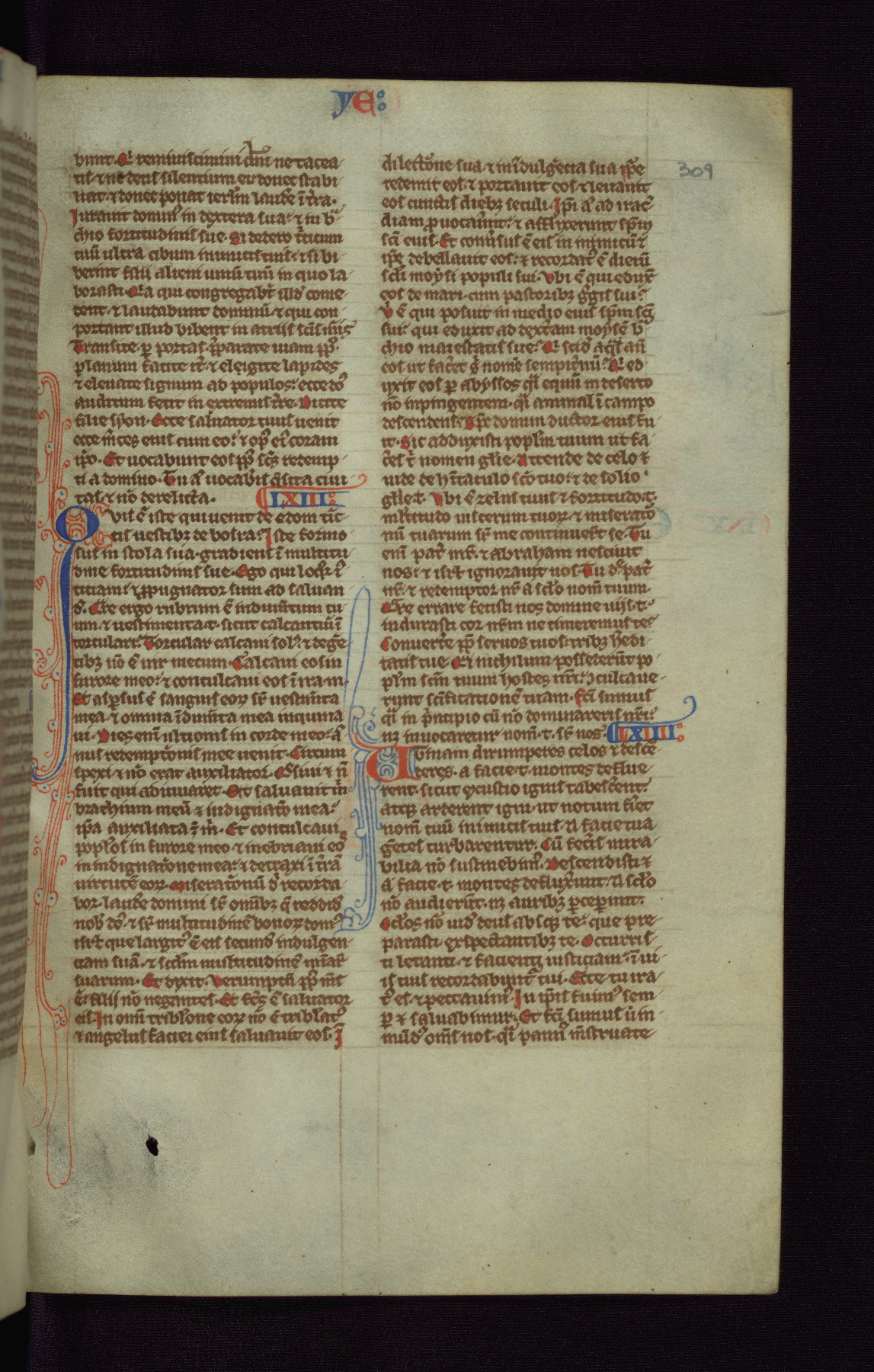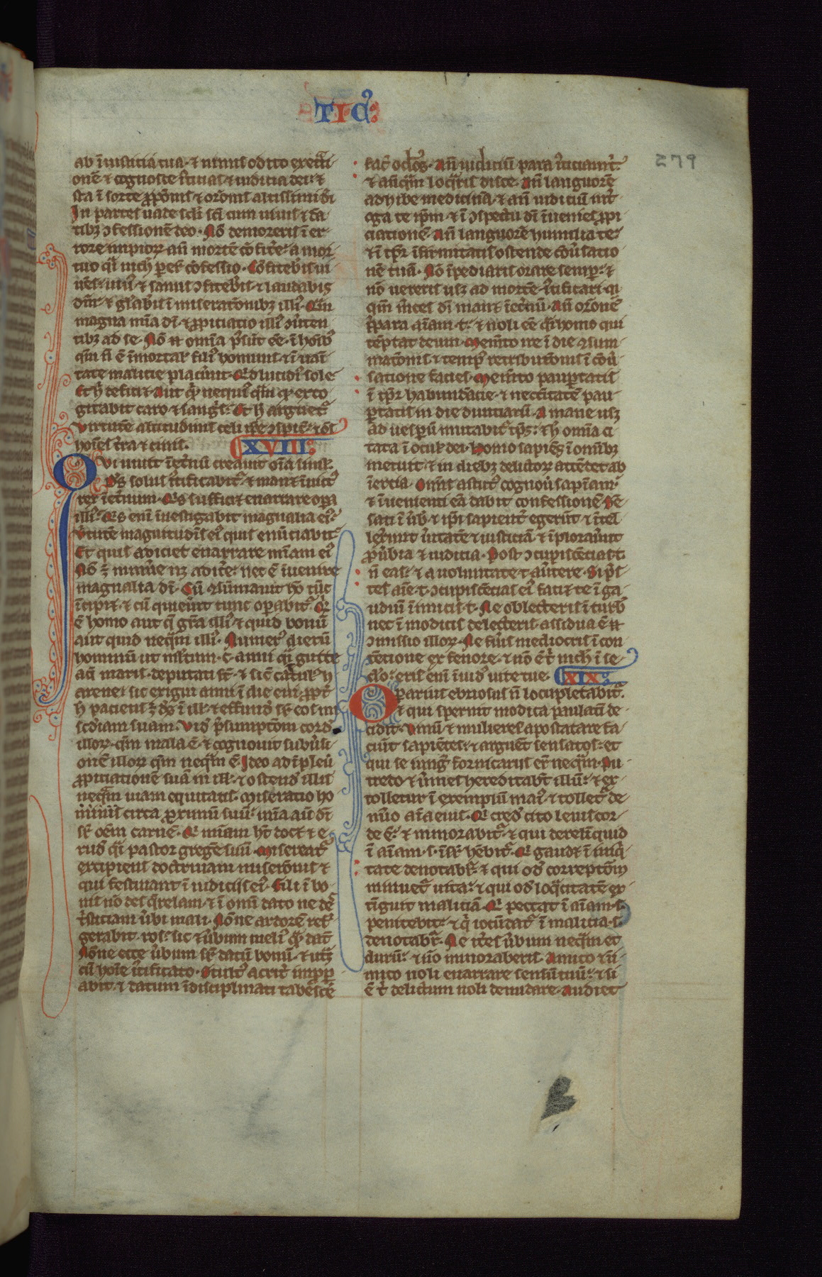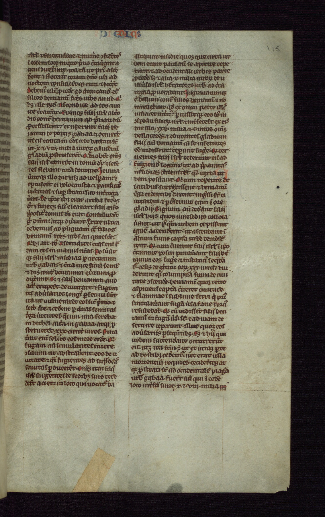 This pocket-size Bible was created around the middle of the thirteenth century in England. It contains the Vulgate text of the Old and New Testaments, arranged in order and divided into chapters. Such Bibles, designed for individual rather than institutional use, began to be created on a large scale during the thirteenth century, especially in Paris. This manuscript is illuminated with a large number of small historiated initials, and also includes a somewhat later image of the Three Living and the Three Dead, a popular scene based on a French poem of the same century.