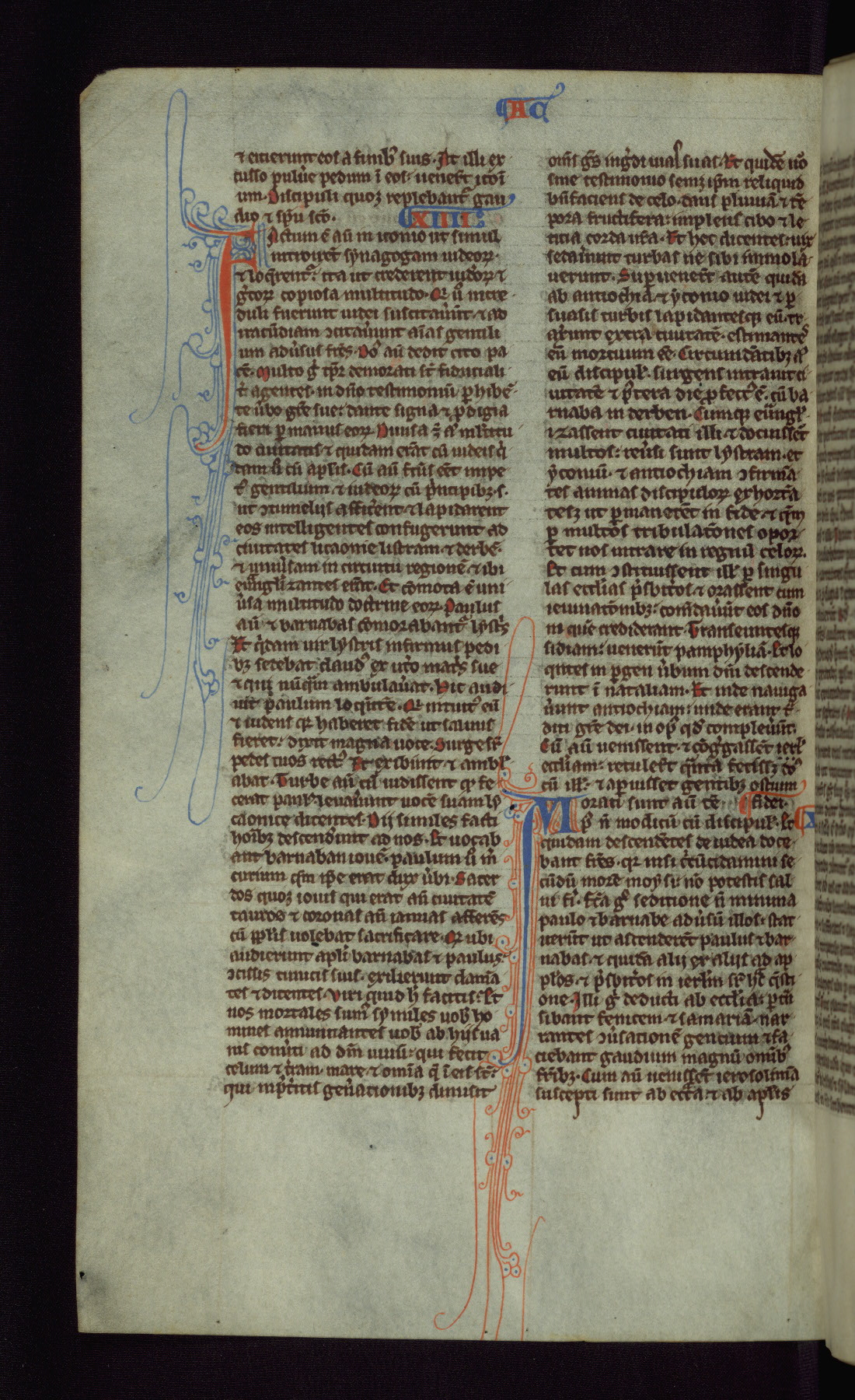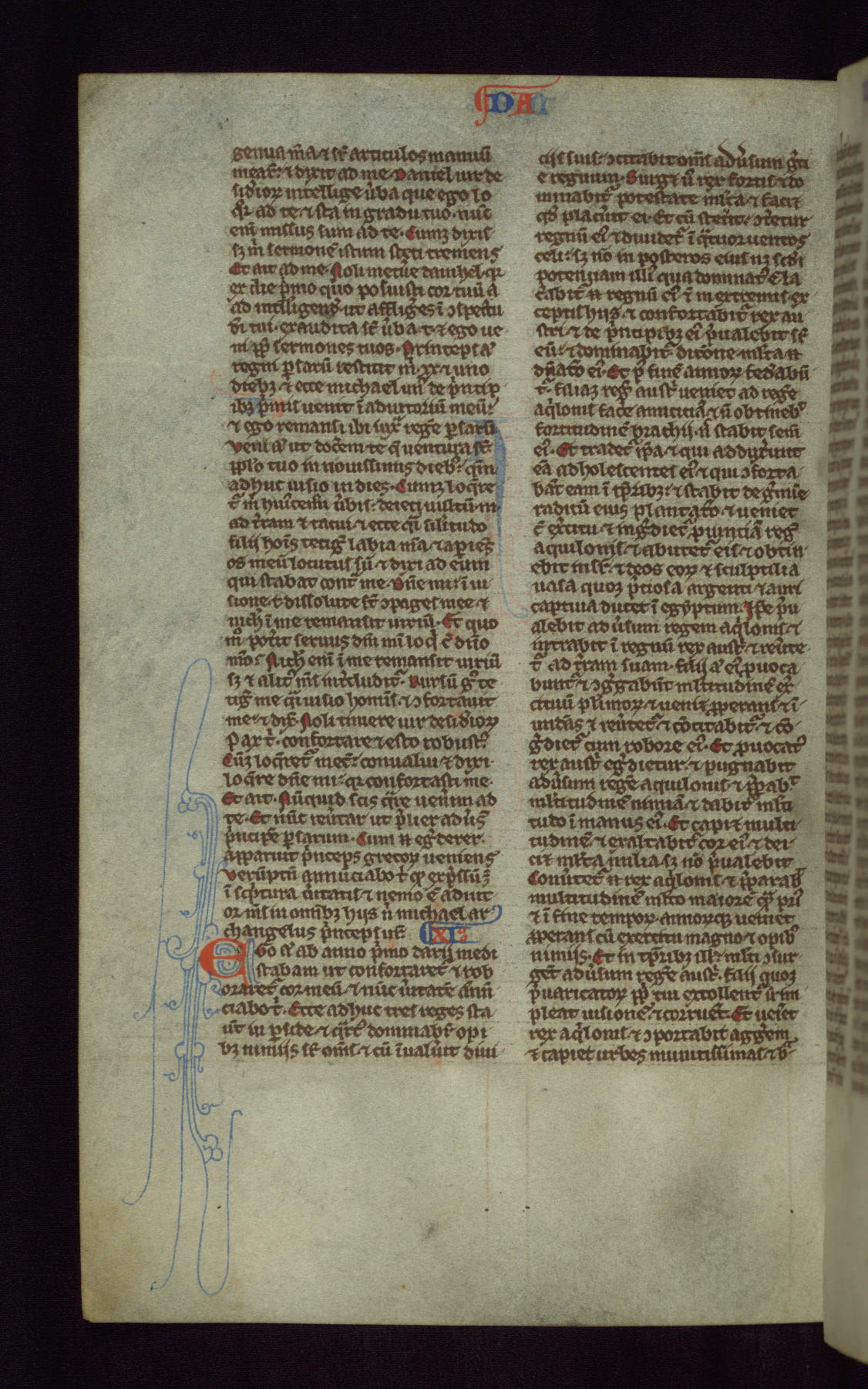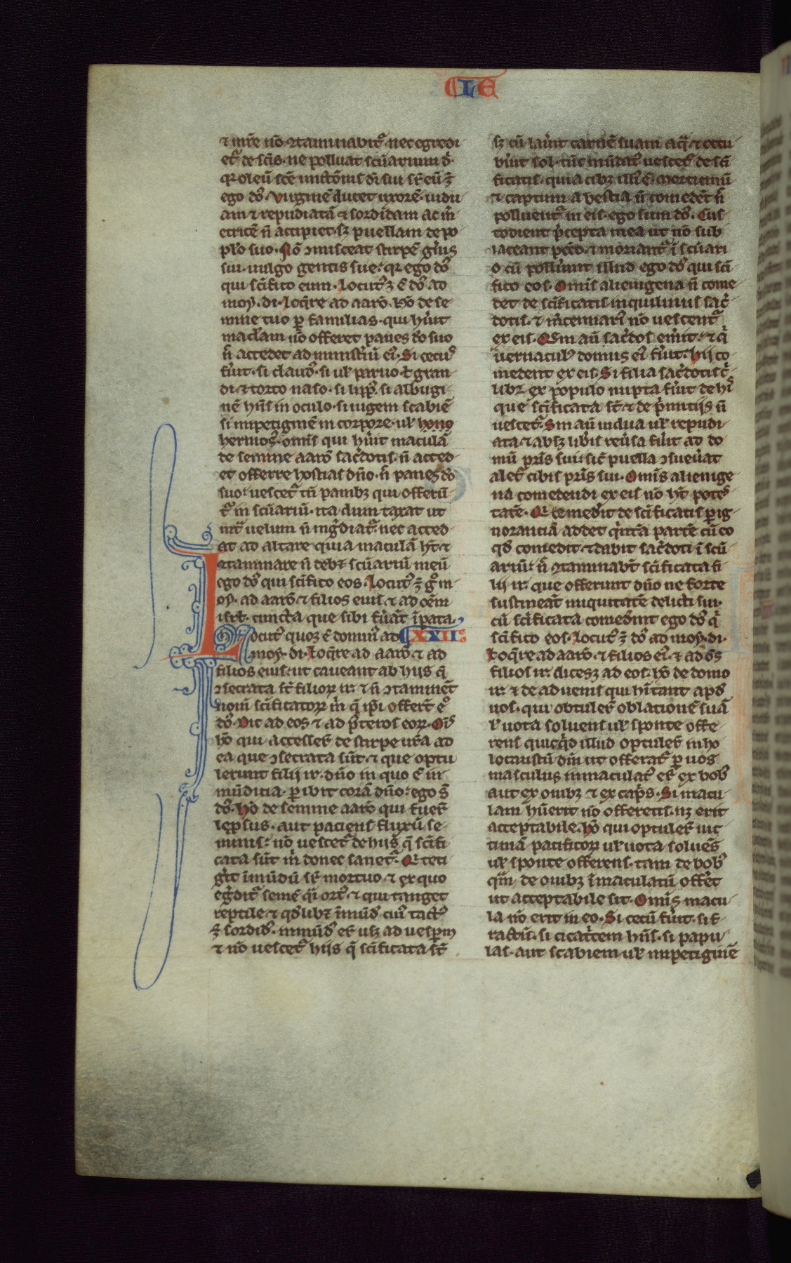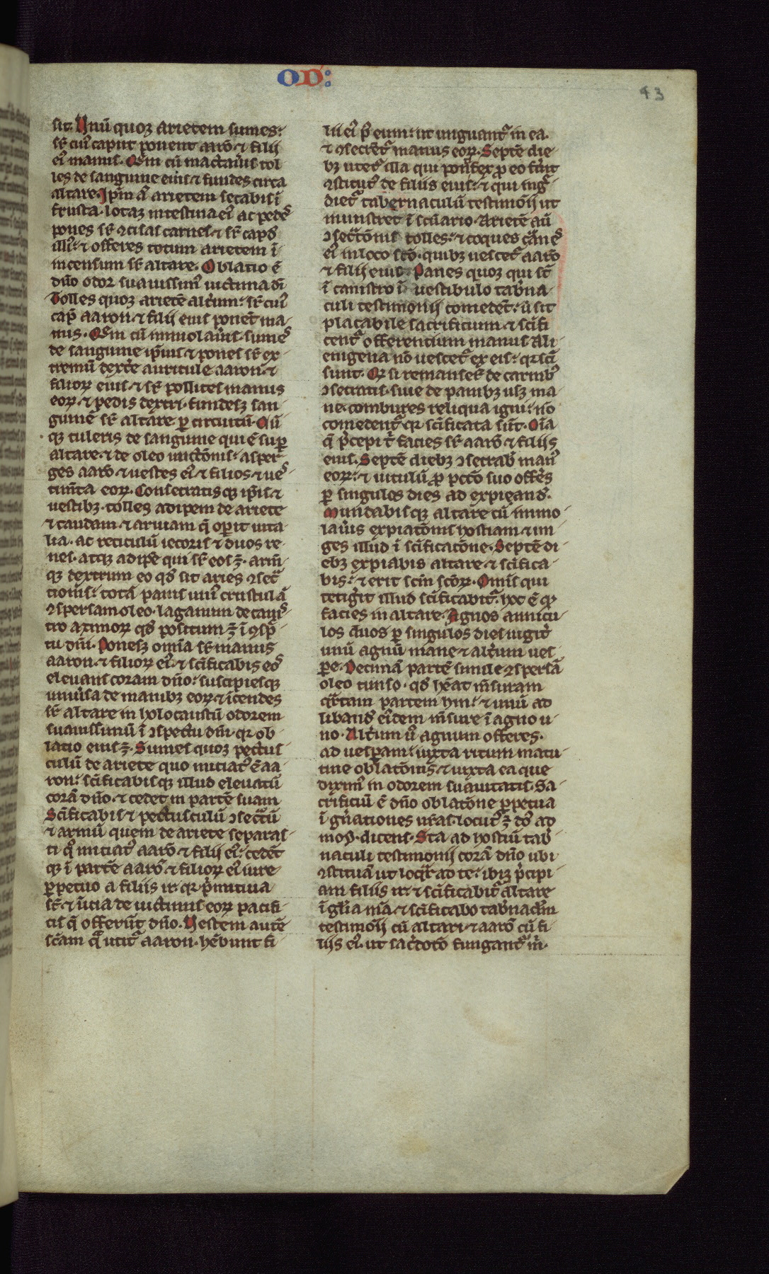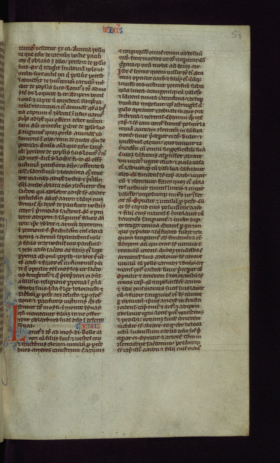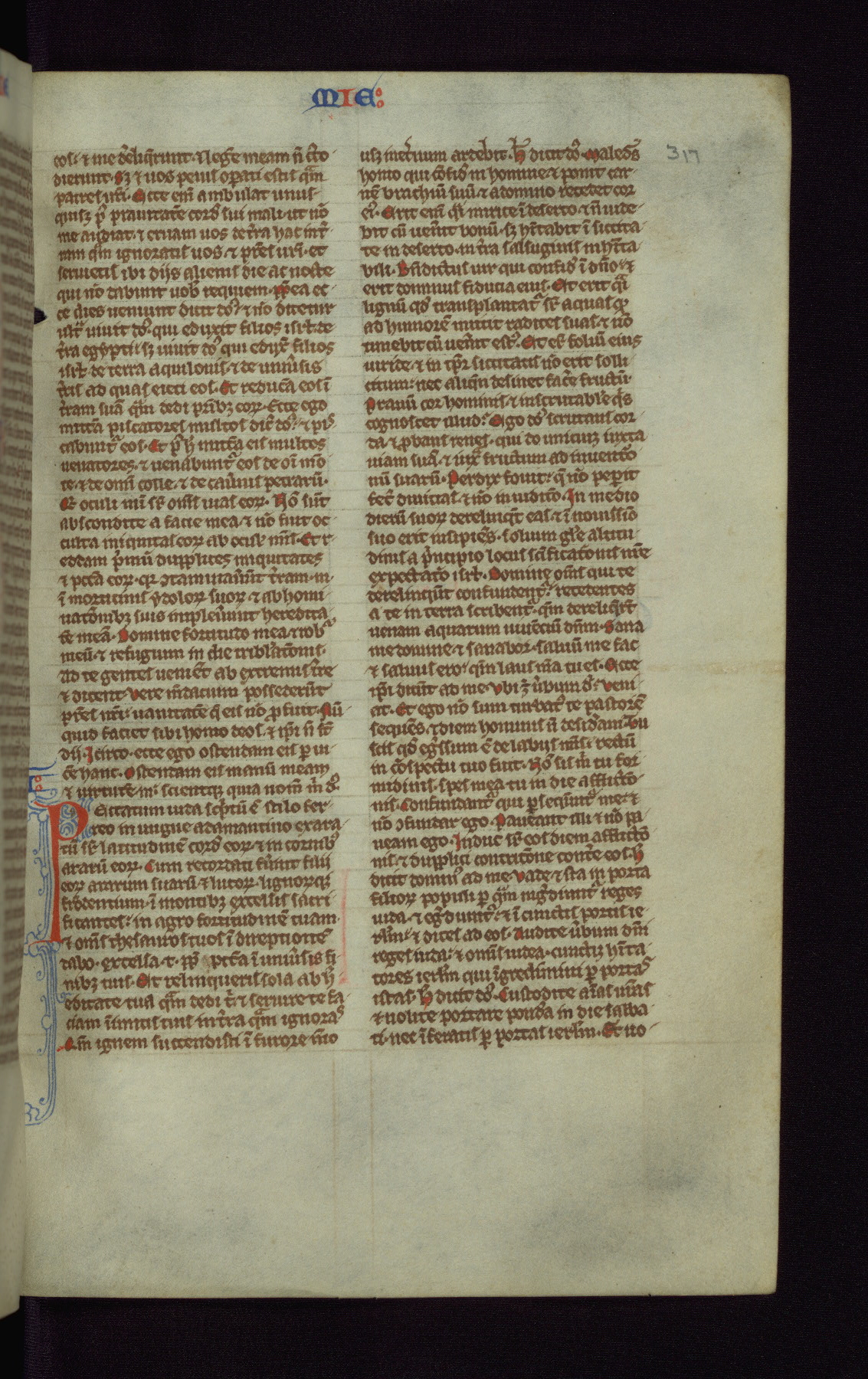 This pocket-size Bible was created around the middle of the thirteenth century in England. It contains the Vulgate text of the Old and New Testaments, arranged in order and divided into chapters. Such Bibles, designed for individual rather than institutional use, began to be created on a large scale during the thirteenth century, especially in Paris. This manuscript is illuminated with a large number of small historiated initials, and also includes a somewhat later image of the Three Living and the Three Dead, a popular scene based on a French poem of the same century.