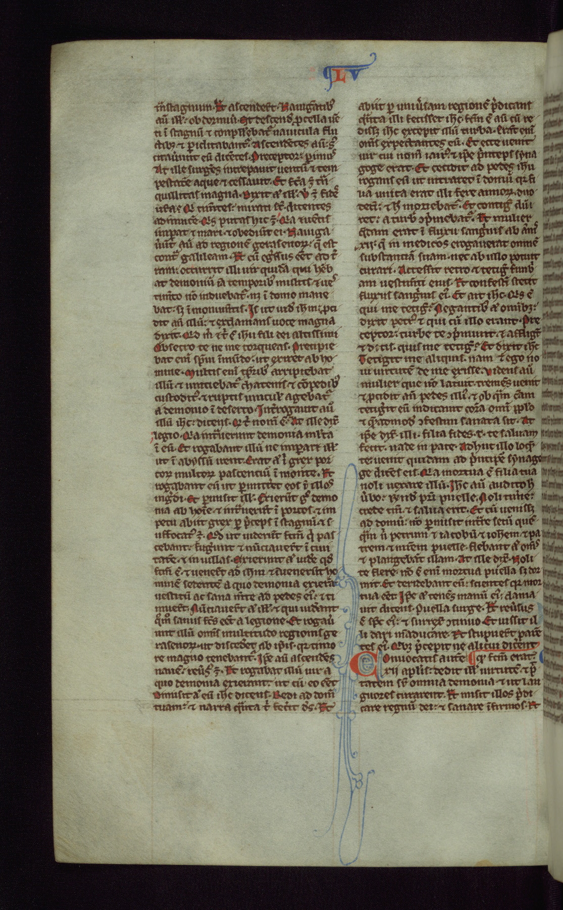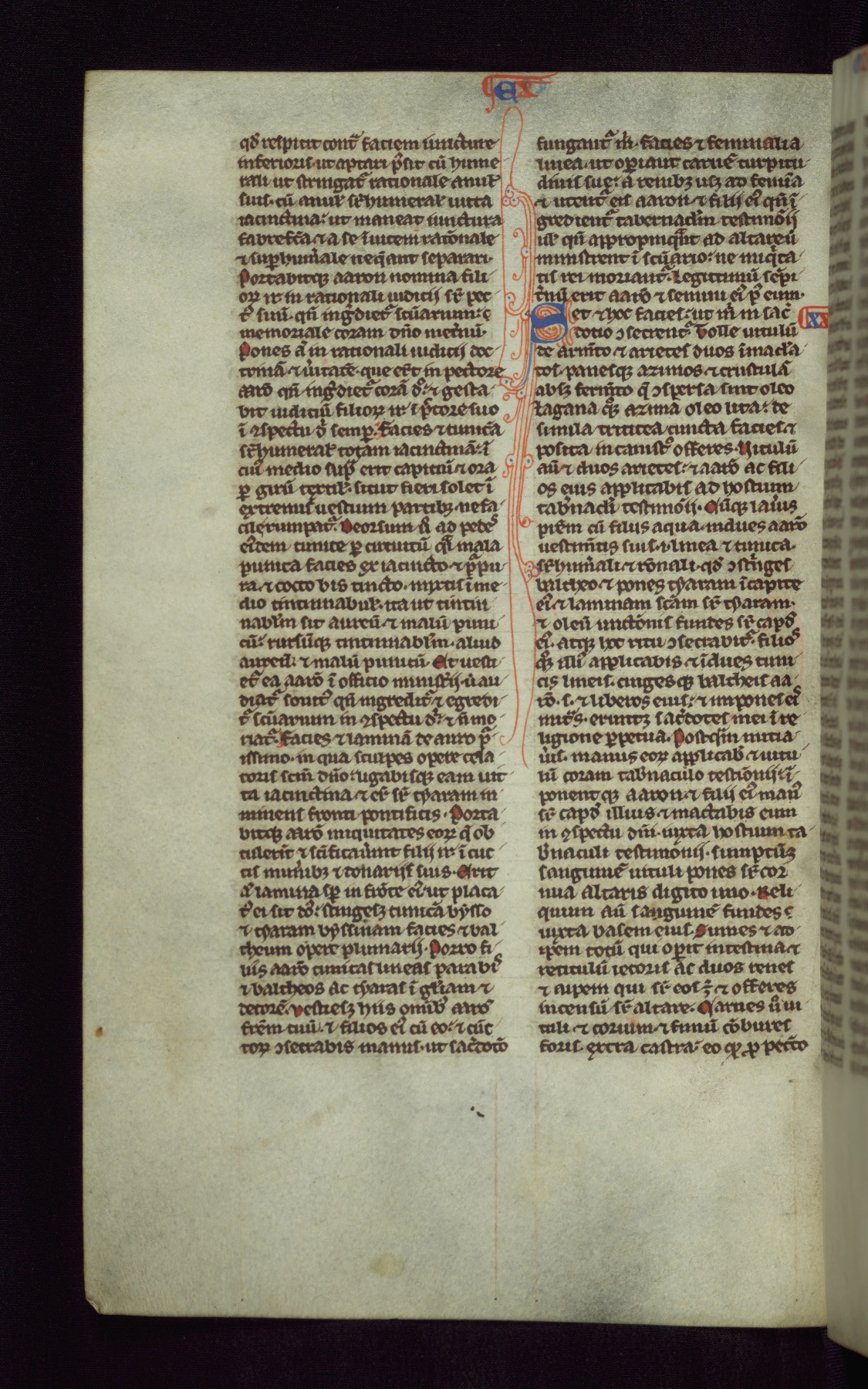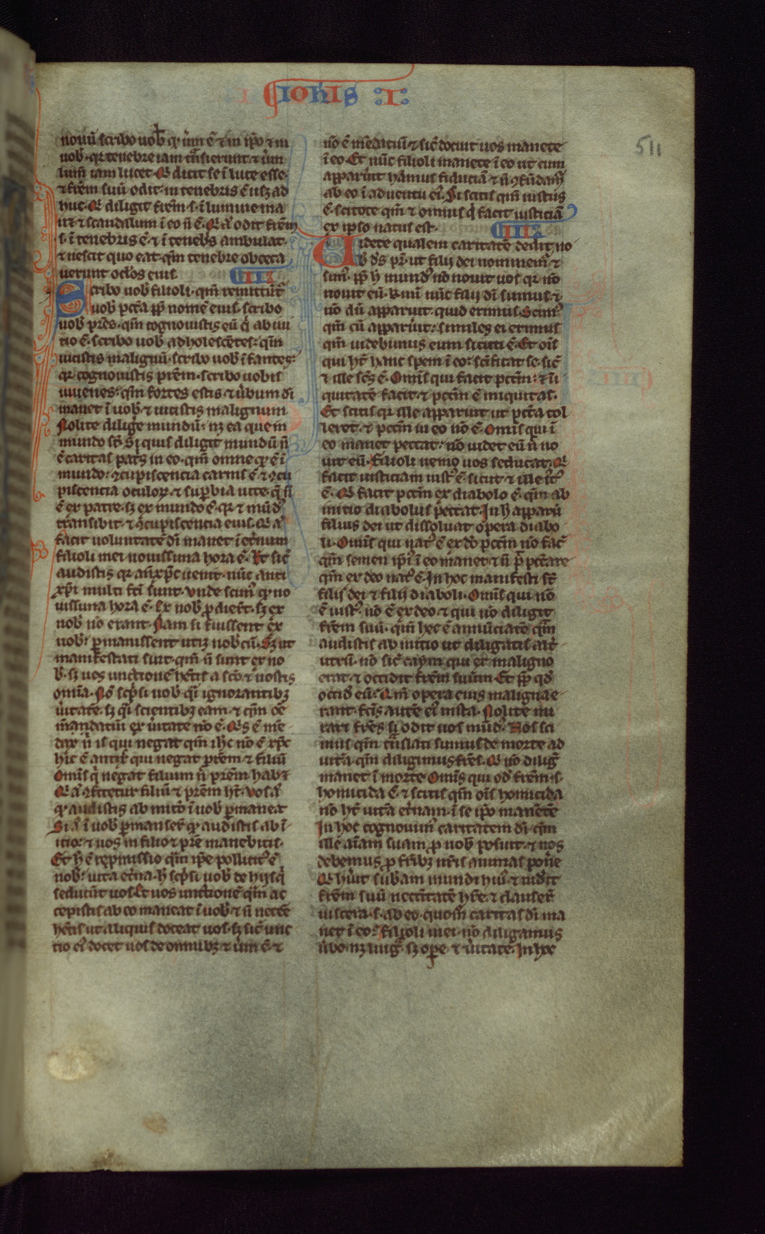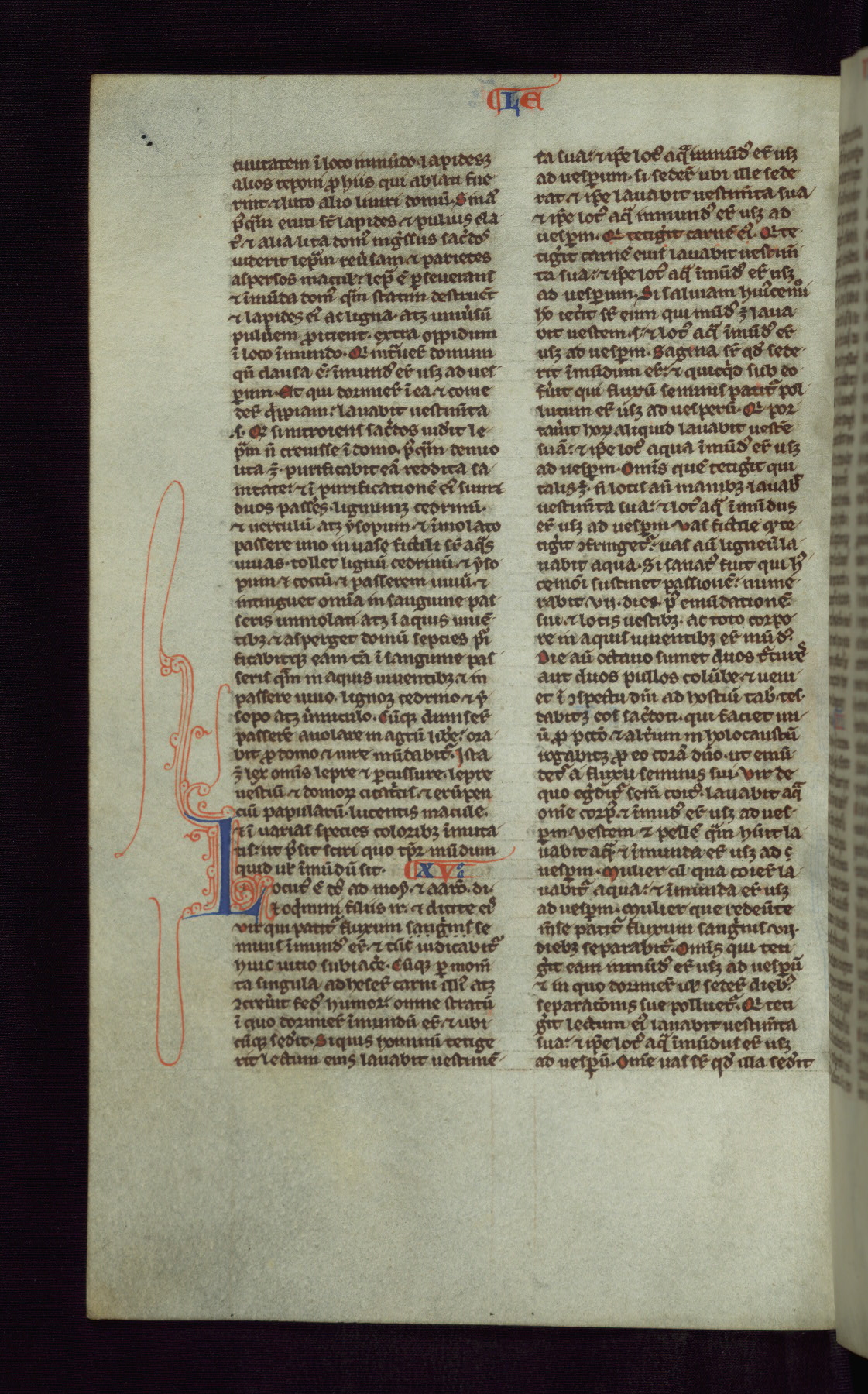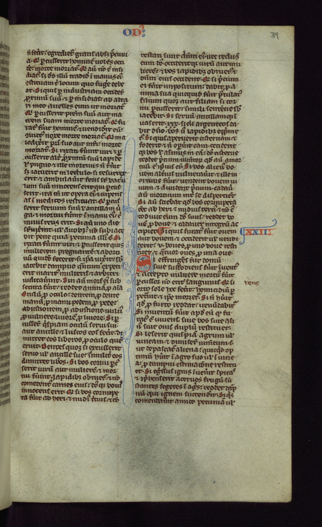 This pocket-size Bible was created around the middle of the thirteenth century in England. It contains the Vulgate text of the Old and New Testaments, arranged in order and divided into chapters. Such Bibles, designed for individual rather than institutional use, began to be created on a large scale during the thirteenth century, especially in Paris. This manuscript is illuminated with a large number of small historiated initials, and also includes a somewhat later image of the Three Living and the Three Dead, a popular scene based on a French poem of the same century.
