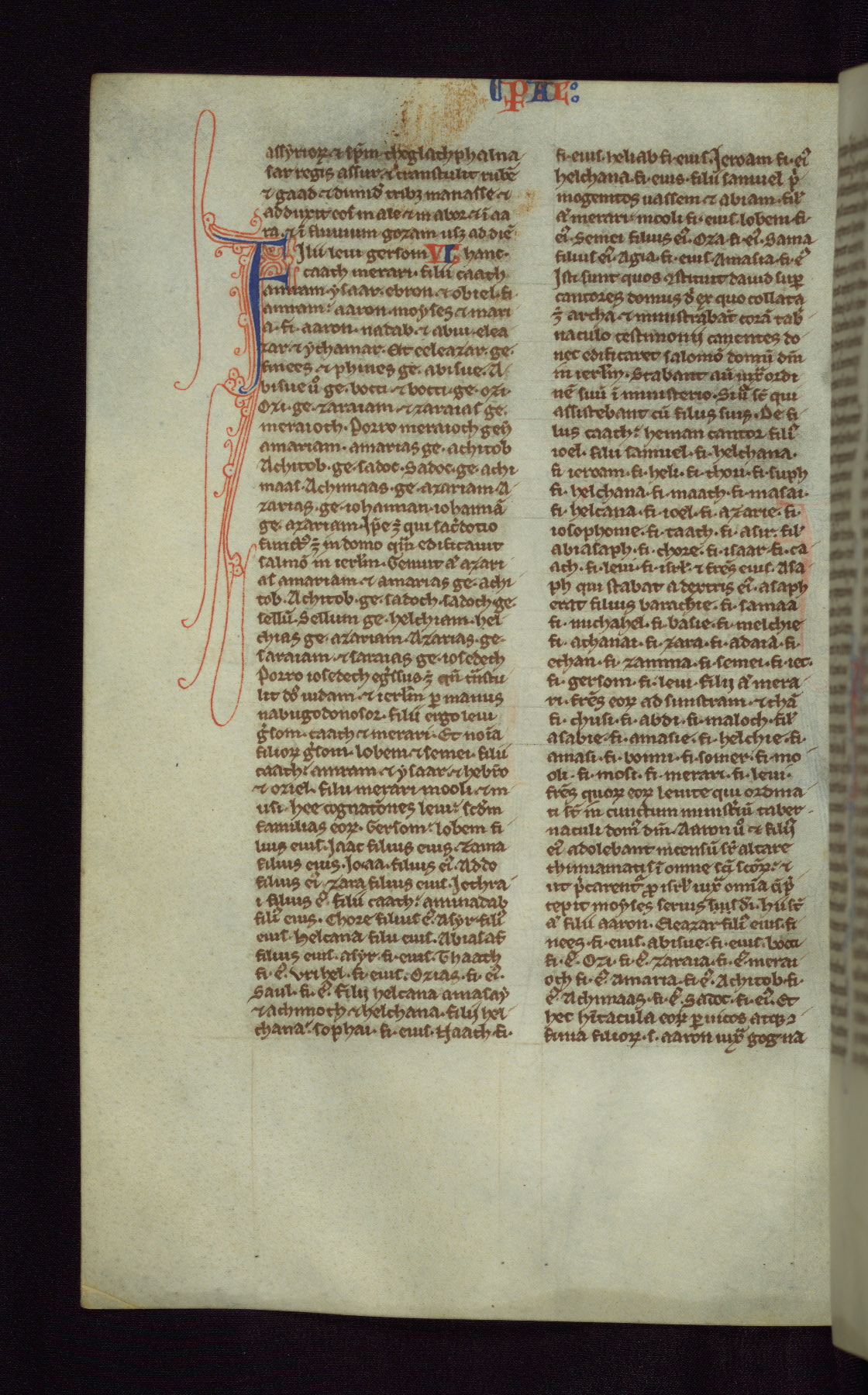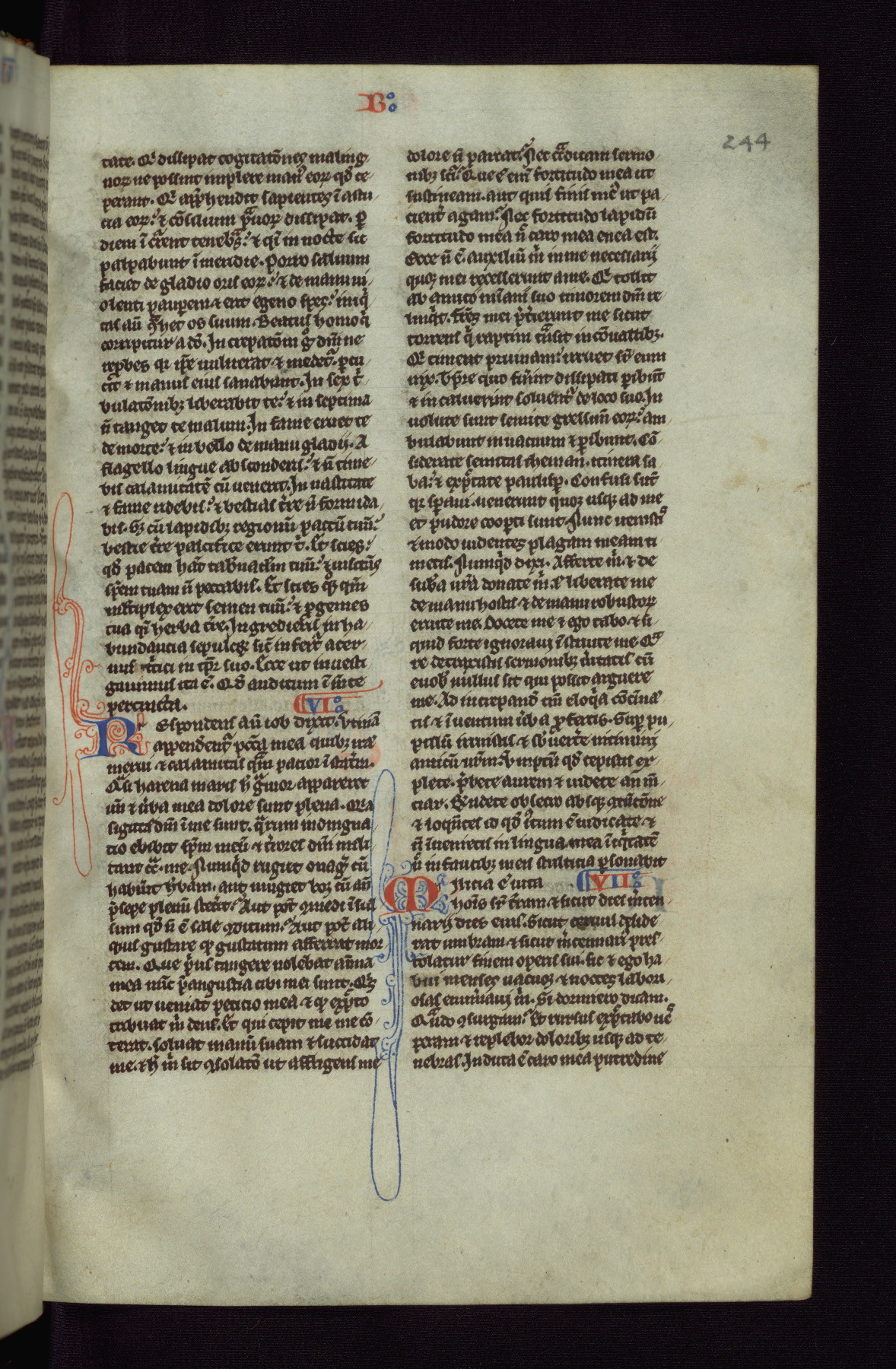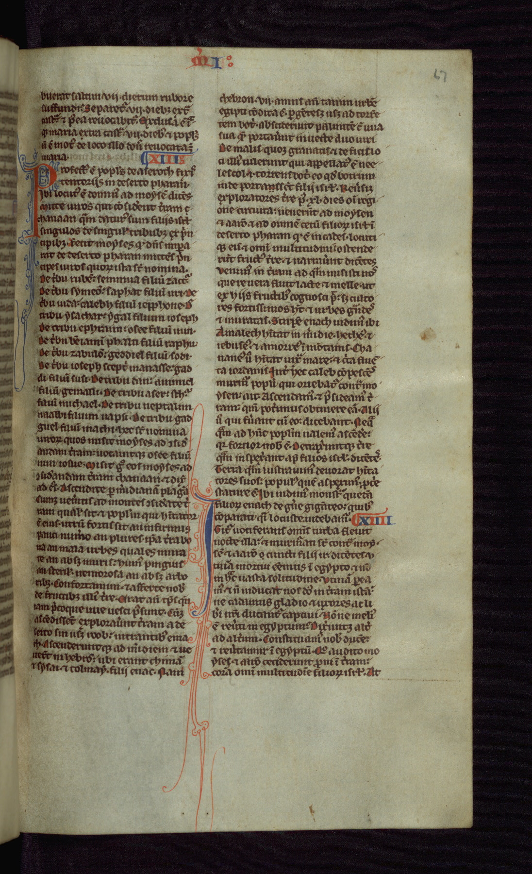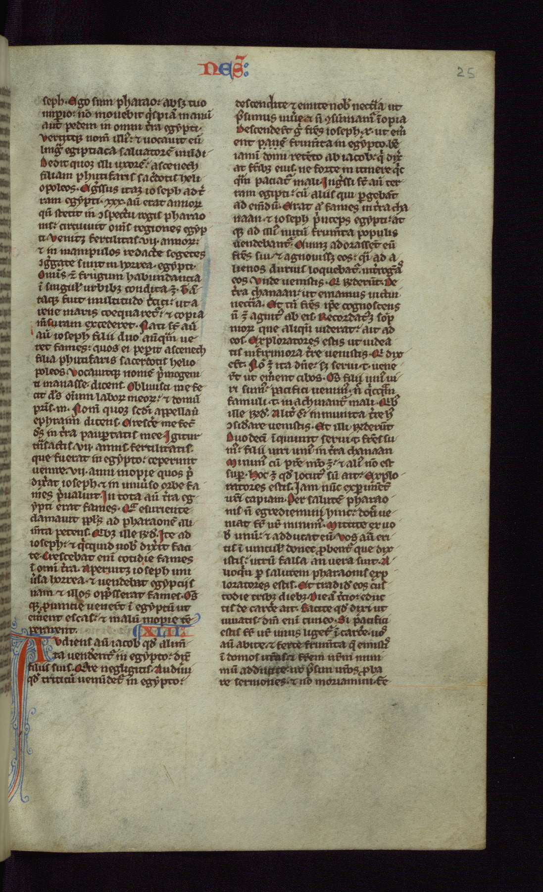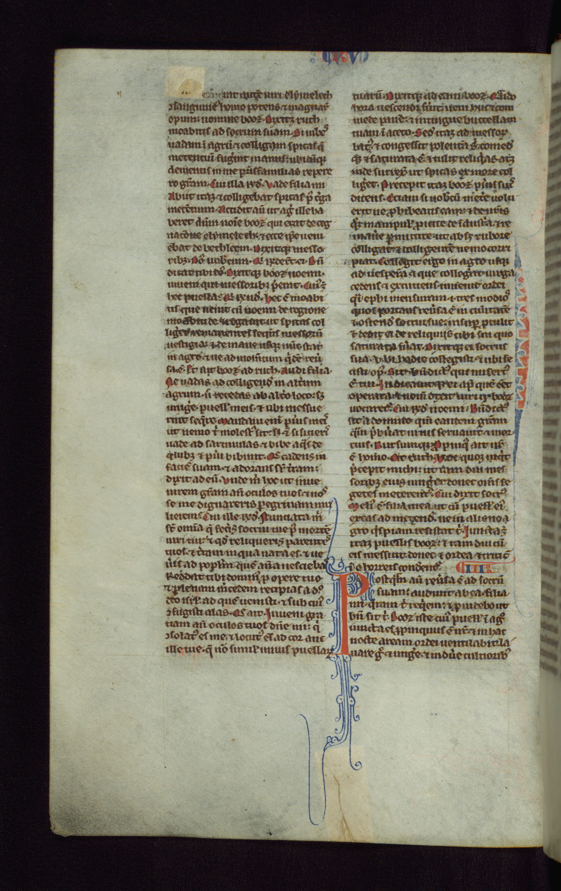 This pocket-size Bible was created around the middle of the thirteenth century in England. It contains the Vulgate text of the Old and New Testaments, arranged in order and divided into chapters. Such Bibles, designed for individual rather than institutional use, began to be created on a large scale during the thirteenth century, especially in Paris. This manuscript is illuminated with a large number of small historiated initials, and also includes a somewhat later image of the Three Living and the Three Dead, a popular scene based on a French poem of the same century.