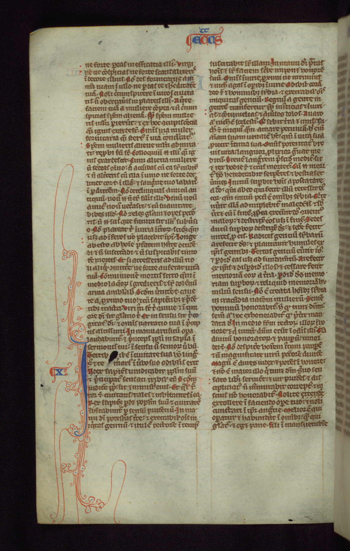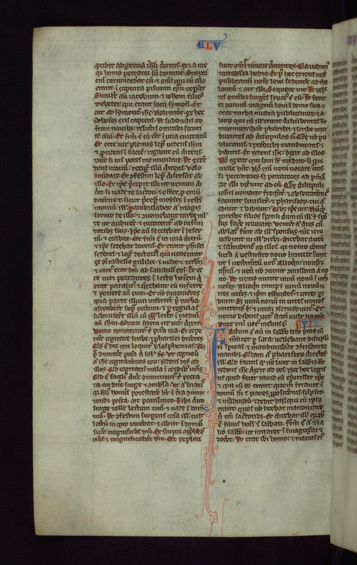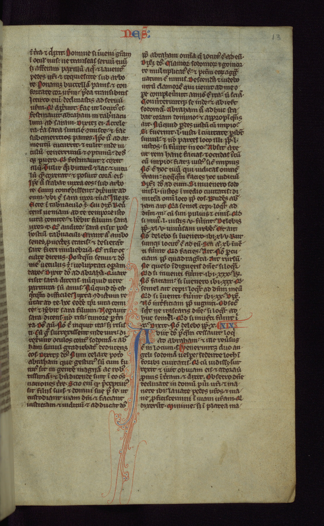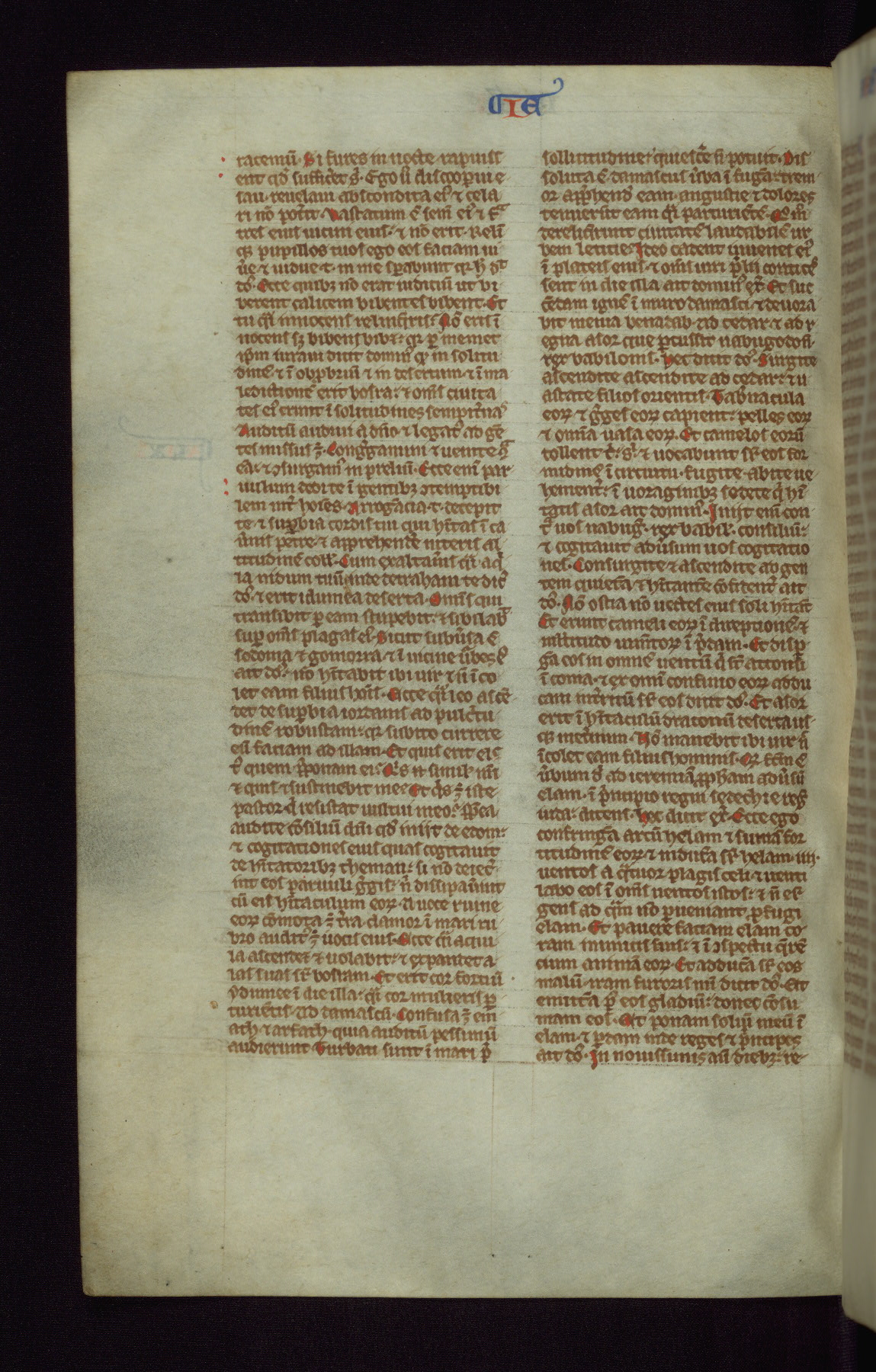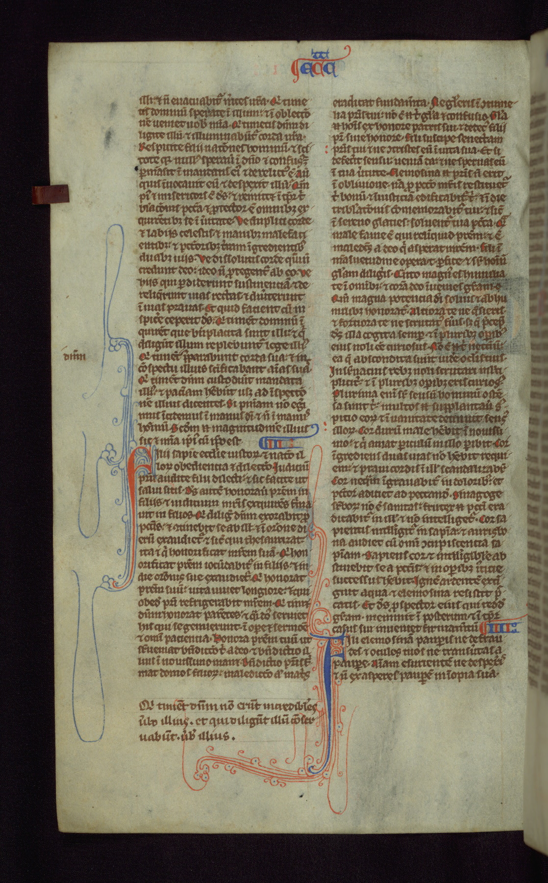 This pocket-size Bible was created around the middle of the thirteenth century in England. It contains the Vulgate text of the Old and New Testaments, arranged in order and divided into chapters. Such Bibles, designed for individual rather than institutional use, began to be created on a large scale during the thirteenth century, especially in Paris. This manuscript is illuminated with a large number of small historiated initials, and also includes a somewhat later image of the Three Living and the Three Dead, a popular scene based on a French poem of the same century.
