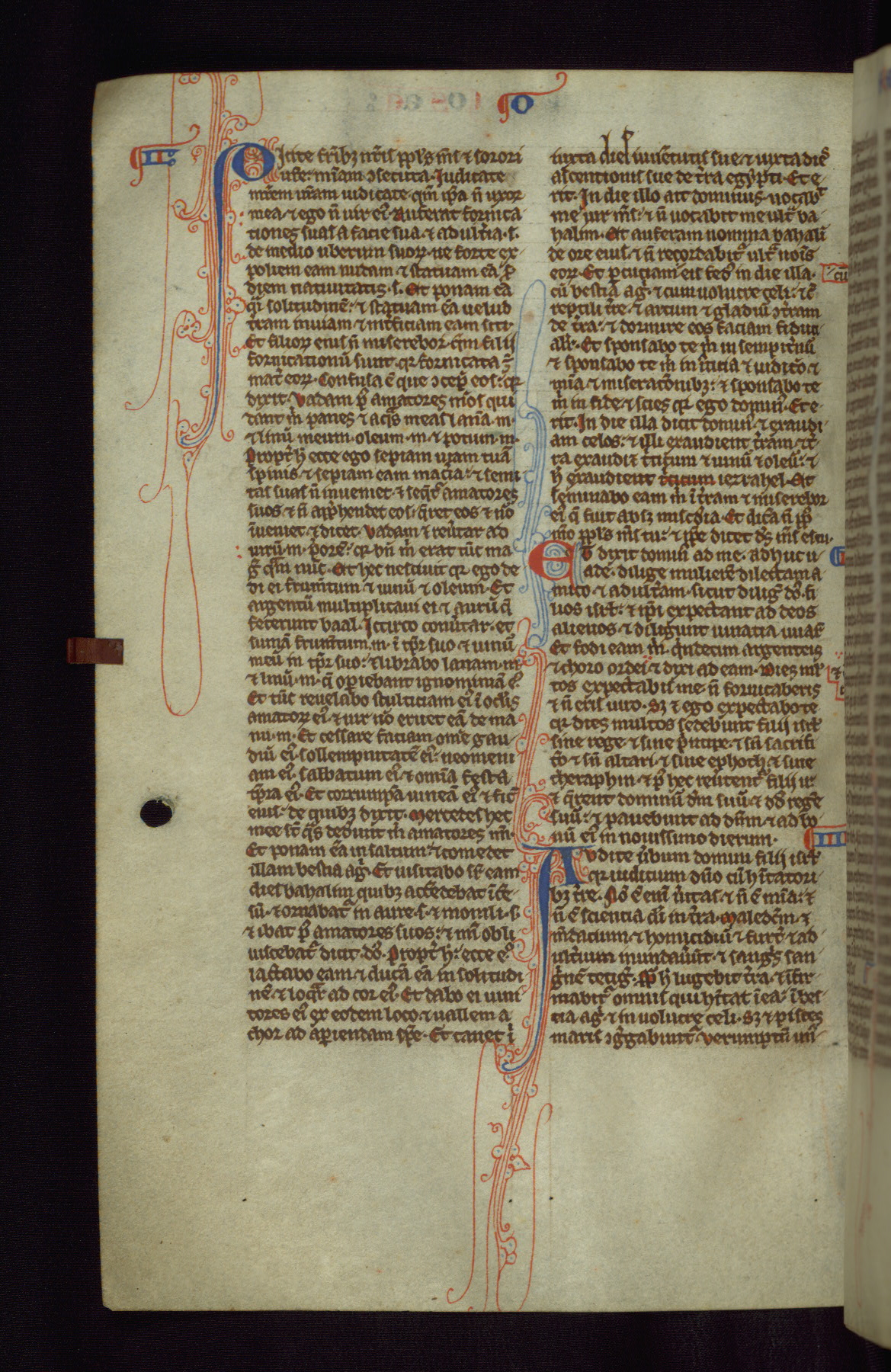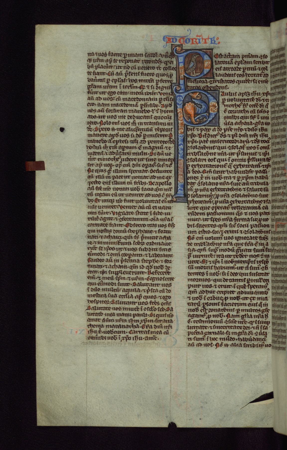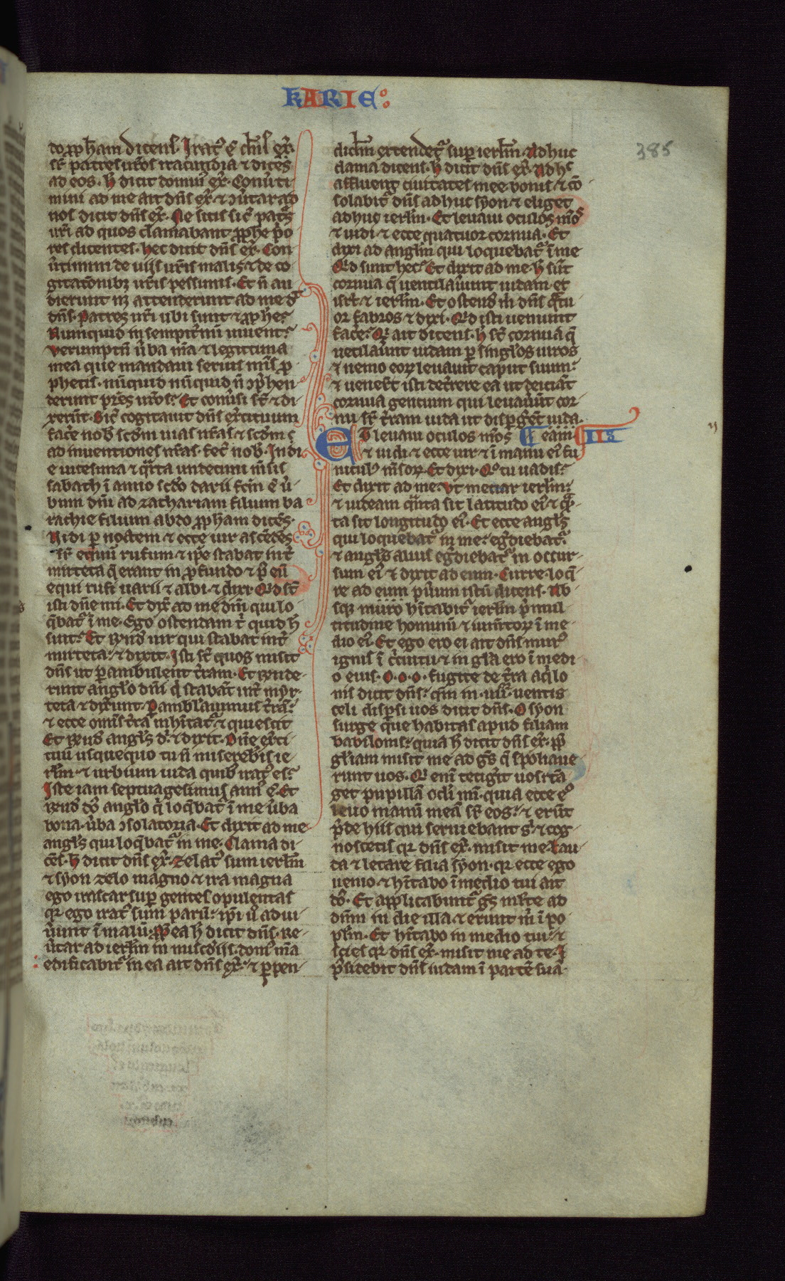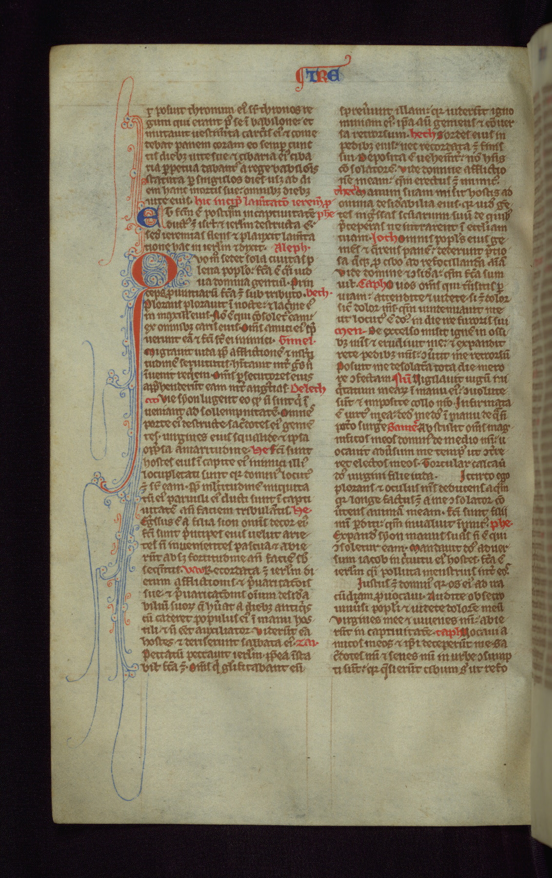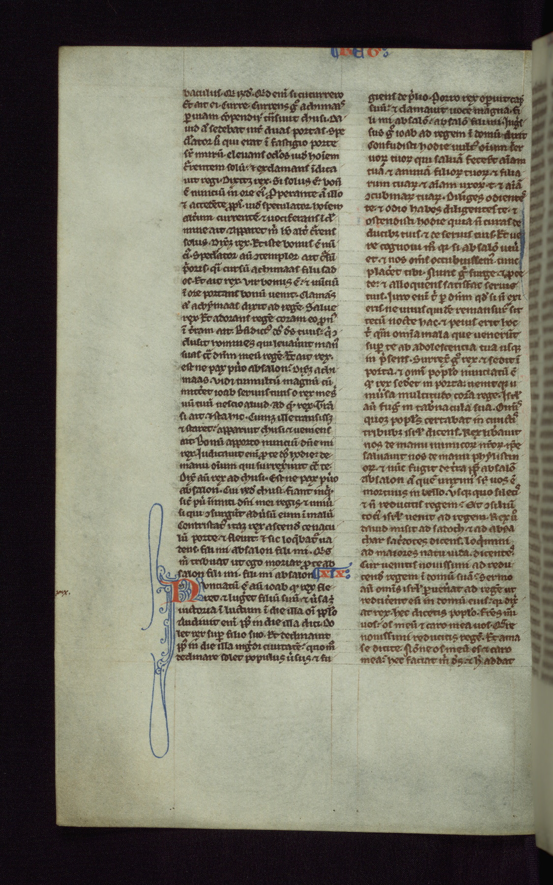 This pocket-size Bible was created around the middle of the thirteenth century in England. It contains the Vulgate text of the Old and New Testaments, arranged in order and divided into chapters. Such Bibles, designed for individual rather than institutional use, began to be created on a large scale during the thirteenth century, especially in Paris. This manuscript is illuminated with a large number of small historiated initials, and also includes a somewhat later image of the Three Living and the Three Dead, a popular scene based on a French poem of the same century.