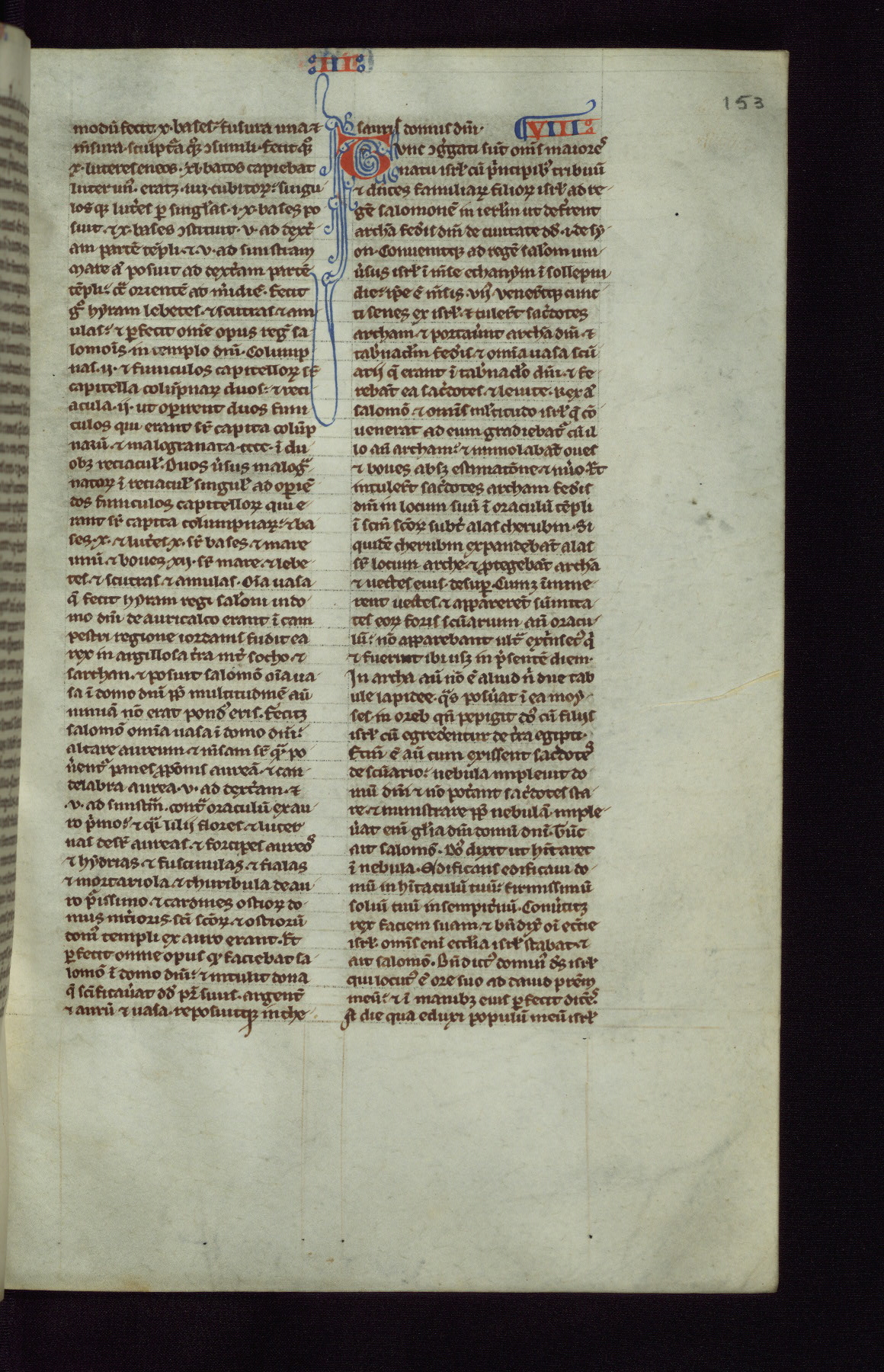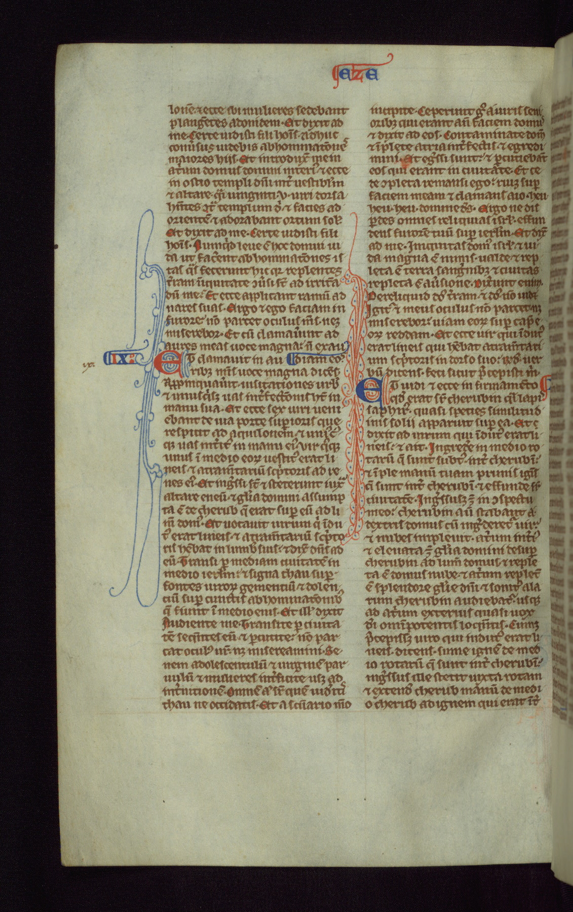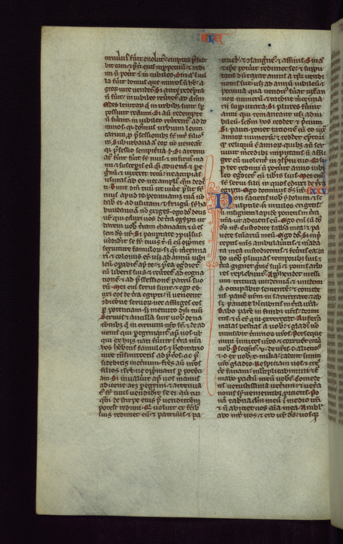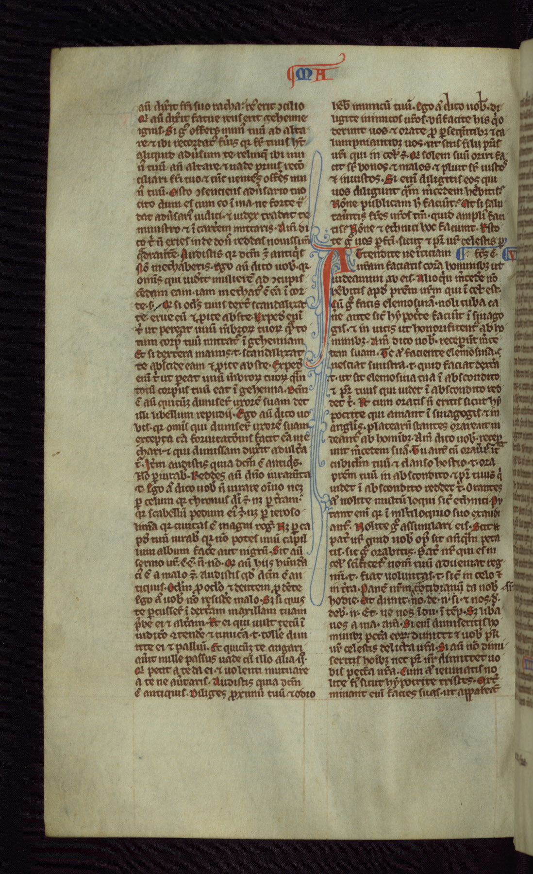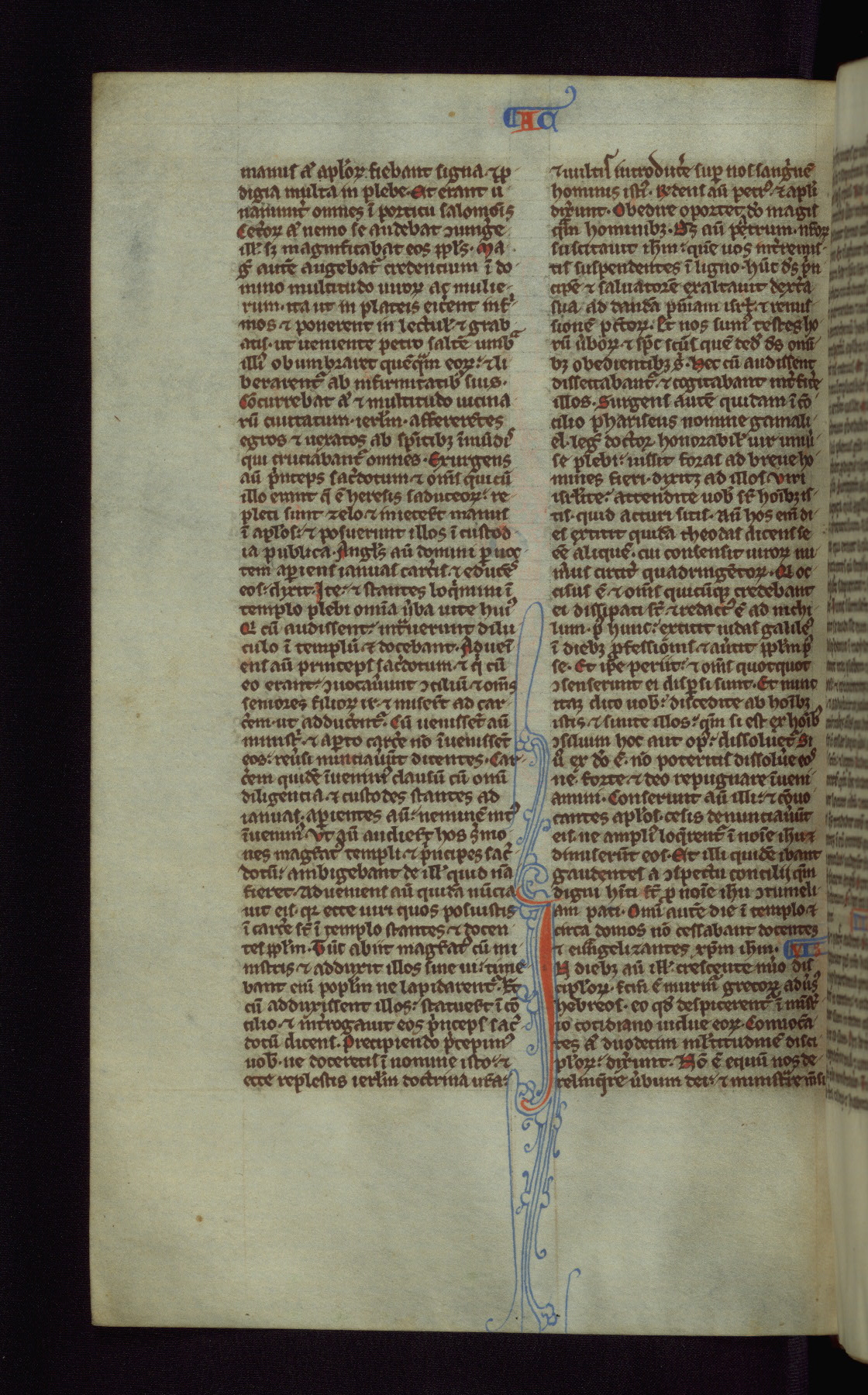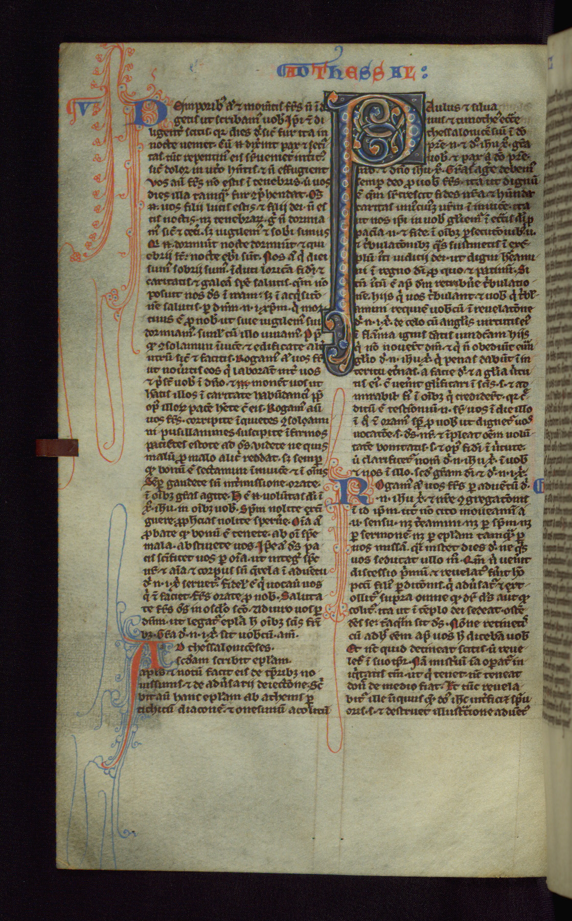 This pocket-size Bible was created around the middle of the thirteenth century in England. It contains the Vulgate text of the Old and New Testaments, arranged in order and divided into chapters. Such Bibles, designed for individual rather than institutional use, began to be created on a large scale during the thirteenth century, especially in Paris. This manuscript is illuminated with a large number of small historiated initials, and also includes a somewhat later image of the Three Living and the Three Dead, a popular scene based on a French poem of the same century.