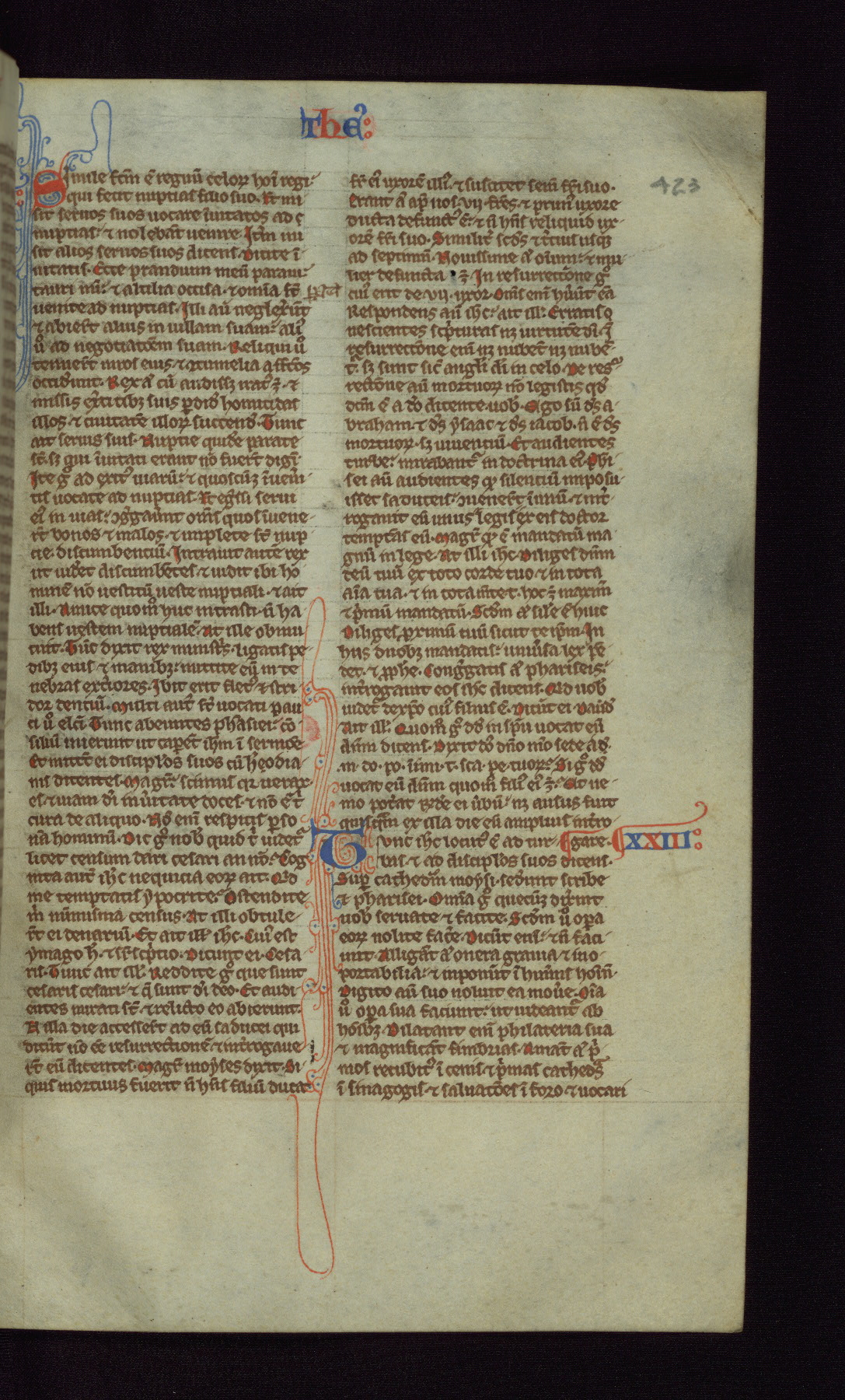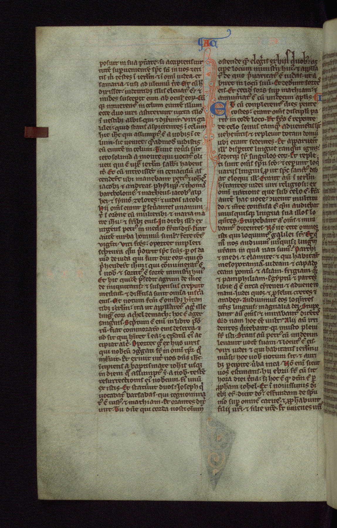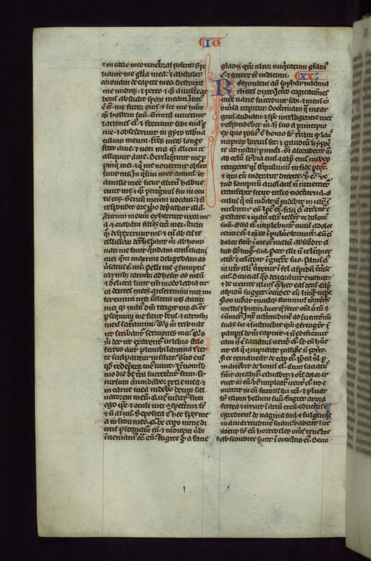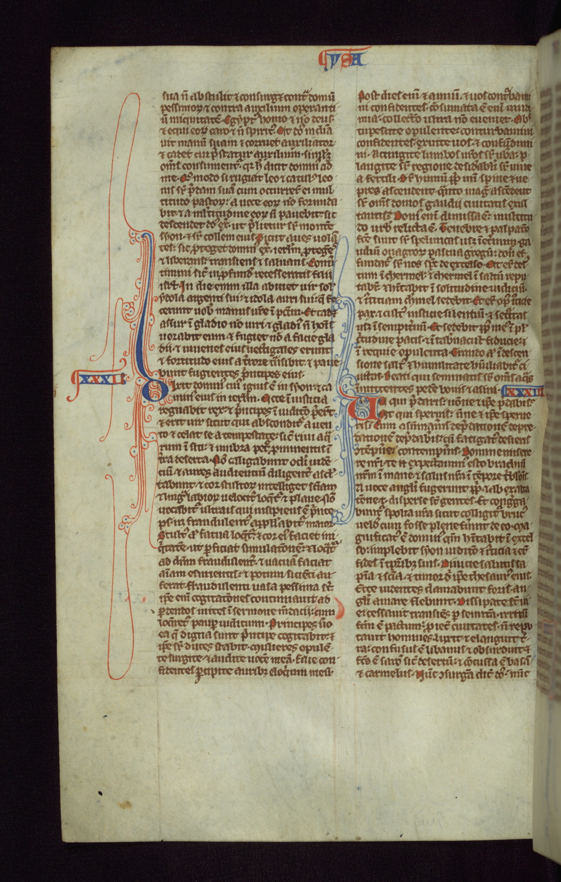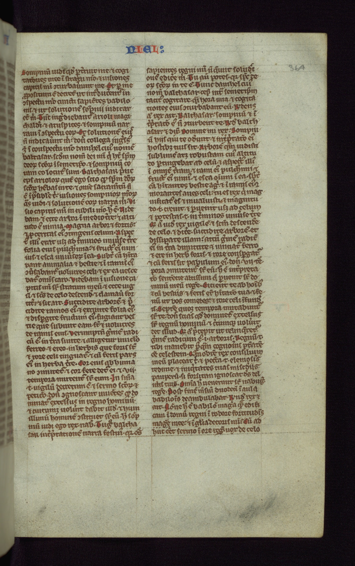 This pocket-size Bible was created around the middle of the thirteenth century in England. It contains the Vulgate text of the Old and New Testaments, arranged in order and divided into chapters. Such Bibles, designed for individual rather than institutional use, began to be created on a large scale during the thirteenth century, especially in Paris. This manuscript is illuminated with a large number of small historiated initials, and also includes a somewhat later image of the Three Living and the Three Dead, a popular scene based on a French poem of the same century.