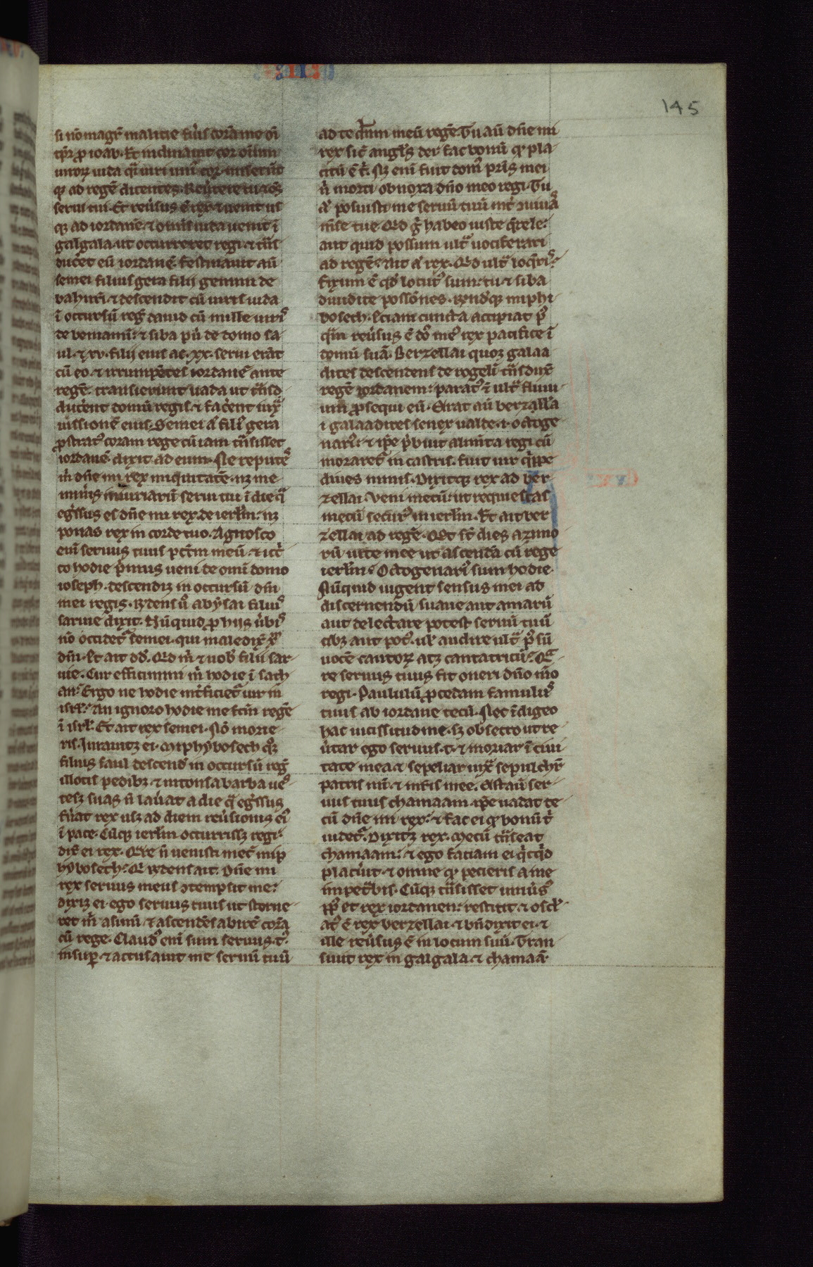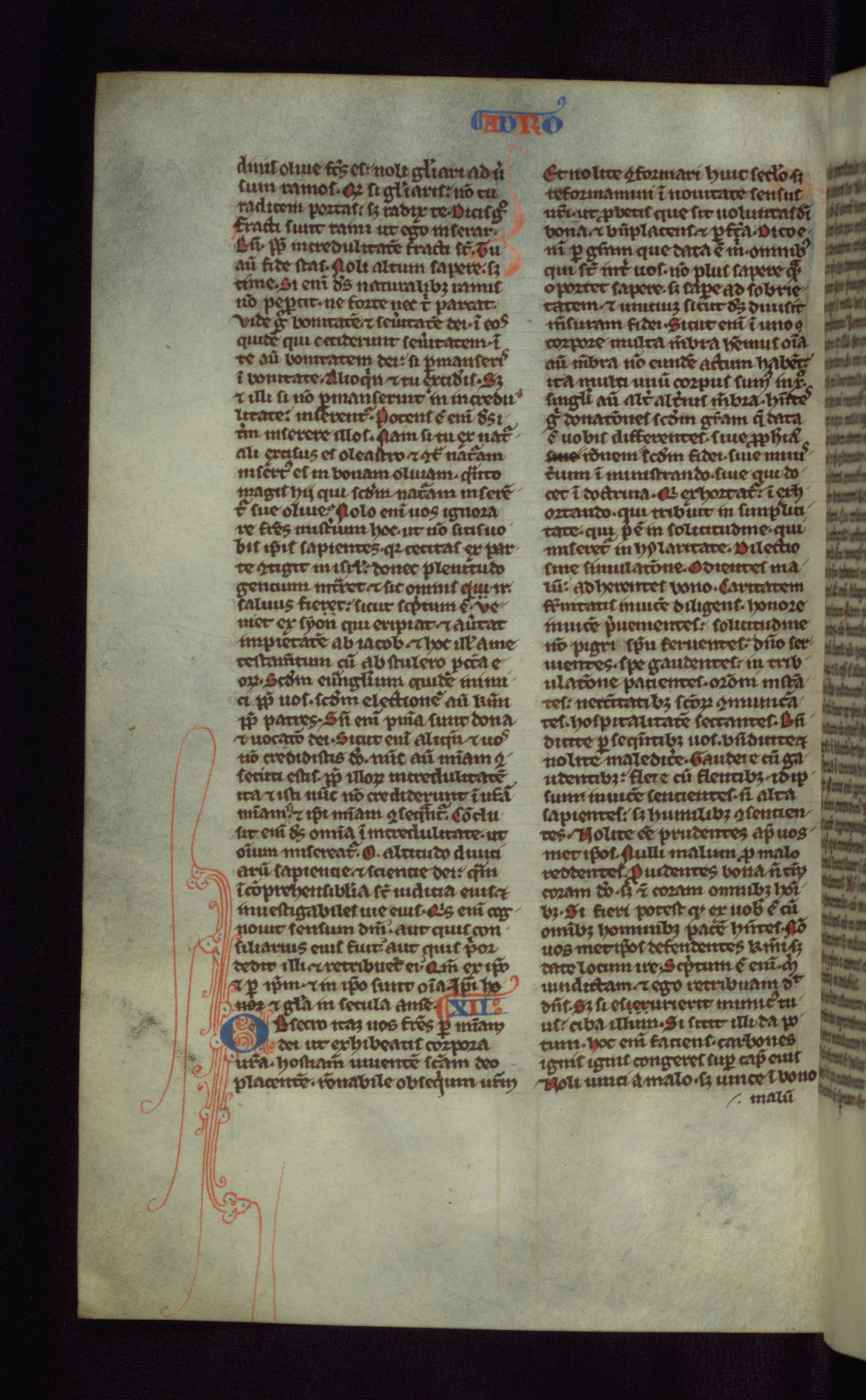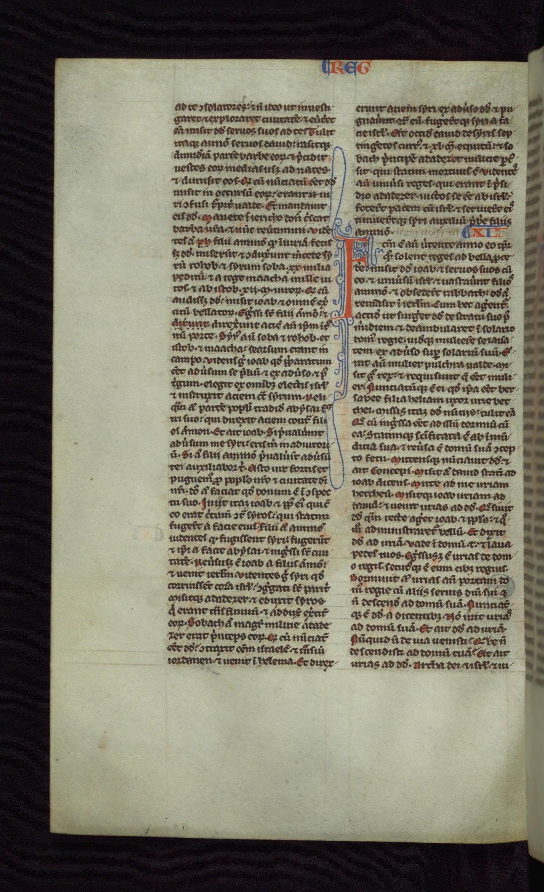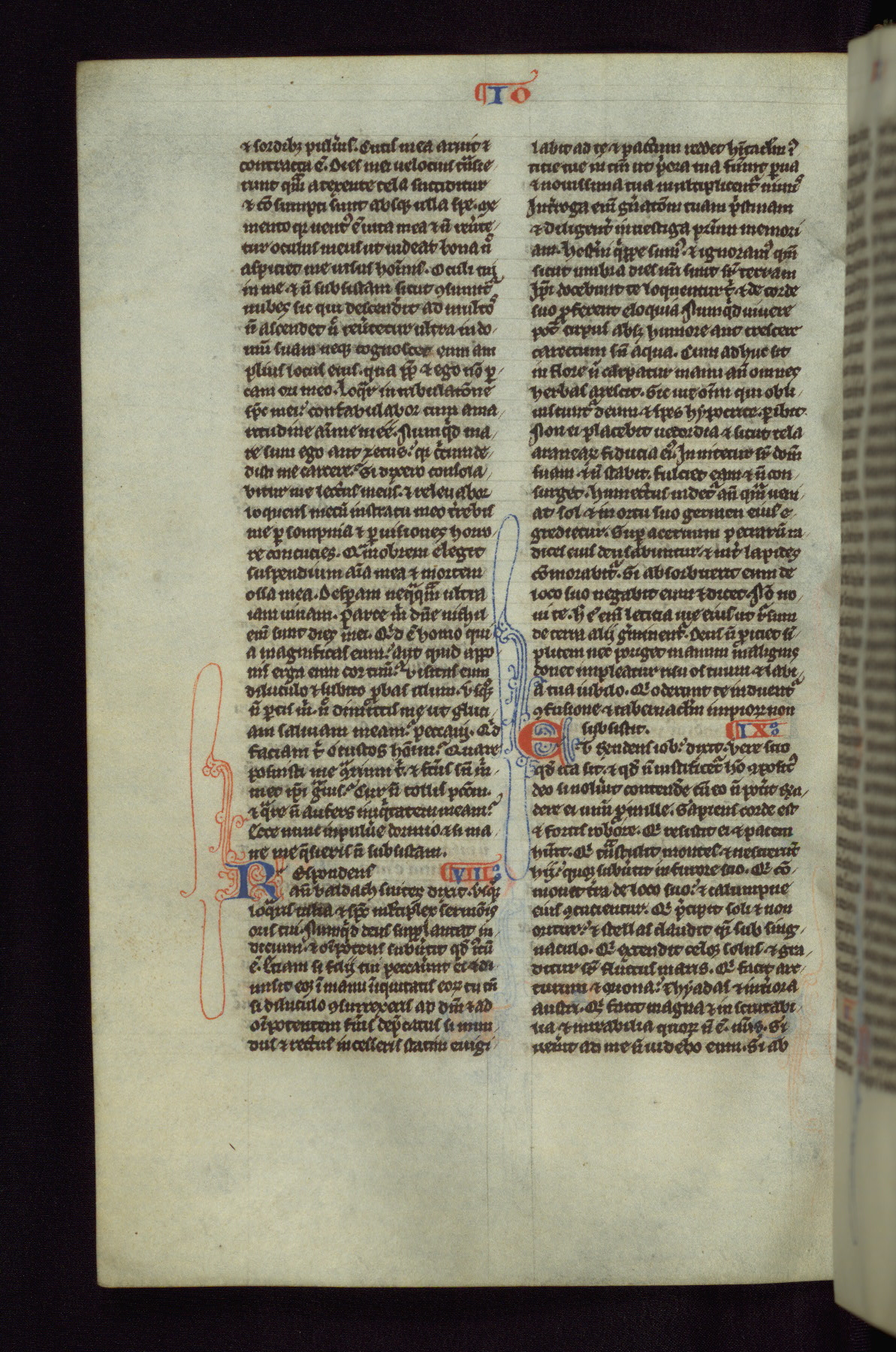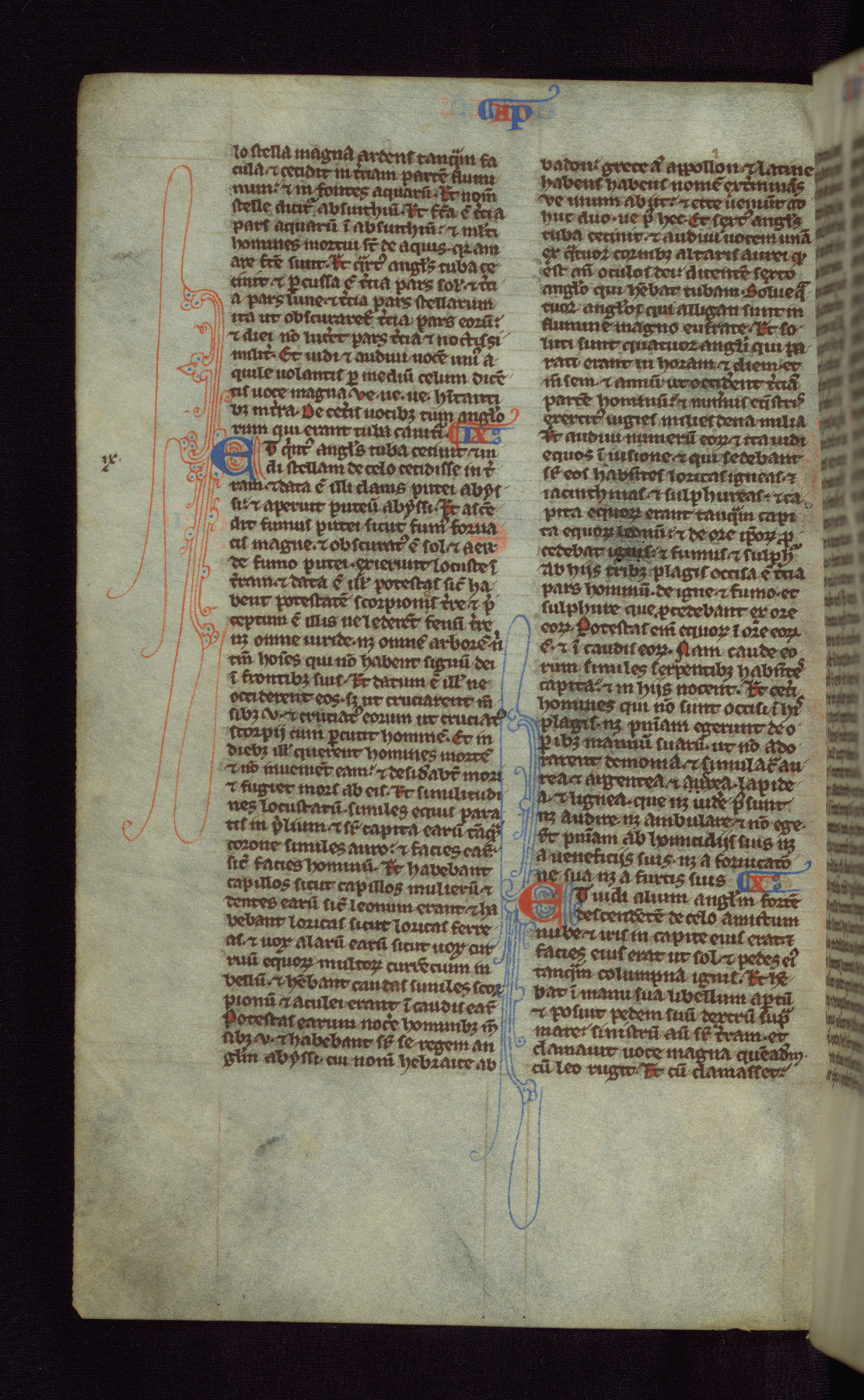 This pocket-size Bible was created around the middle of the thirteenth century in England. It contains the Vulgate text of the Old and New Testaments, arranged in order and divided into chapters. Such Bibles, designed for individual rather than institutional use, began to be created on a large scale during the thirteenth century, especially in Paris. This manuscript is illuminated with a large number of small historiated initials, and also includes a somewhat later image of the Three Living and the Three Dead, a popular scene based on a French poem of the same century.