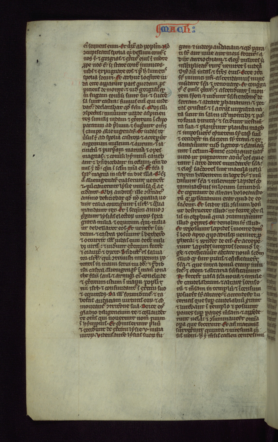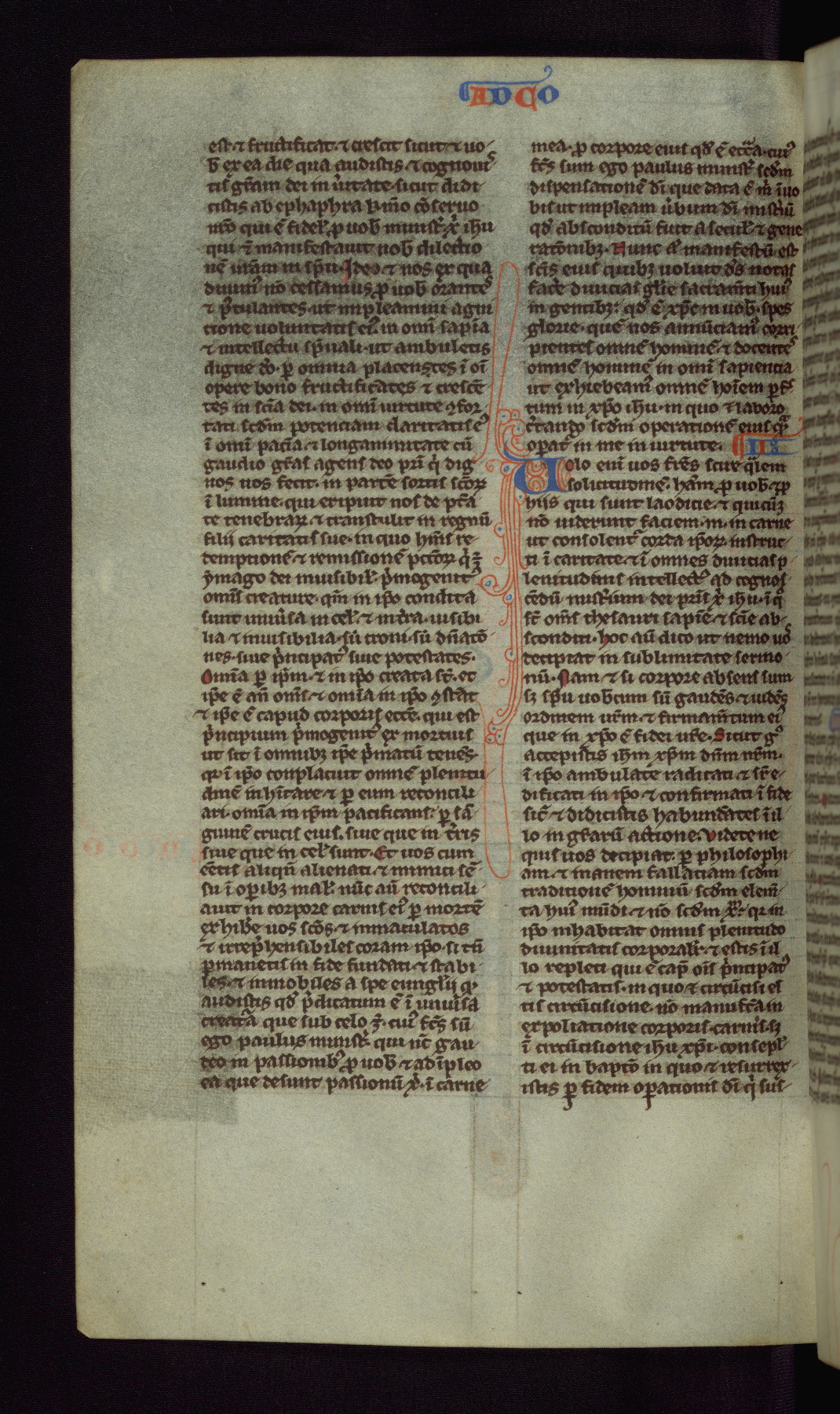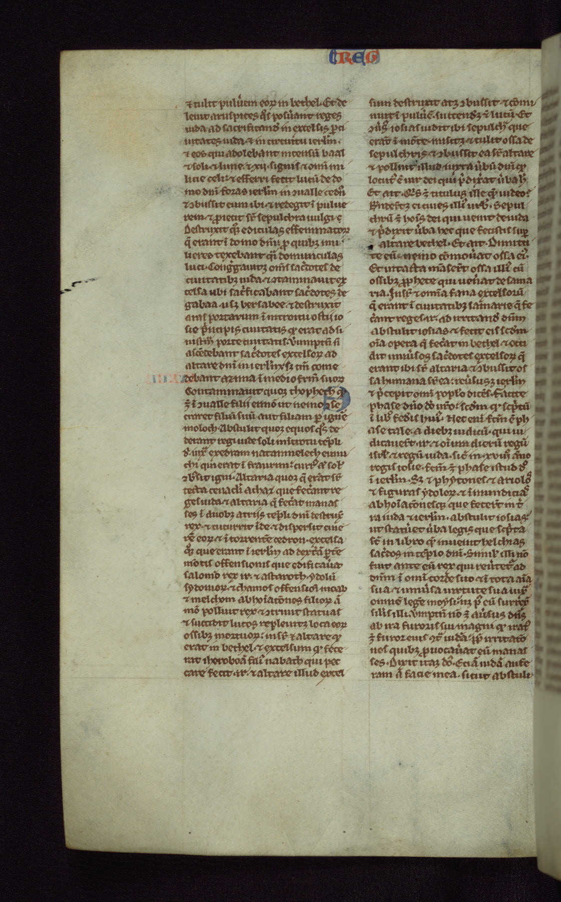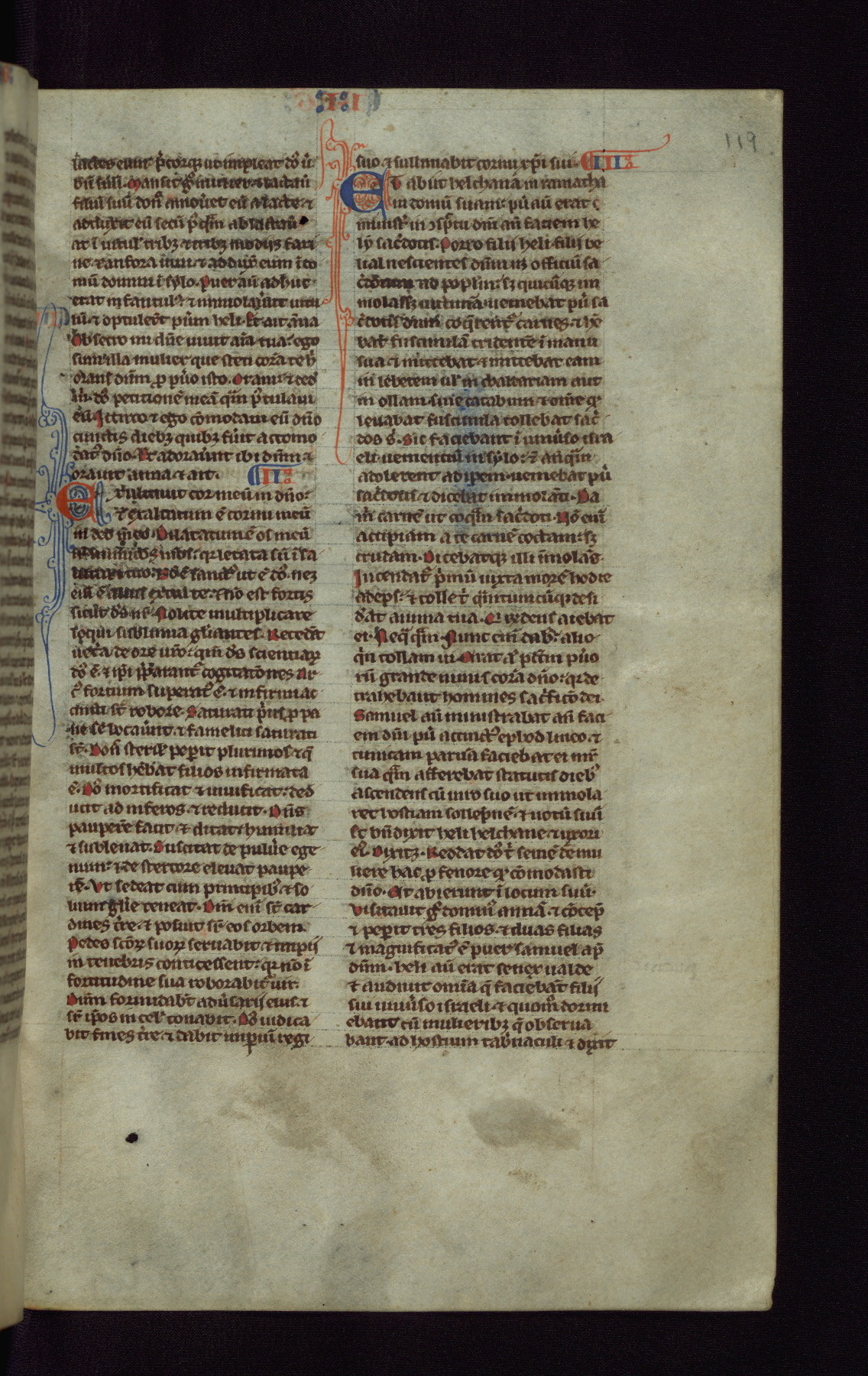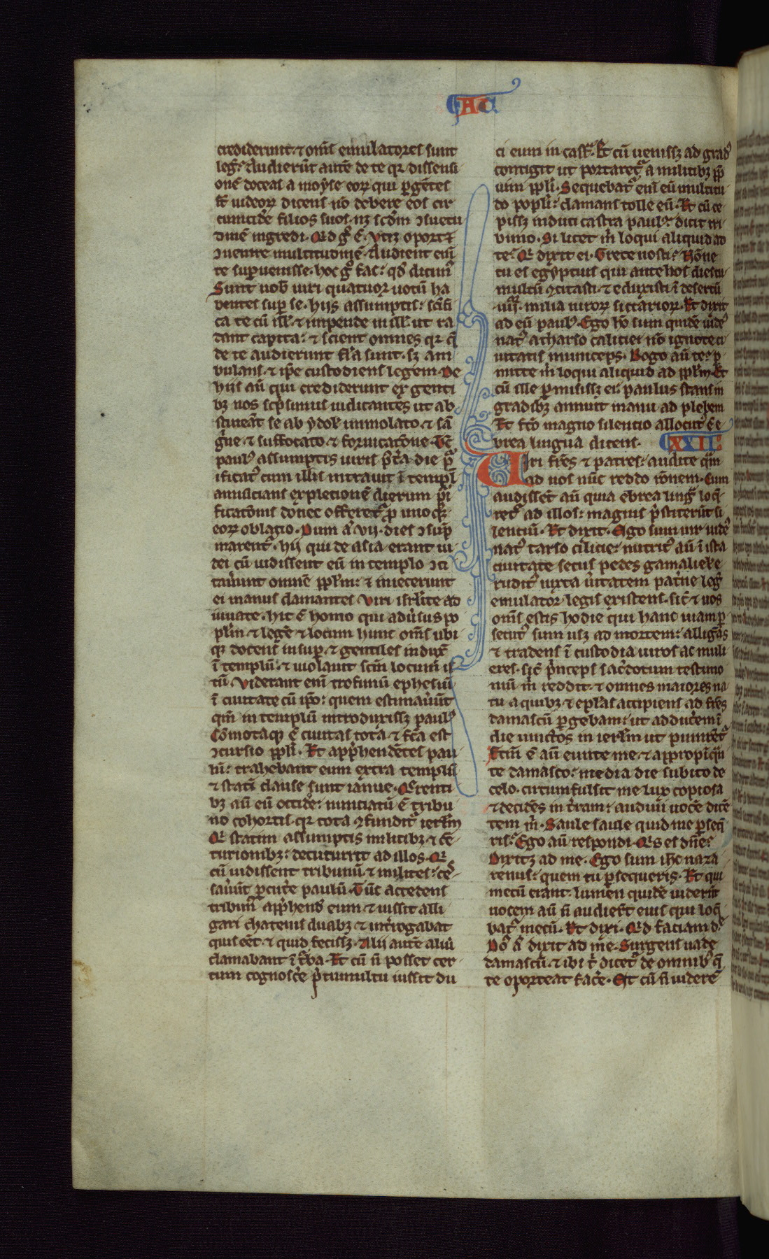 This pocket-size Bible was created around the middle of the thirteenth century in England. It contains the Vulgate text of the Old and New Testaments, arranged in order and divided into chapters. Such Bibles, designed for individual rather than institutional use, began to be created on a large scale during the thirteenth century, especially in Paris. This manuscript is illuminated with a large number of small historiated initials, and also includes a somewhat later image of the Three Living and the Three Dead, a popular scene based on a French poem of the same century.