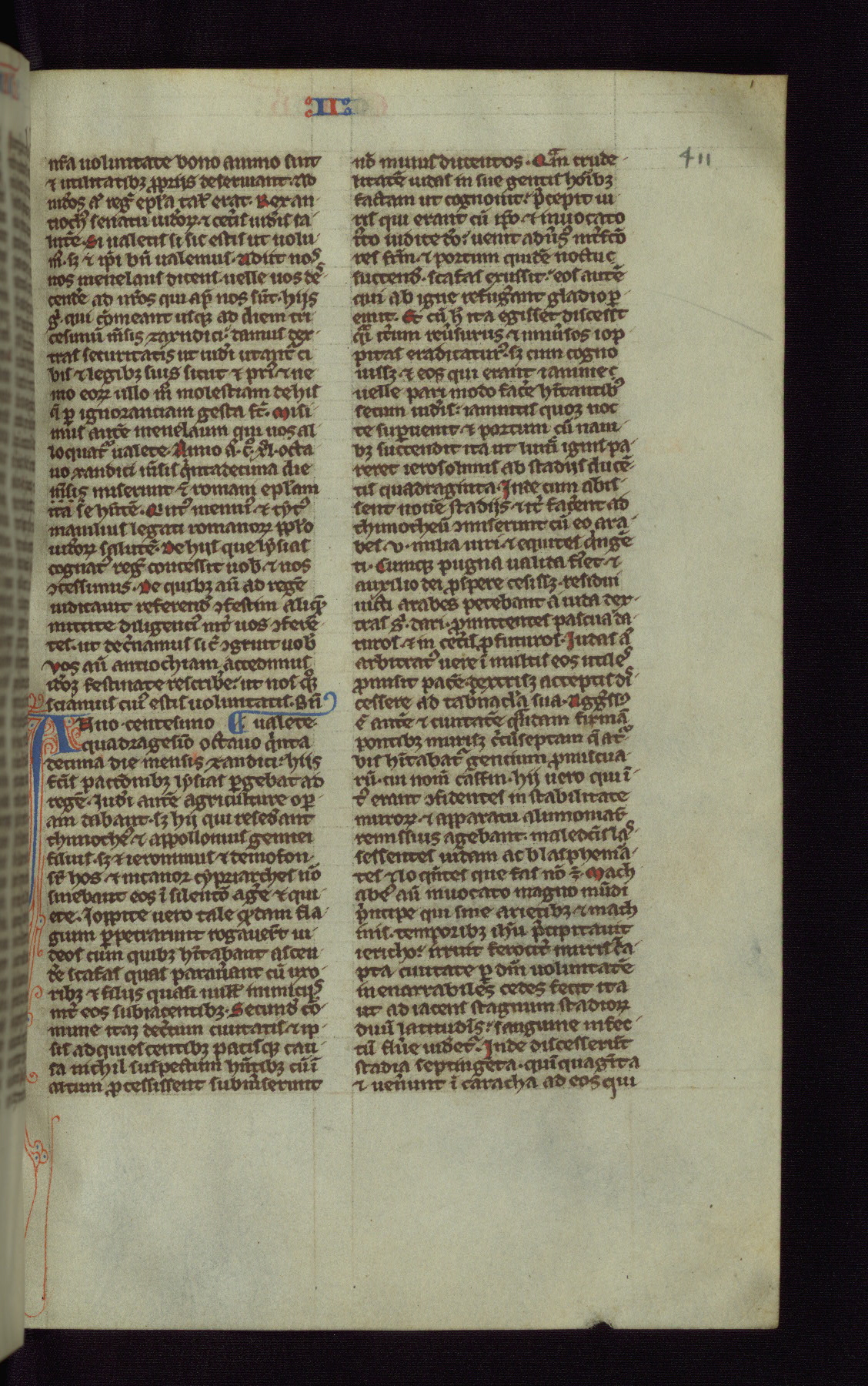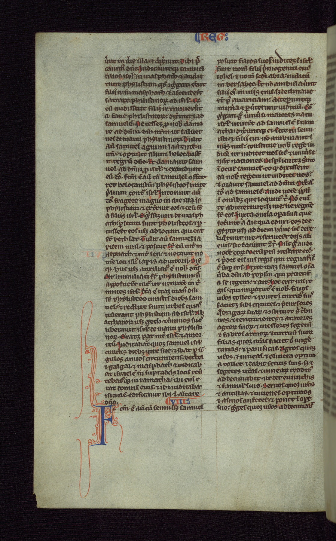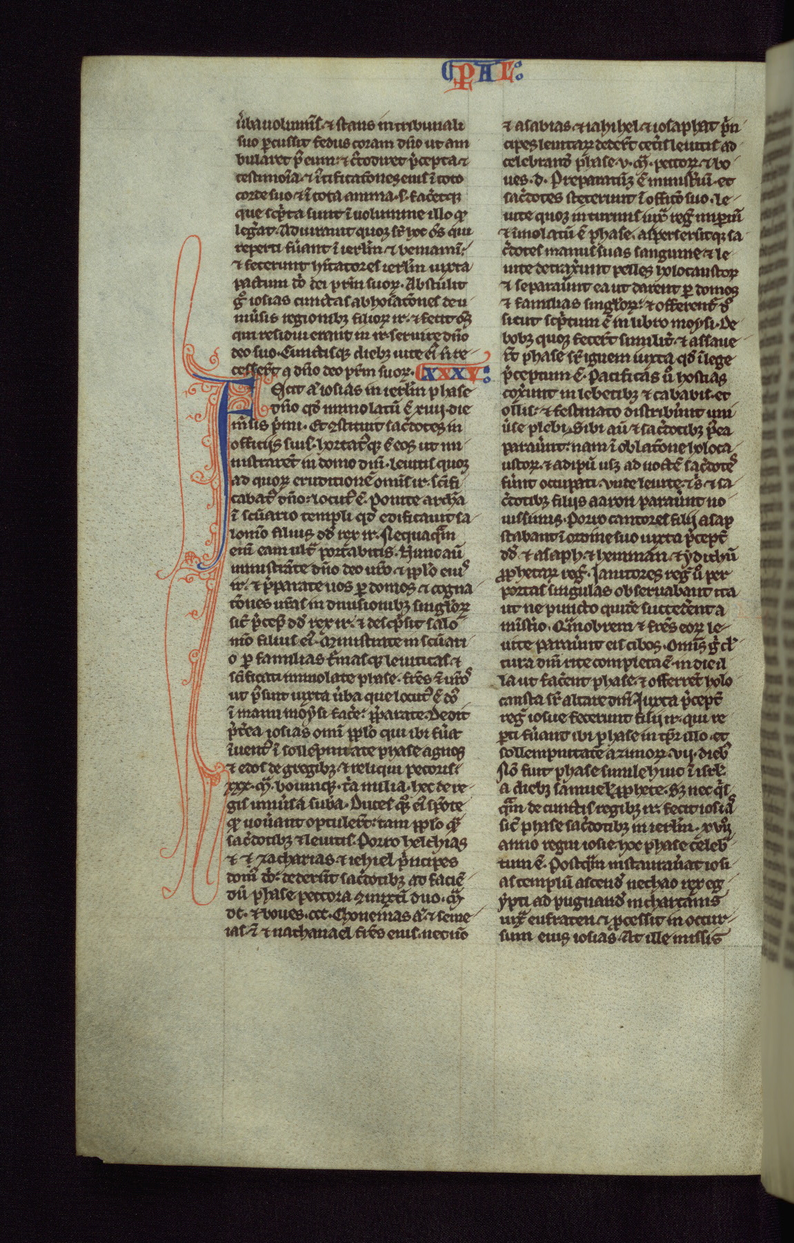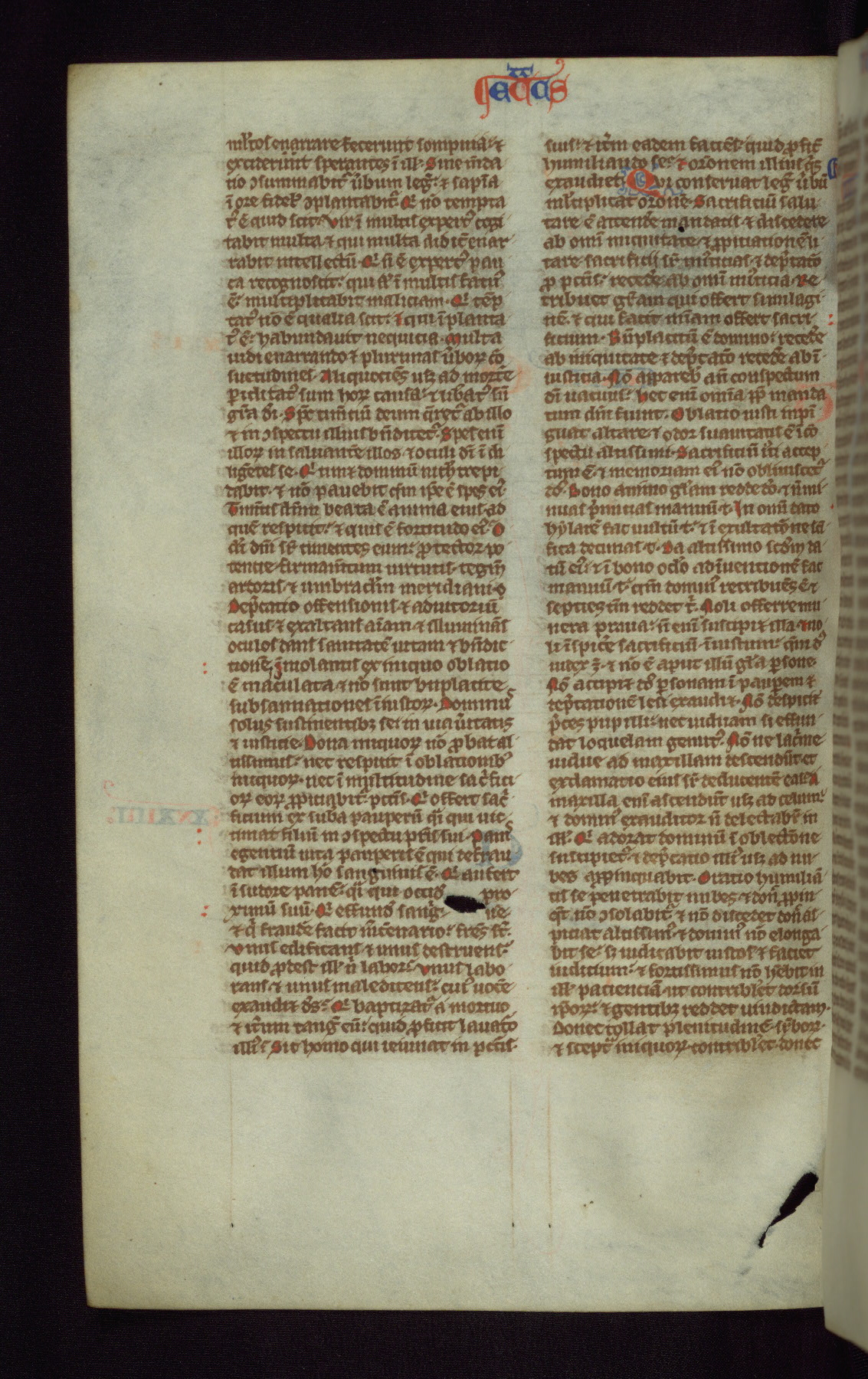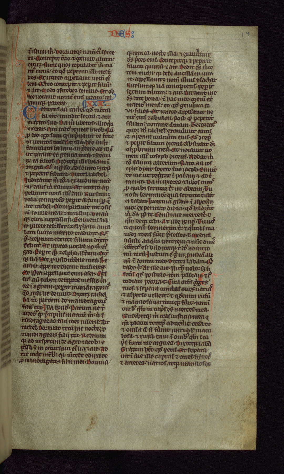 This pocket-size Bible was created around the middle of the thirteenth century in England. It contains the Vulgate text of the Old and New Testaments, arranged in order and divided into chapters. Such Bibles, designed for individual rather than institutional use, began to be created on a large scale during the thirteenth century, especially in Paris. This manuscript is illuminated with a large number of small historiated initials, and also includes a somewhat later image of the Three Living and the Three Dead, a popular scene based on a French poem of the same century.
