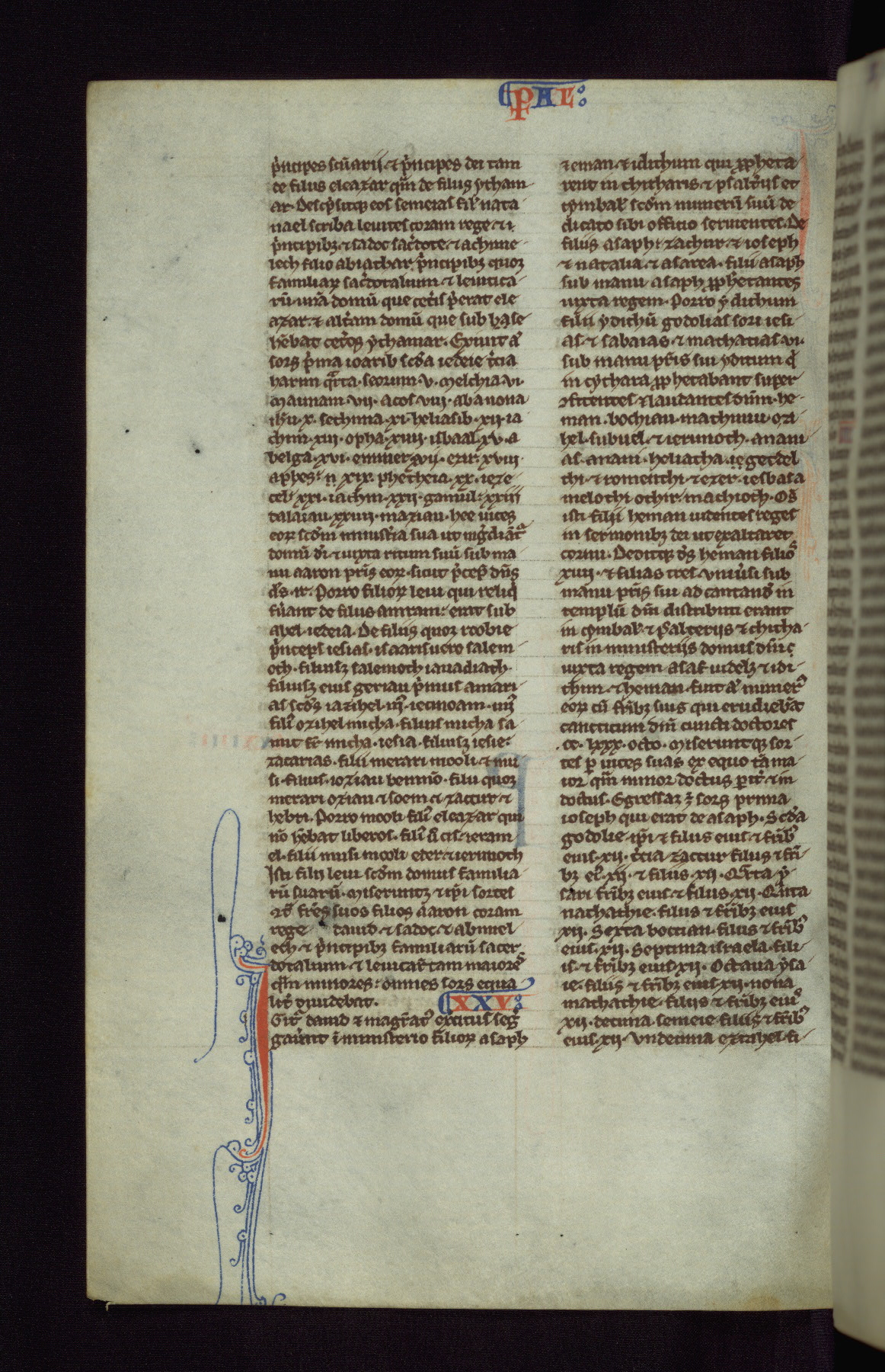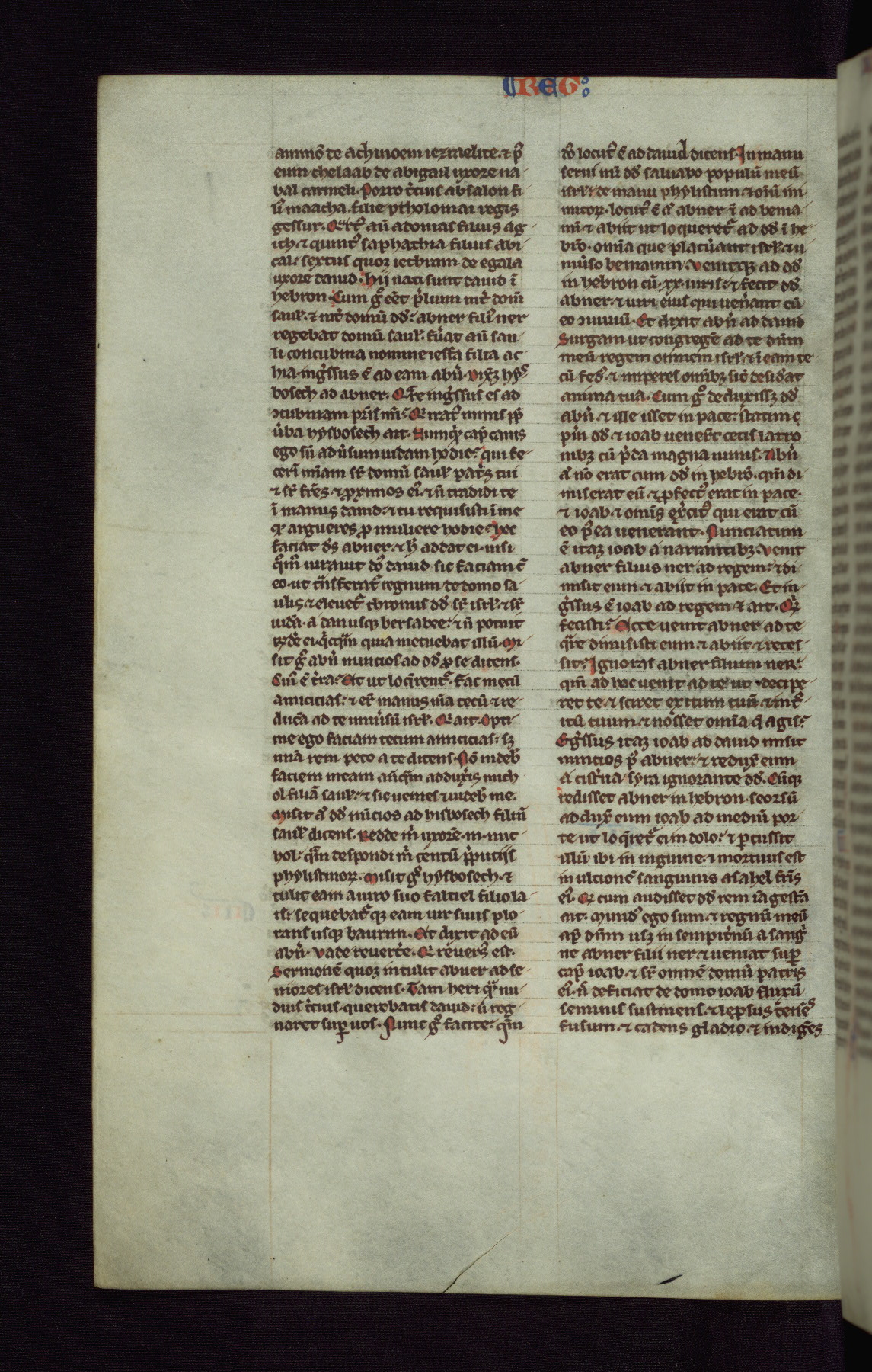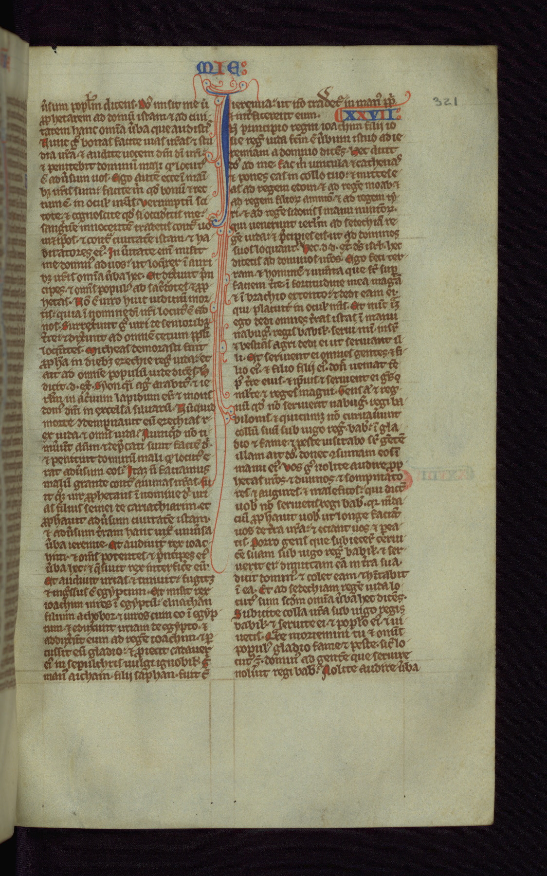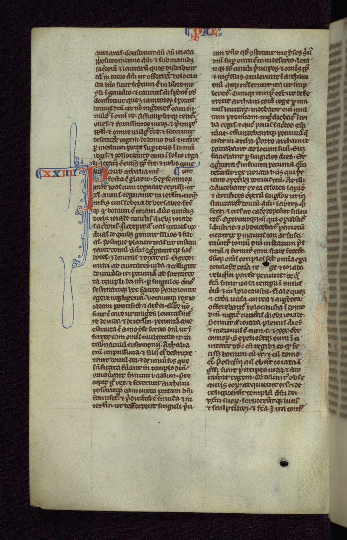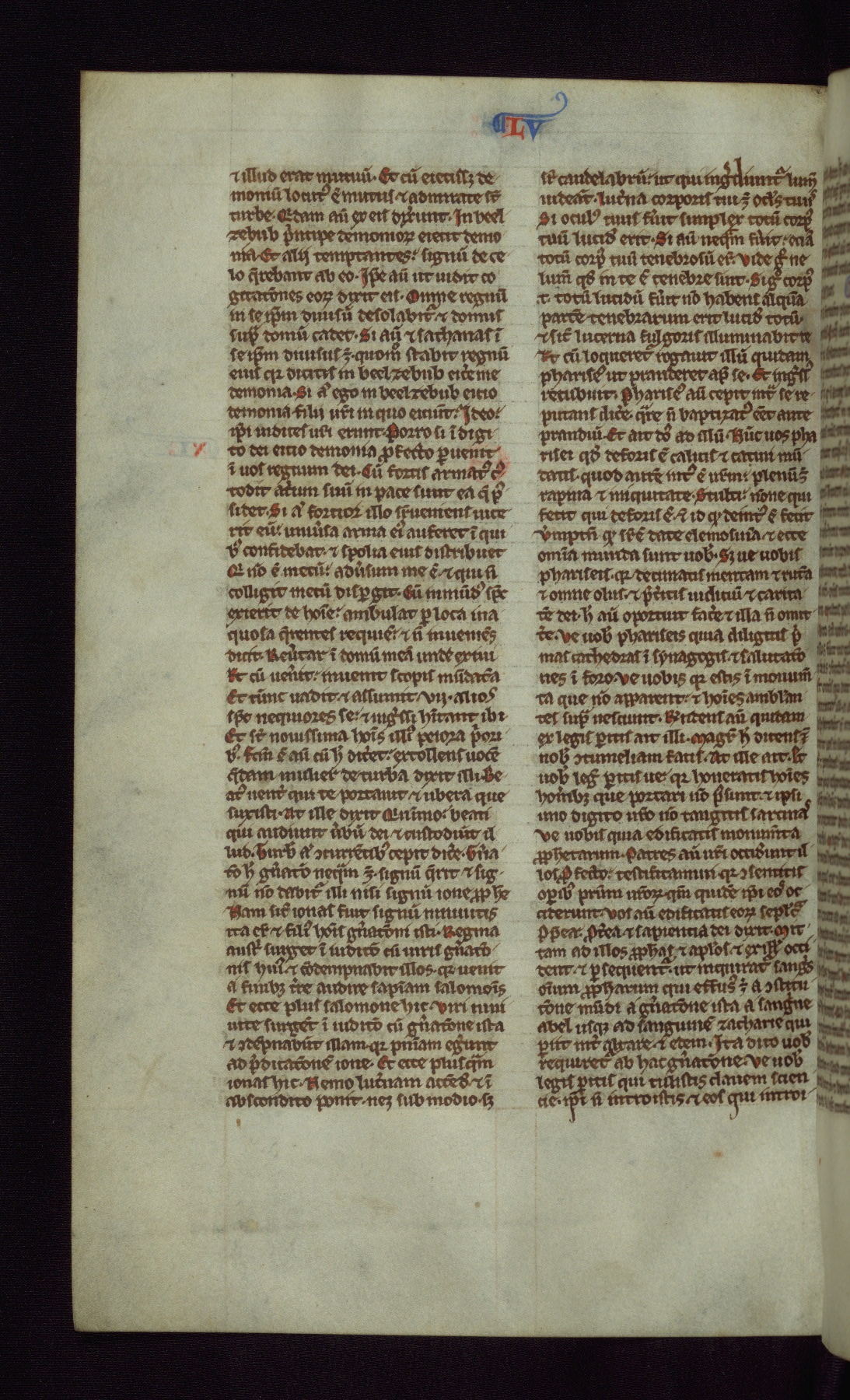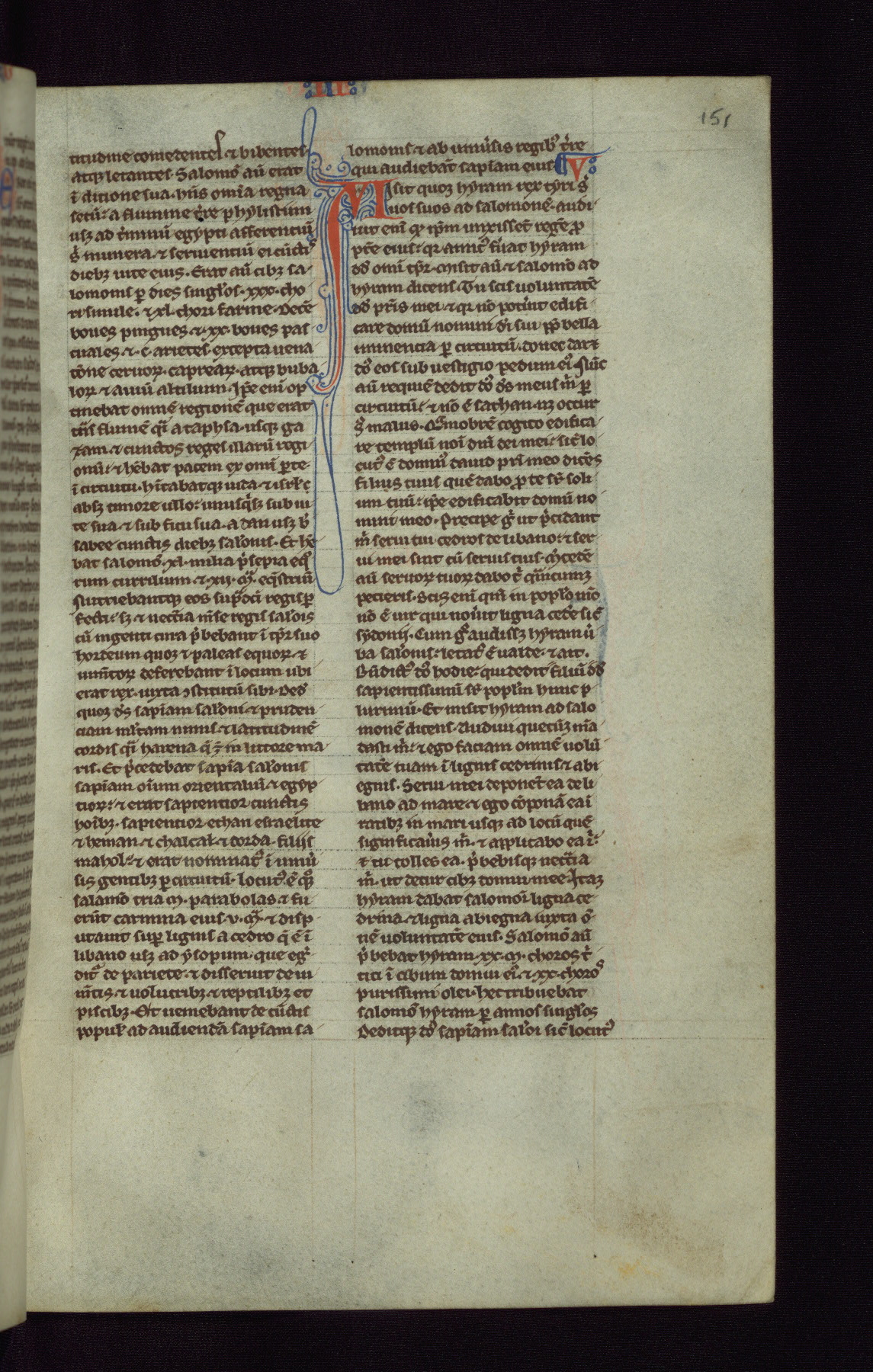 This pocket-size Bible was created around the middle of the thirteenth century in England. It contains the Vulgate text of the Old and New Testaments, arranged in order and divided into chapters. Such Bibles, designed for individual rather than institutional use, began to be created on a large scale during the thirteenth century, especially in Paris. This manuscript is illuminated with a large number of small historiated initials, and also includes a somewhat later image of the Three Living and the Three Dead, a popular scene based on a French poem of the same century.