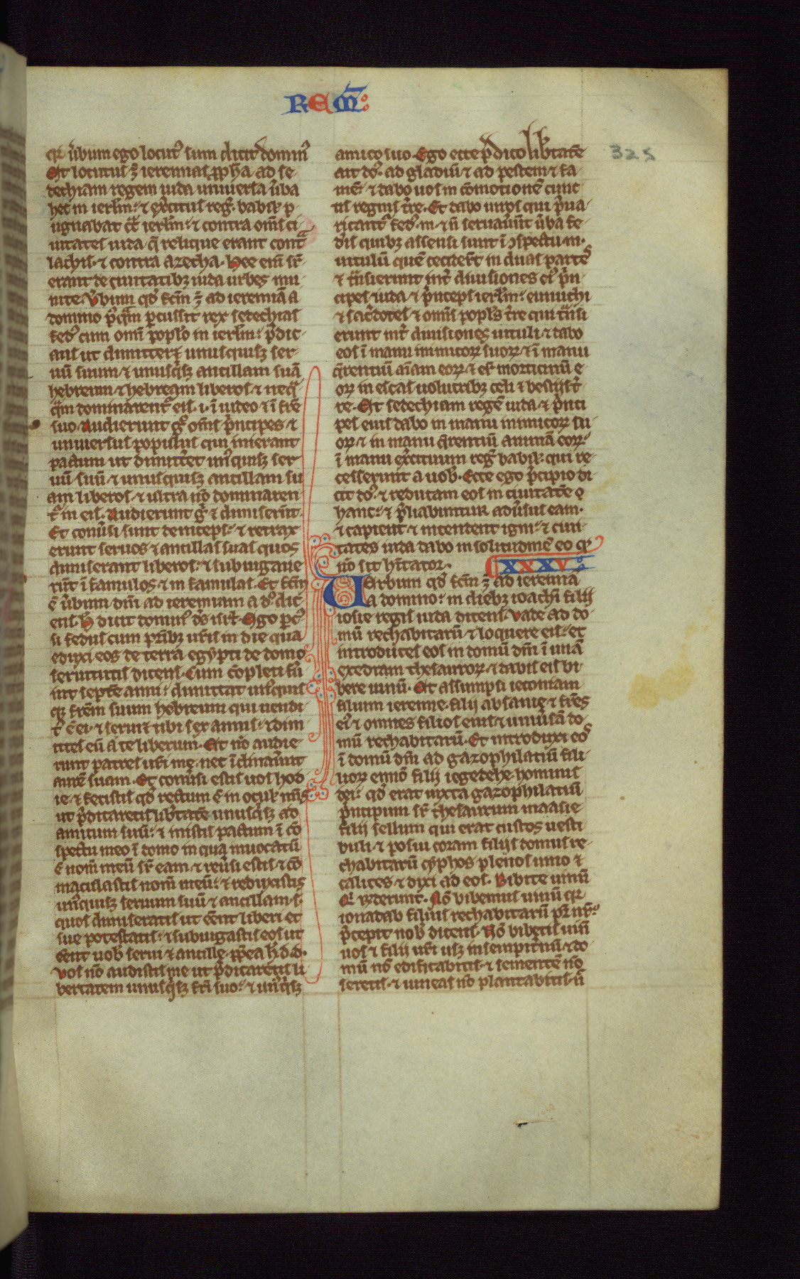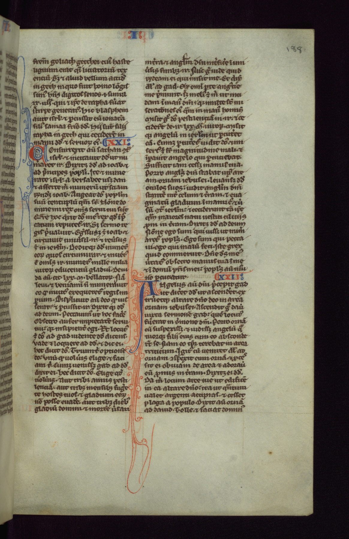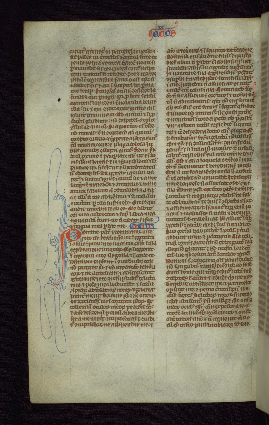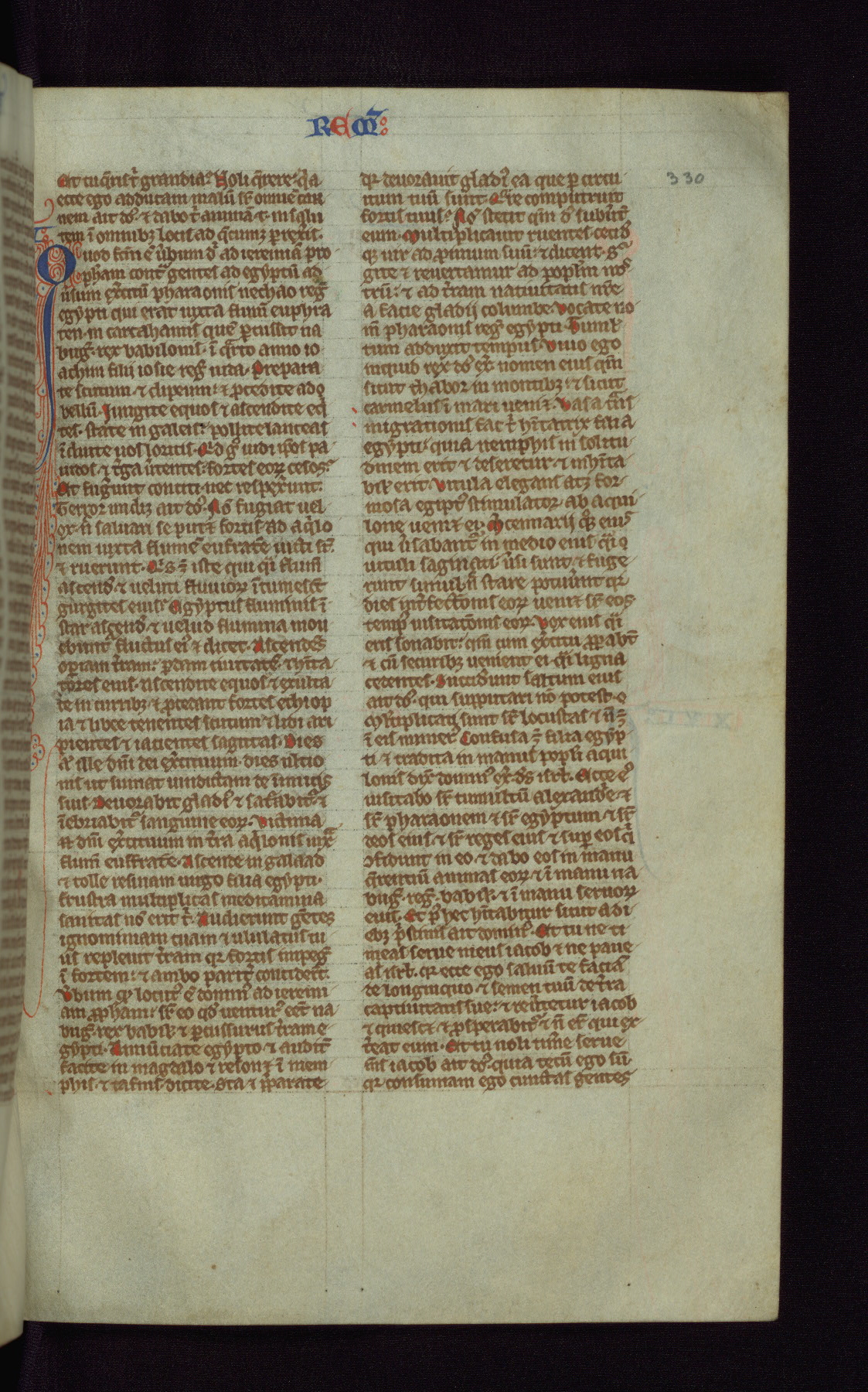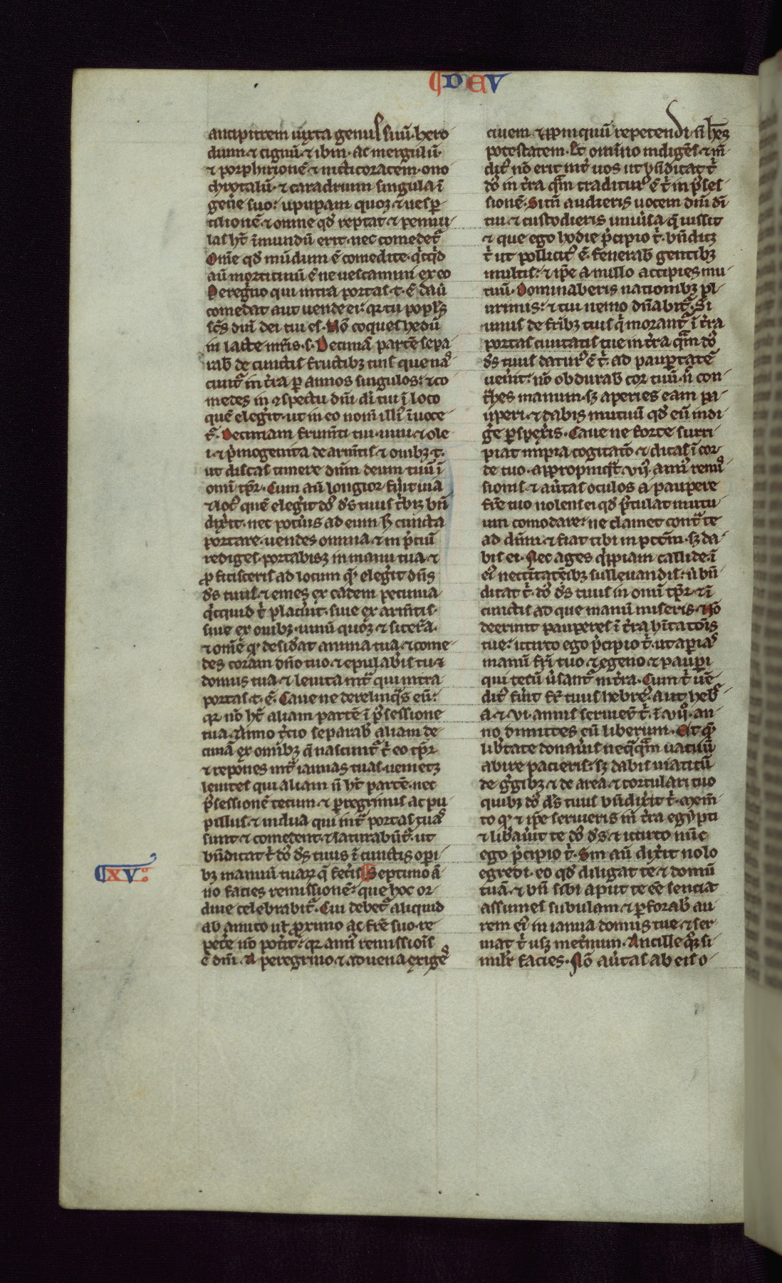 This pocket-size Bible was created around the middle of the thirteenth century in England. It contains the Vulgate text of the Old and New Testaments, arranged in order and divided into chapters. Such Bibles, designed for individual rather than institutional use, began to be created on a large scale during the thirteenth century, especially in Paris. This manuscript is illuminated with a large number of small historiated initials, and also includes a somewhat later image of the Three Living and the Three Dead, a popular scene based on a French poem of the same century.