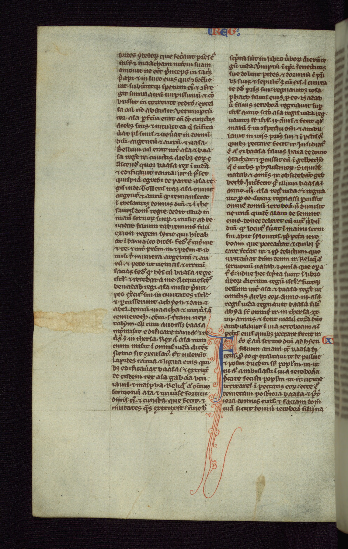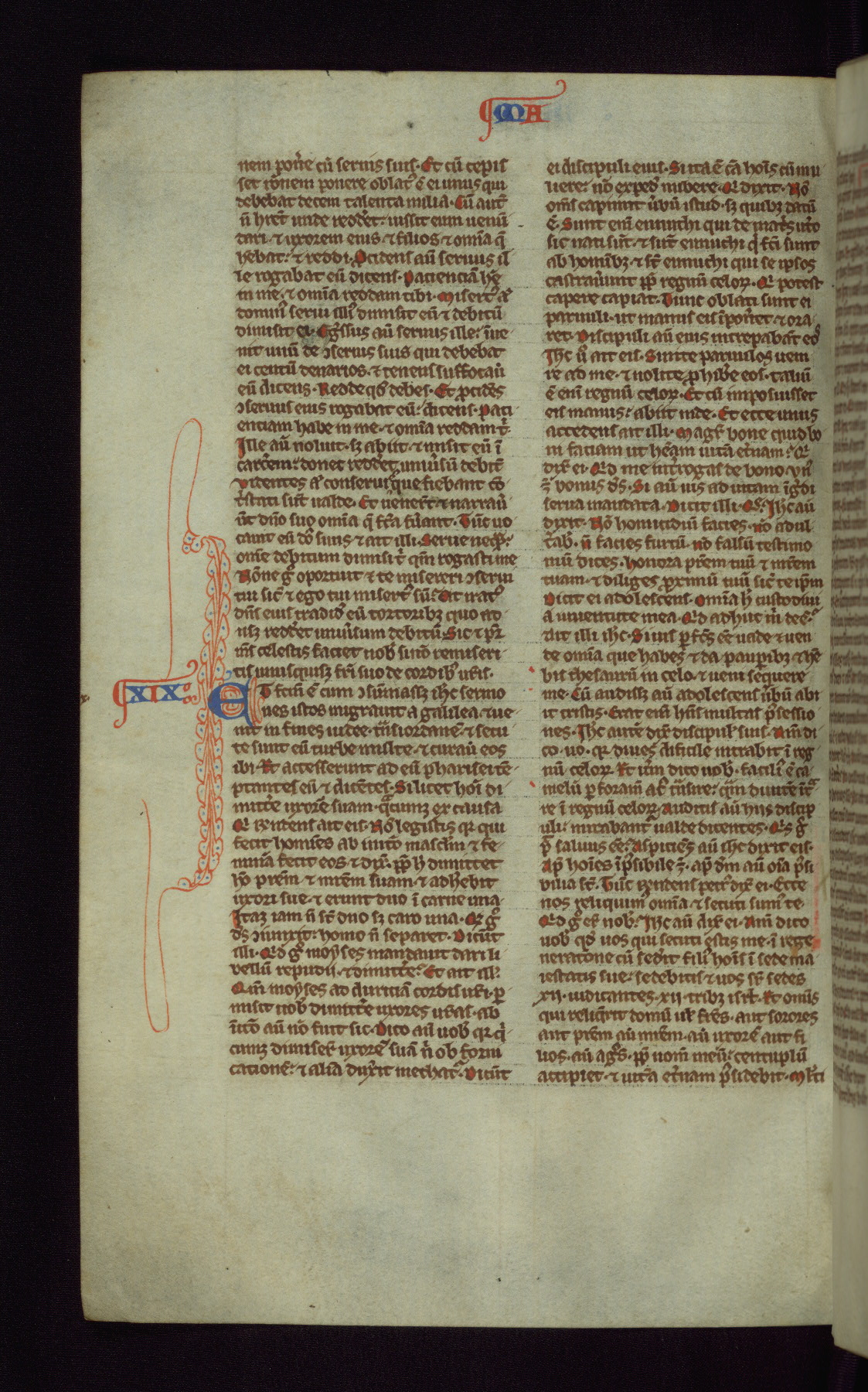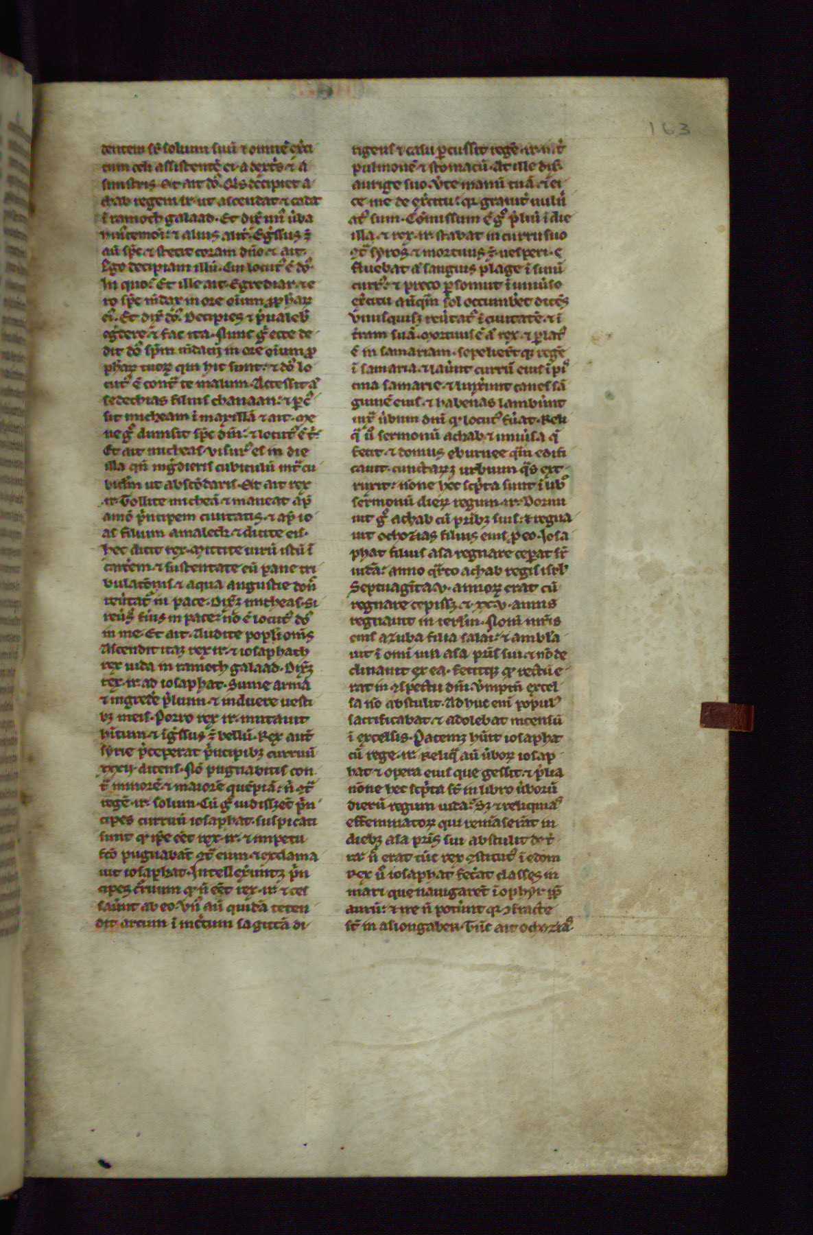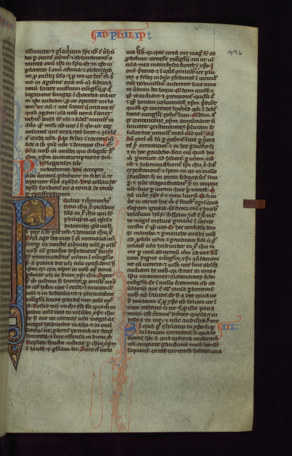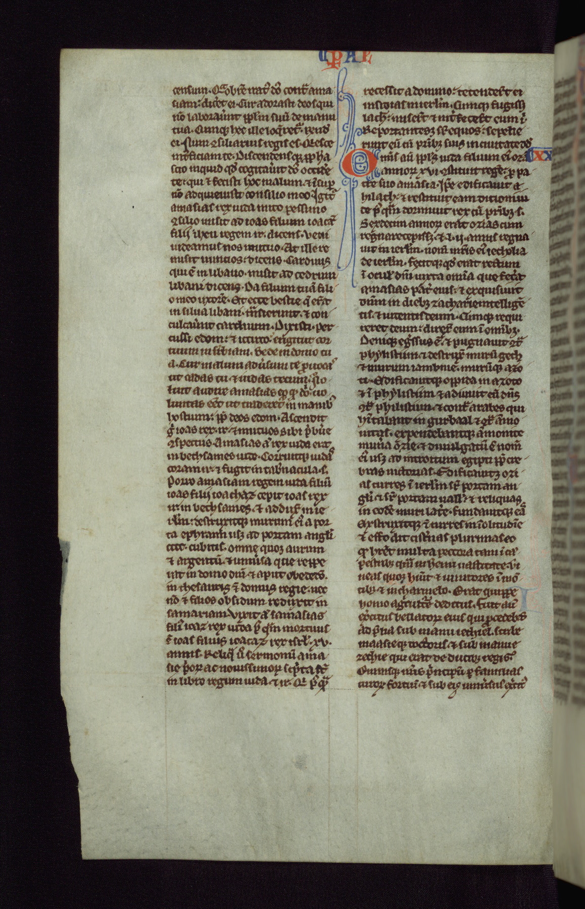 This pocket-size Bible was created around the middle of the thirteenth century in England. It contains the Vulgate text of the Old and New Testaments, arranged in order and divided into chapters. Such Bibles, designed for individual rather than institutional use, began to be created on a large scale during the thirteenth century, especially in Paris. This manuscript is illuminated with a large number of small historiated initials, and also includes a somewhat later image of the Three Living and the Three Dead, a popular scene based on a French poem of the same century.