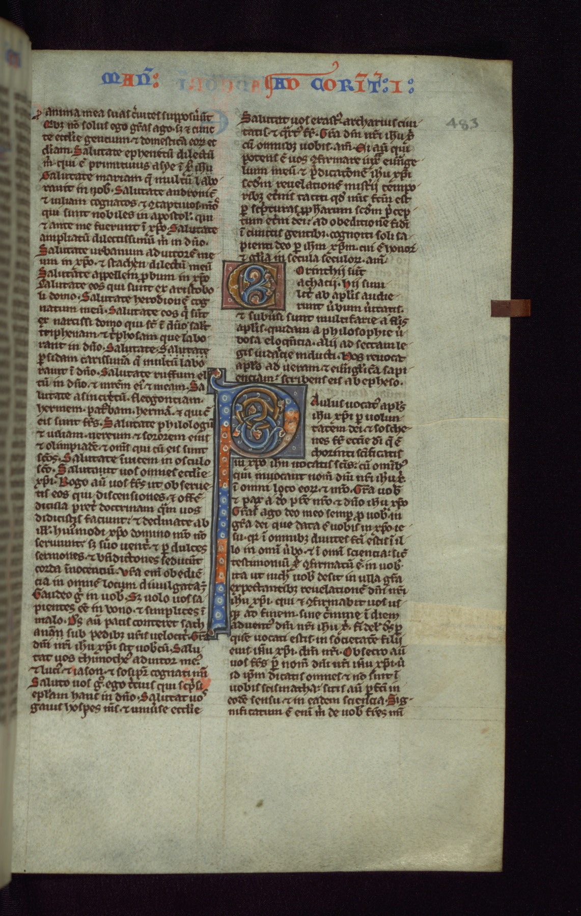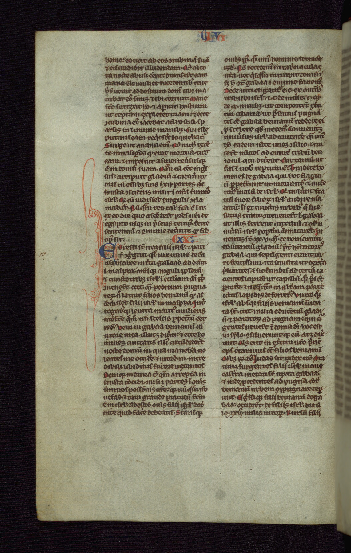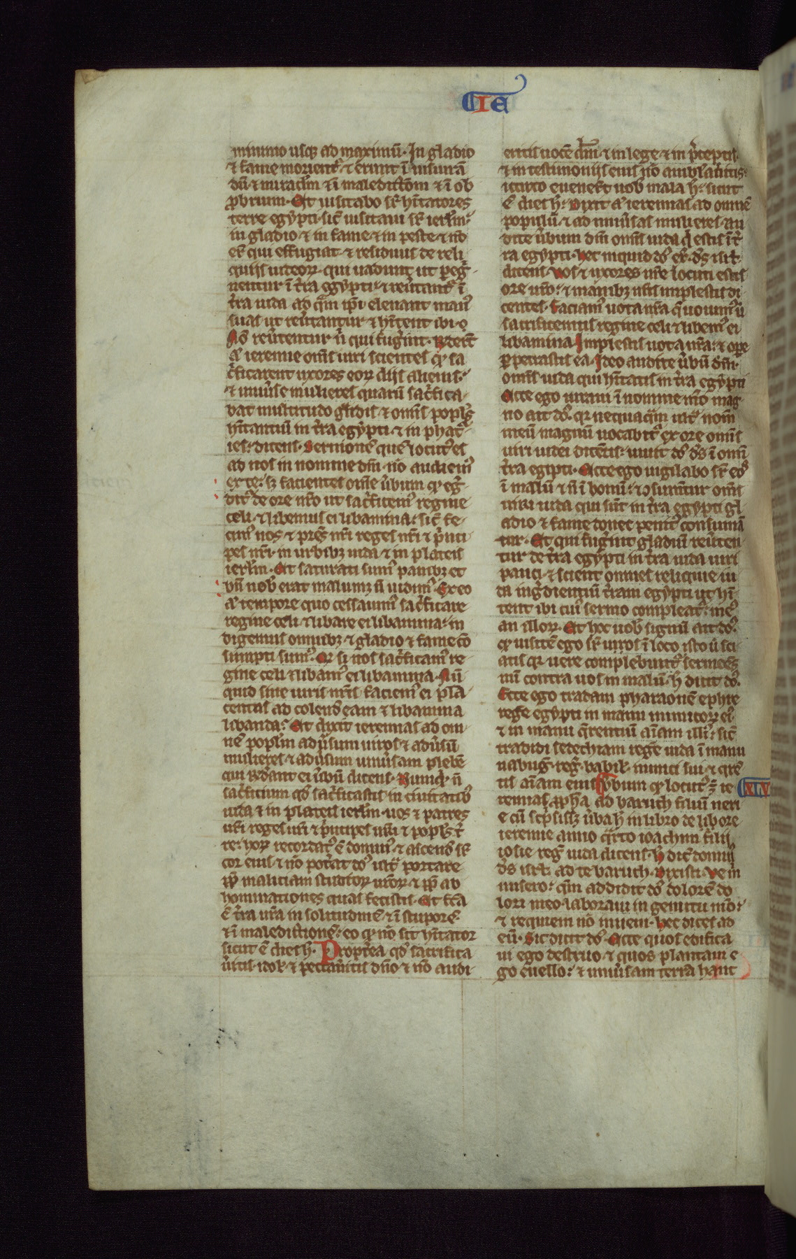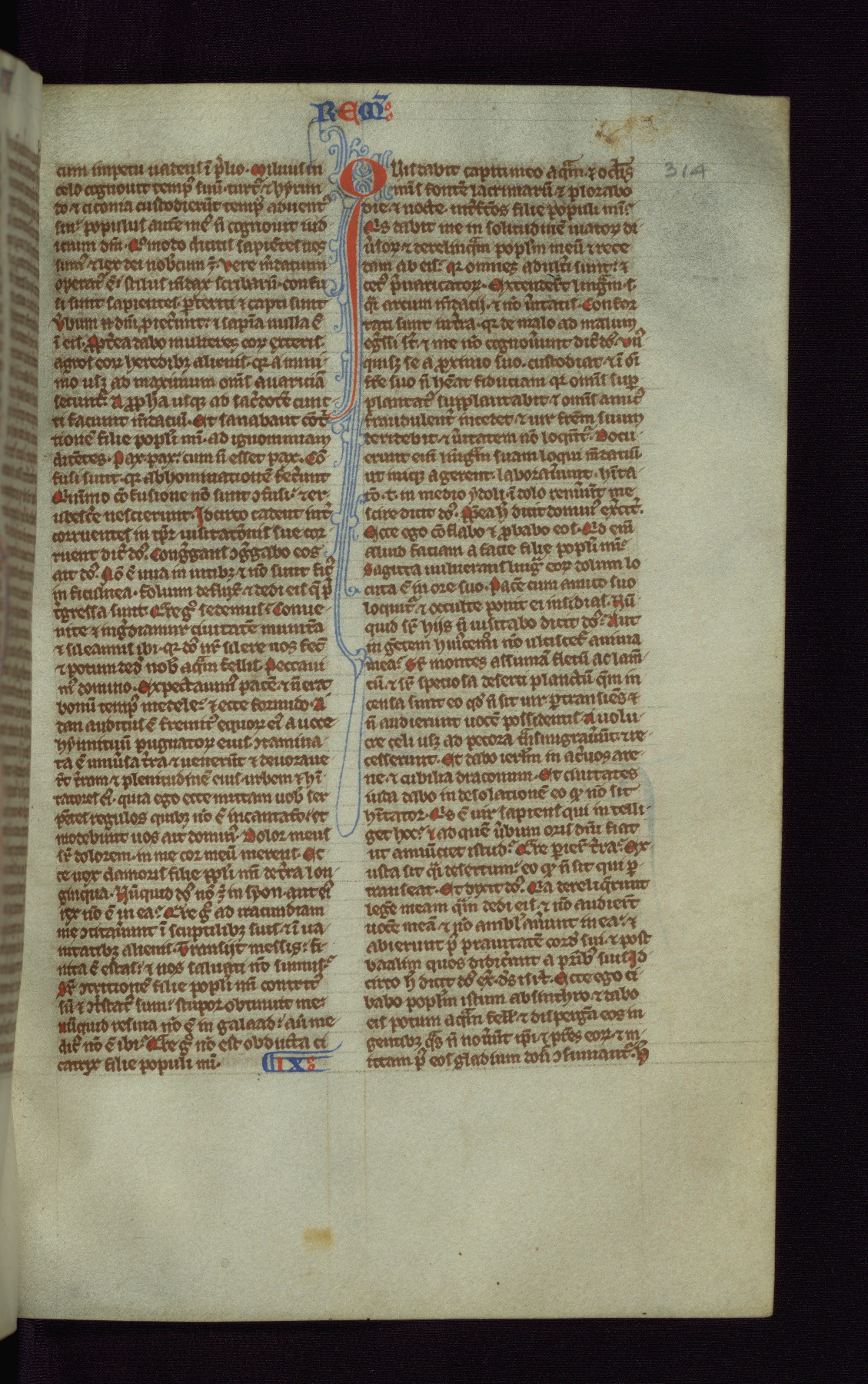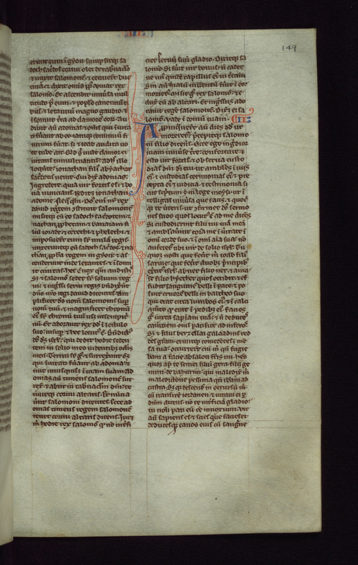 This pocket-size Bible was created around the middle of the thirteenth century in England. It contains the Vulgate text of the Old and New Testaments, arranged in order and divided into chapters. Such Bibles, designed for individual rather than institutional use, began to be created on a large scale during the thirteenth century, especially in Paris. This manuscript is illuminated with a large number of small historiated initials, and also includes a somewhat later image of the Three Living and the Three Dead, a popular scene based on a French poem of the same century.