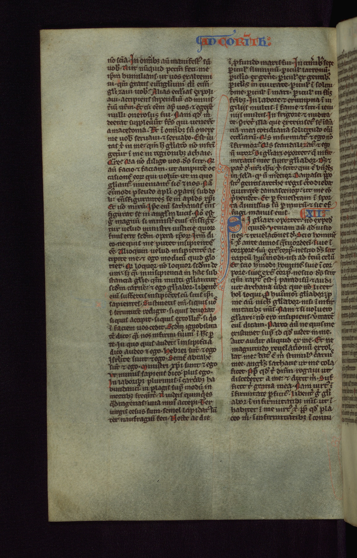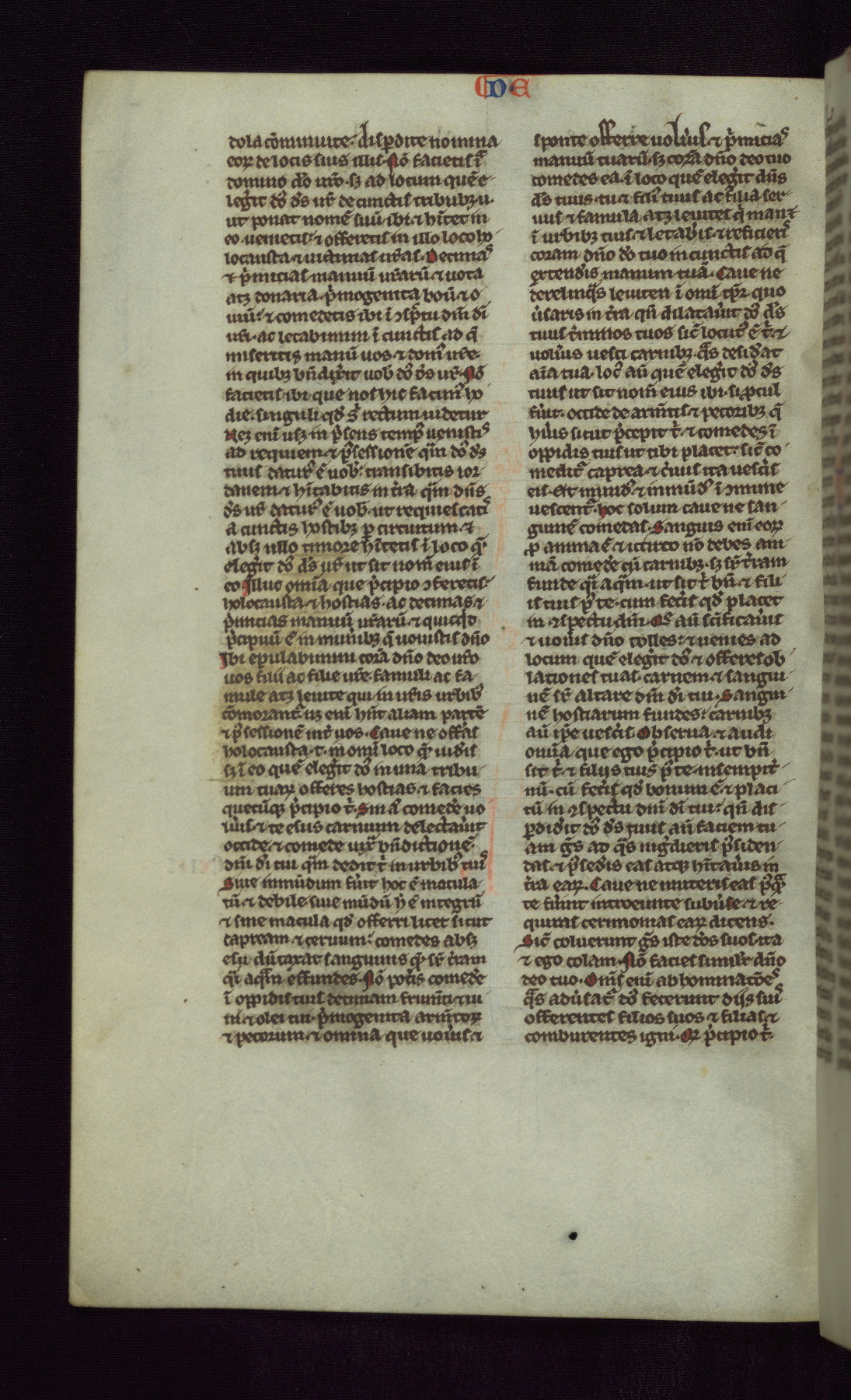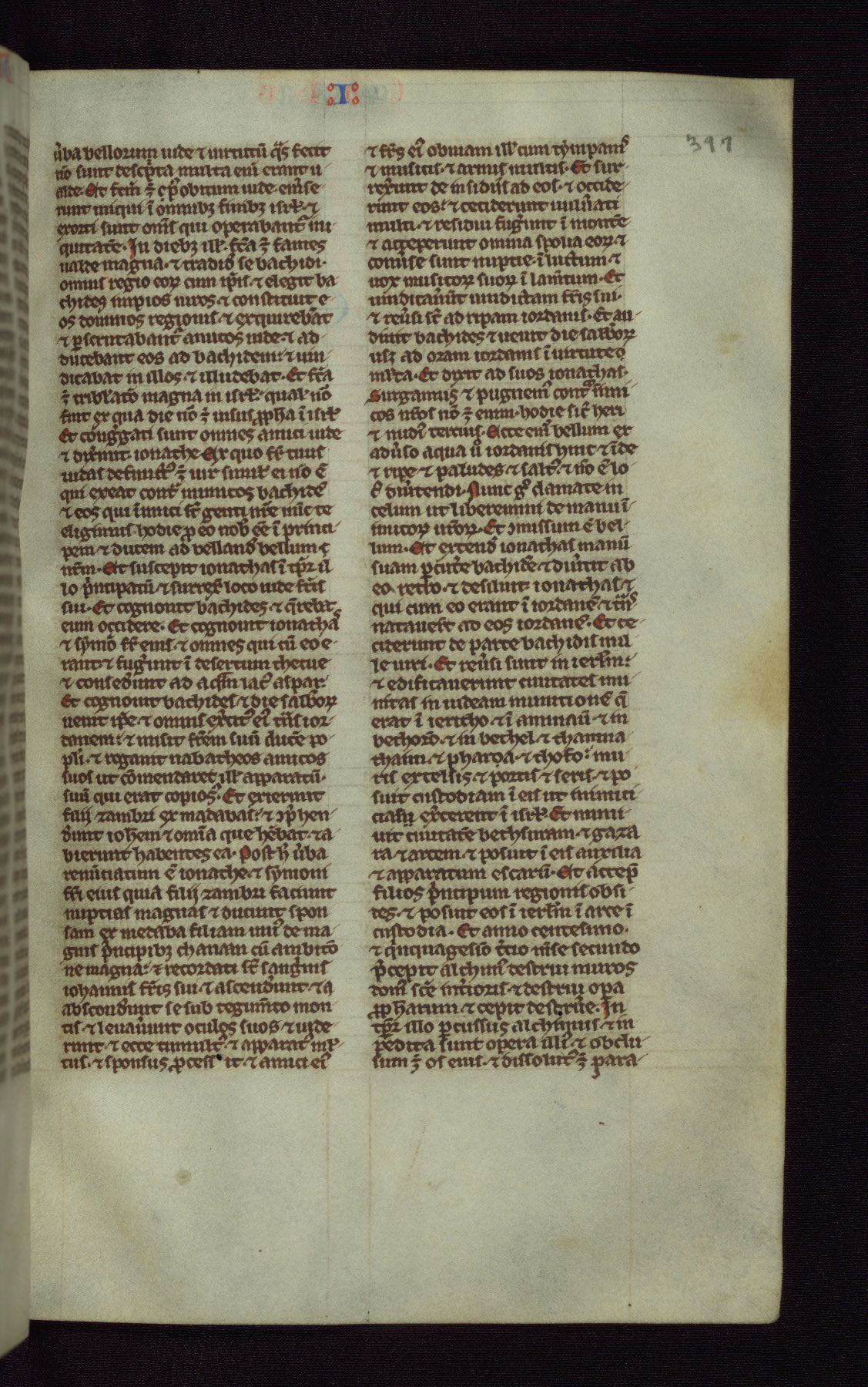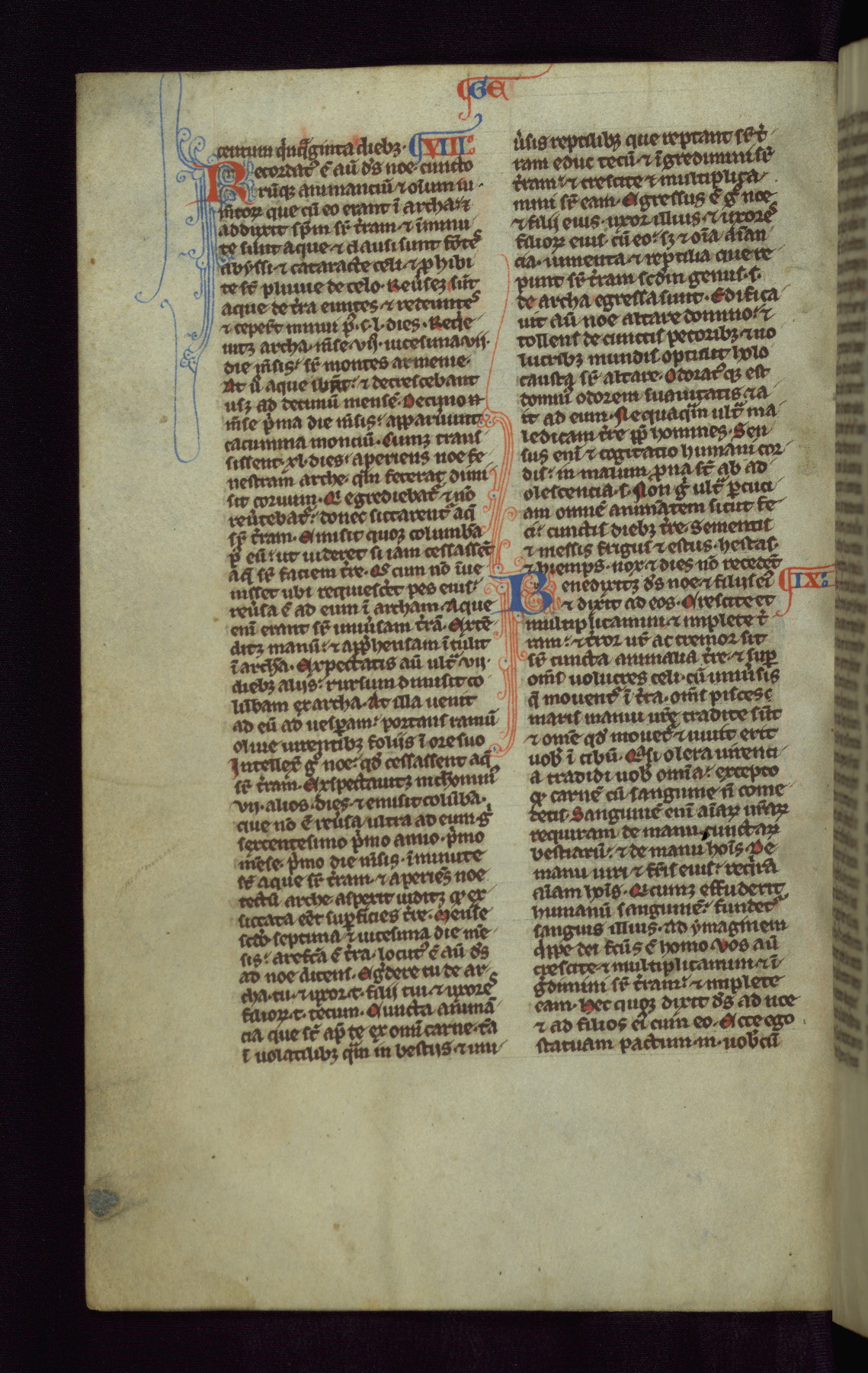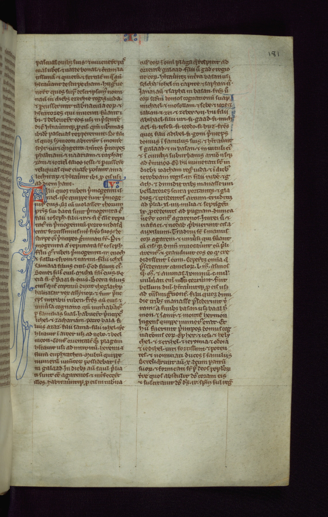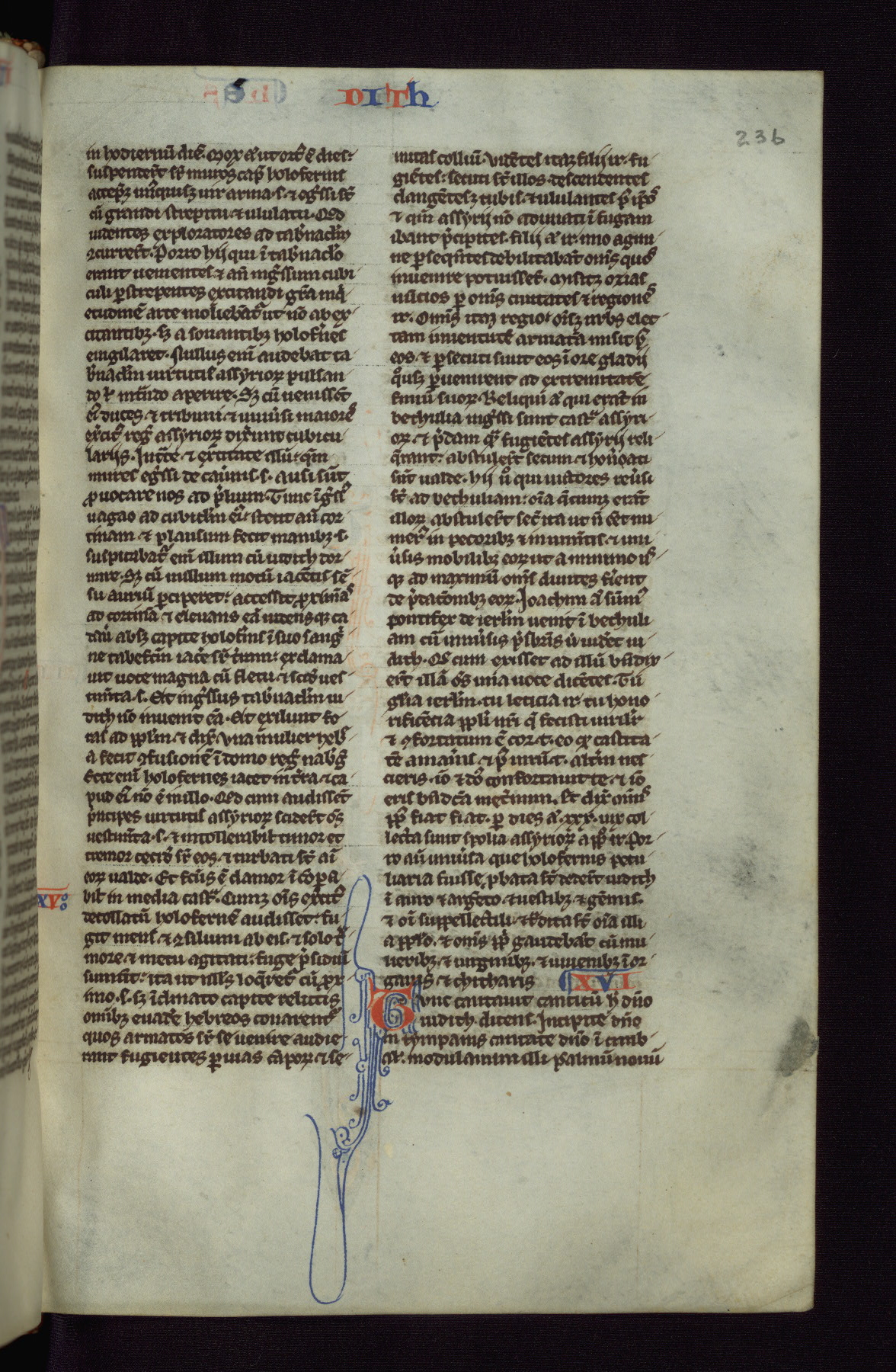 This pocket-size Bible was created around the middle of the thirteenth century in England. It contains the Vulgate text of the Old and New Testaments, arranged in order and divided into chapters. Such Bibles, designed for individual rather than institutional use, began to be created on a large scale during the thirteenth century, especially in Paris. This manuscript is illuminated with a large number of small historiated initials, and also includes a somewhat later image of the Three Living and the Three Dead, a popular scene based on a French poem of the same century.