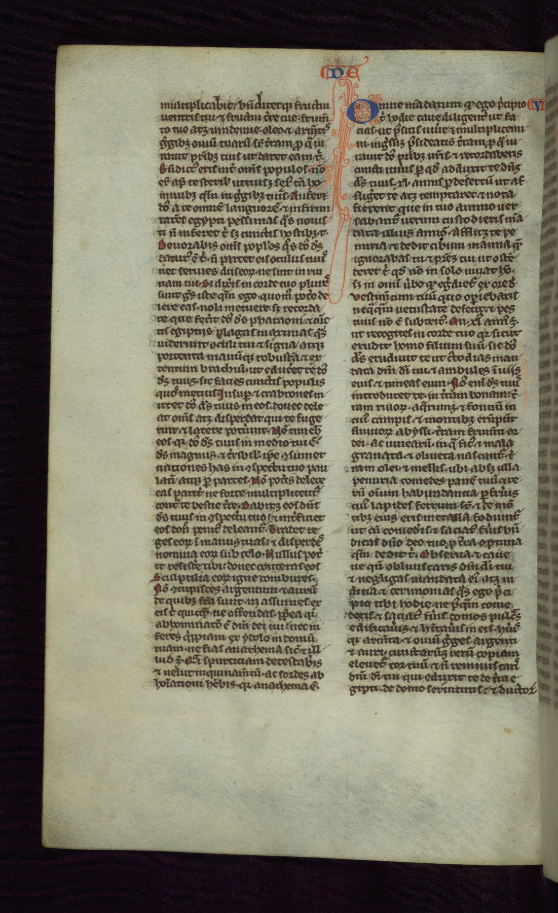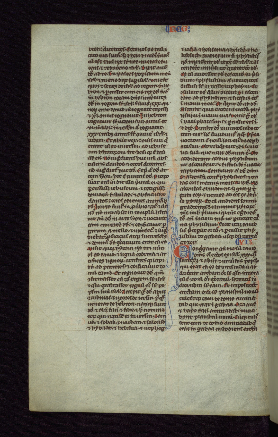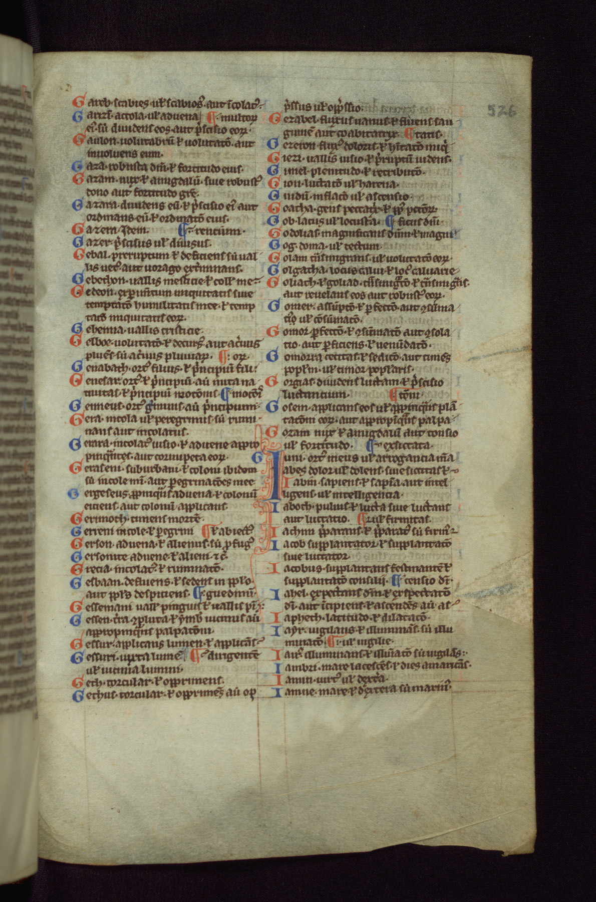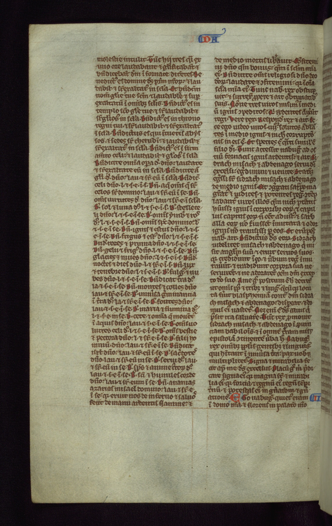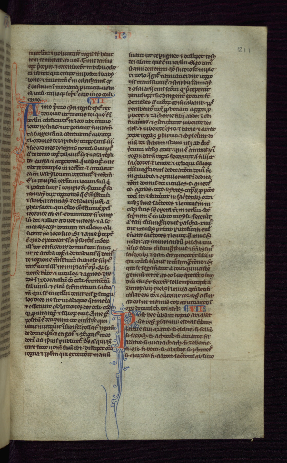 This pocket-size Bible was created around the middle of the thirteenth century in England. It contains the Vulgate text of the Old and New Testaments, arranged in order and divided into chapters. Such Bibles, designed for individual rather than institutional use, began to be created on a large scale during the thirteenth century, especially in Paris. This manuscript is illuminated with a large number of small historiated initials, and also includes a somewhat later image of the Three Living and the Three Dead, a popular scene based on a French poem of the same century.