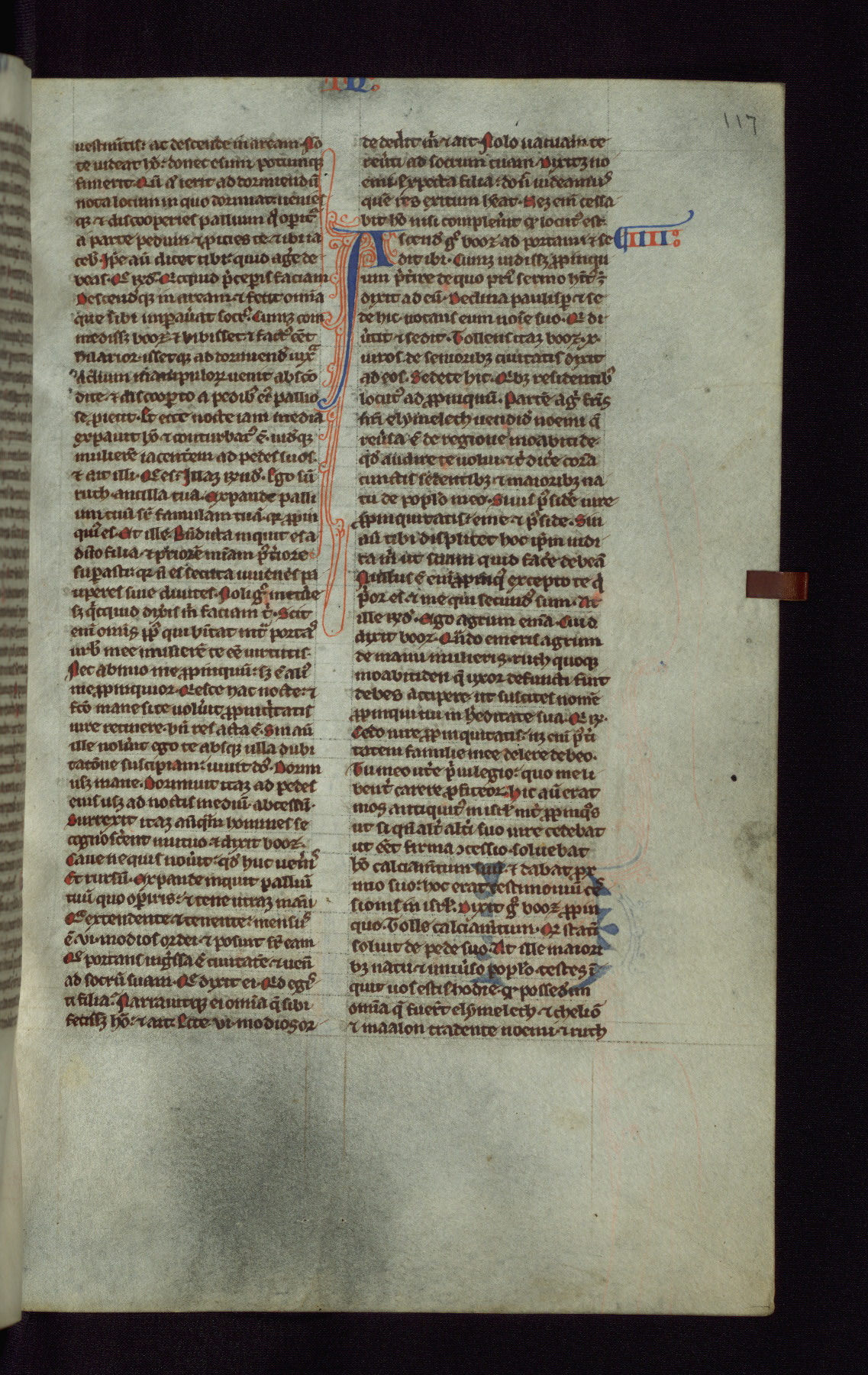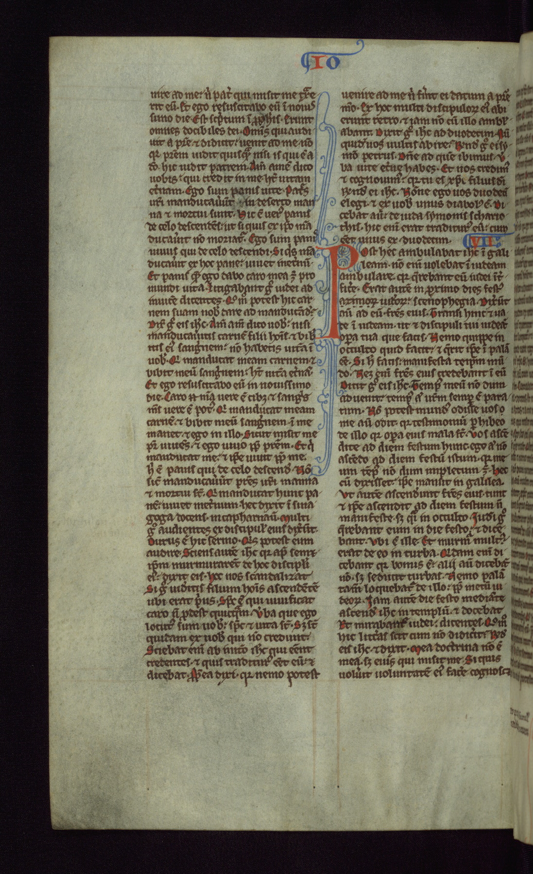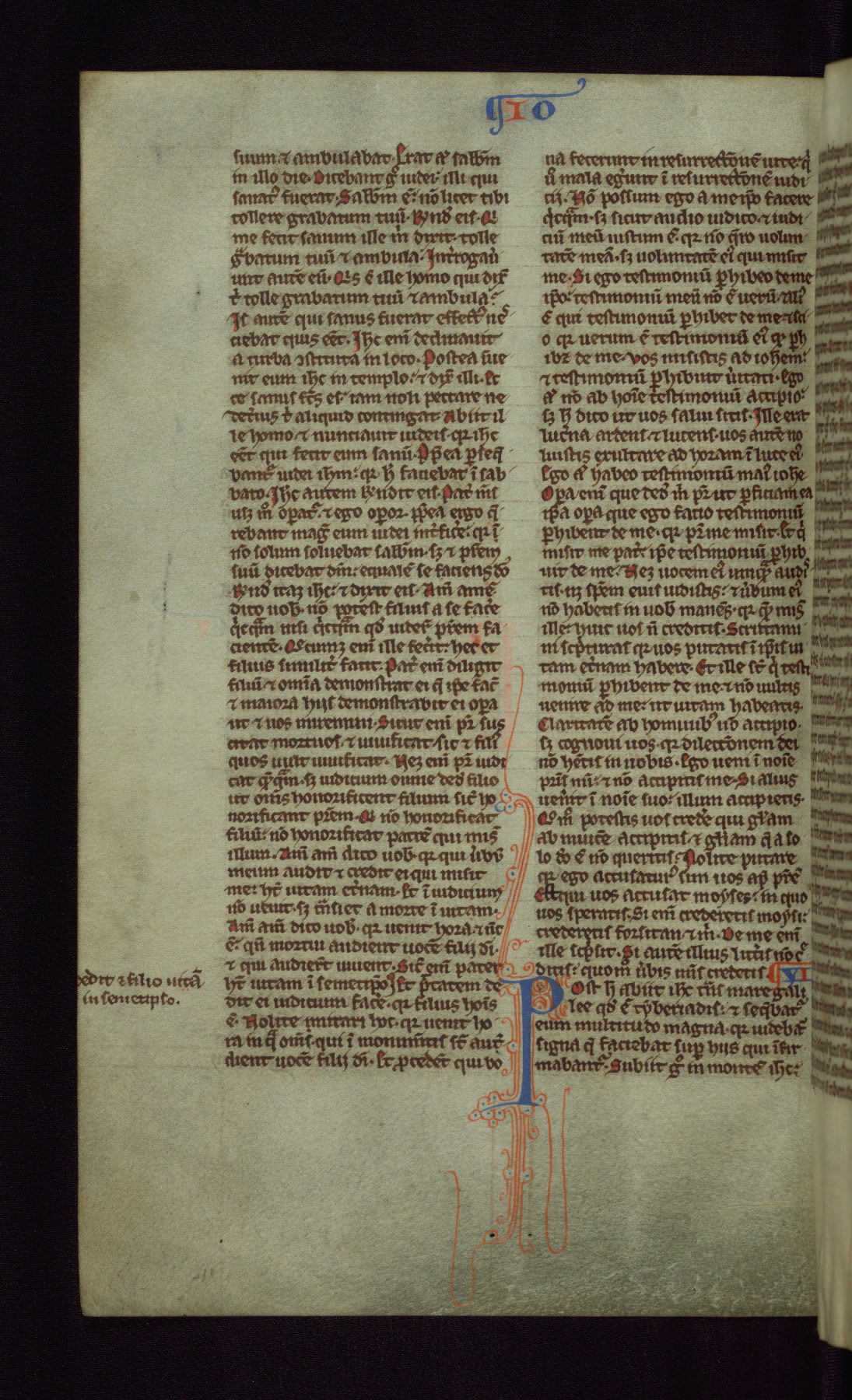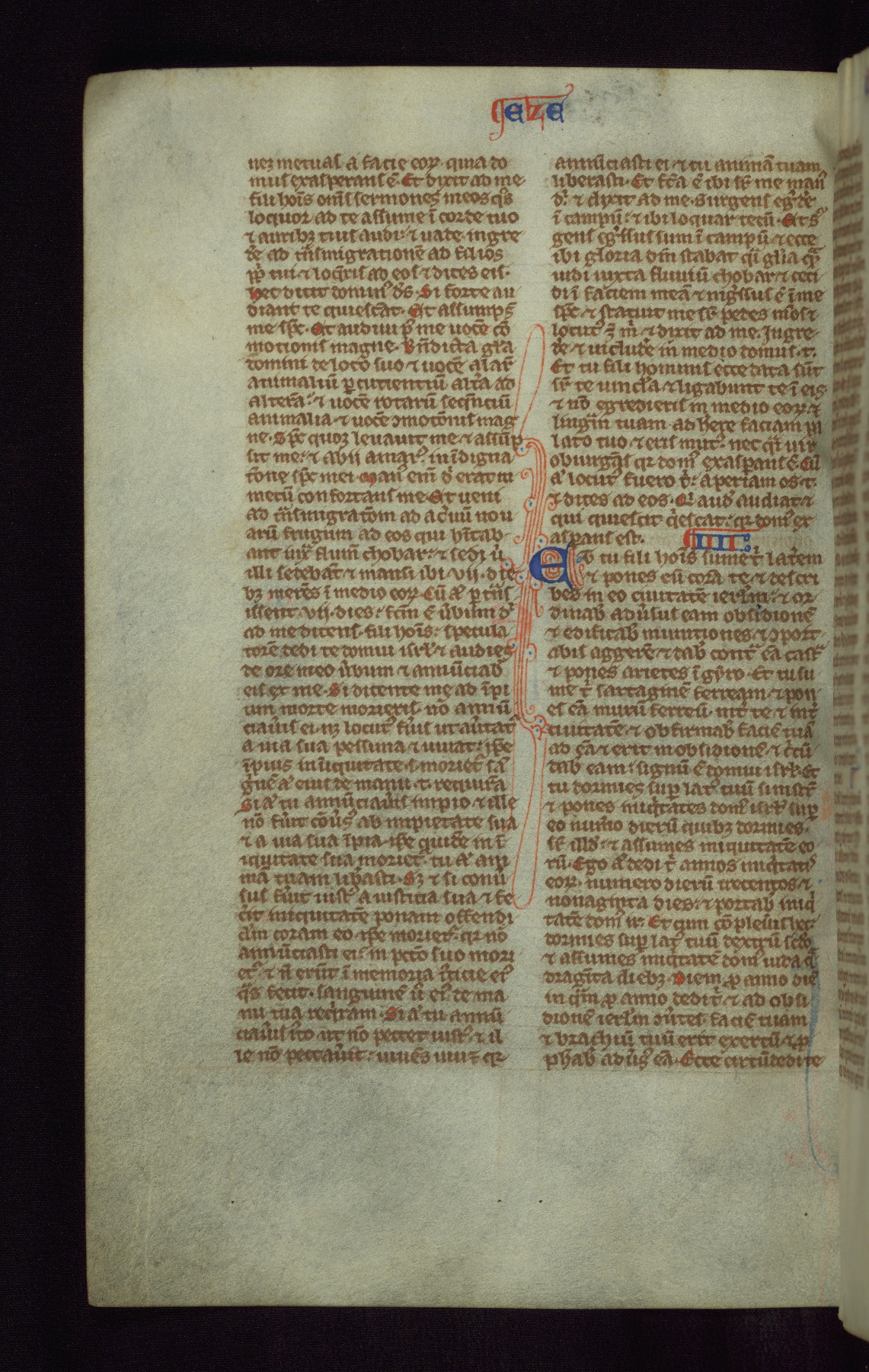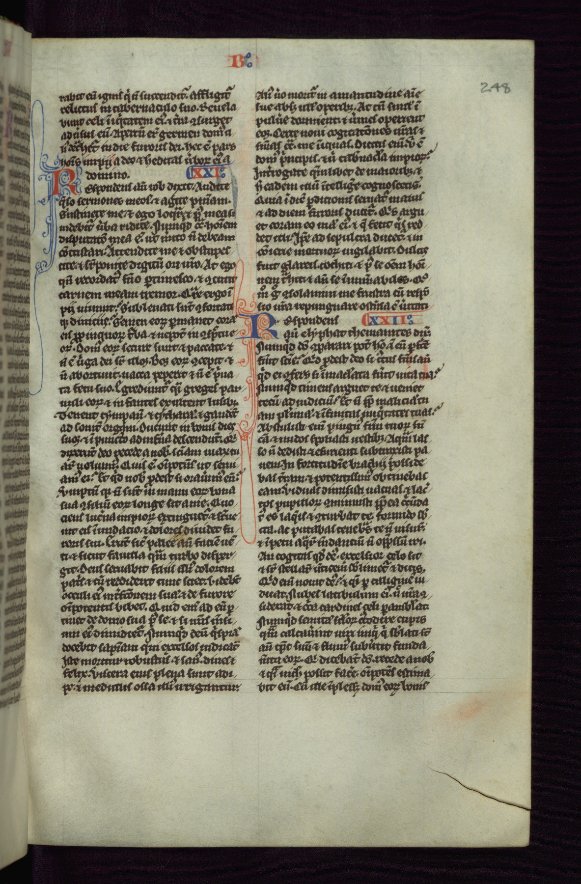 This pocket-size Bible was created around the middle of the thirteenth century in England. It contains the Vulgate text of the Old and New Testaments, arranged in order and divided into chapters. Such Bibles, designed for individual rather than institutional use, began to be created on a large scale during the thirteenth century, especially in Paris. This manuscript is illuminated with a large number of small historiated initials, and also includes a somewhat later image of the Three Living and the Three Dead, a popular scene based on a French poem of the same century.