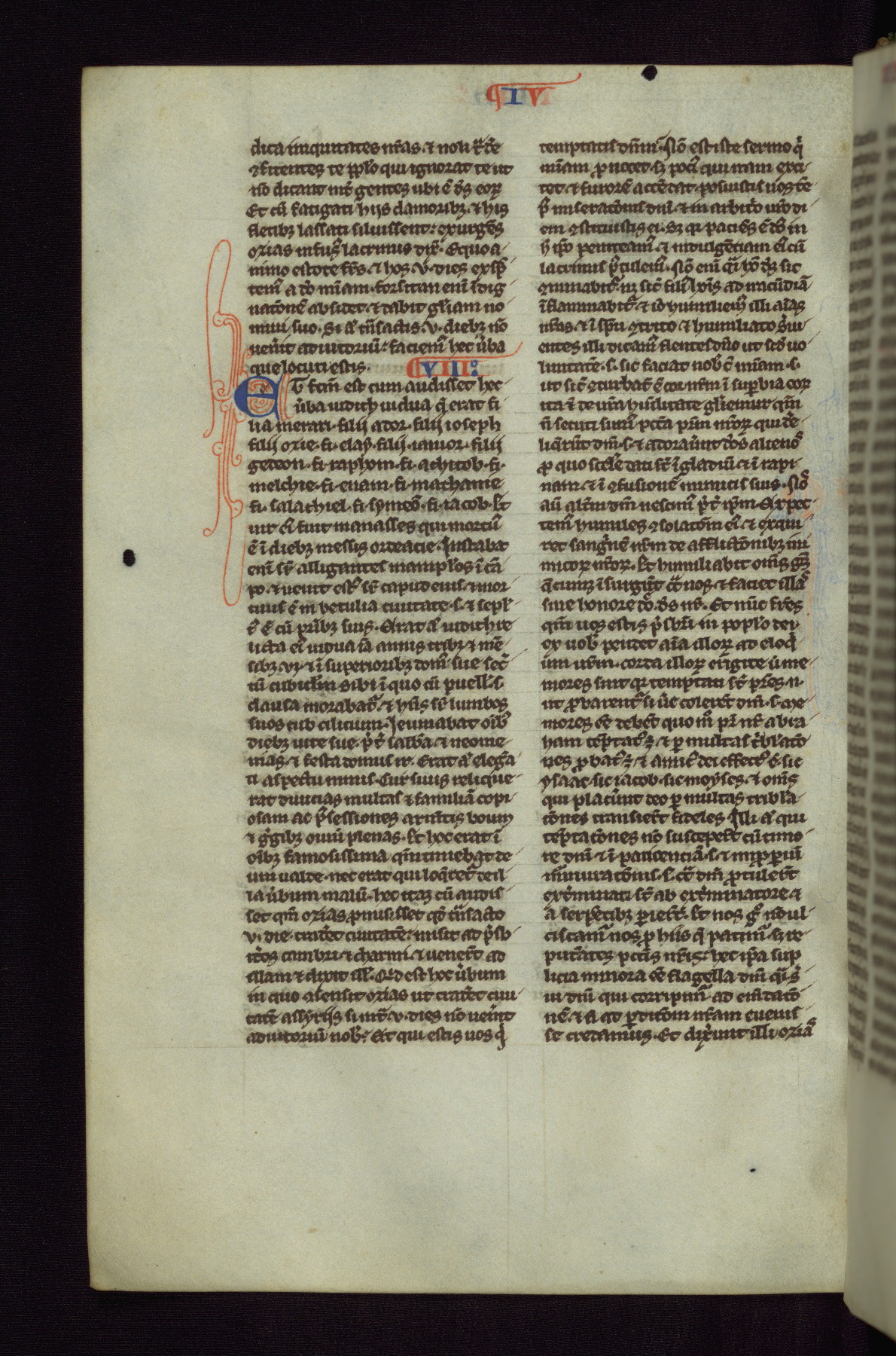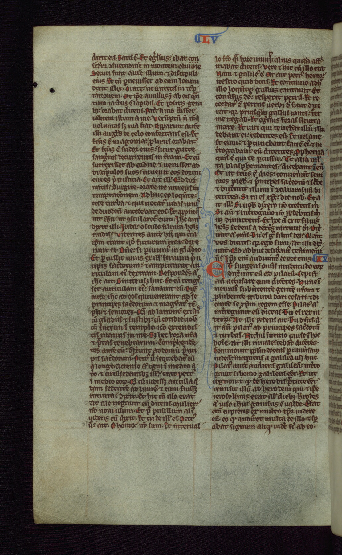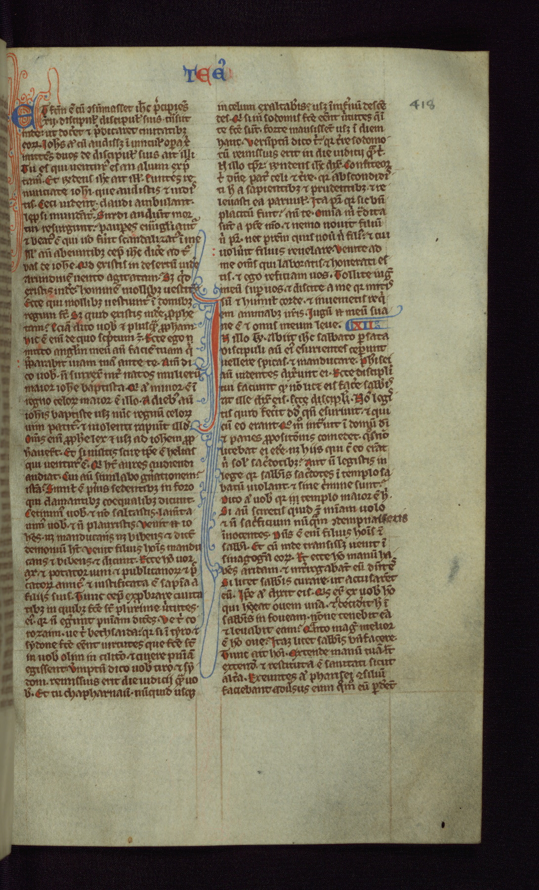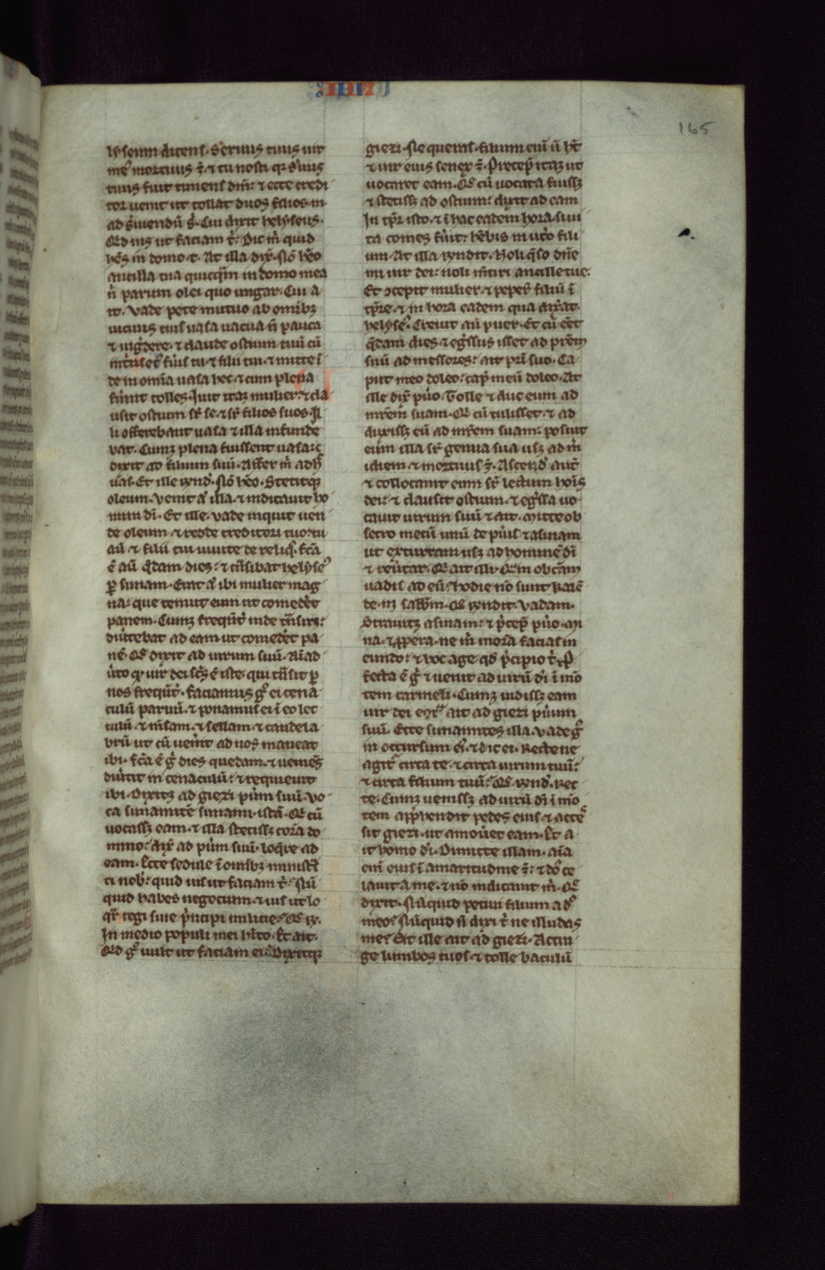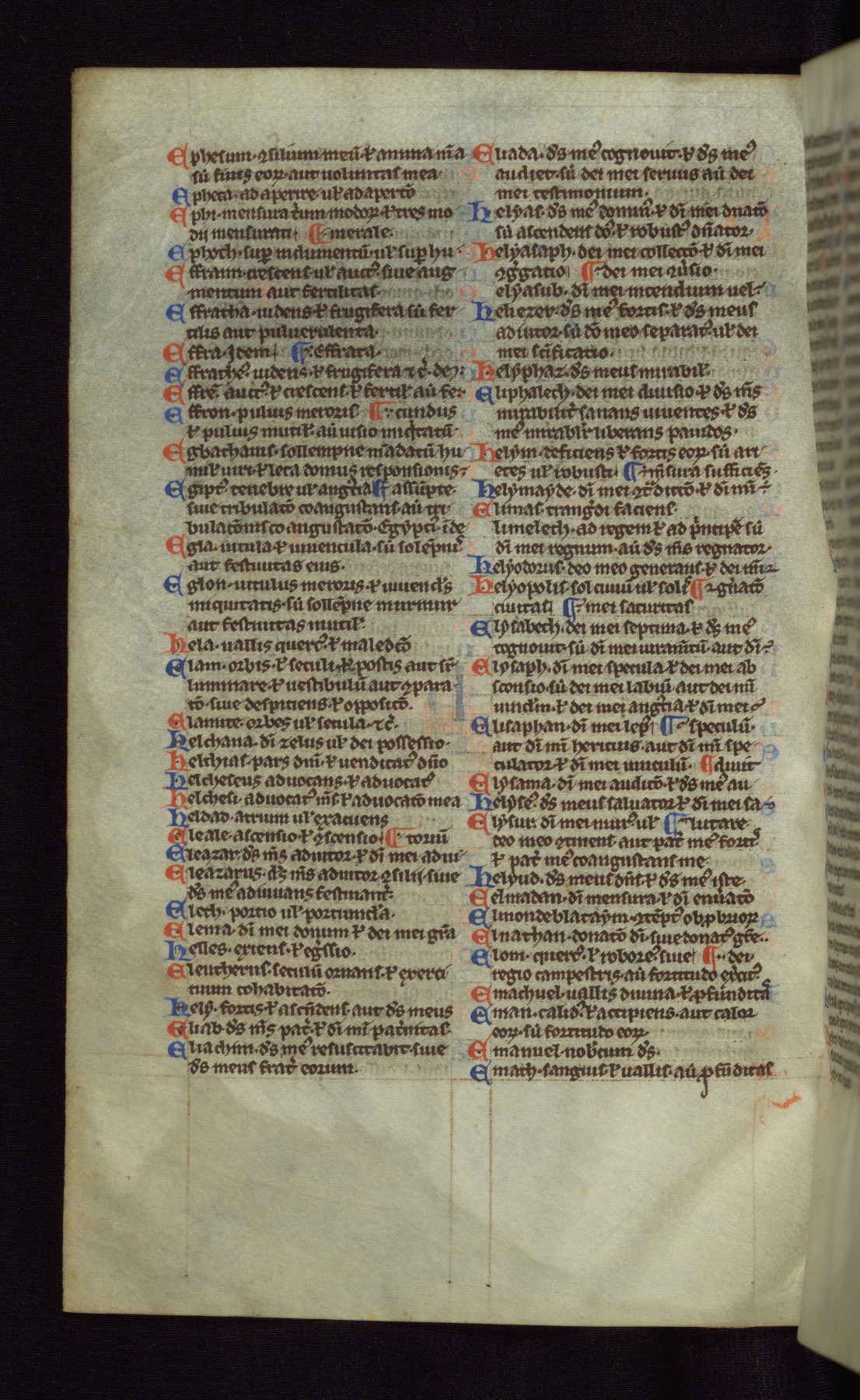 This pocket-size Bible was created around the middle of the thirteenth century in England. It contains the Vulgate text of the Old and New Testaments, arranged in order and divided into chapters. Such Bibles, designed for individual rather than institutional use, began to be created on a large scale during the thirteenth century, especially in Paris. This manuscript is illuminated with a large number of small historiated initials, and also includes a somewhat later image of the Three Living and the Three Dead, a popular scene based on a French poem of the same century.