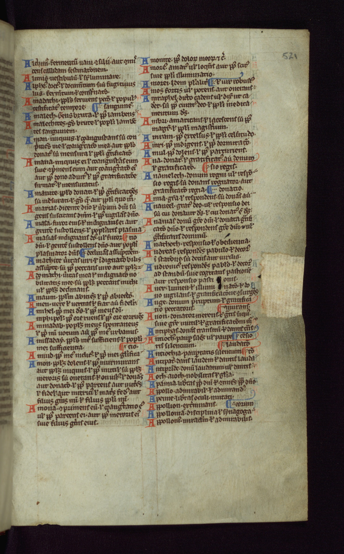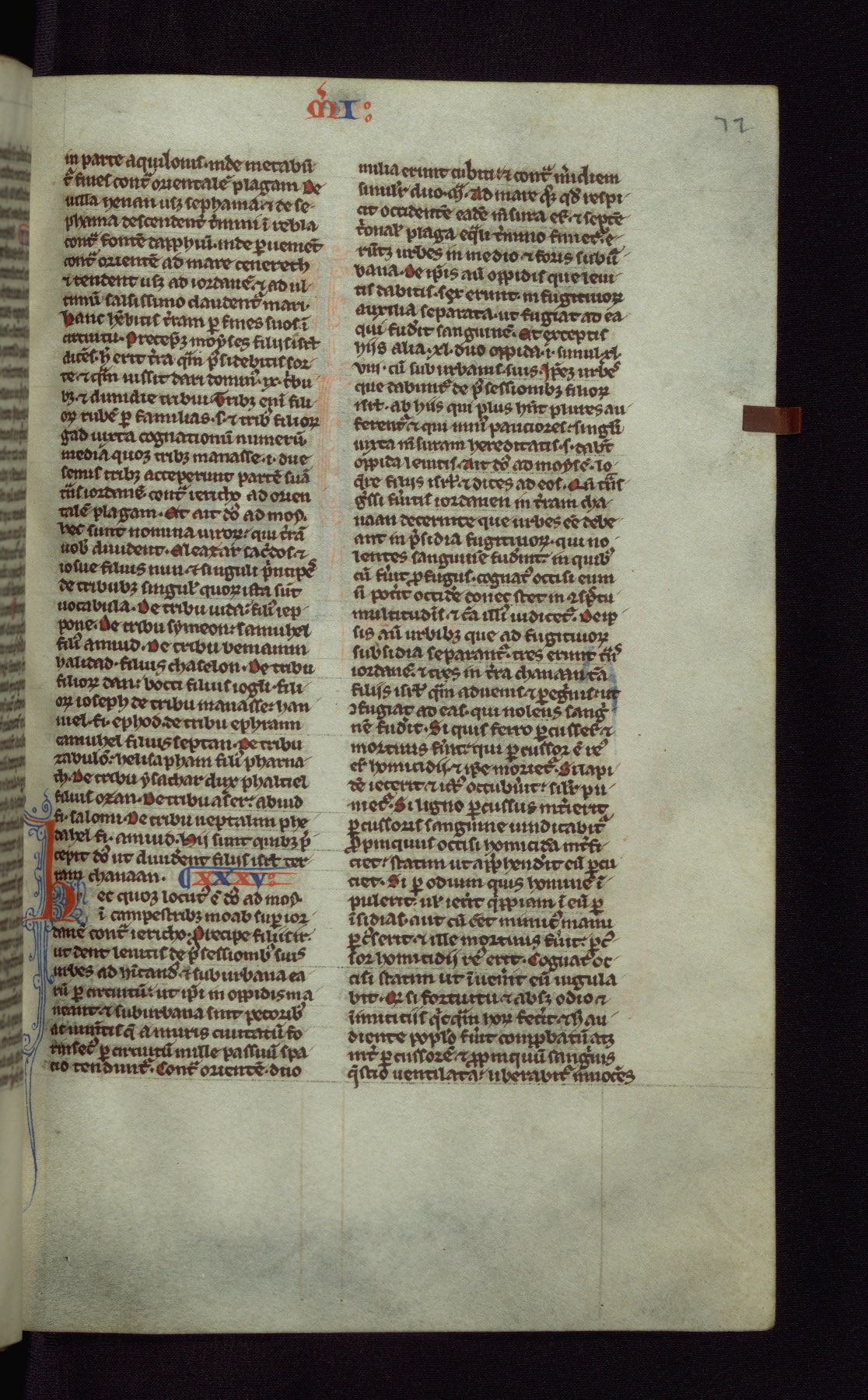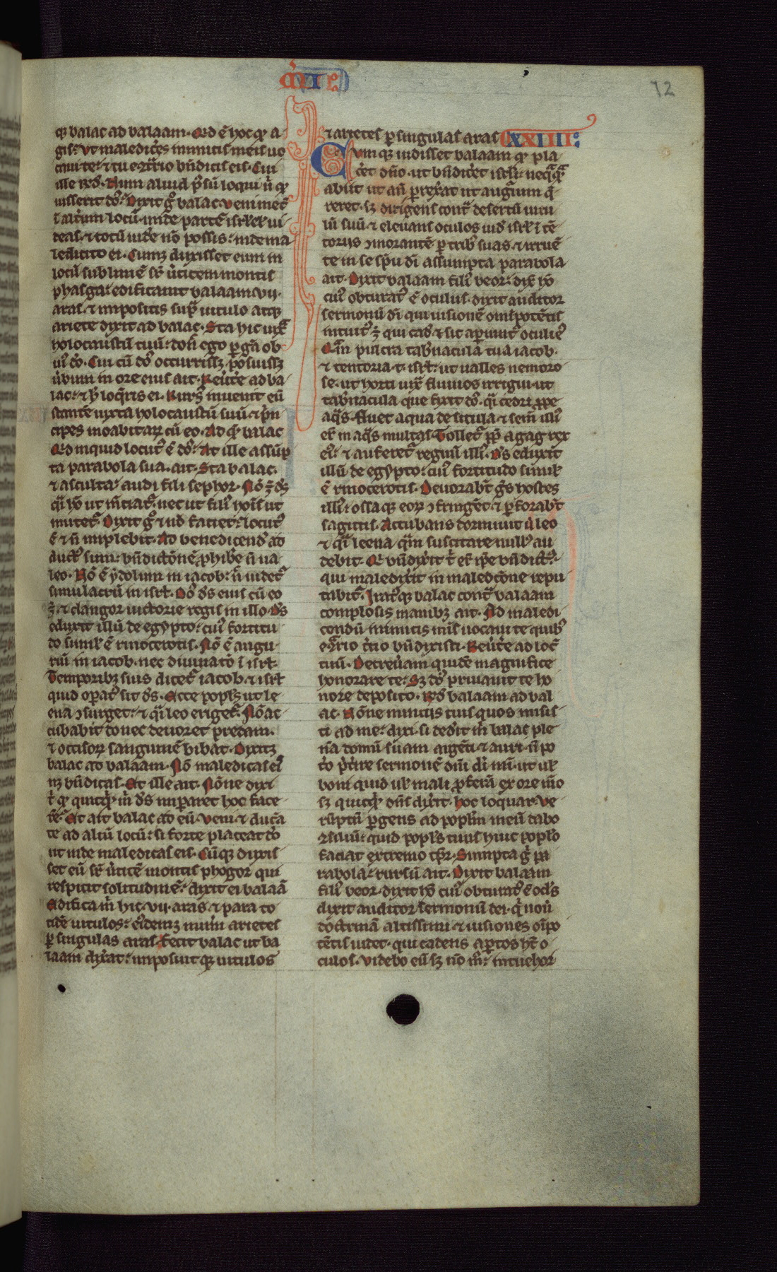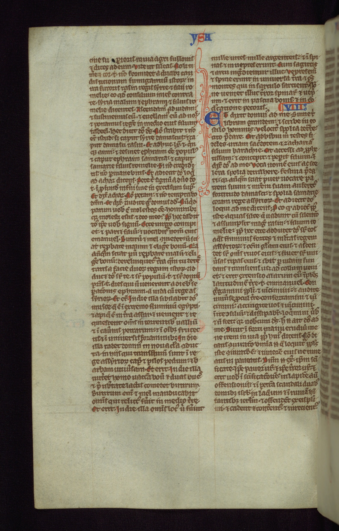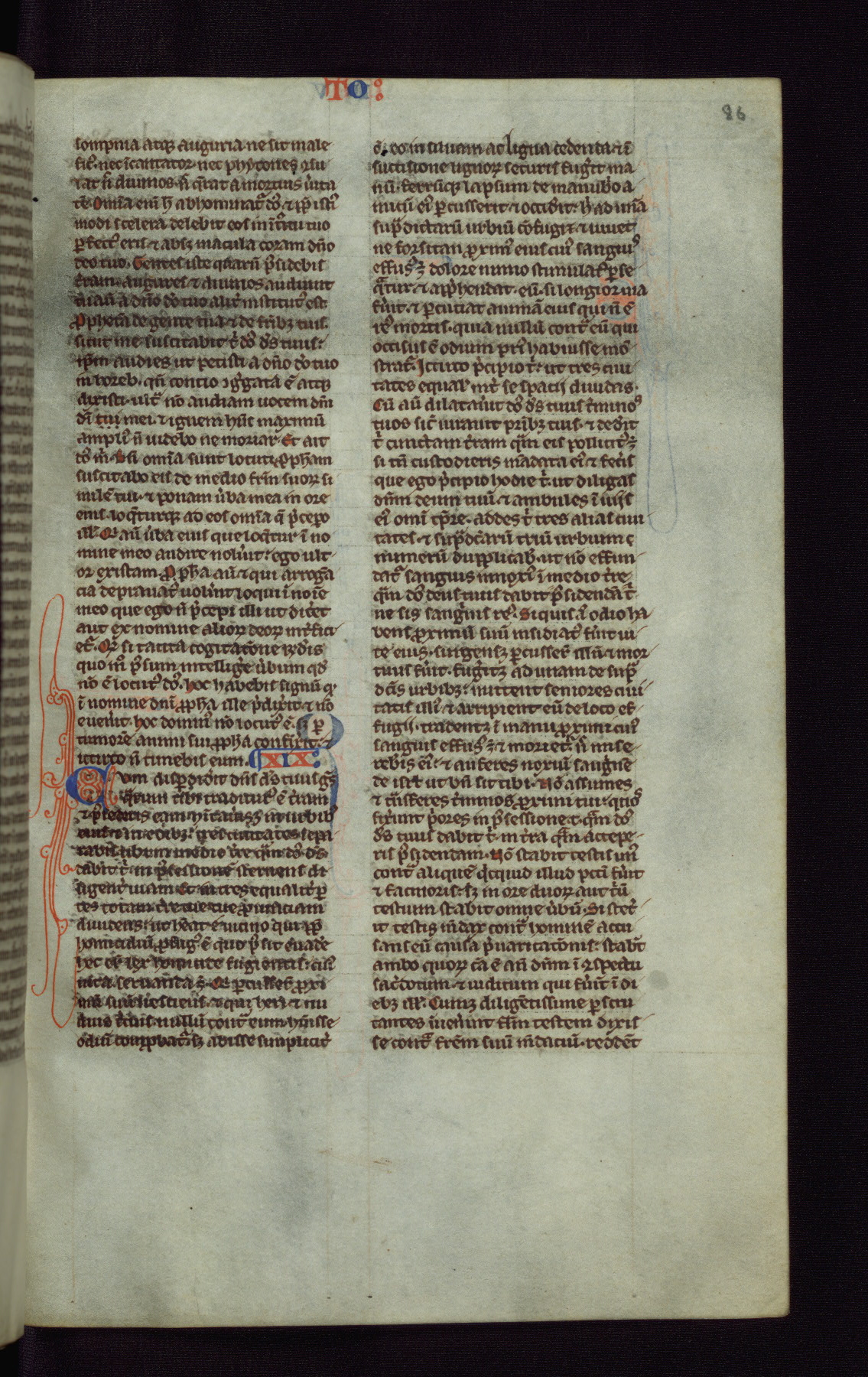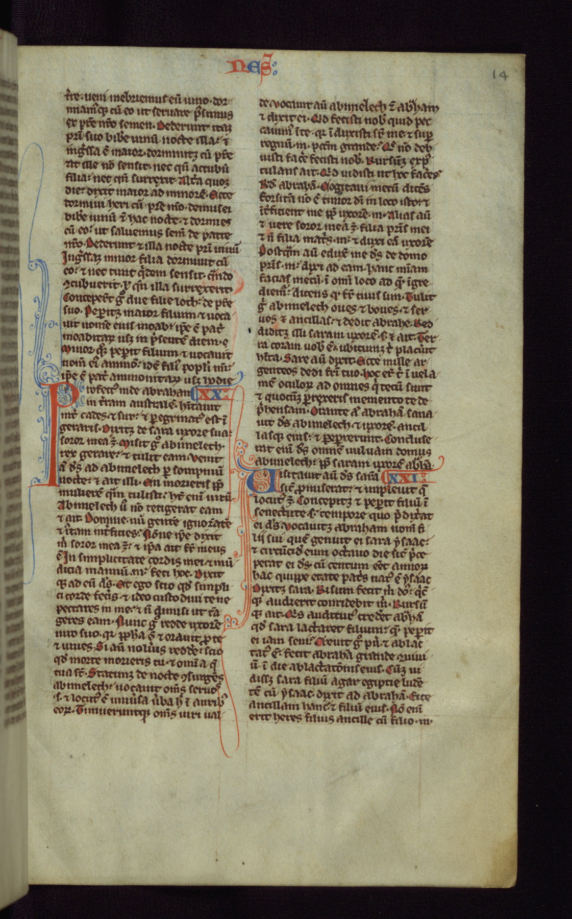 This pocket-size Bible was created around the middle of the thirteenth century in England. It contains the Vulgate text of the Old and New Testaments, arranged in order and divided into chapters. Such Bibles, designed for individual rather than institutional use, began to be created on a large scale during the thirteenth century, especially in Paris. This manuscript is illuminated with a large number of small historiated initials, and also includes a somewhat later image of the Three Living and the Three Dead, a popular scene based on a French poem of the same century.