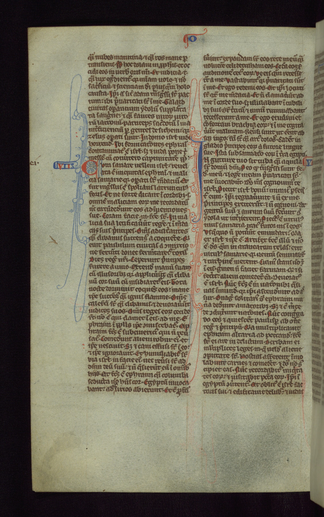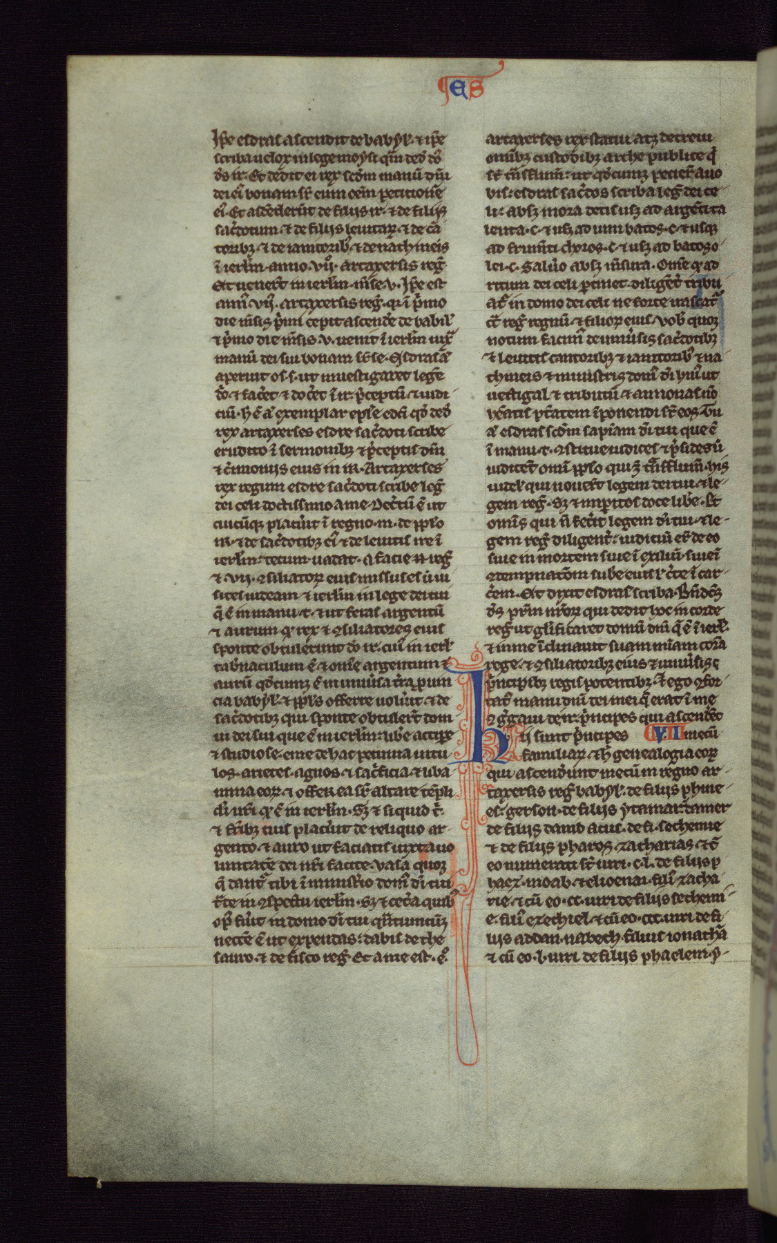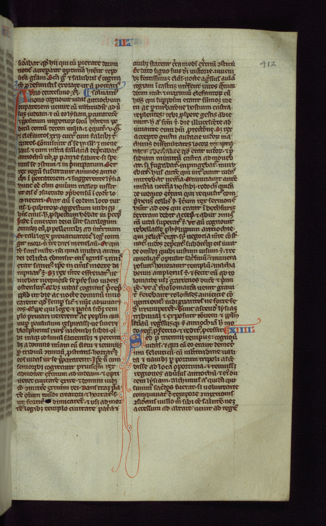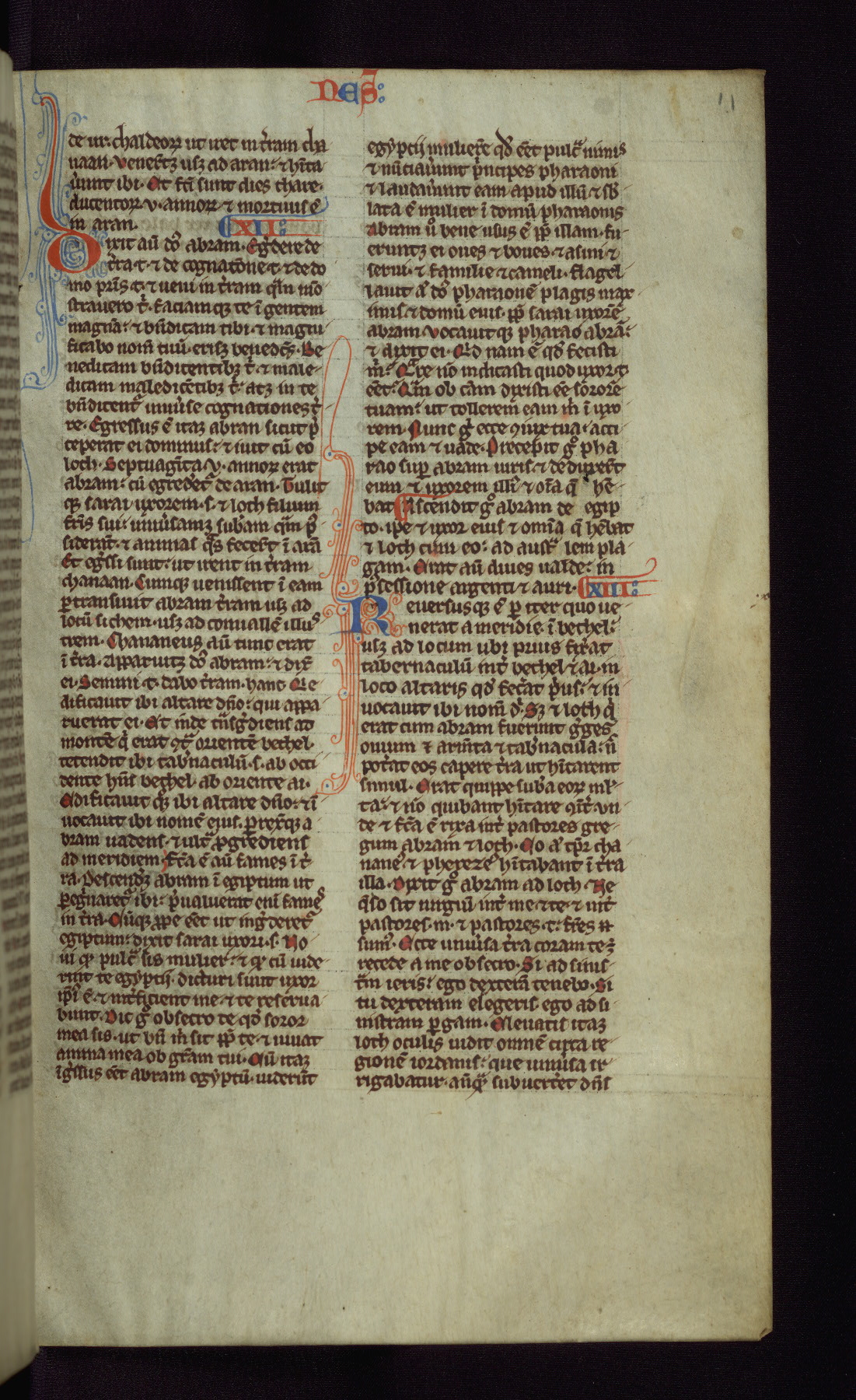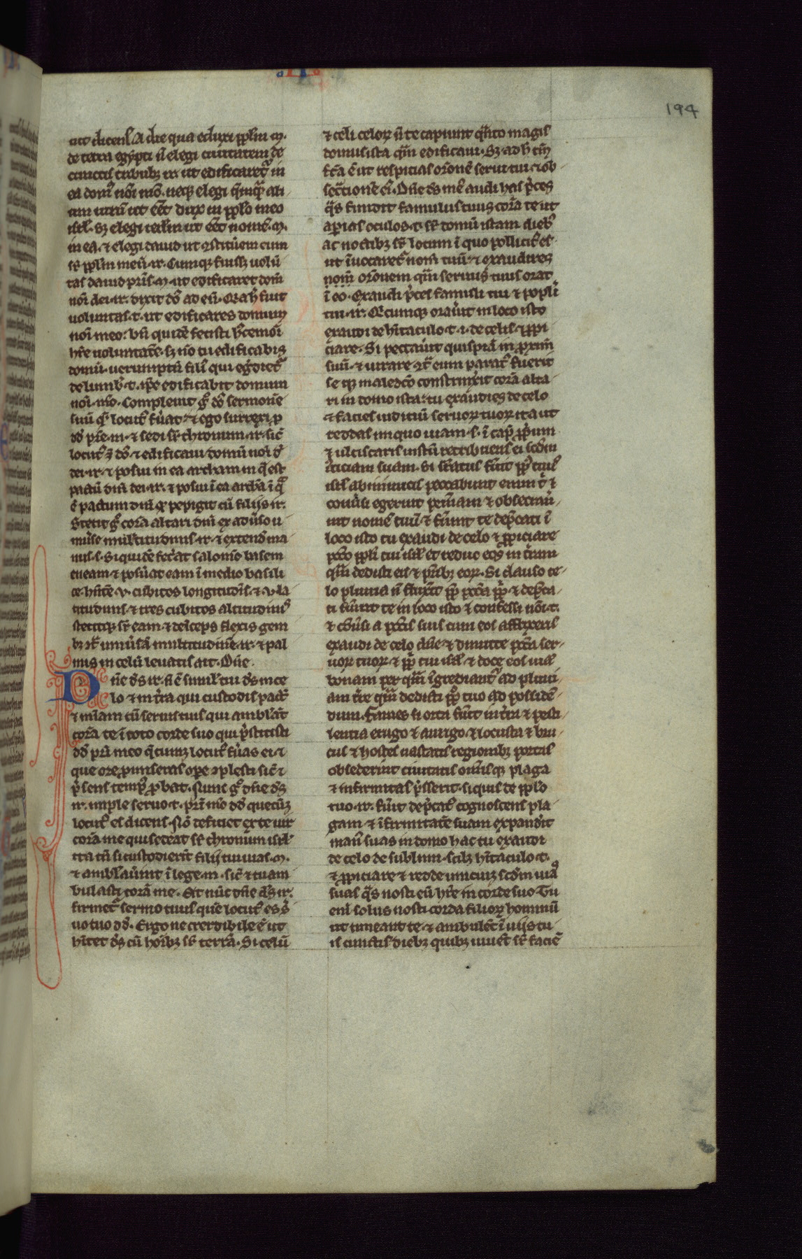This pocket-size Bible was created around the middle of the thirteenth century in England. It contains the Vulgate text of the Old and New Testaments, arranged in order and divided into chapters. Such Bibles, designed for individual rather than institutional use, began to be created on a large scale during the thirteenth century, especially in Paris. This manuscript is illuminated with a large number of small historiated initials, and also includes a somewhat later image of the Three Living and the Three Dead, a popular scene based on a French poem of the same century.