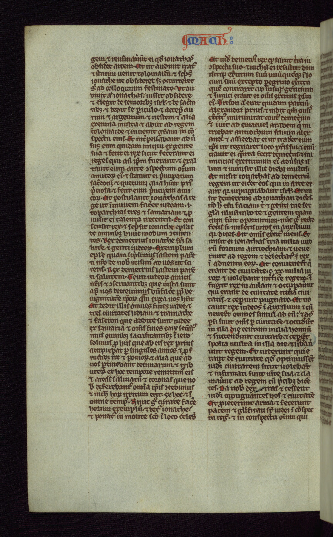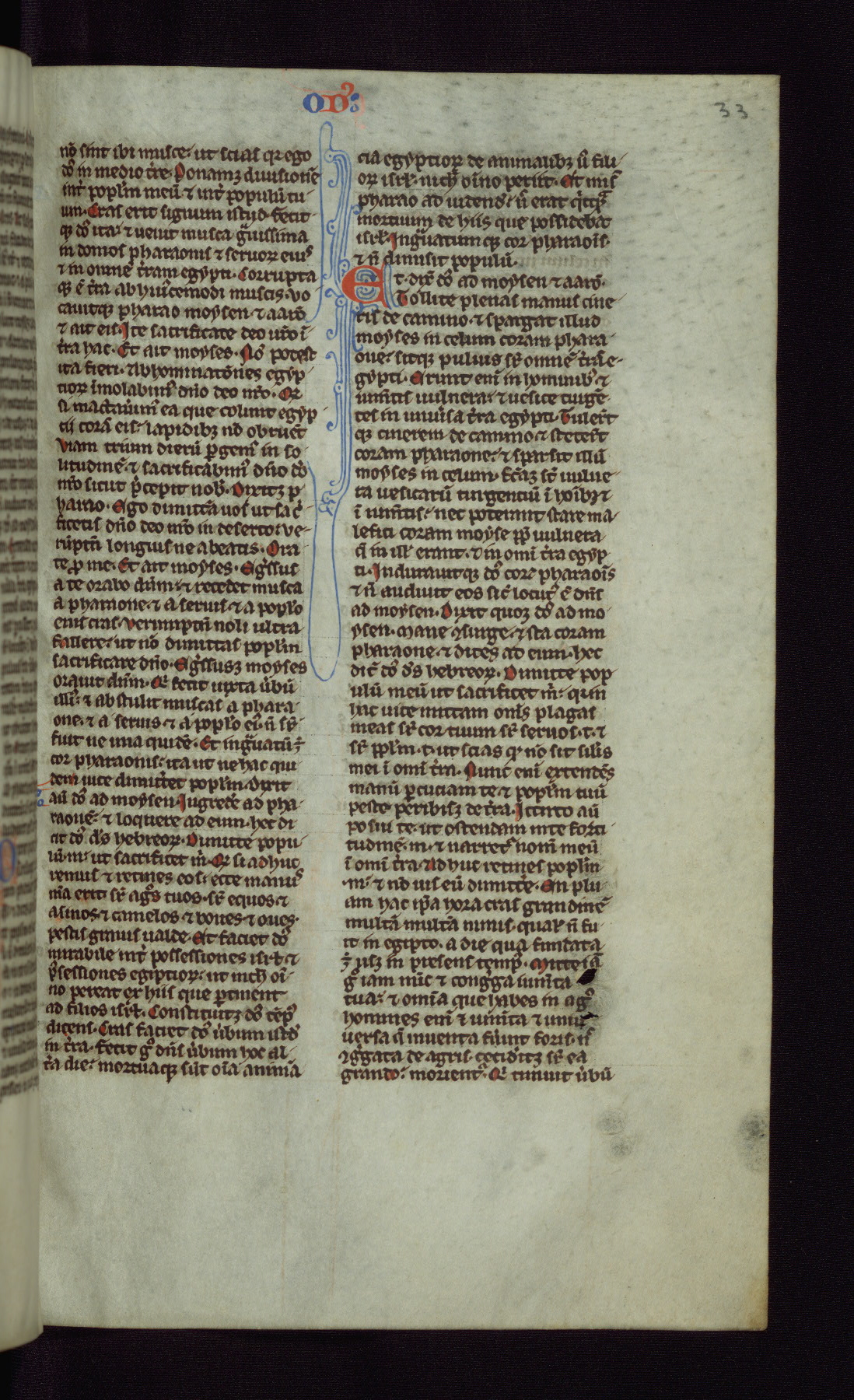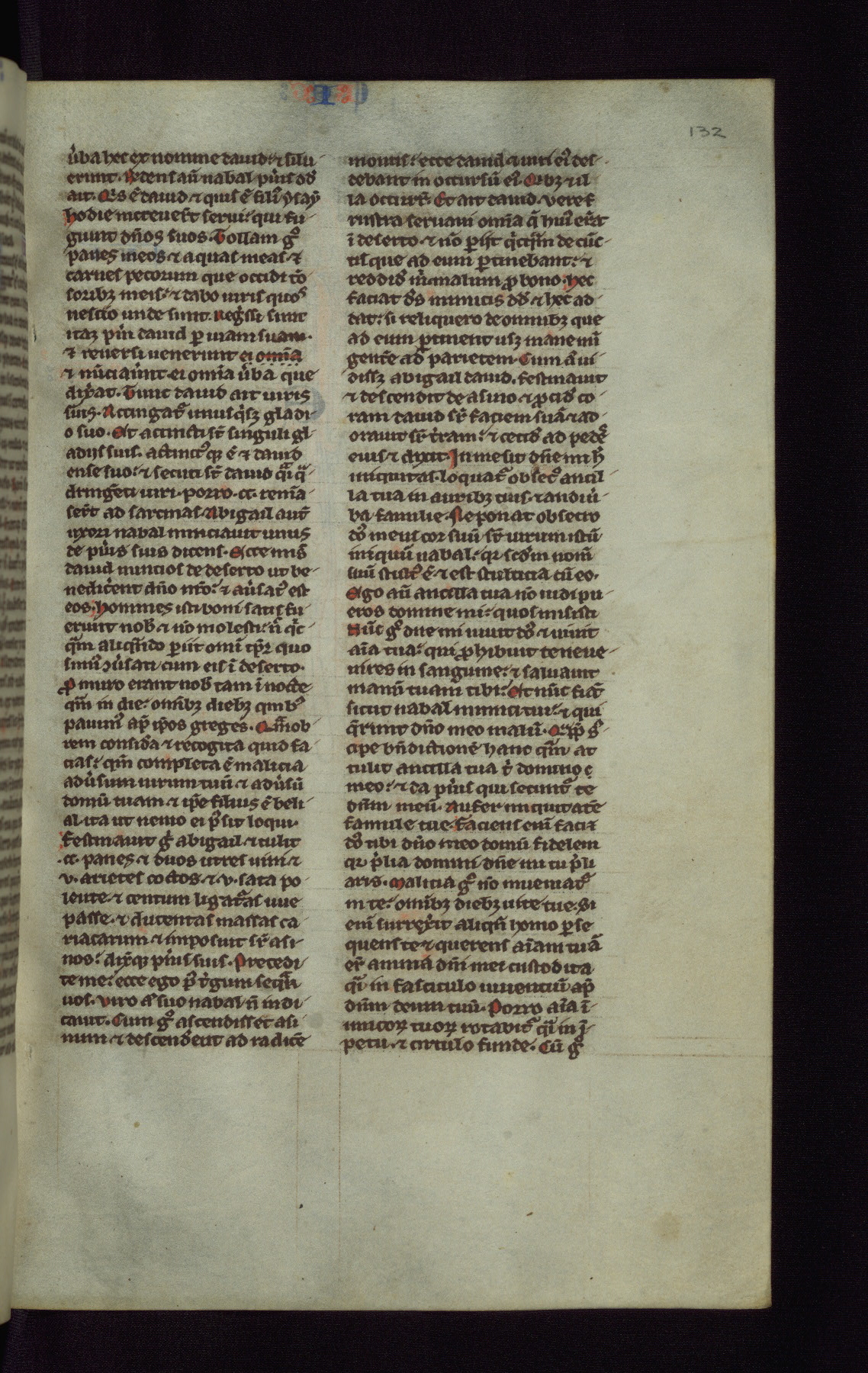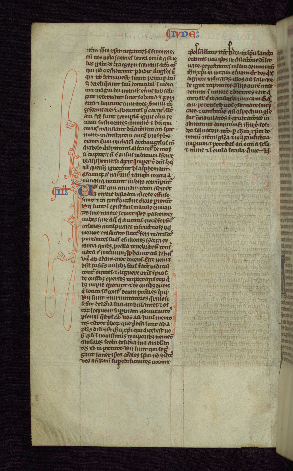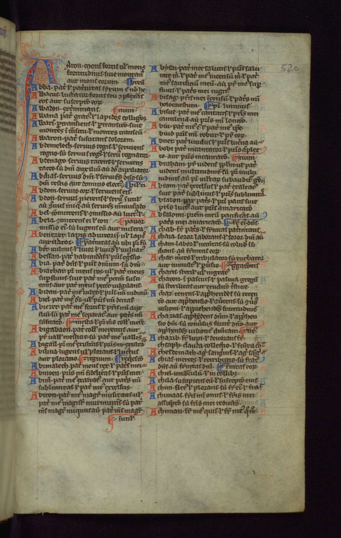 This pocket-size Bible was created around the middle of the thirteenth century in England. It contains the Vulgate text of the Old and New Testaments, arranged in order and divided into chapters. Such Bibles, designed for individual rather than institutional use, began to be created on a large scale during the thirteenth century, especially in Paris. This manuscript is illuminated with a large number of small historiated initials, and also includes a somewhat later image of the Three Living and the Three Dead, a popular scene based on a French poem of the same century.