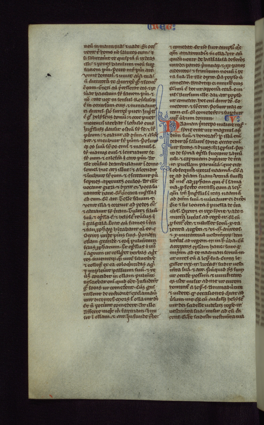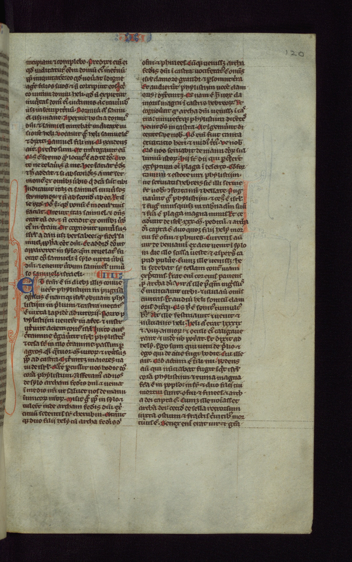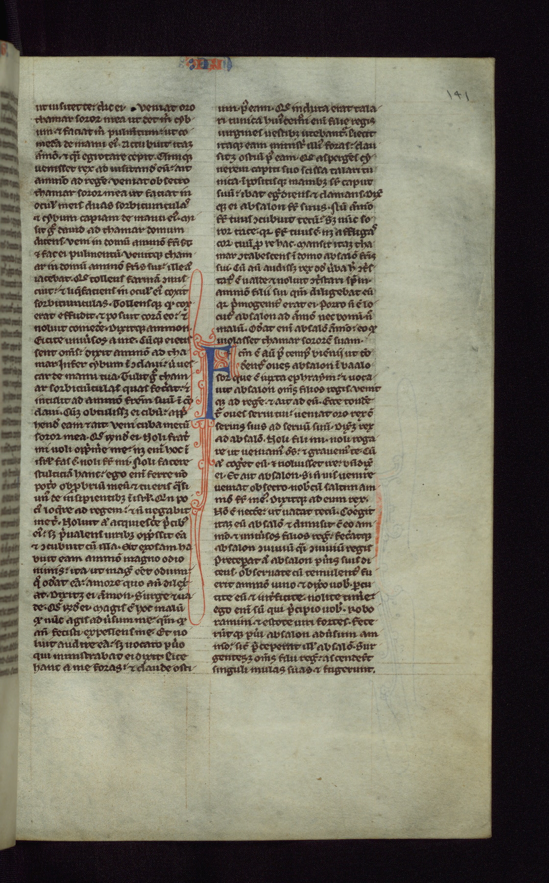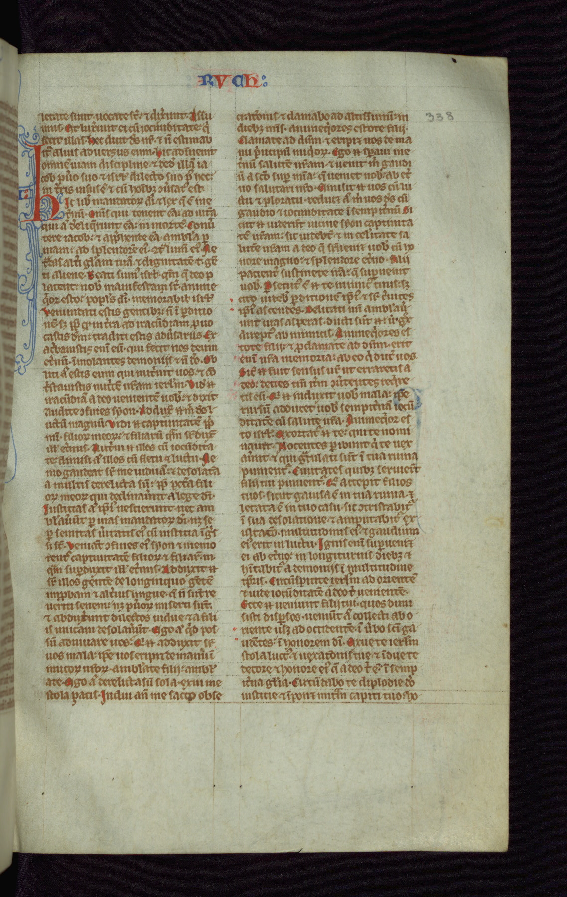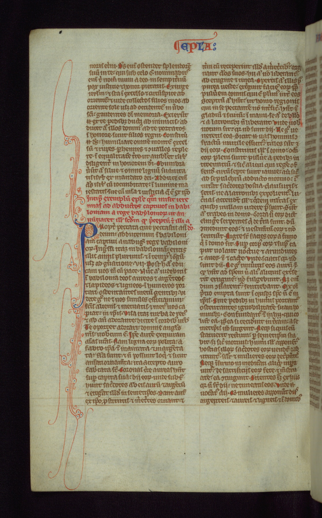 This pocket-size Bible was created around the middle of the thirteenth century in England. It contains the Vulgate text of the Old and New Testaments, arranged in order and divided into chapters. Such Bibles, designed for individual rather than institutional use, began to be created on a large scale during the thirteenth century, especially in Paris. This manuscript is illuminated with a large number of small historiated initials, and also includes a somewhat later image of the Three Living and the Three Dead, a popular scene based on a French poem of the same century.